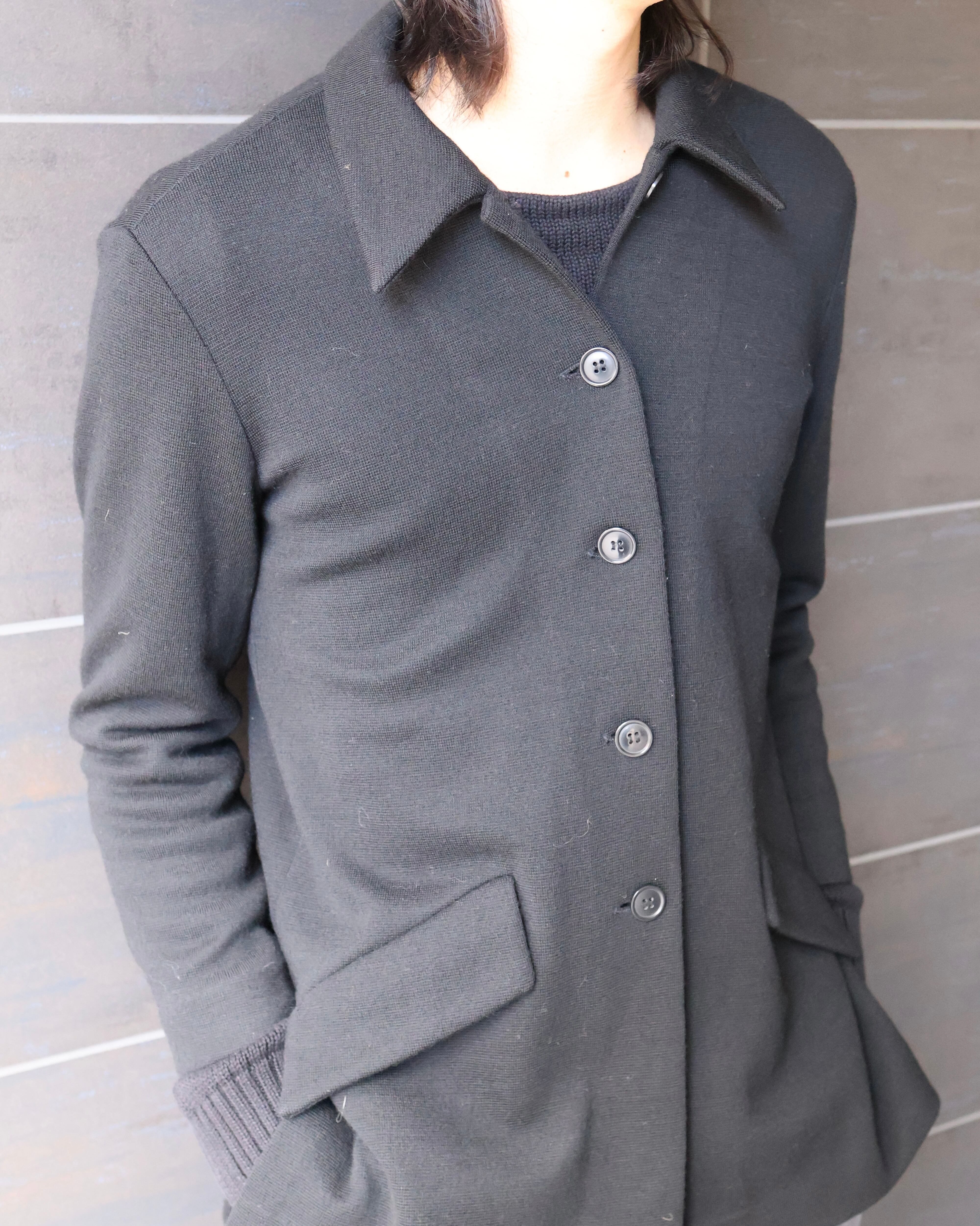 ミニマルで洗練された印象のウールシャツジャケット。斜めに配されたポケットや、とことんクラシカルな印象を与えるようなシルエット、春先の一枚にもってこいのアウター。