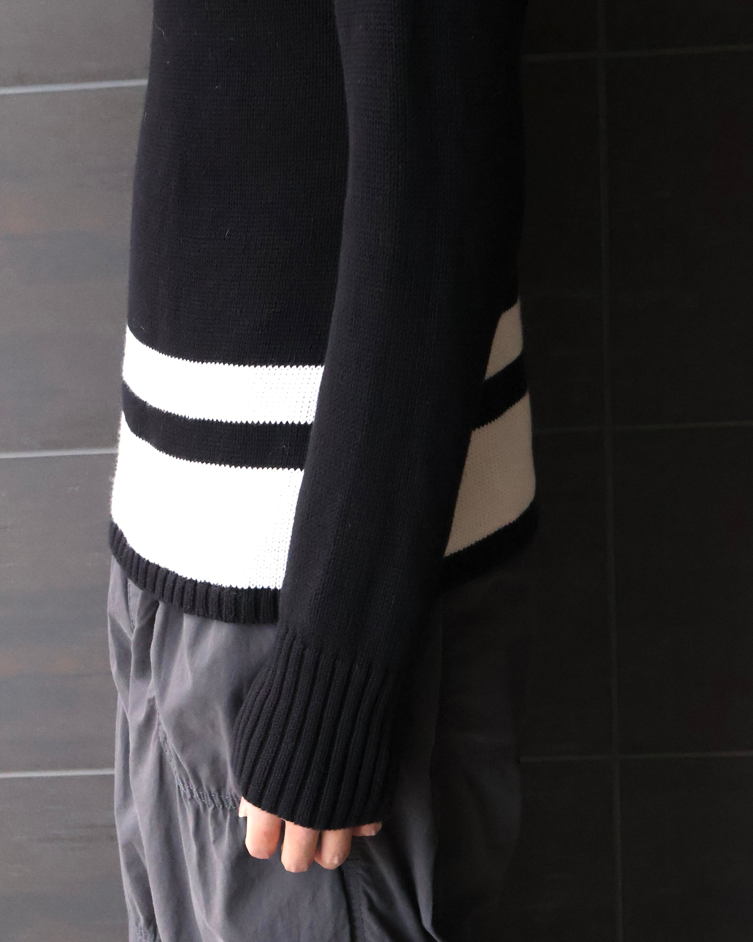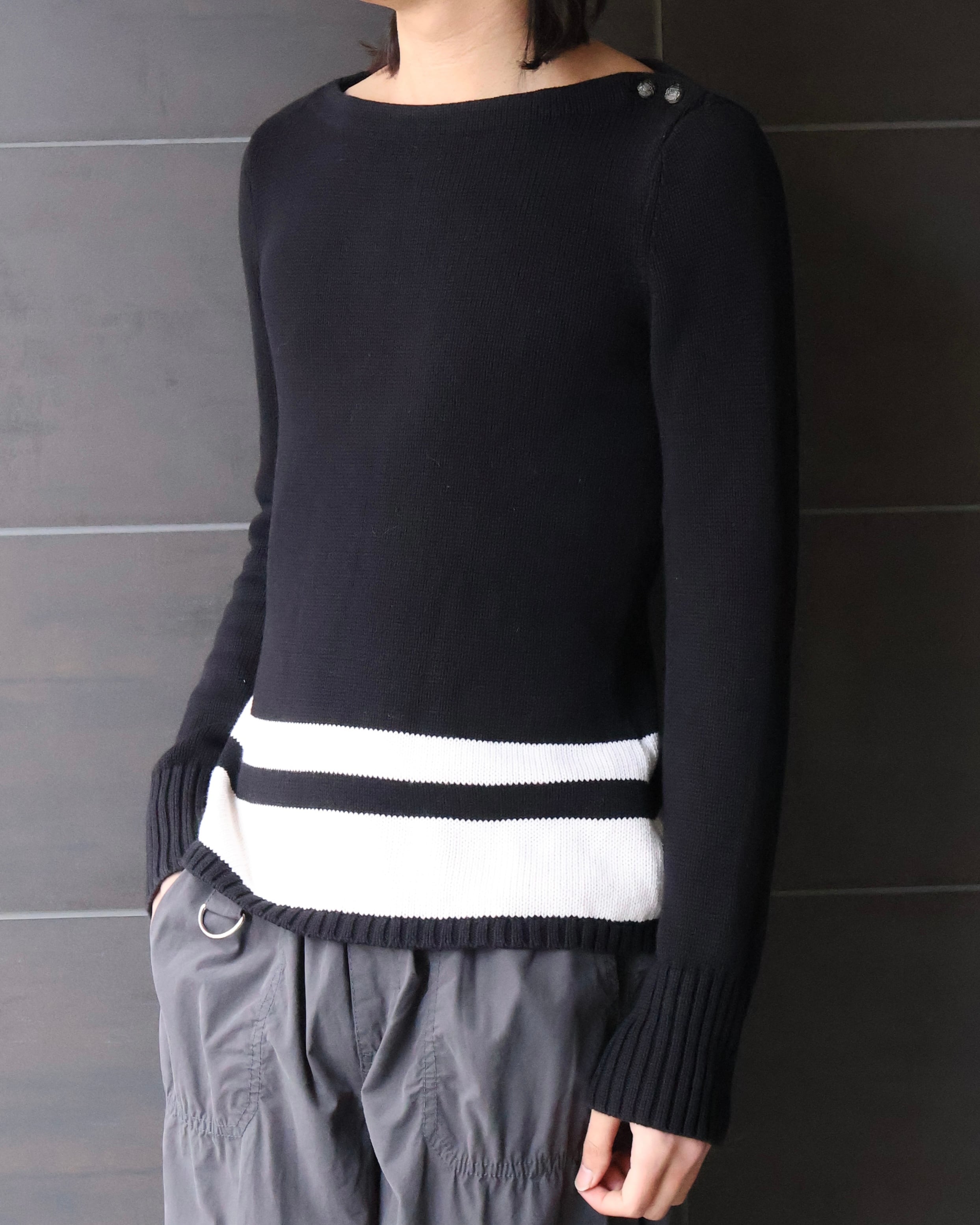 裾のラインデザインが特徴的なコットンニット。細太2本のラインがかなりインパクトを与えますが、ネックのデザインも粋で、個人的にはドットや、ストライプの綺麗なシャツをレイヤードしてとことん柄で遊びたい、遊び心を刺激する一枚かと。
