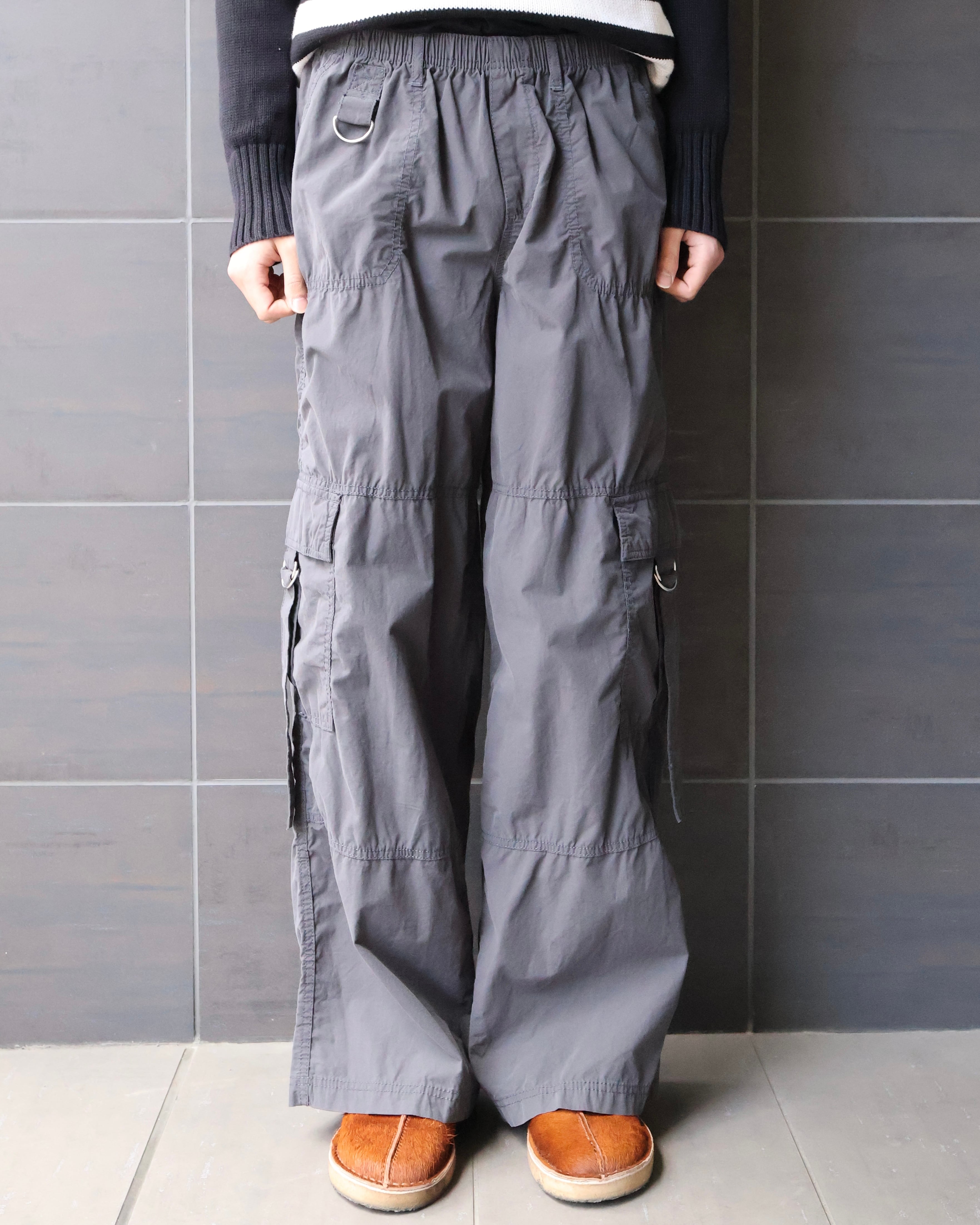 色味の良いワイドストレートシルエットのカーゴパンツ。カジュアルになりがちなカーゴではあるが、色のトーンが落ち着いているため外しとして成立する、カーゴのいいニュアンスだけ抽出できる一本。
