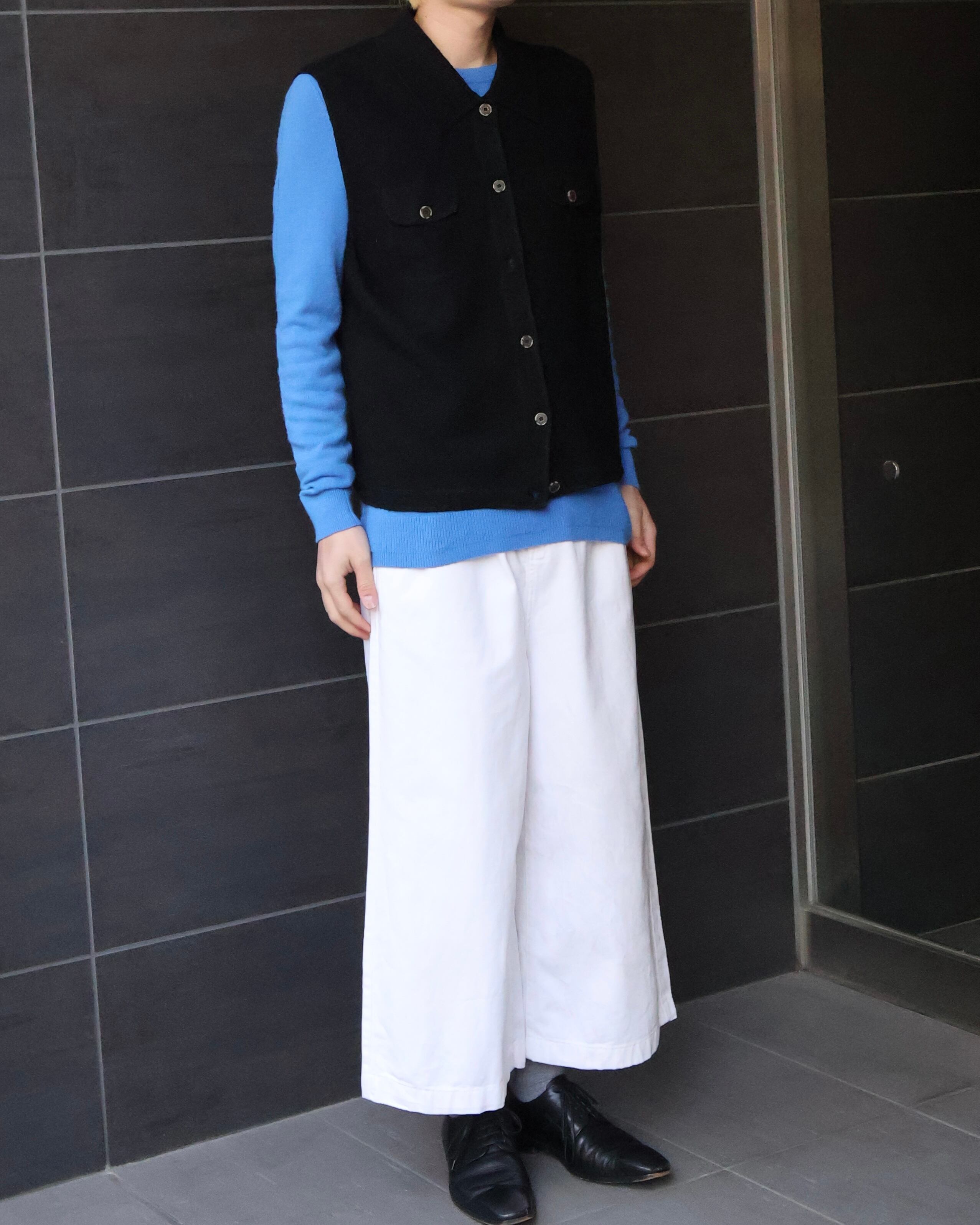 黒のベーシックなウールベスト。サードデニムジャケットの様なディテールが施されており、ウールでありながらどこかカジュアルな抜け感を演出できる1着。