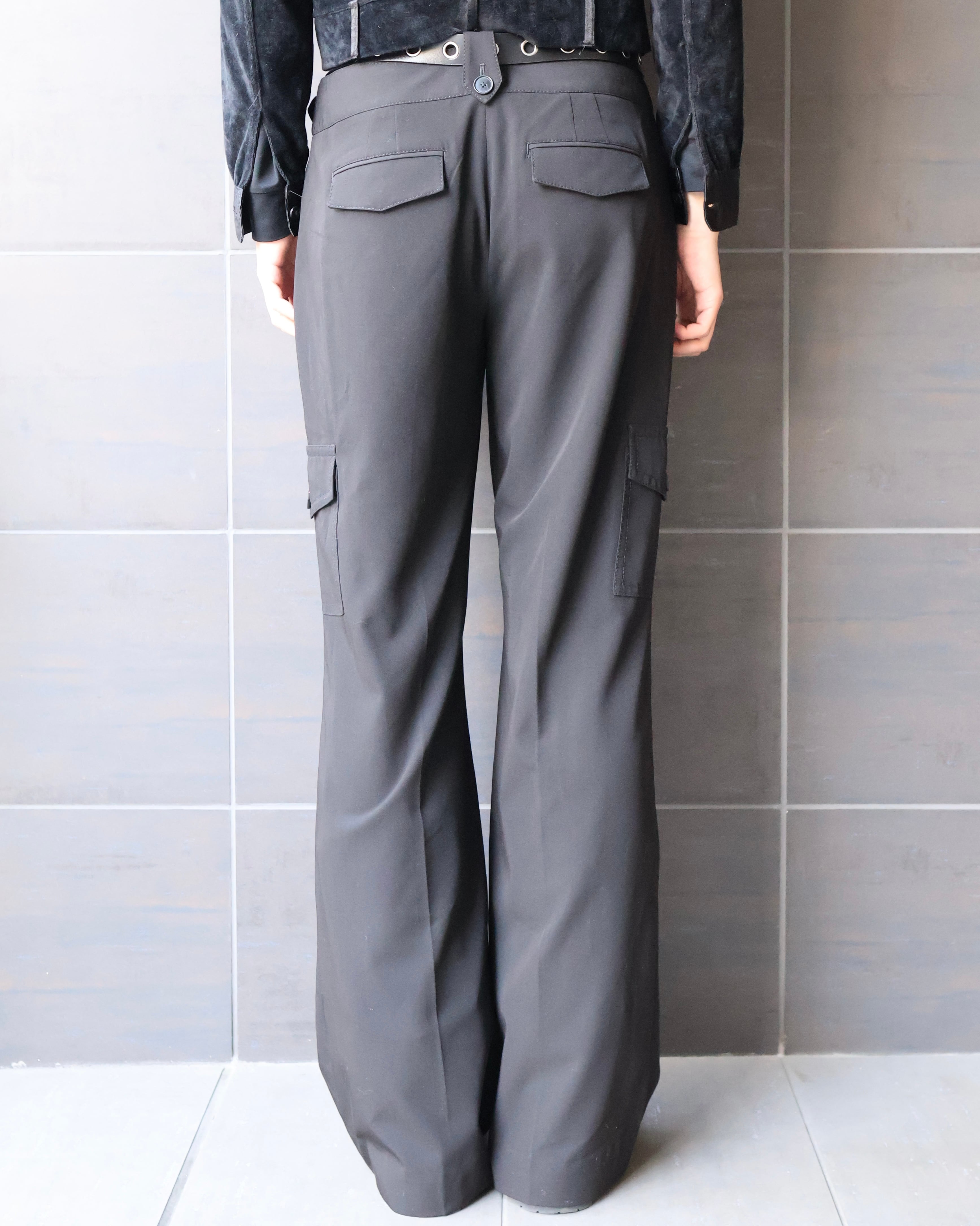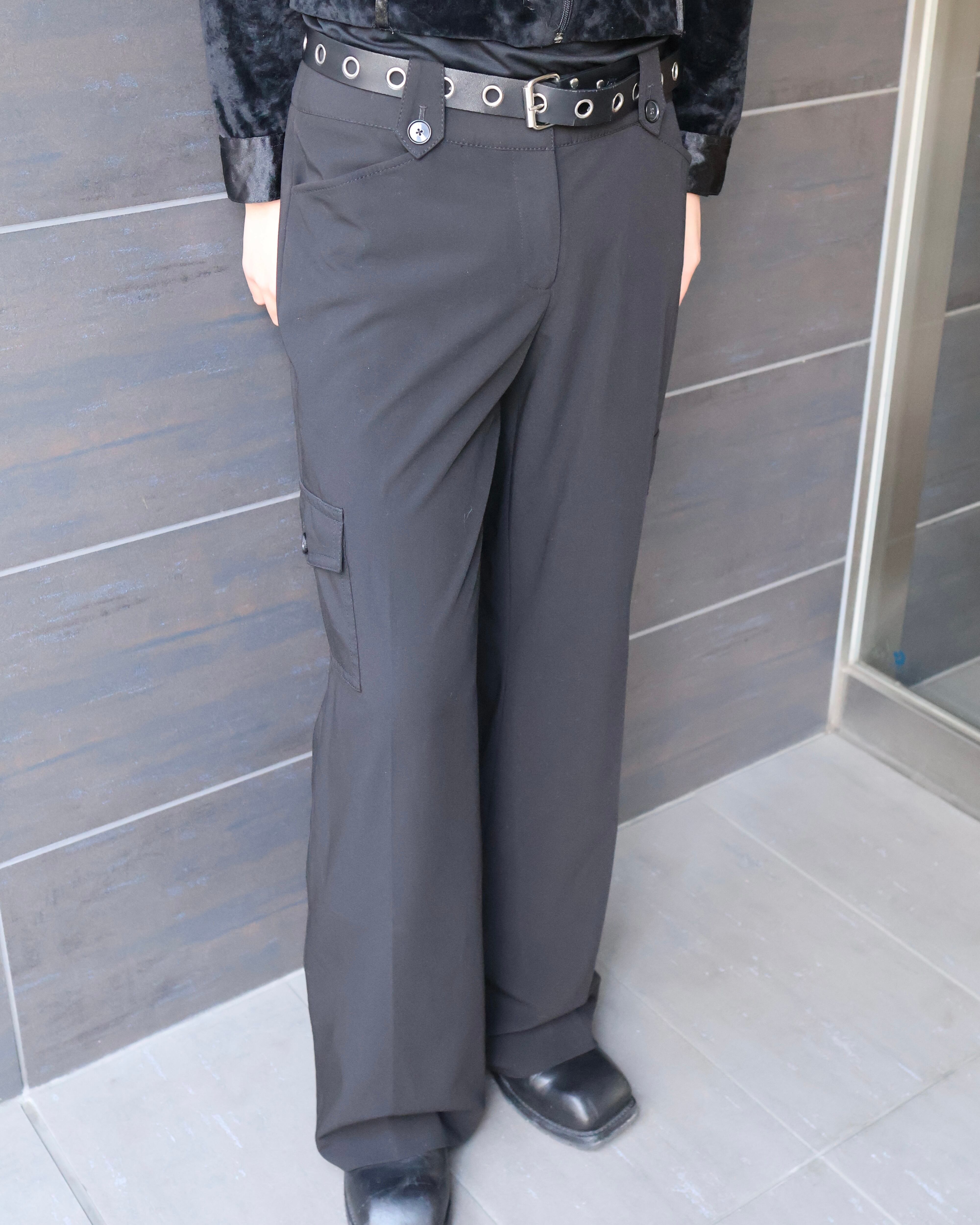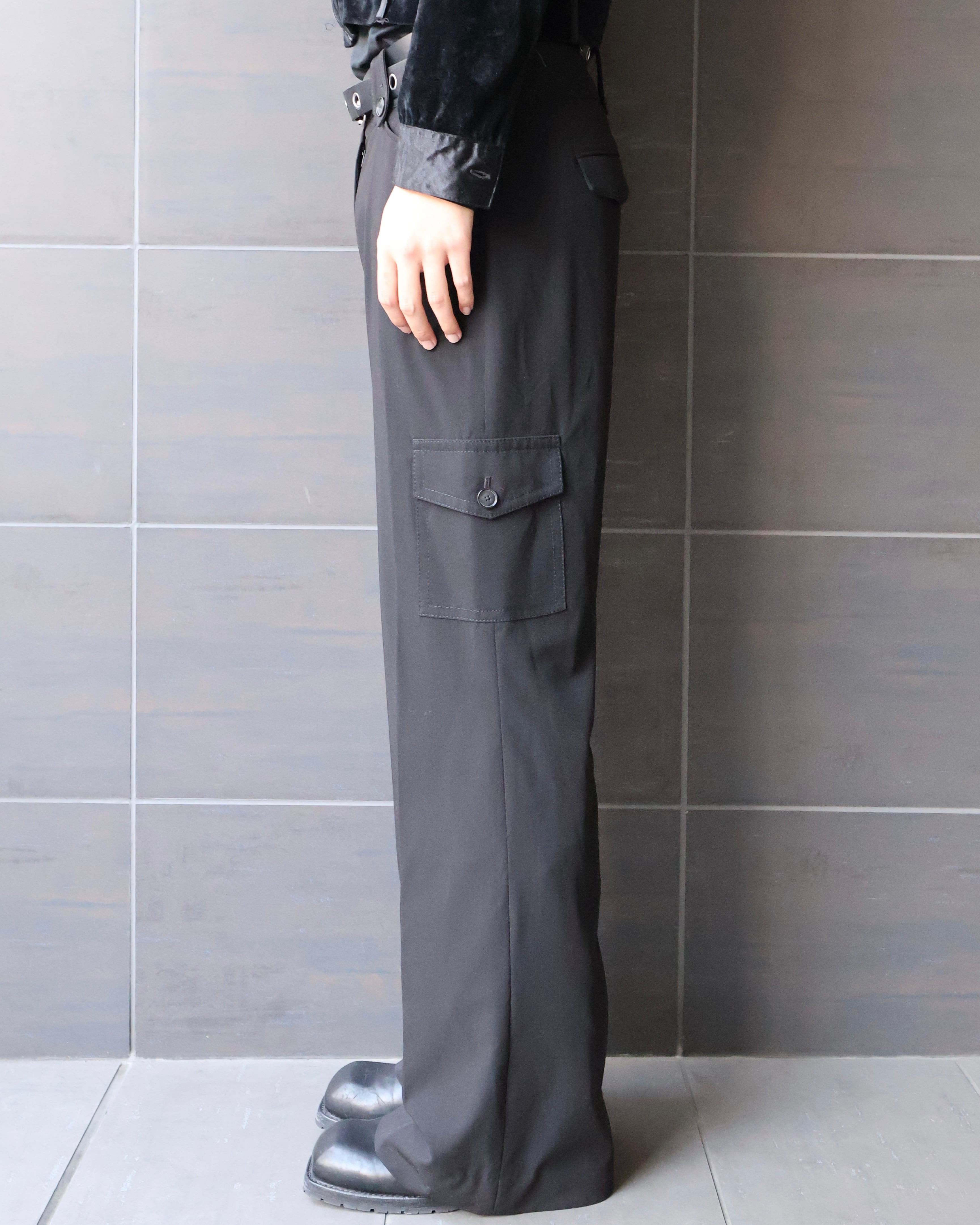 きれいなストレートシルエットの黒スラックスにカーゴポケットが採用された1着。スタイリングの全体的なシルエットの邪魔にならないようにしながらカジュアルな印象を付け加えられるgoodなパンツ。