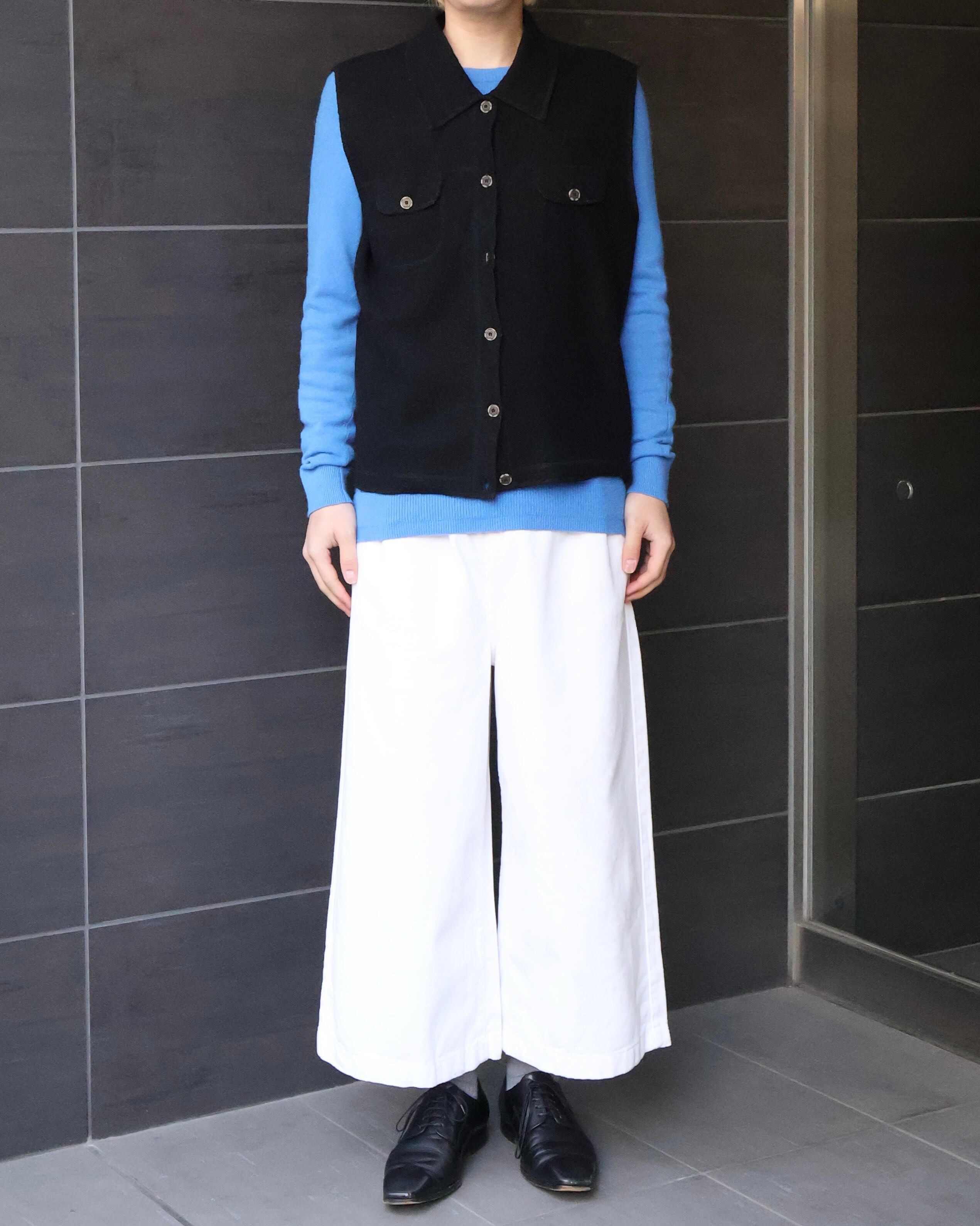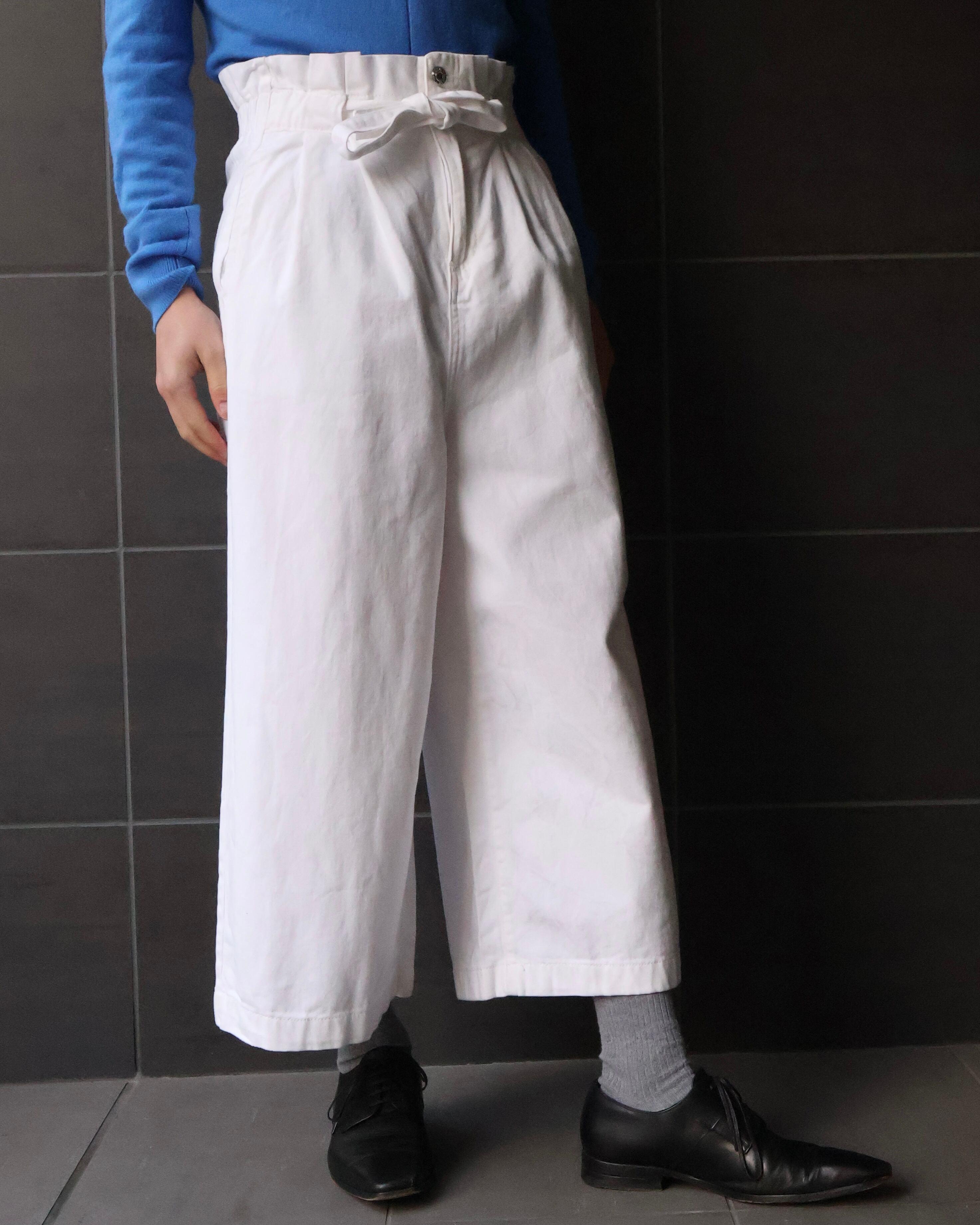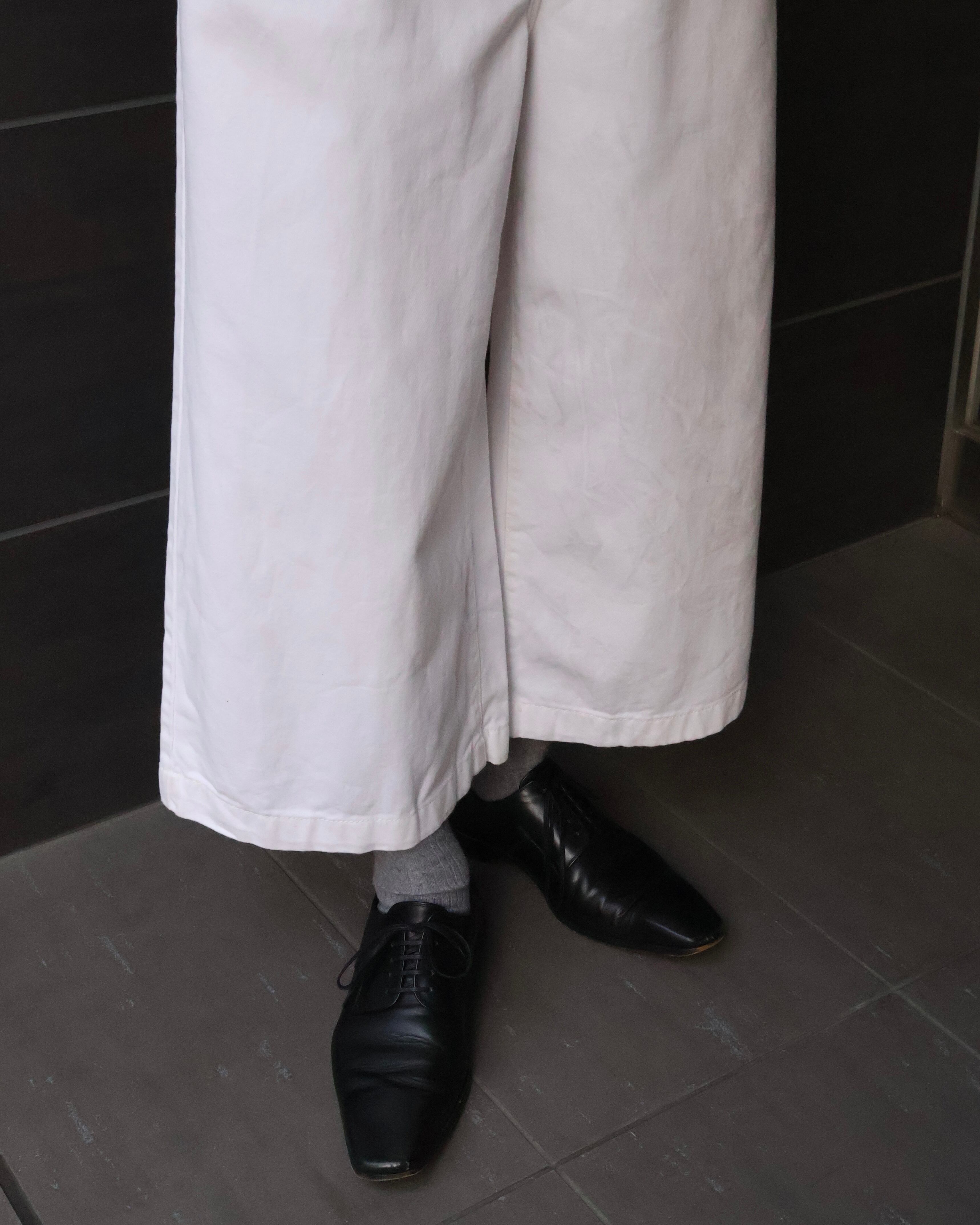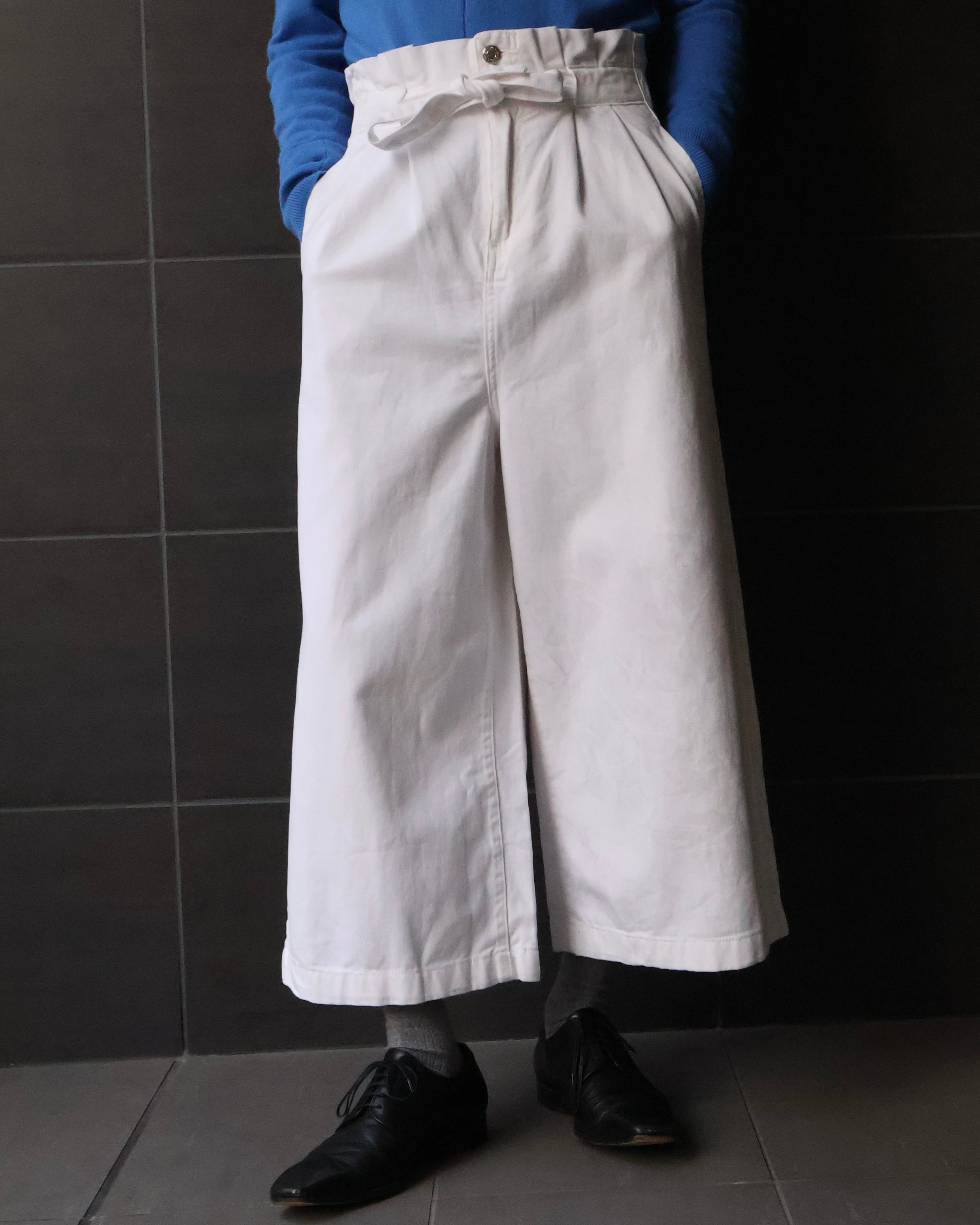 ガシガシした厚めのコットン地で作られているが、色と裾に向かって広がるフレアのシルエットがどこか上品さを感じさせてくれる1着。普段のスタイリングに少し違和感や面白さを付け加えたい時に活躍してくれるパンツ。