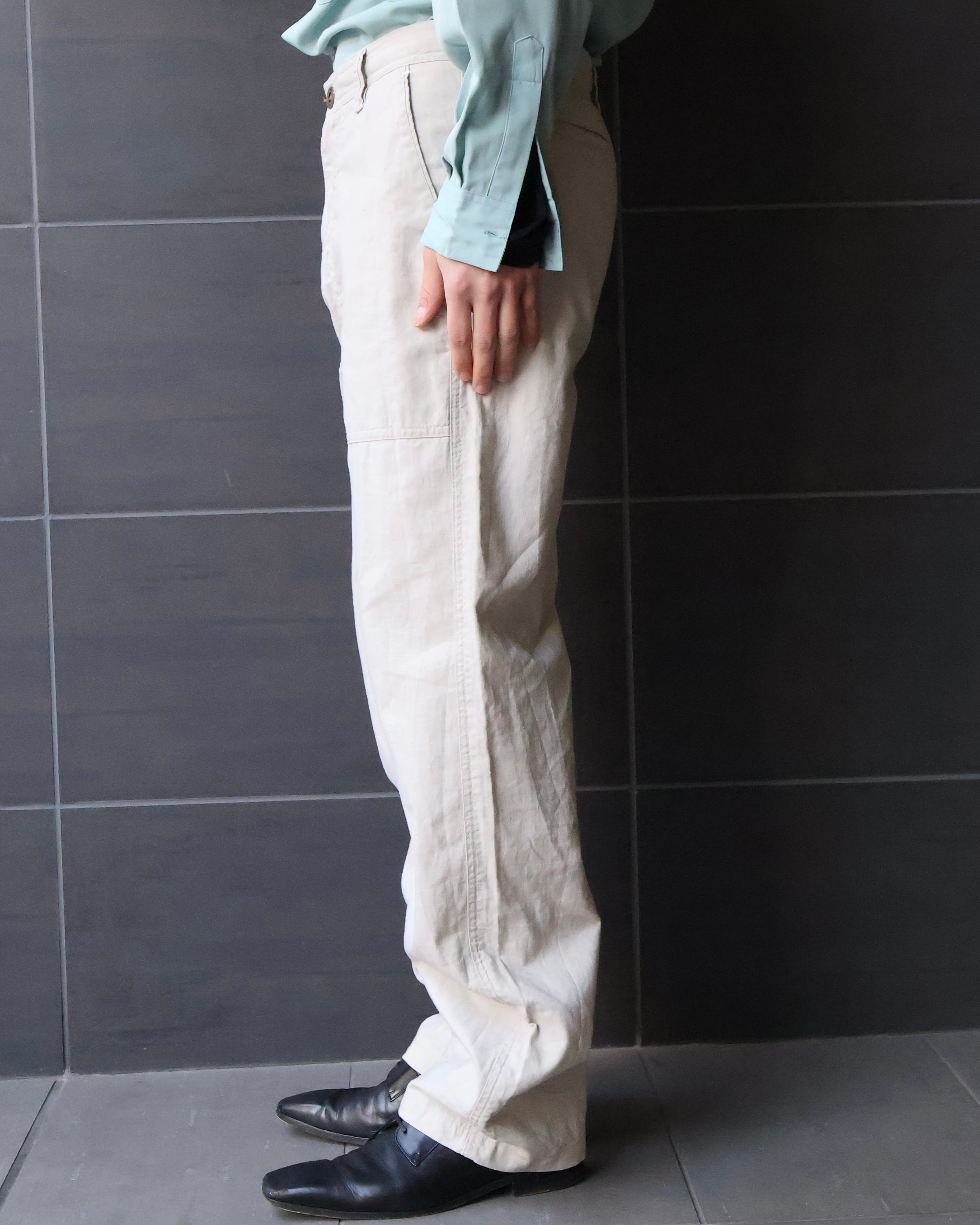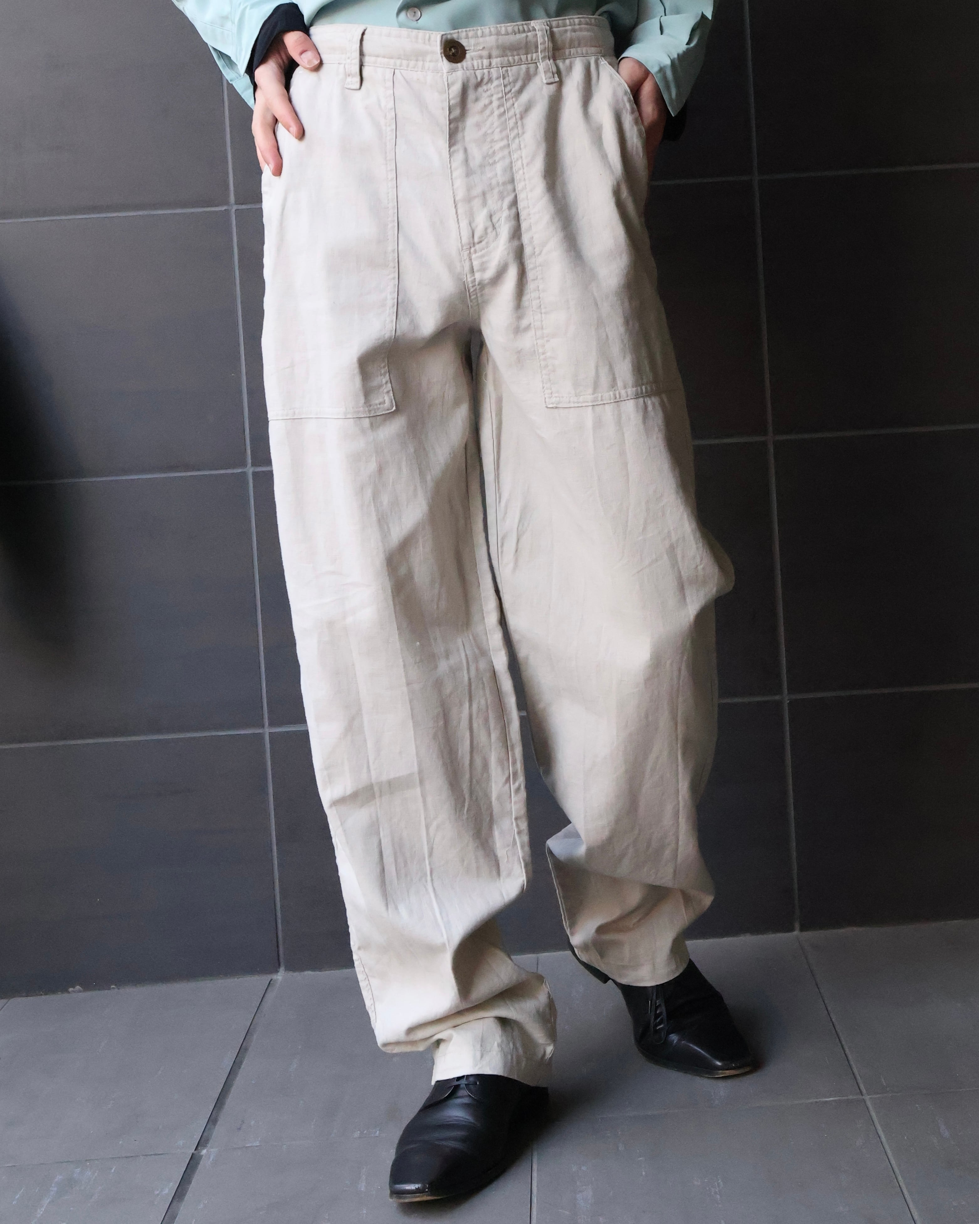 春先や夏活躍してくれるgoodなリネンパンツ。リネンのいなたい印象を薄い上品な色が中和しており、どんなスタイリングにも落とし込みやすいパンツに仕上がっている。