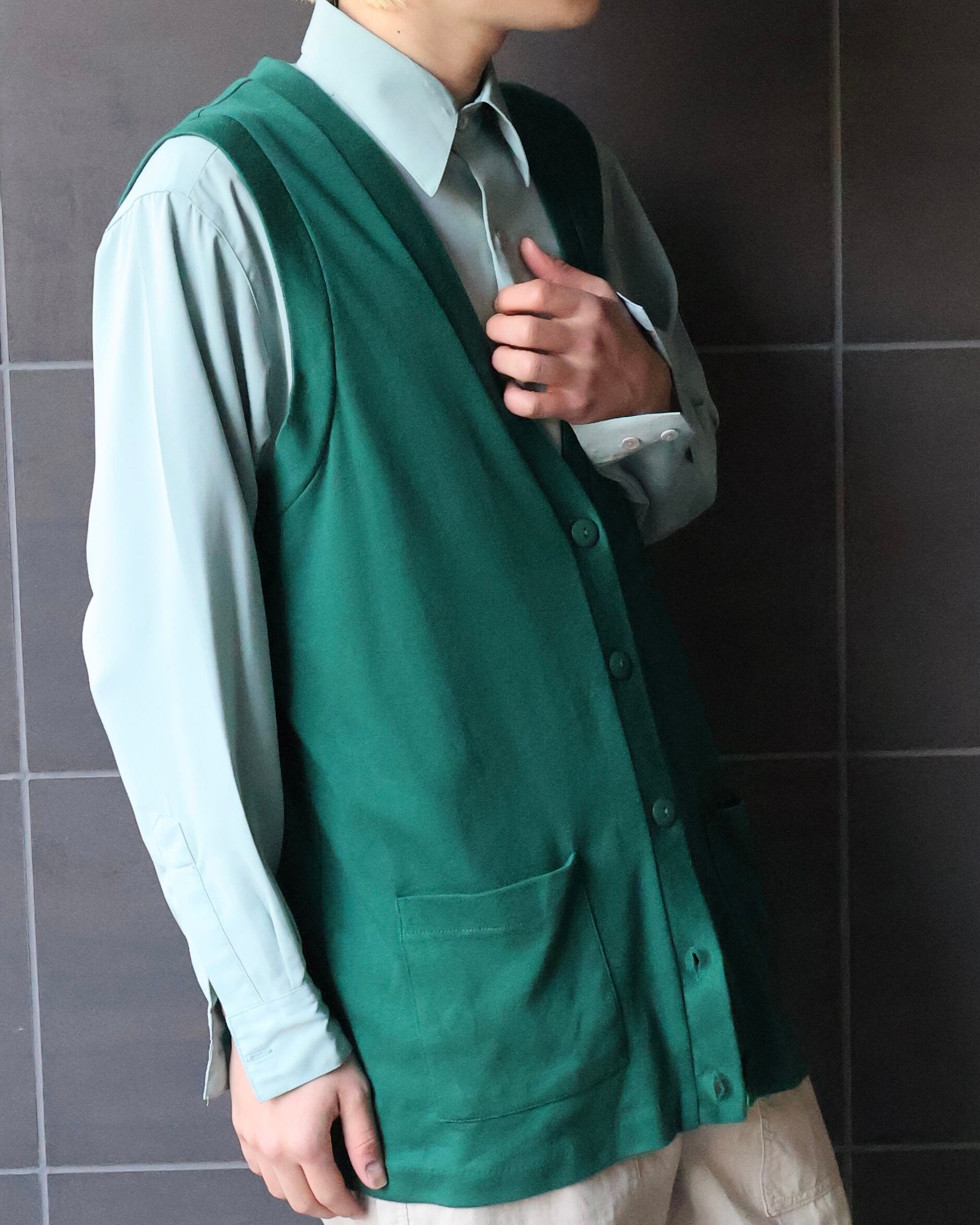 丈が長めに採られた良い色のカーディガンベスト。首もとが深く空いており、インナーとしてスタイリングに色を足したい時に主張が強くなりすぎないバランスがgood。夏、中にタンクトップを仕込んでノースリーブのように一枚で着てもgood。
