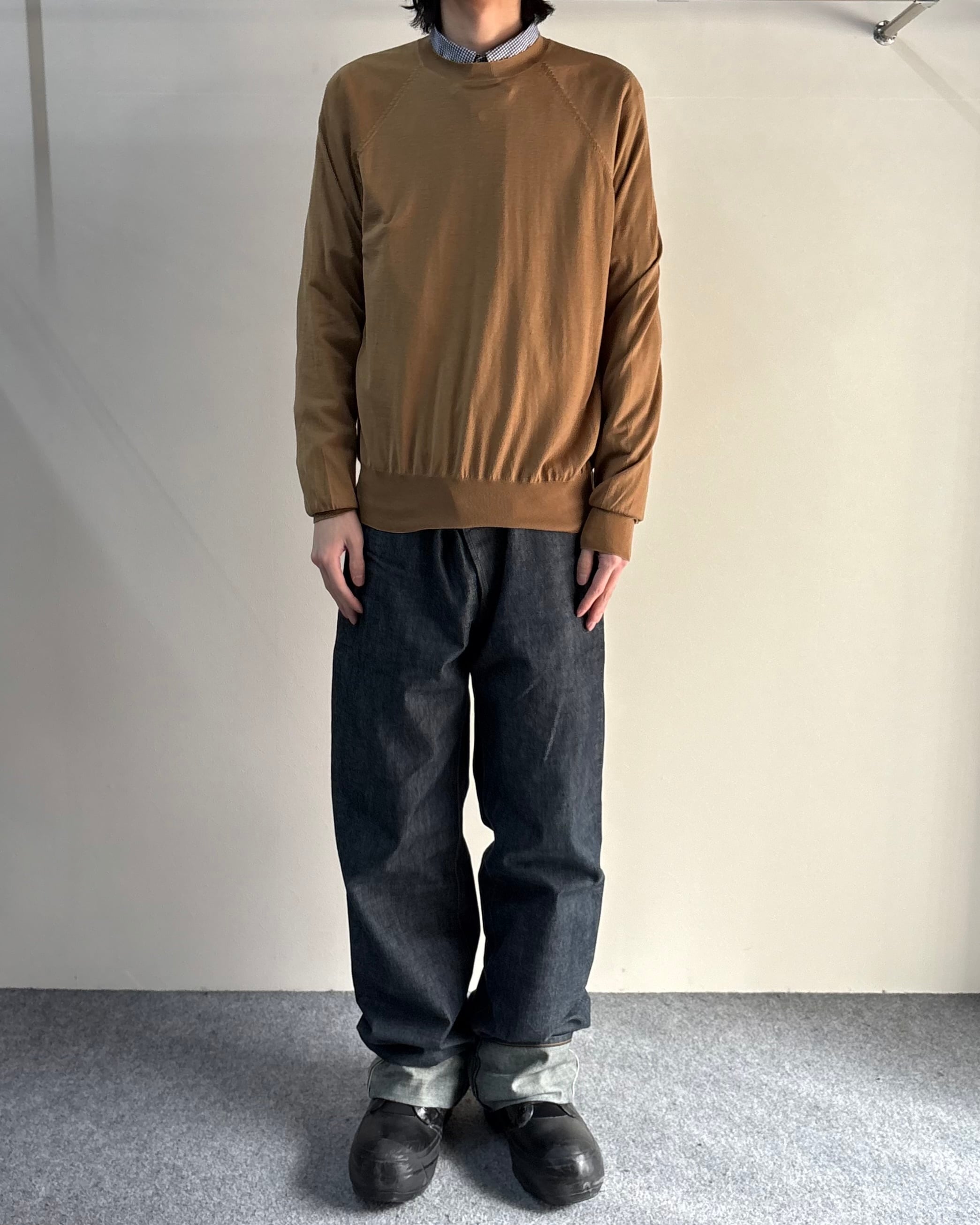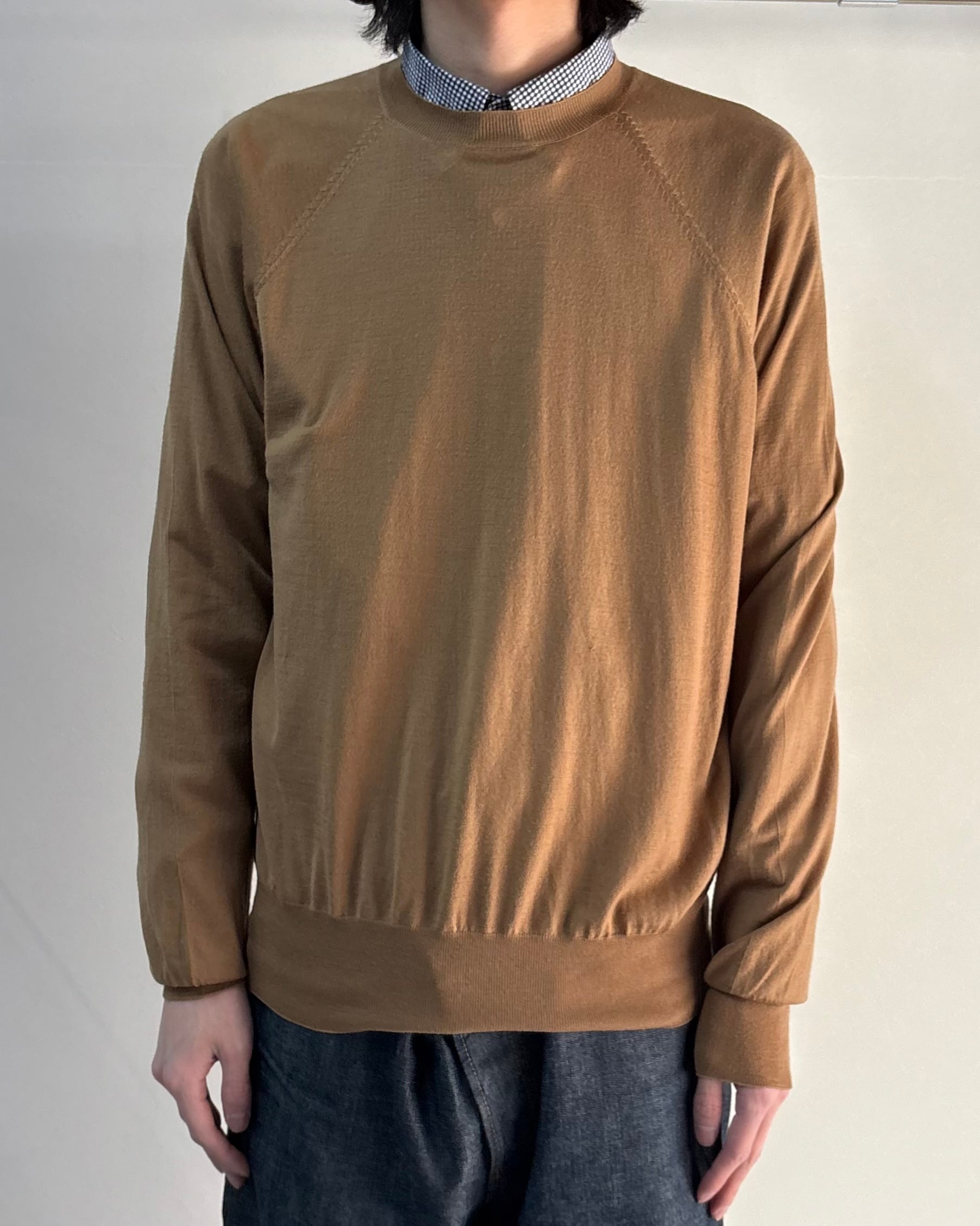 上質なハイゲージニットによる滑らかな質感と、落ち着いたキャメルカラーが特徴のアイテム。ラグランスリーブで肩まわりの収まりが良く自然で美しいシルエット。シャツとのレイヤードから単体での着用まで幅広く対応する汎用性の高い一着。