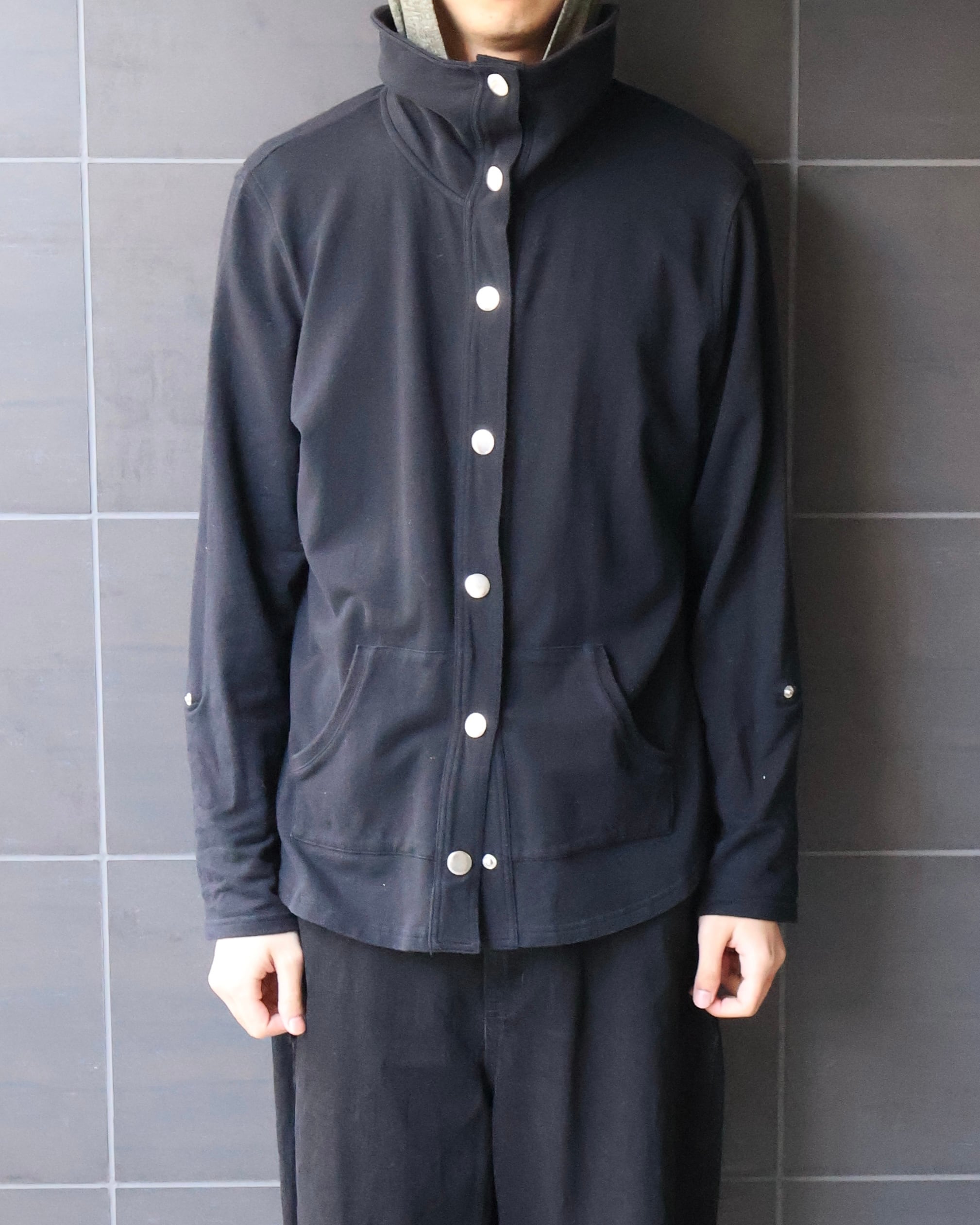 軽めのスウェット生地にモードな印象を与える銀のスナップボタンが採用された1着。袖部分にも袖を固定できるボタンが採用されており、シルエットの変化、レイヤードの助力になっている。アウターとしてでも、コートなどのインナーとしても使える便利なブルゾン。