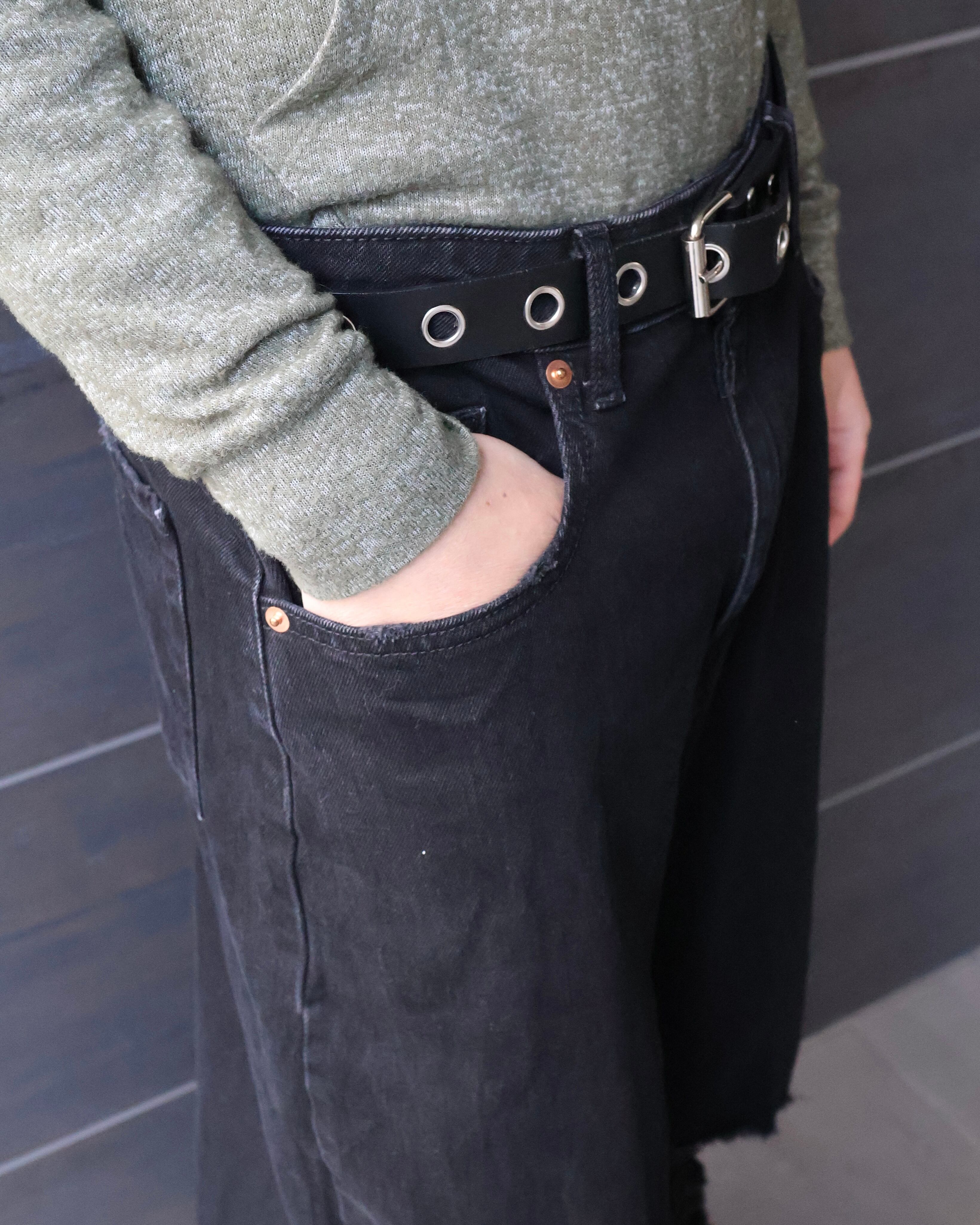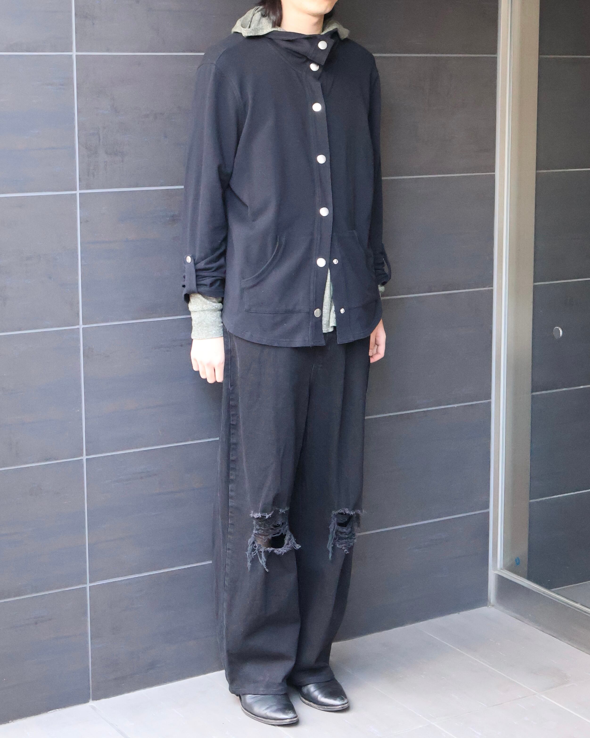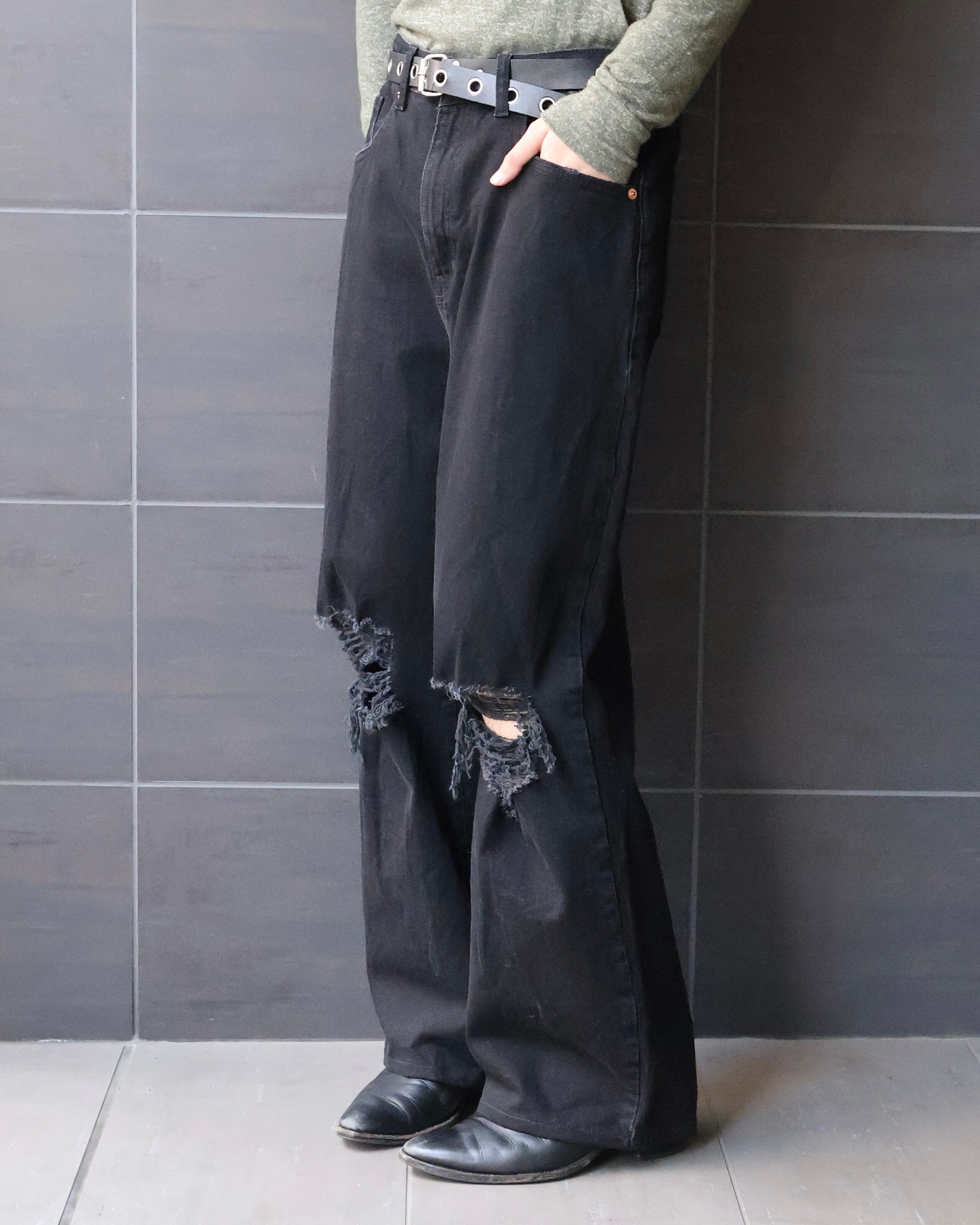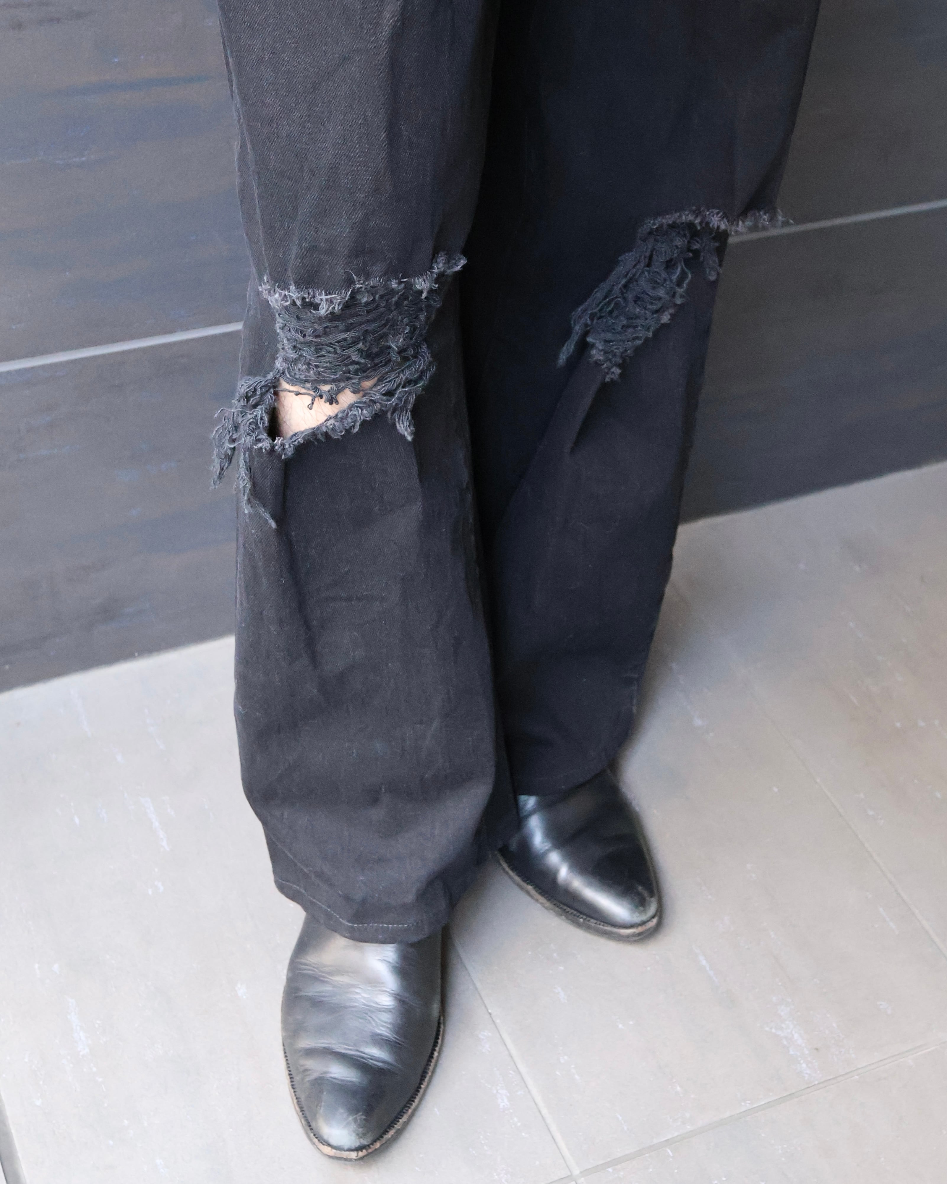 両膝下部分にダメージ加工が施されている1着。縦糸も横糸も黒なのでダメージ加工部分が白く目立ってしまうということがなく、さりげなくスタイリングにアクセントを加えることができる。デニム自体は黒のベーシックなワイドシルエットでどんなスタイリングにも落とし込みやすい。