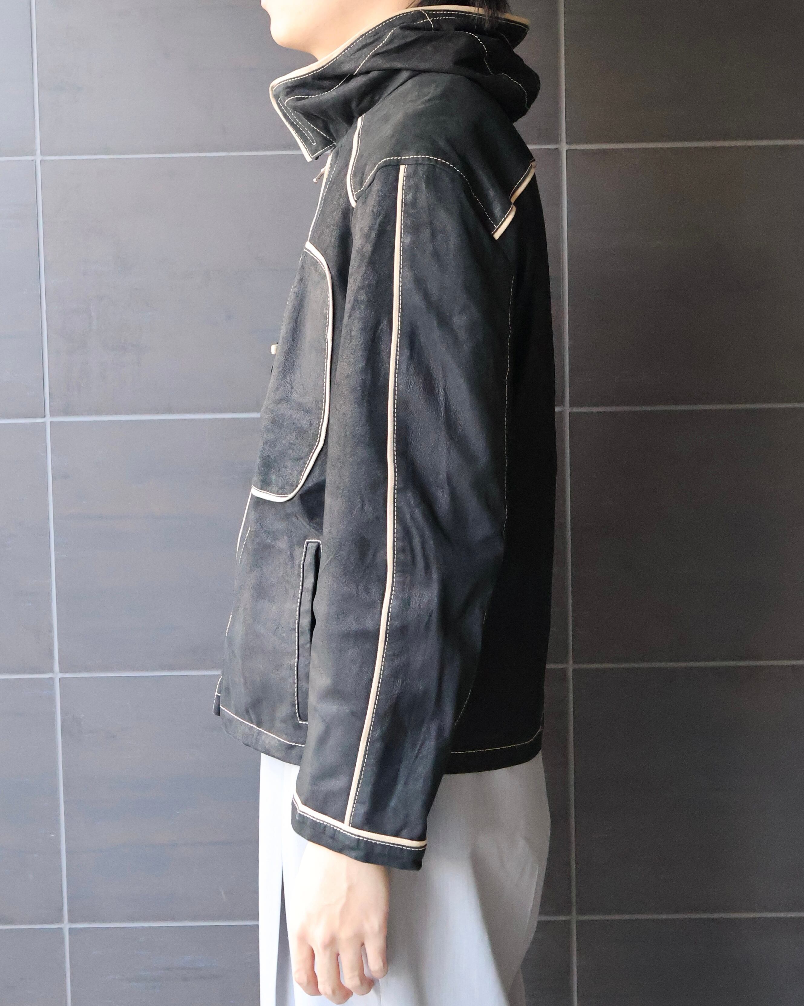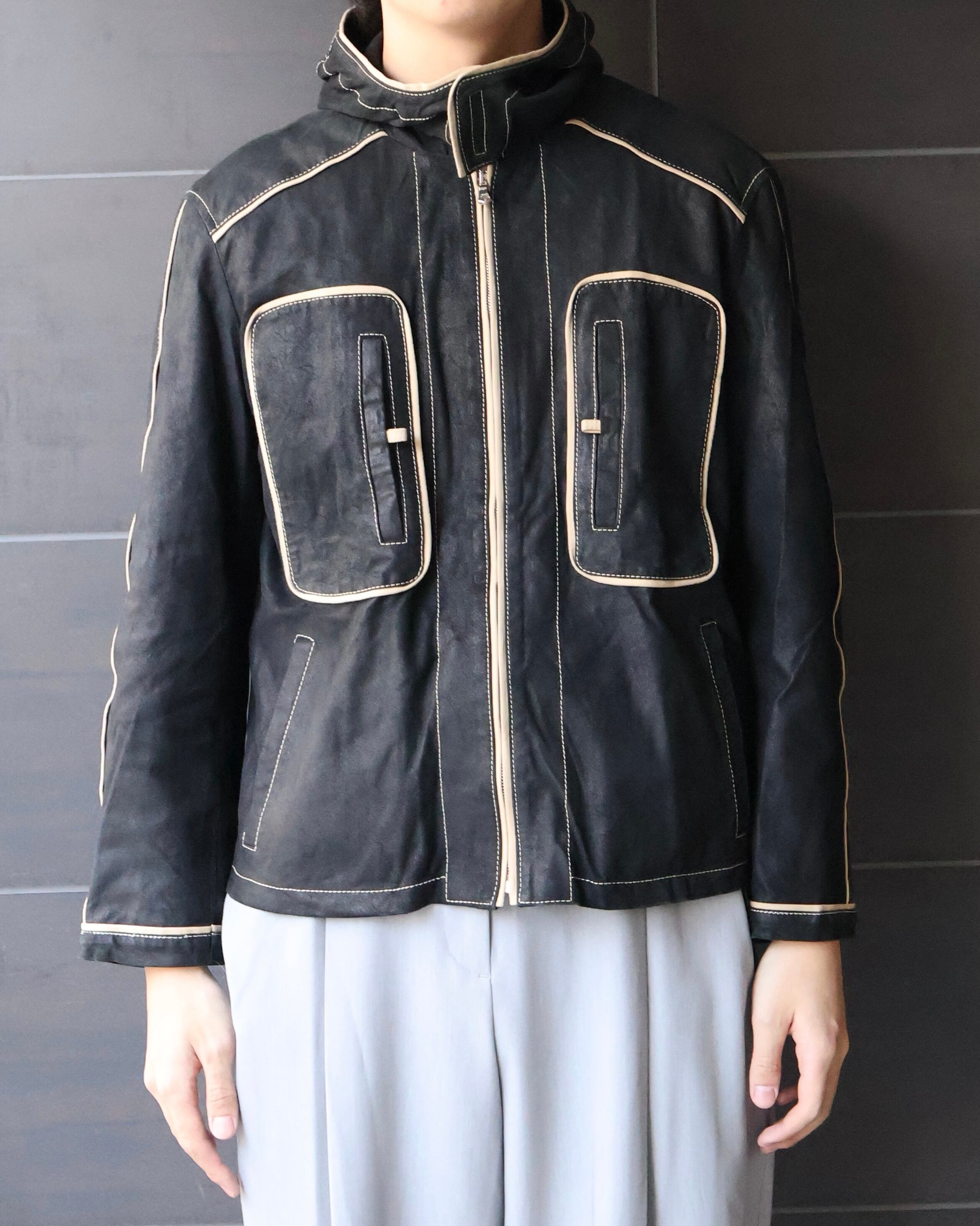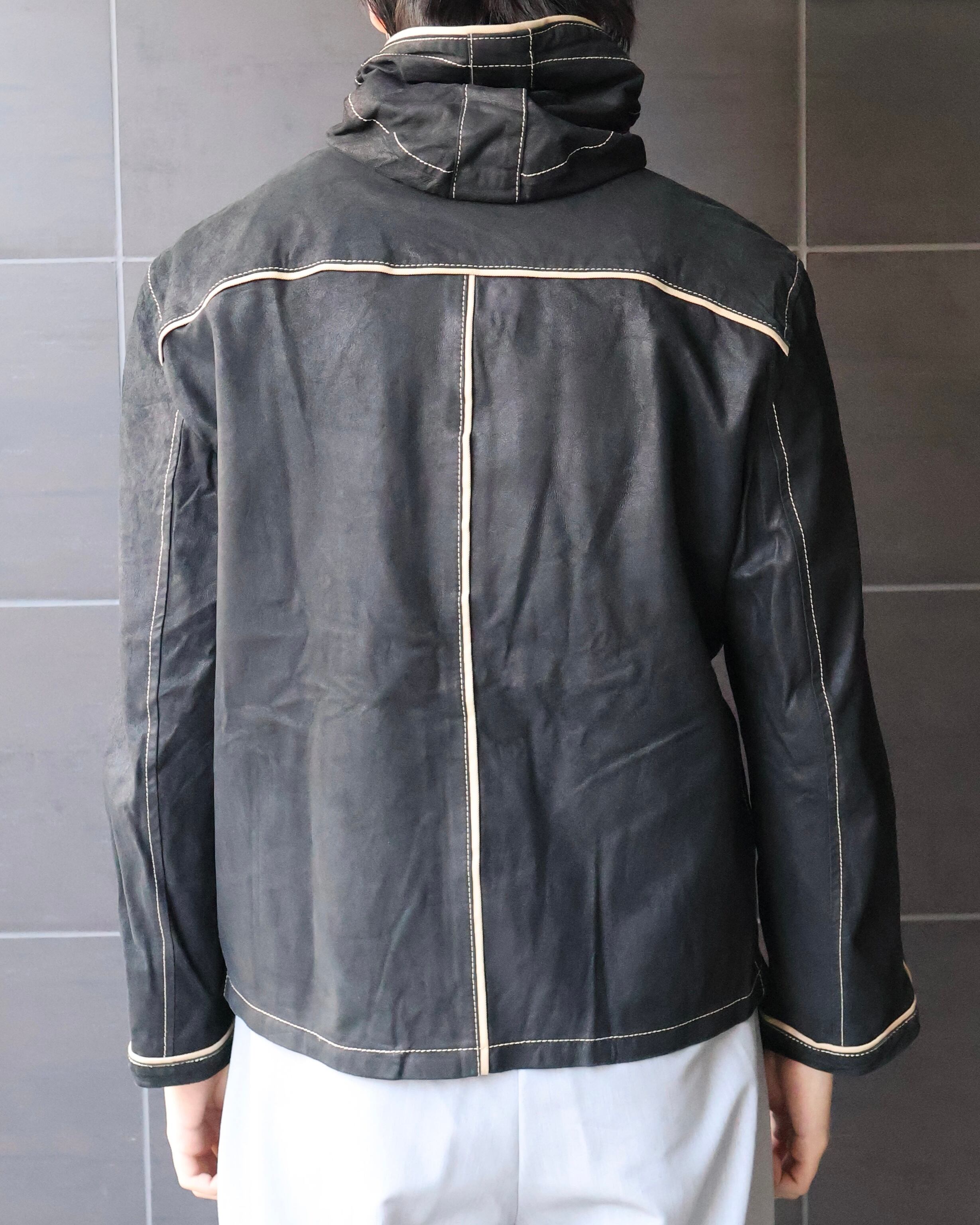 スポーティなシルエットのレザーフーディにベージュのパイピングが施された1着。全ての要素が絶妙なバランスで配置されており、1枚で着た時に間違いなく主役になるアイテム。もちろんインナーで使ってパイピングを少しレイヤードさせてあげるスタイルもgood。
