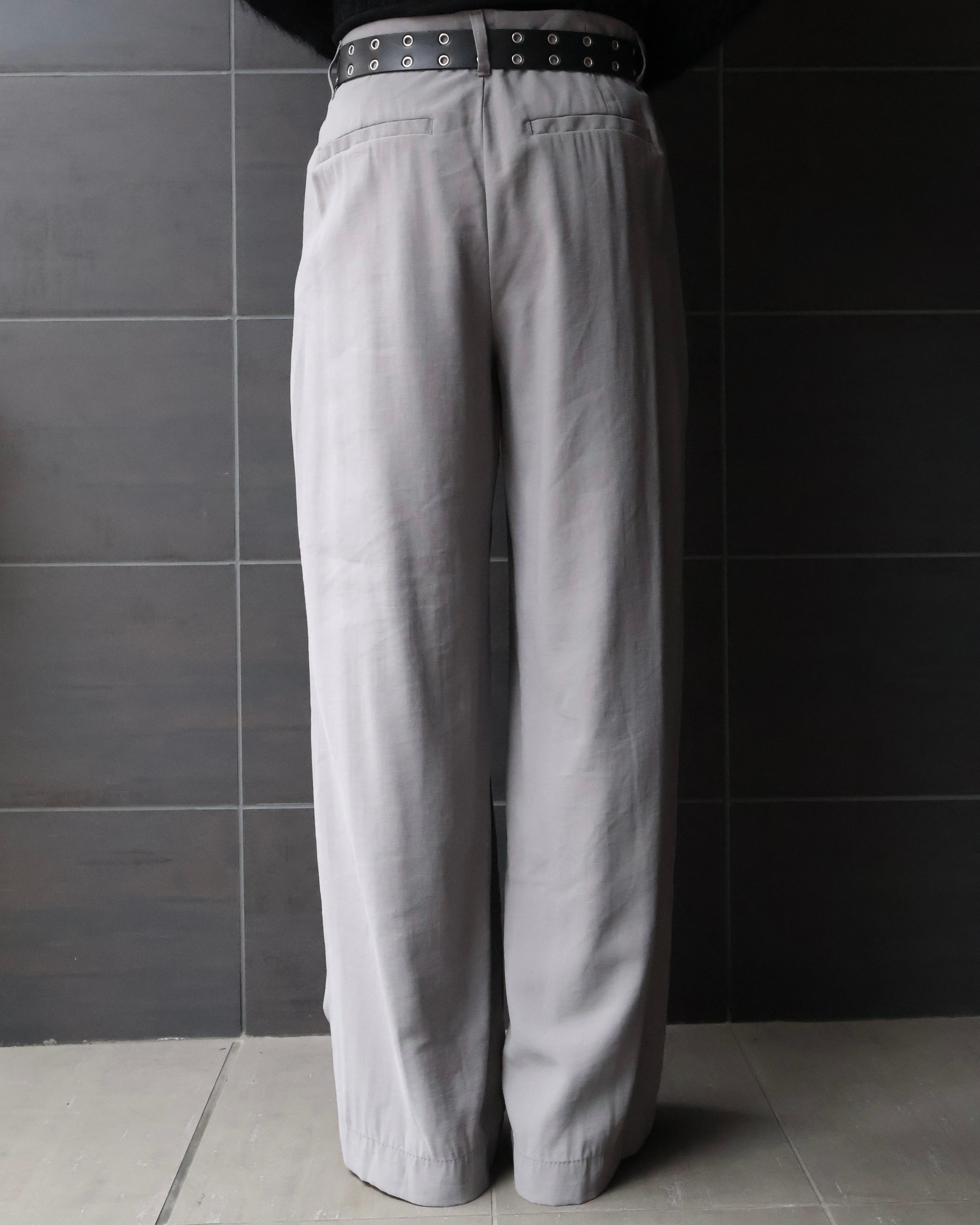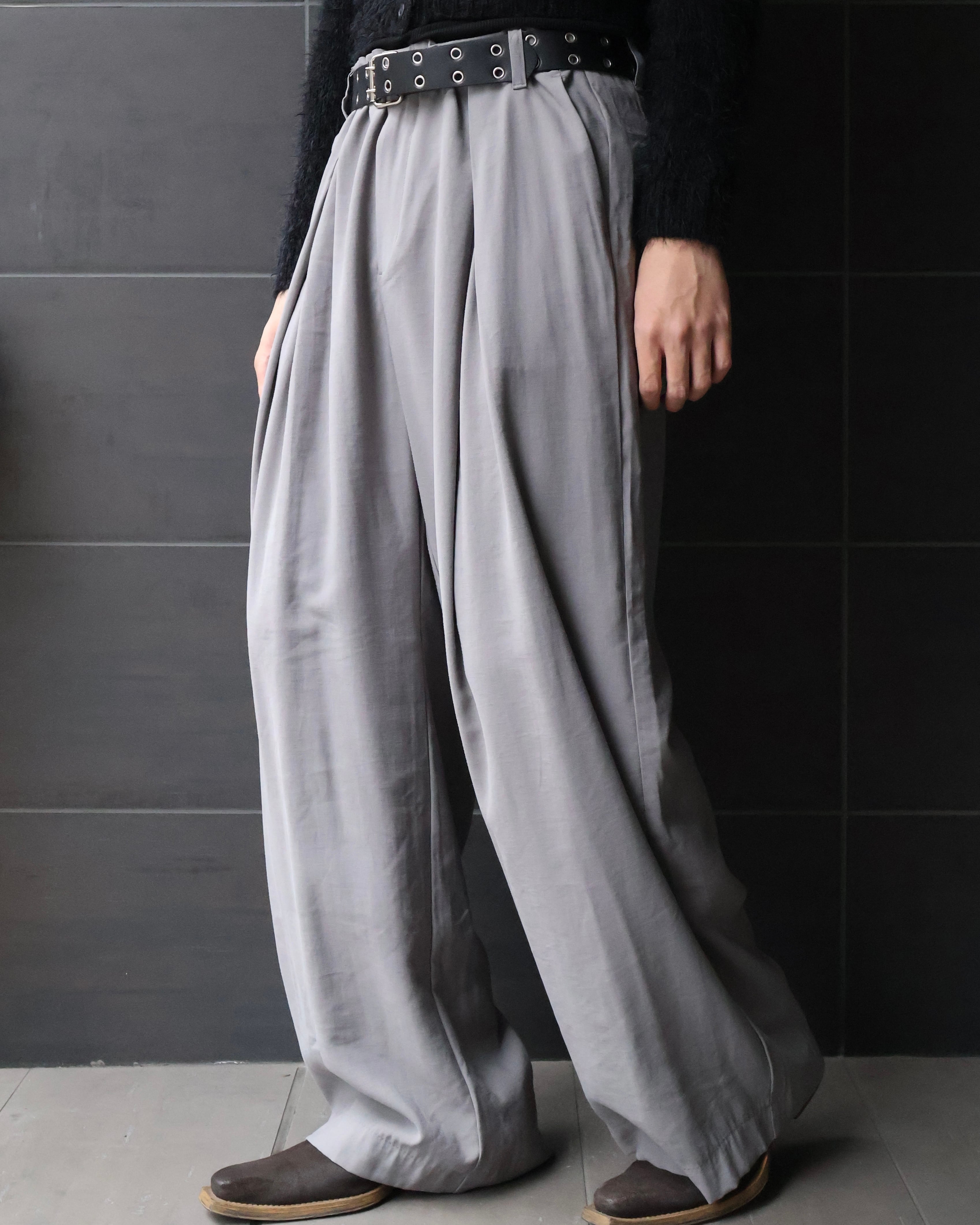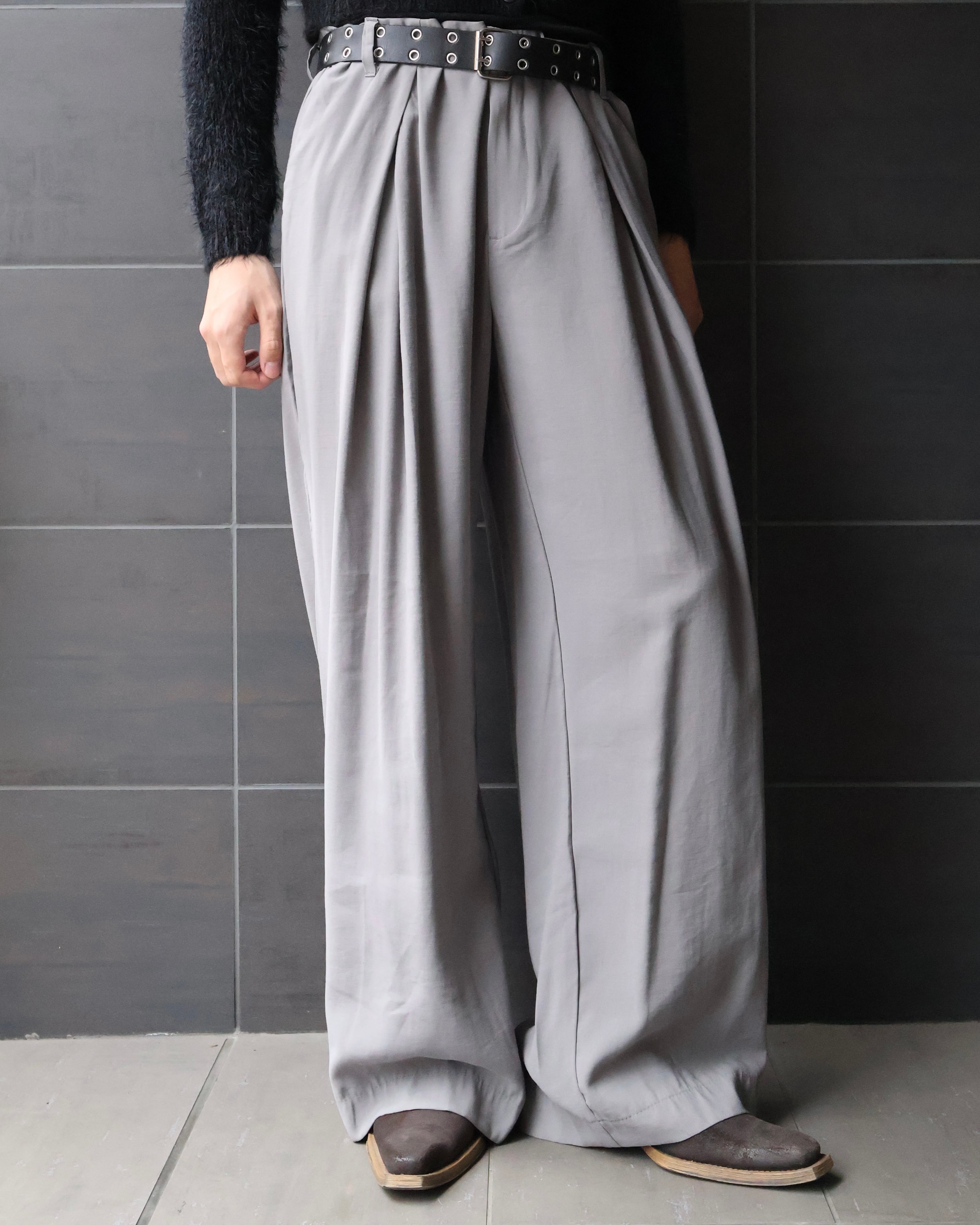 最近のワイドのトレンド、実はかなり日本人にフィットしていて、このパンツはまさに日本人が似合うスラックス。ただのワイドだとのっぺりしてしまいハマらないと感じる方も多いが、こちらのパンツは深く入ったタックがスタイルアップや、デザイン性として昇華されており、オールシーズンで活躍するような一本に仕上がっている。
