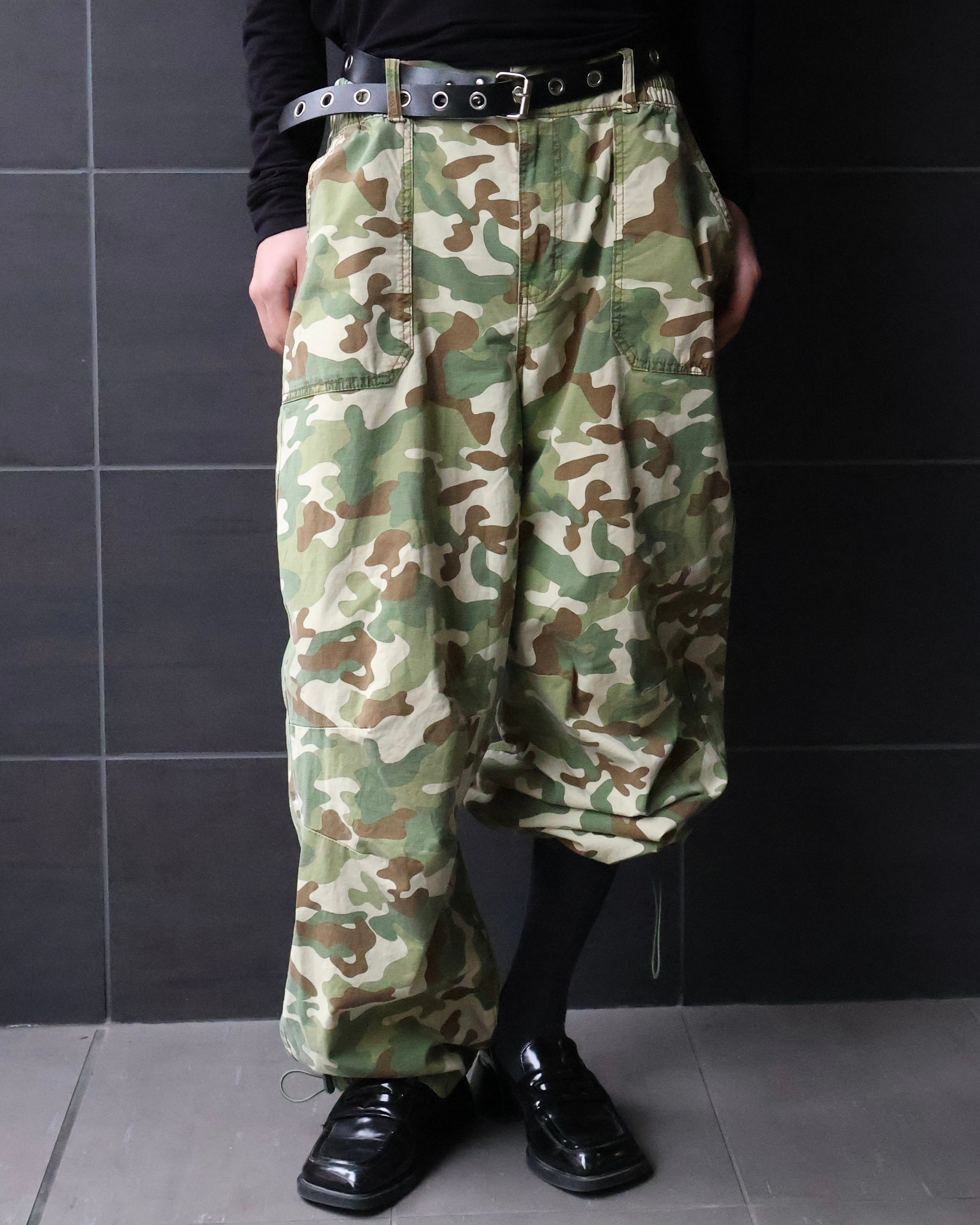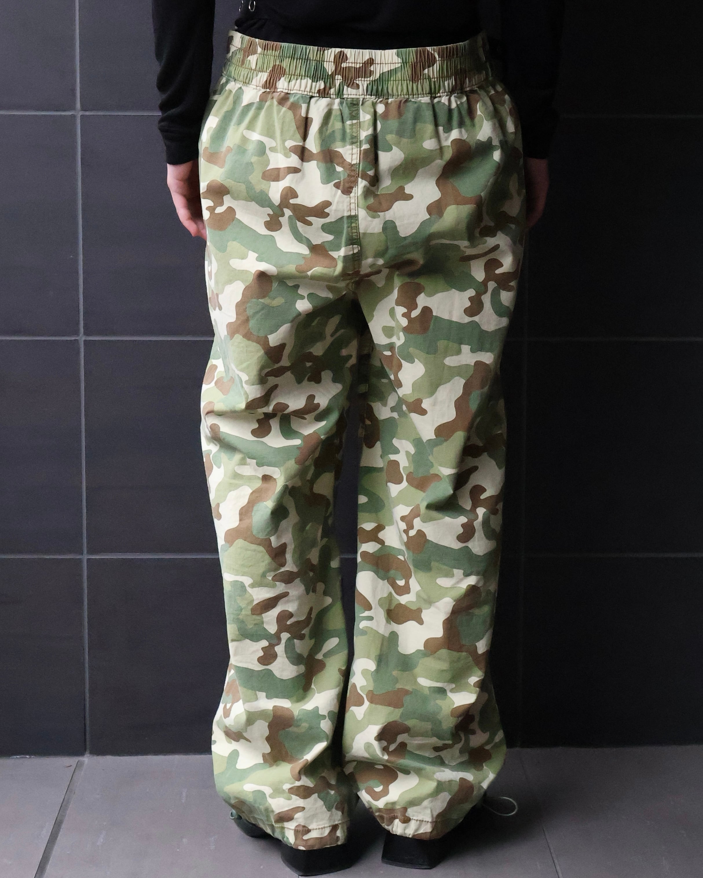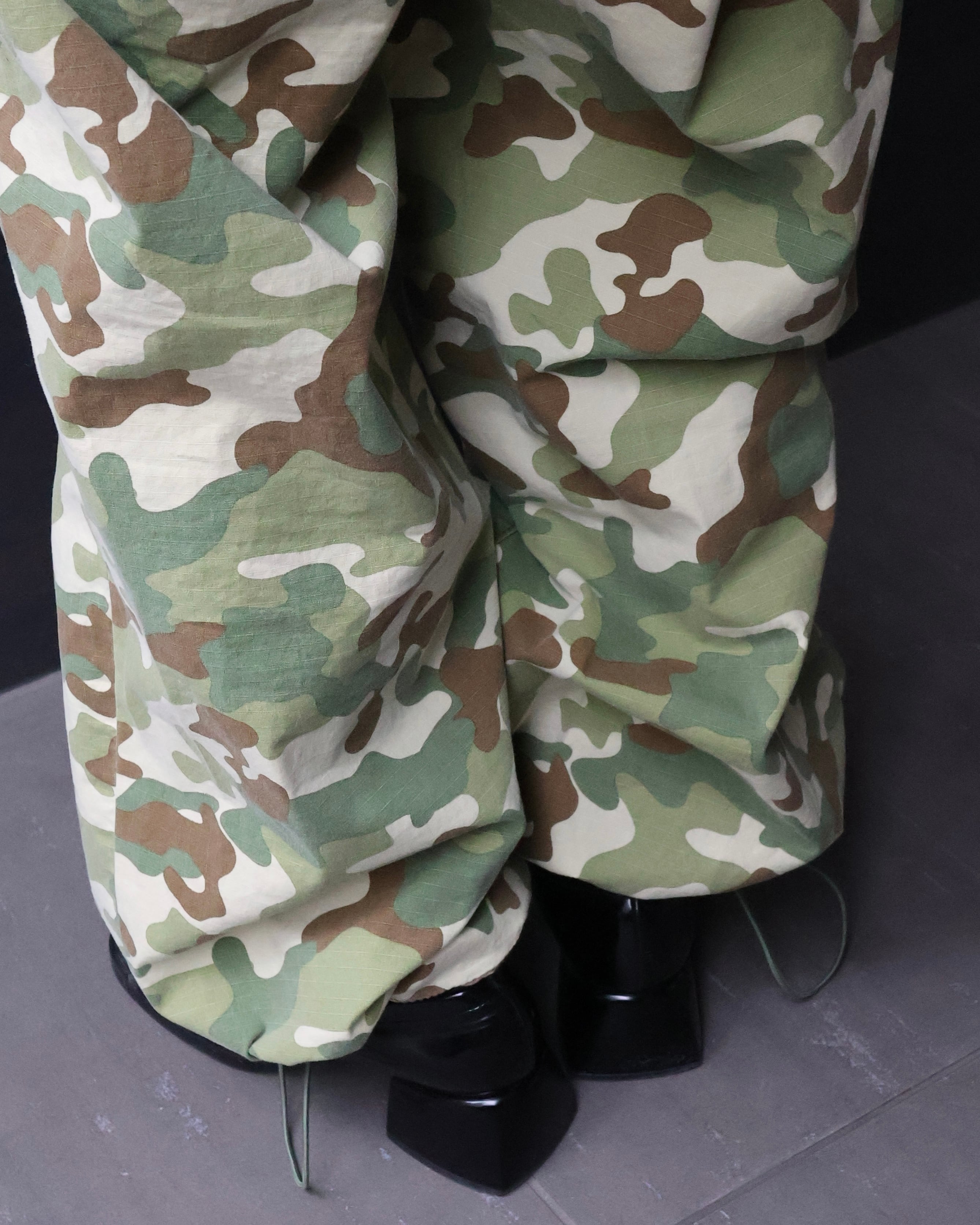ありそうでないギミカルなカモフラージュパンツ。どうしてもカモ柄は無骨になってファッショナブルに着こなせないのが多い中でこのパンツは柄の発色もよく、ドローコードがついておりシルエットの変化を楽しめる、目新しいパンツ。