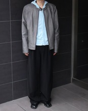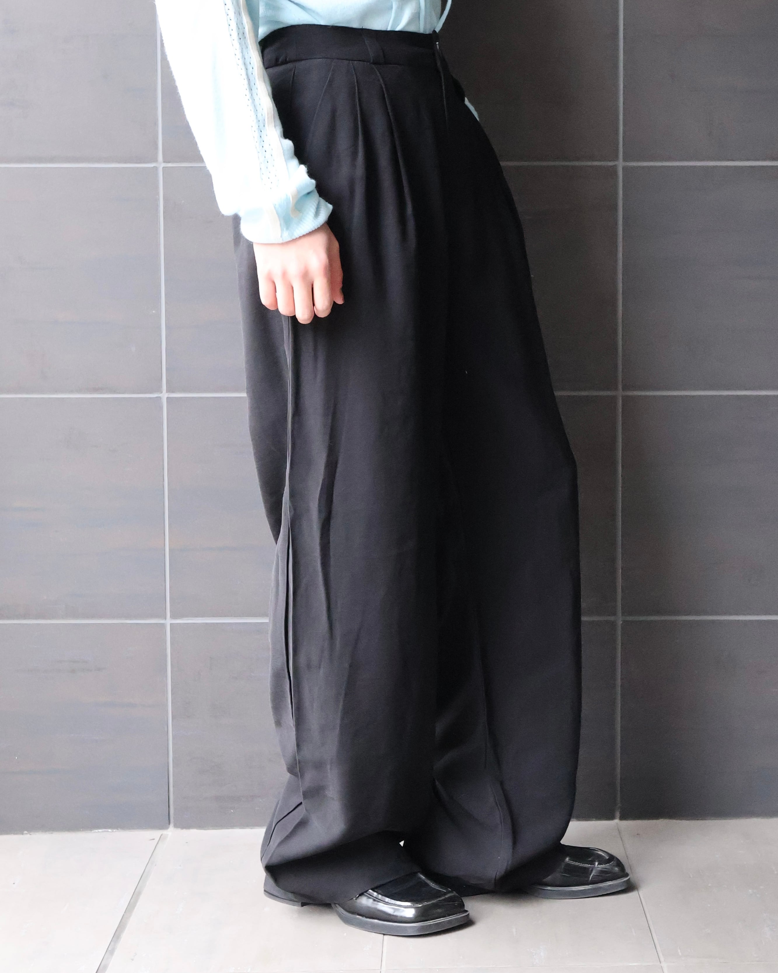 深い黒のストレートスラックス。漆黒ではなく、レーヨンの光沢感がのっぺりしない下半身を作り上げ、オールブラックでも決まるコーディネートを仕上げる。シルエットはもちろんよく、下半身のベースとなりえる一本。