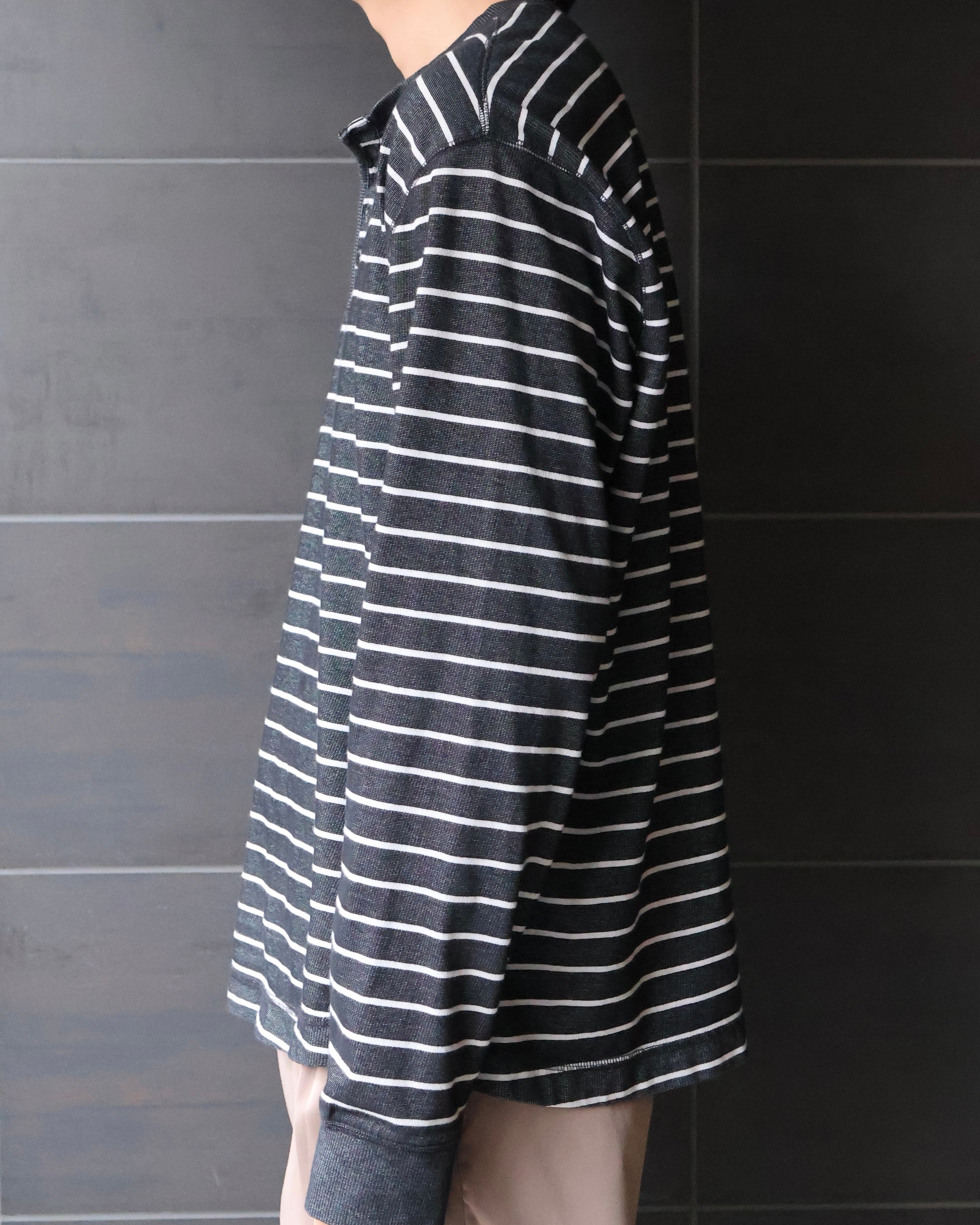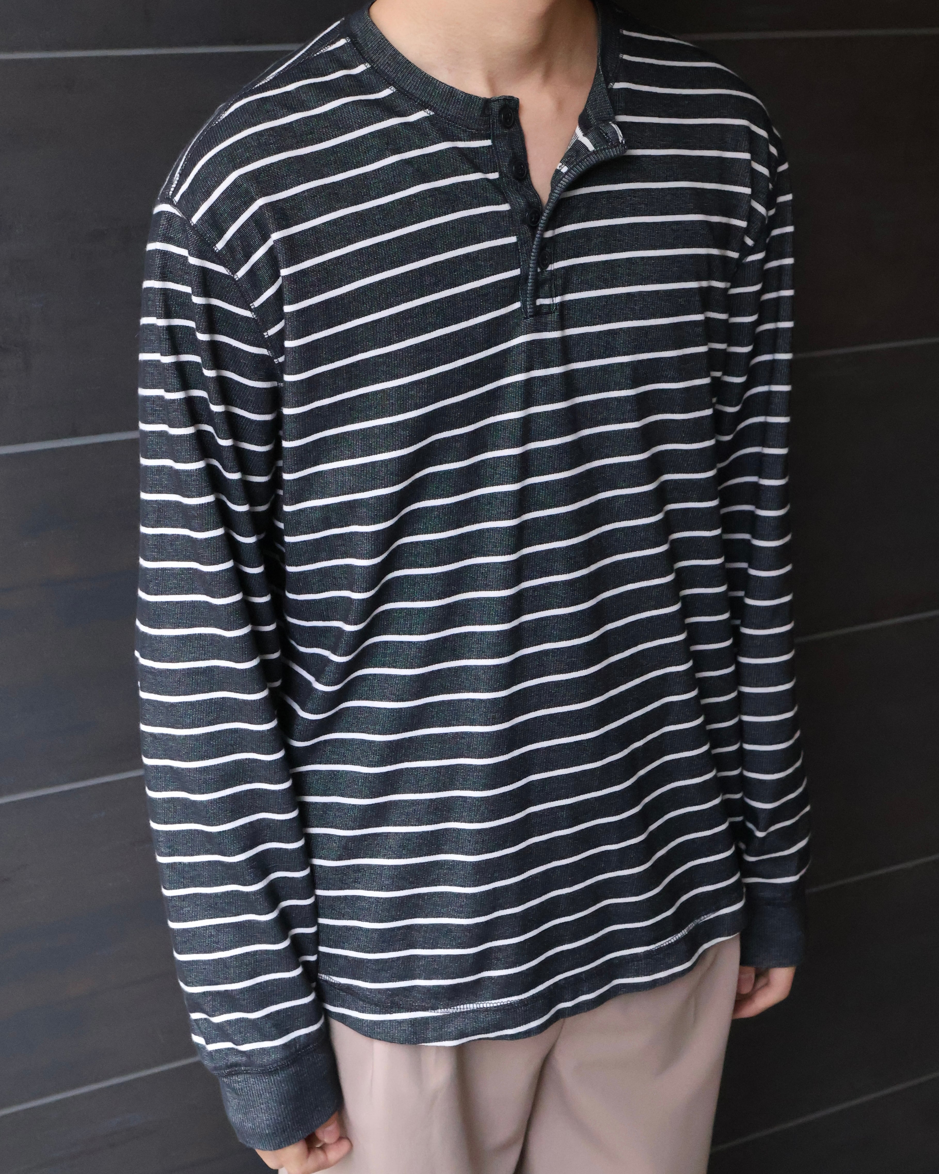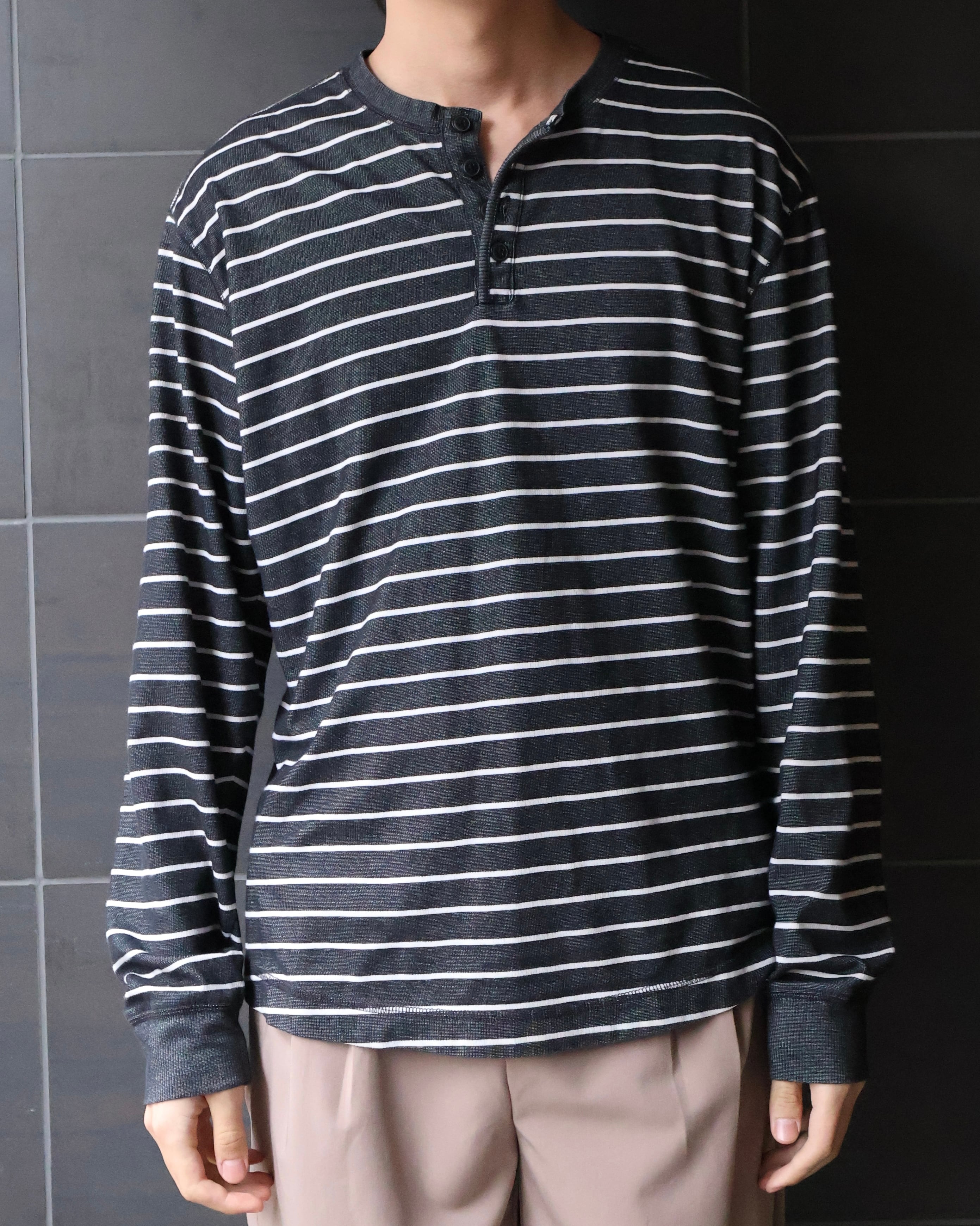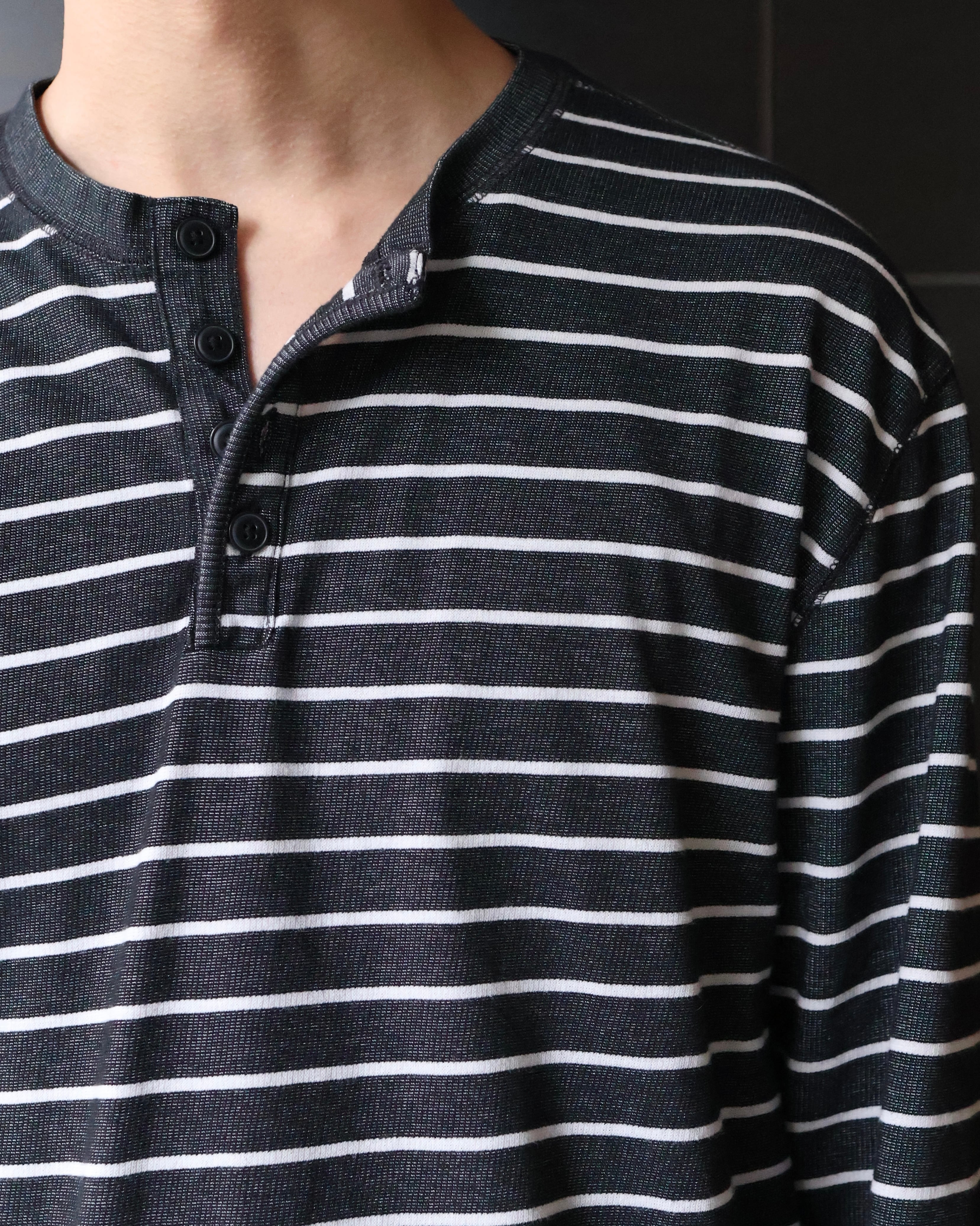 ヘンリーネックのボーダートップス。着丈が長めにとられており、ライトアウターやニットのインナーレイヤードに重宝される1着。