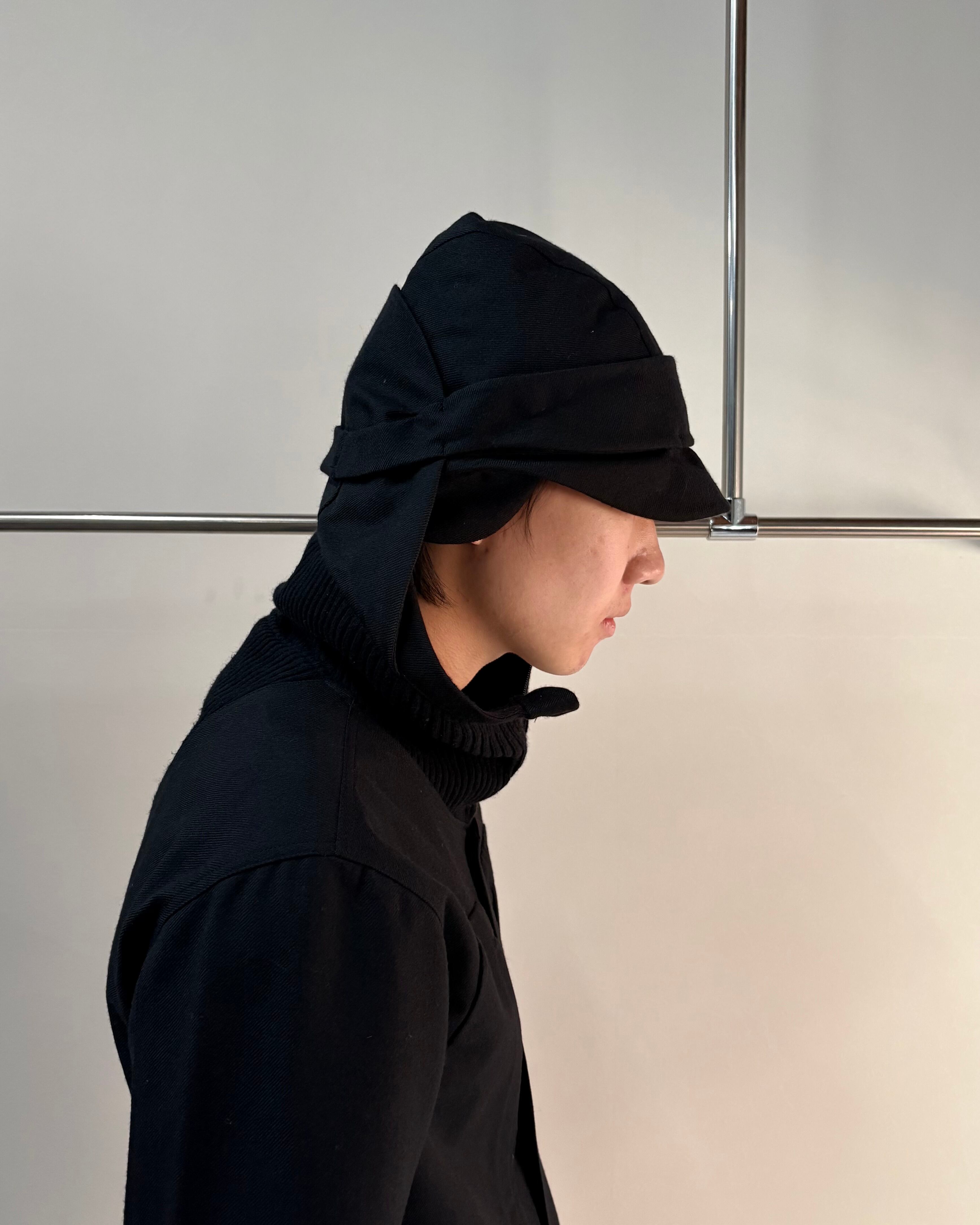 2007年秋冬のUNDERCOVERのマウンテンパーカー。ブラックで統一されたミニマルなデザインに、リブ付きのハイネックや比翼仕立てを採用し、都会的で洗練された印象を与える。機能的なポケット配置と、細身で構築的なシルエットにより、アウトドア要素とモードを融合させた一着。