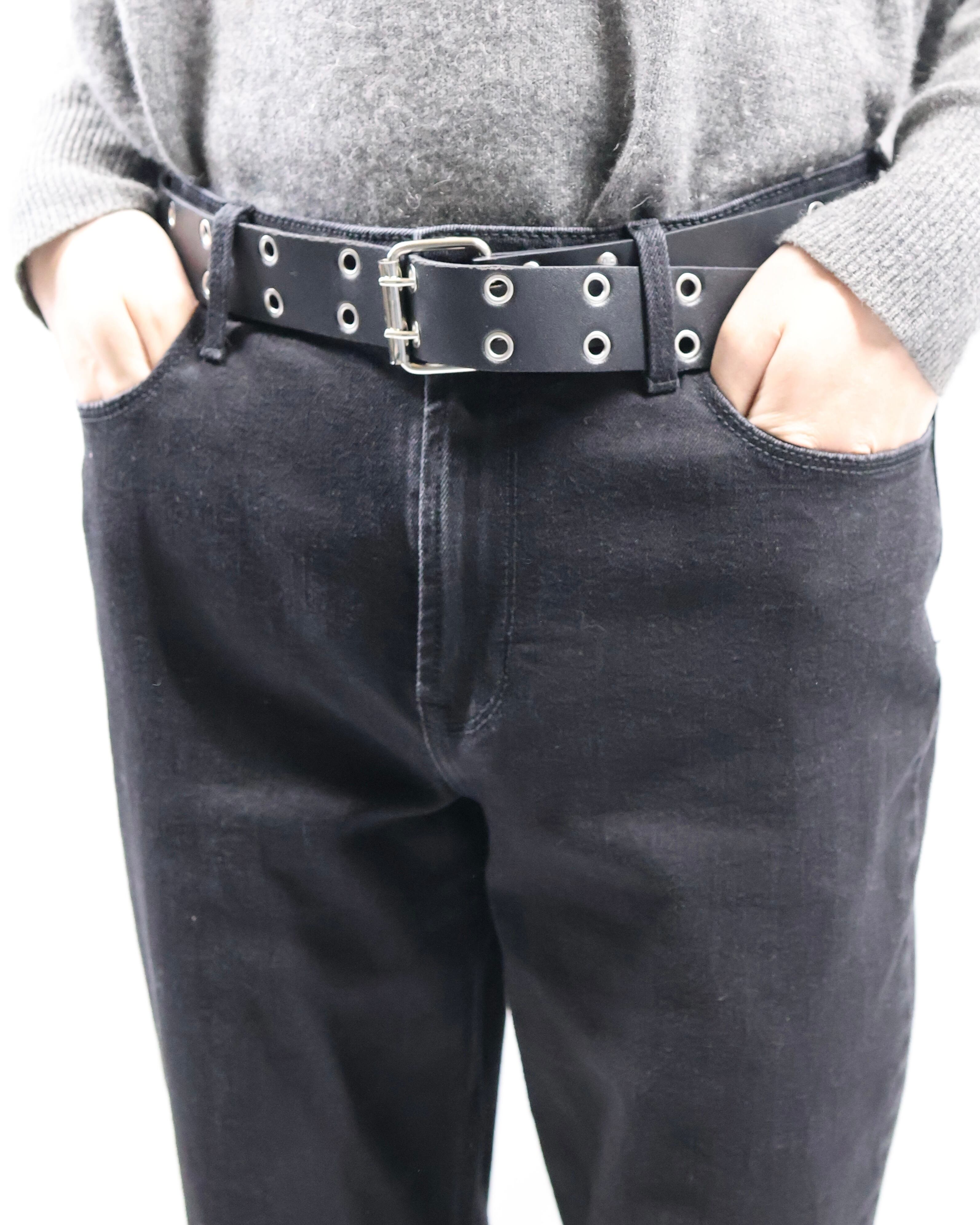 トレンディなシルエットのブラックデニムパンツ。昨今のトレンドでスリムなデニムを使ったスタイリングが多い中で、裾の溜まり方に若干の違和感を持たせ、コーディネートの差別化を図れる一本。