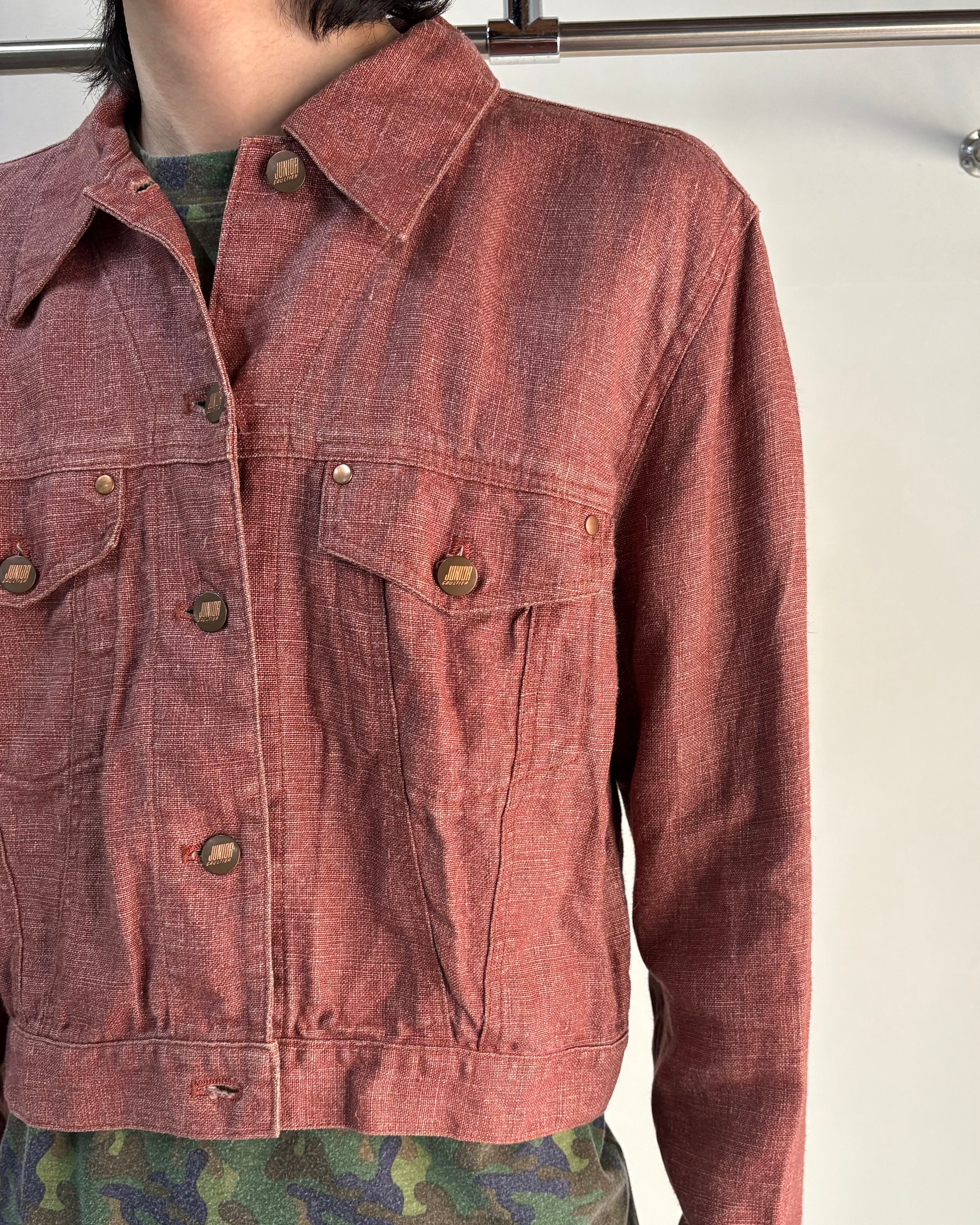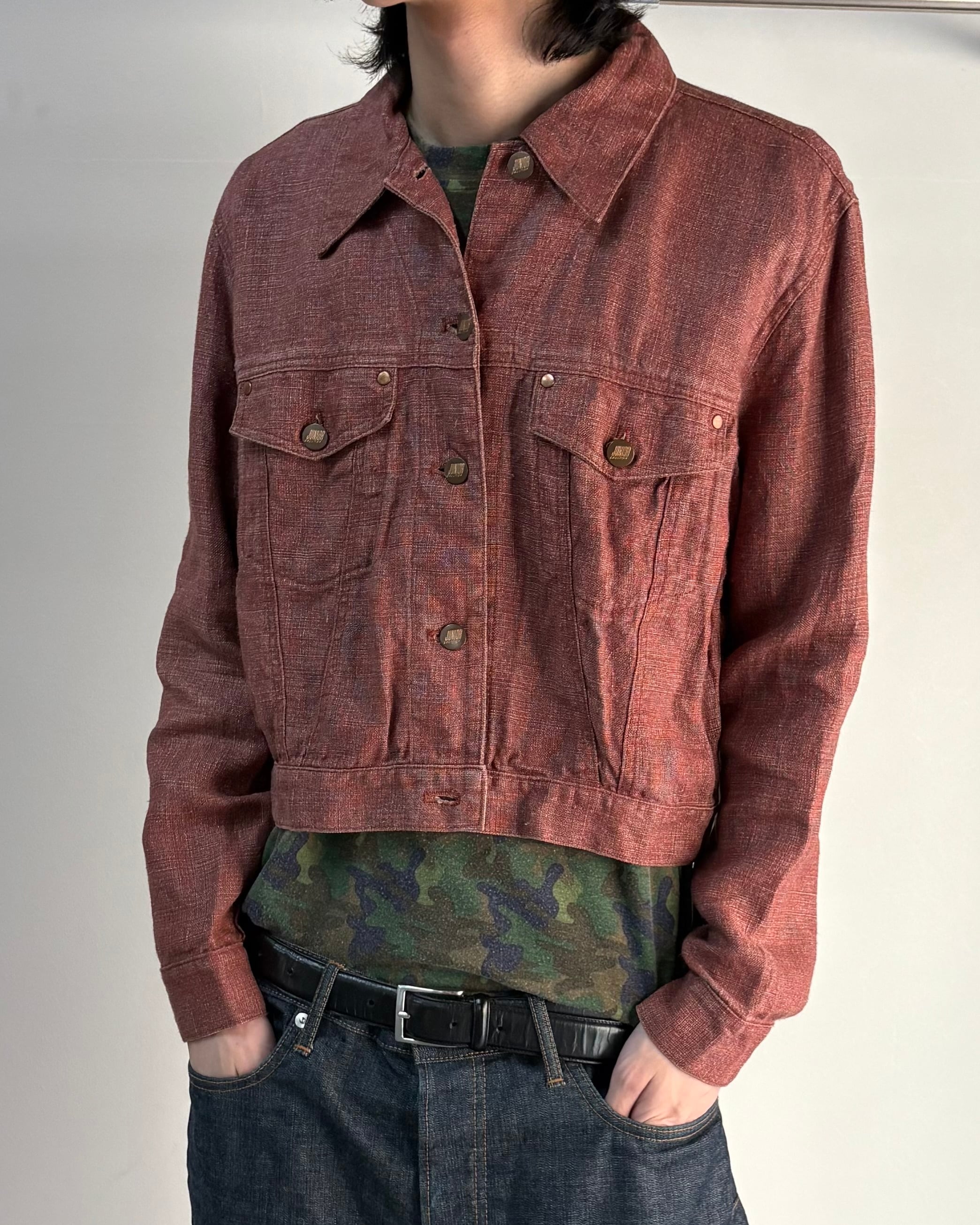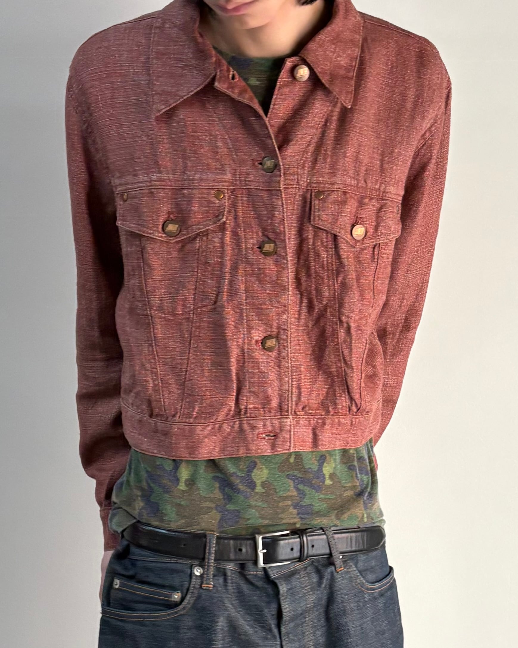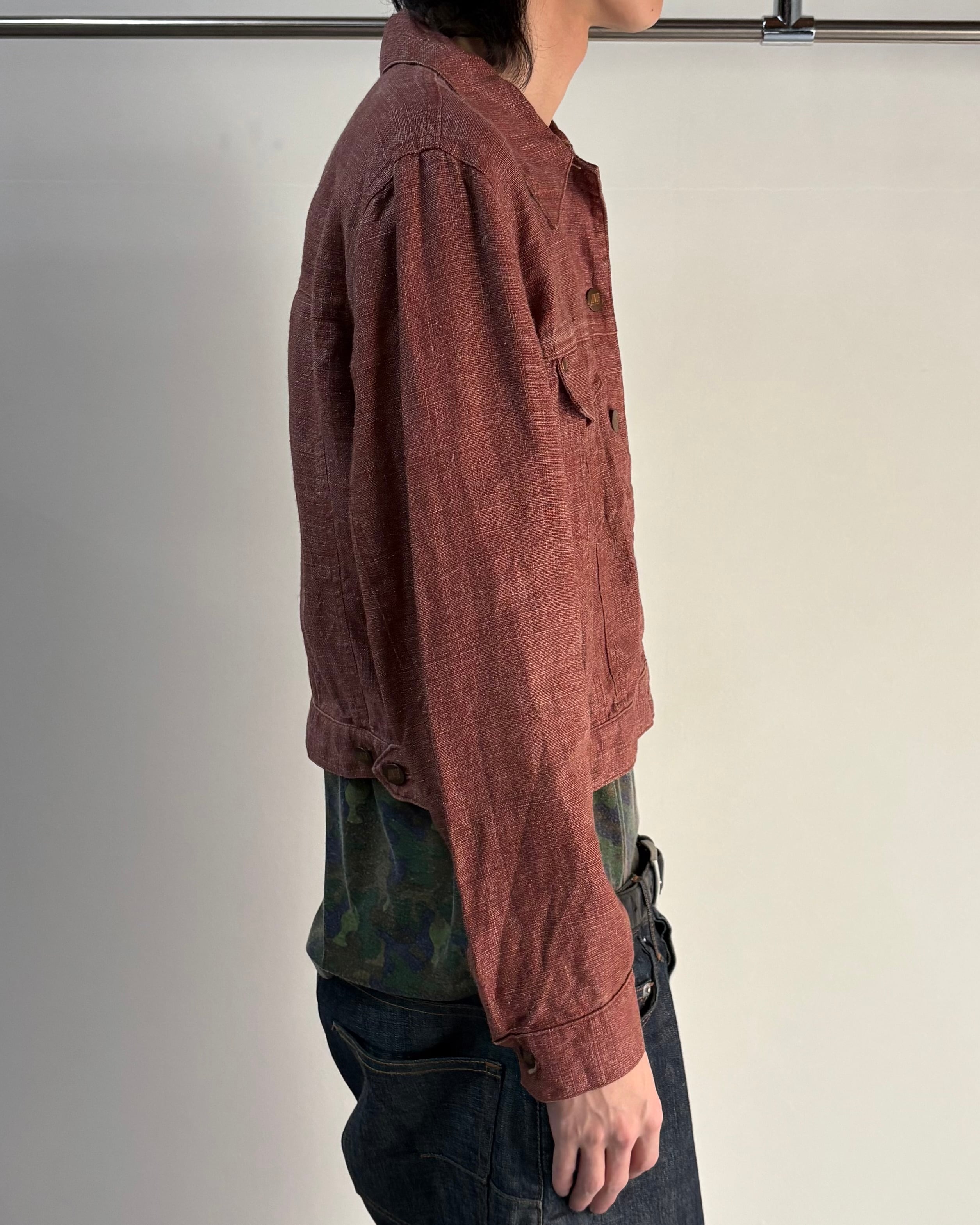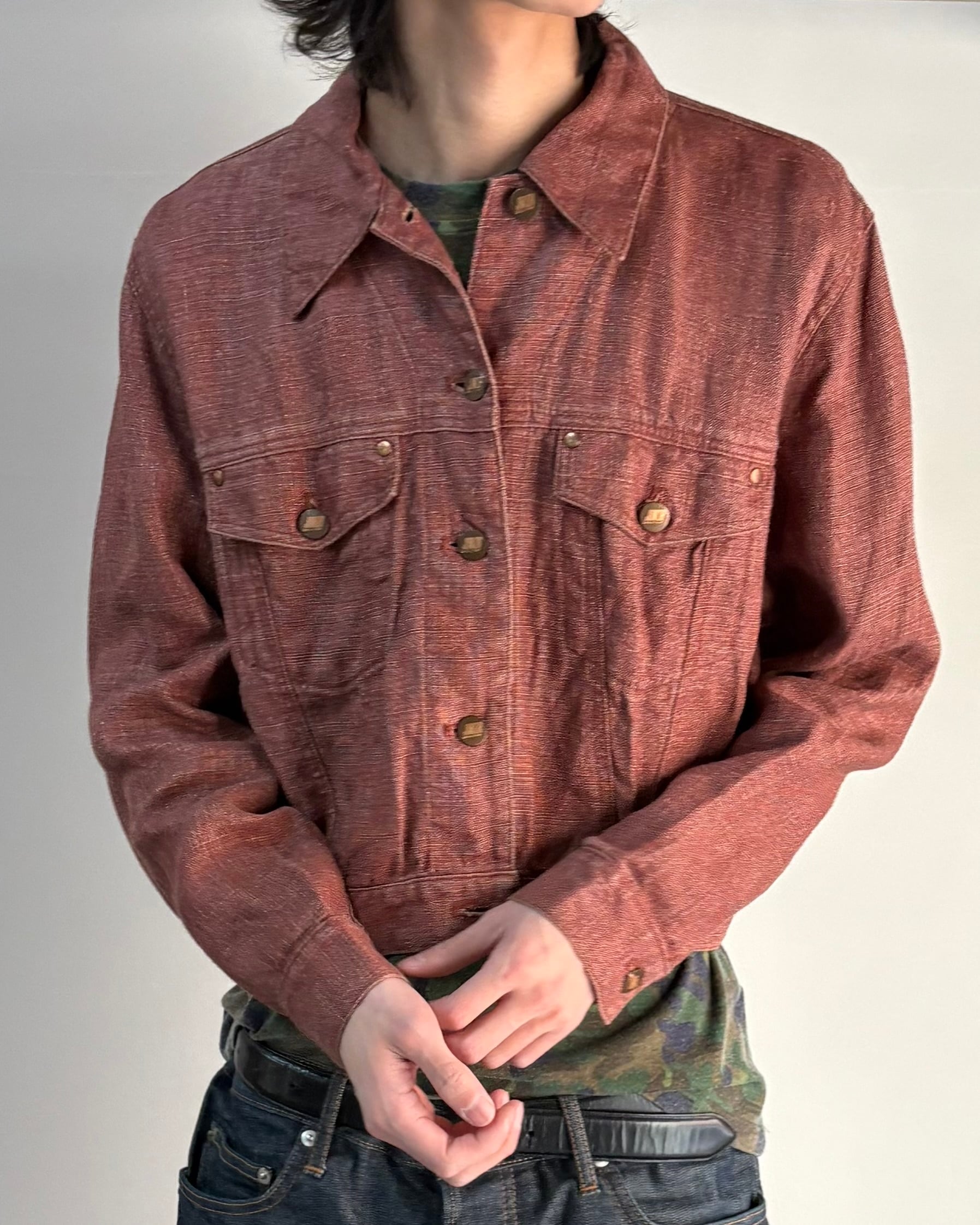 デニムジャケットをベースにしたクラシックなデザインに、織り感のあるリネン生地とニュアンスのあるカラーリングを組み合わせた一着。コンパクトな着丈バランスにより、スタイリングに軽やかなアクセントを加えてくれるアイテム。