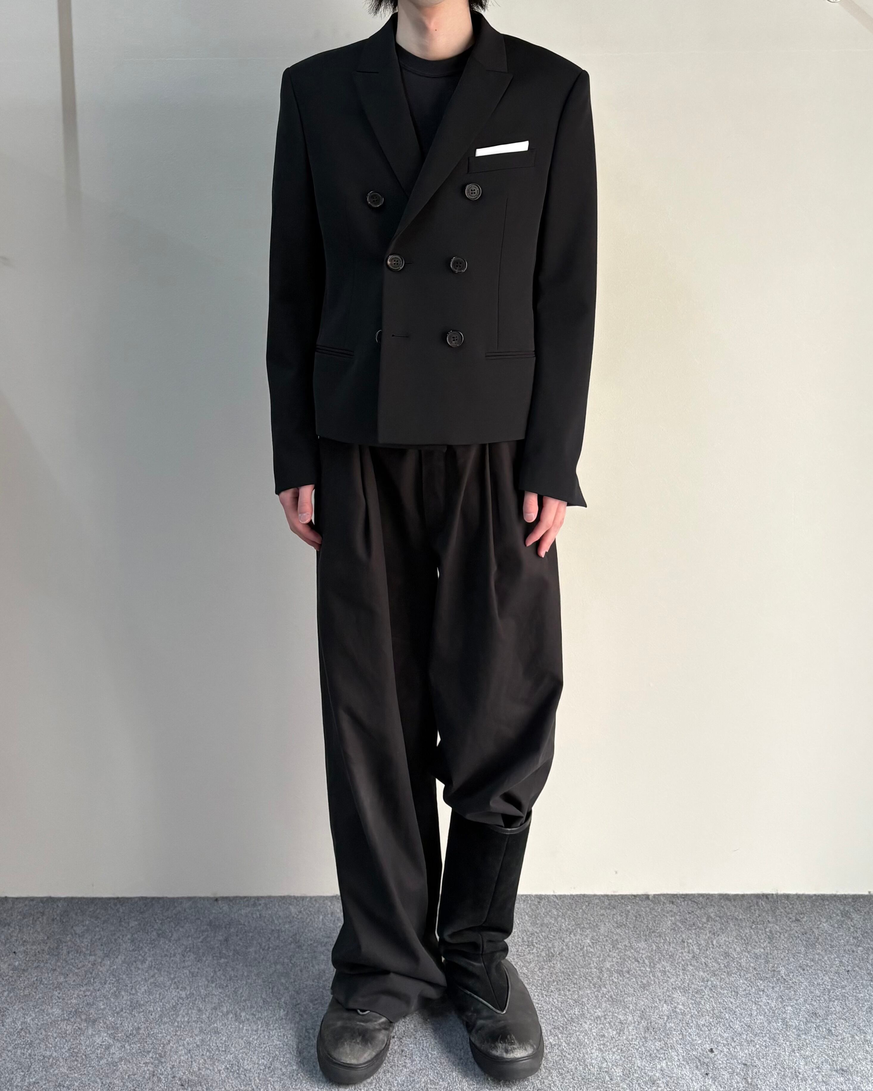 端正なボックスシルエットのダブルブレストテーラードジャケット
