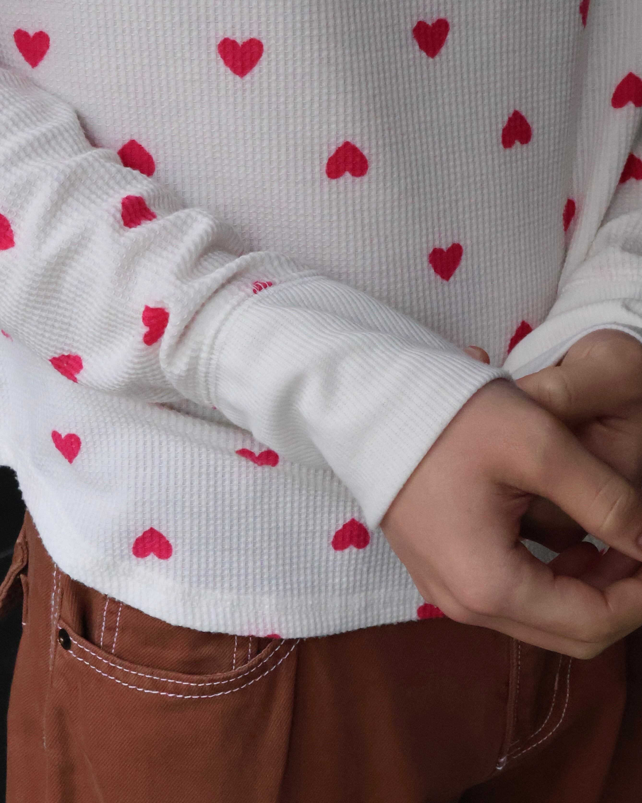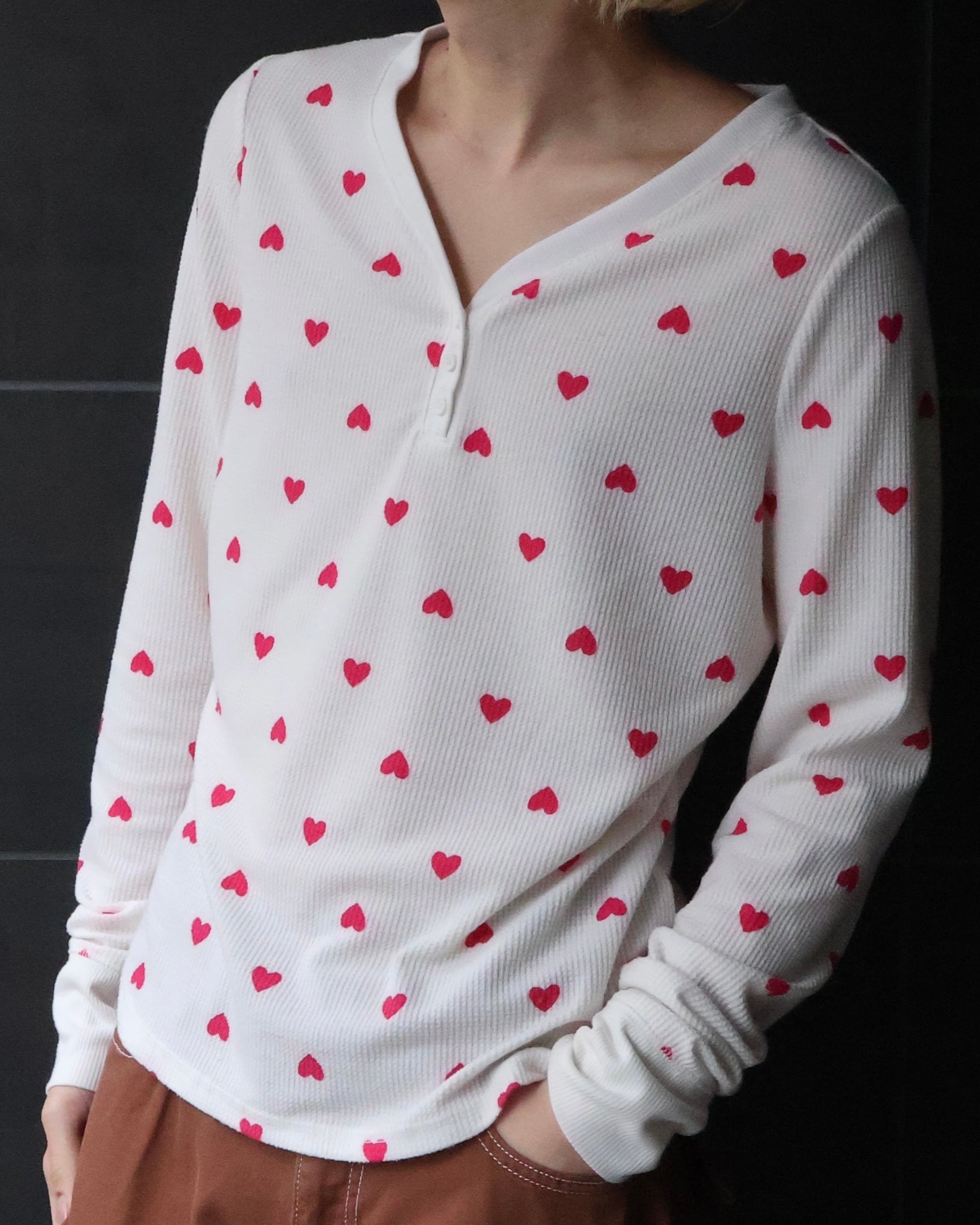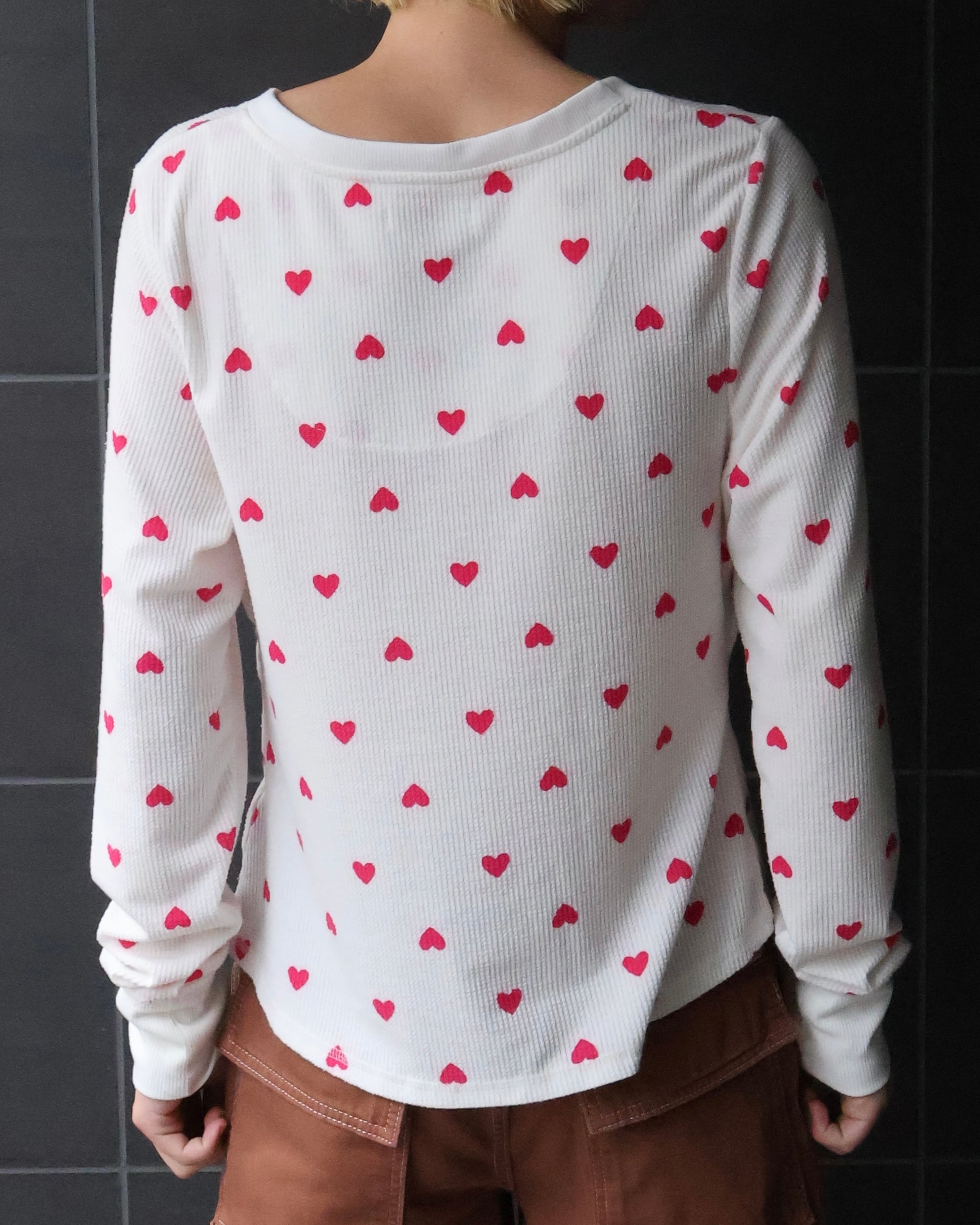 ヘンリーネックのサーマルにポップなハート柄が施された1着。サーマル生地で涼しいため、シアーシャツやライトアウターのインナーやレイヤードに万能。
