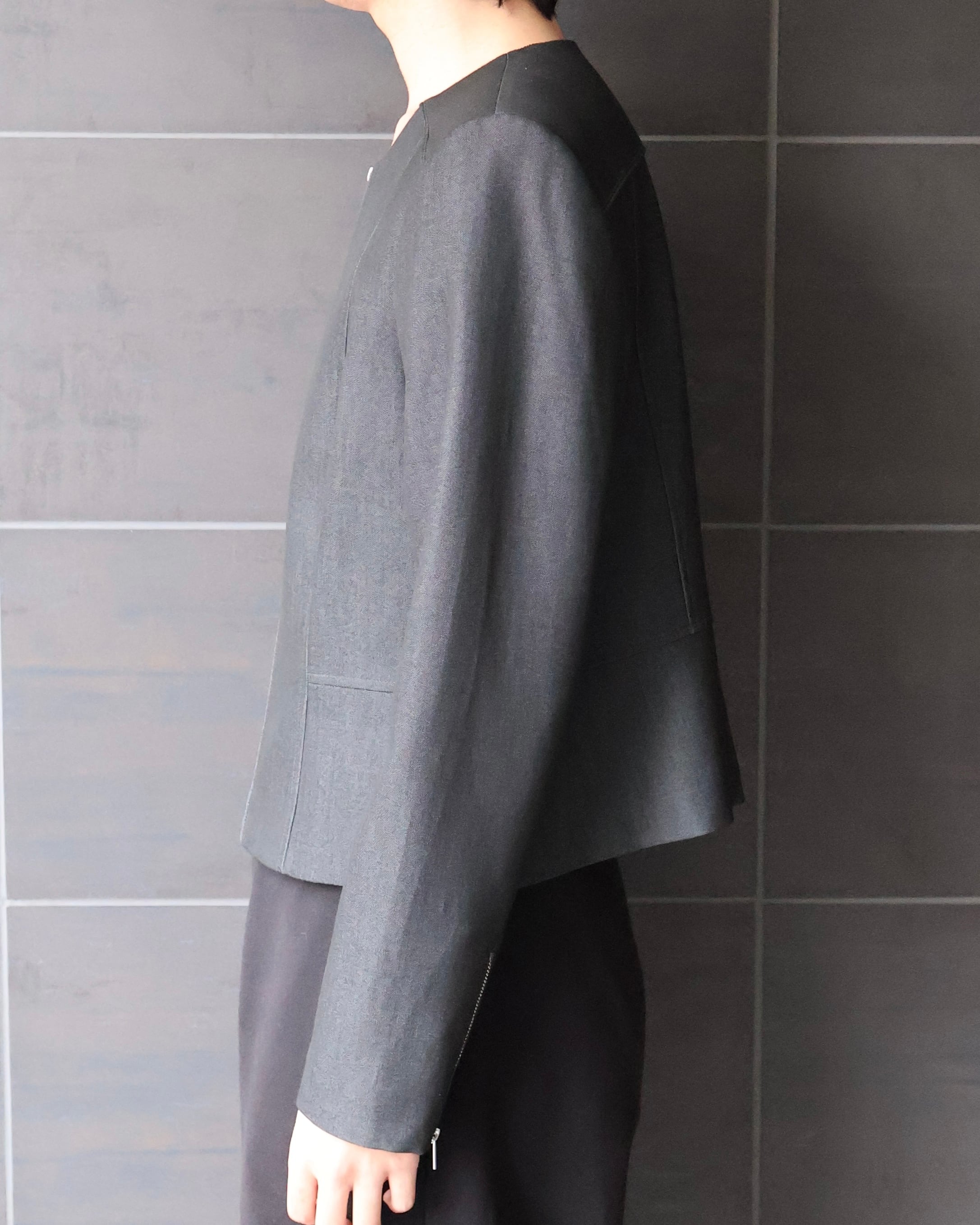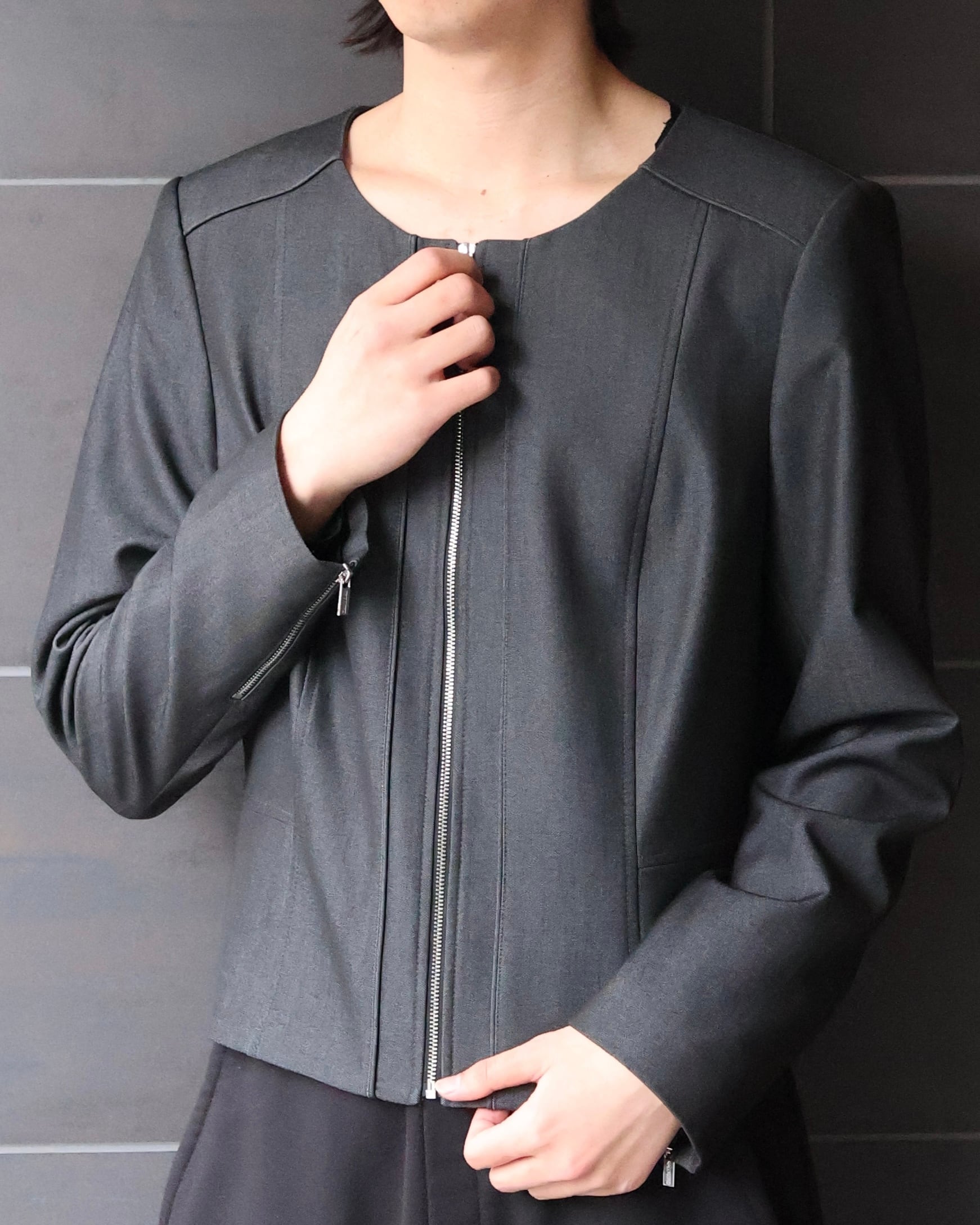 ベーシックなシングルのノーカラージャケット。ジップや無機質なグレー、パターンがモードな印象を引き立ててくれる1着。襟が特徴的なインナーと合わせたり、春はミニマルに首の空いたインナーに合わせて1枚できるのもgood。