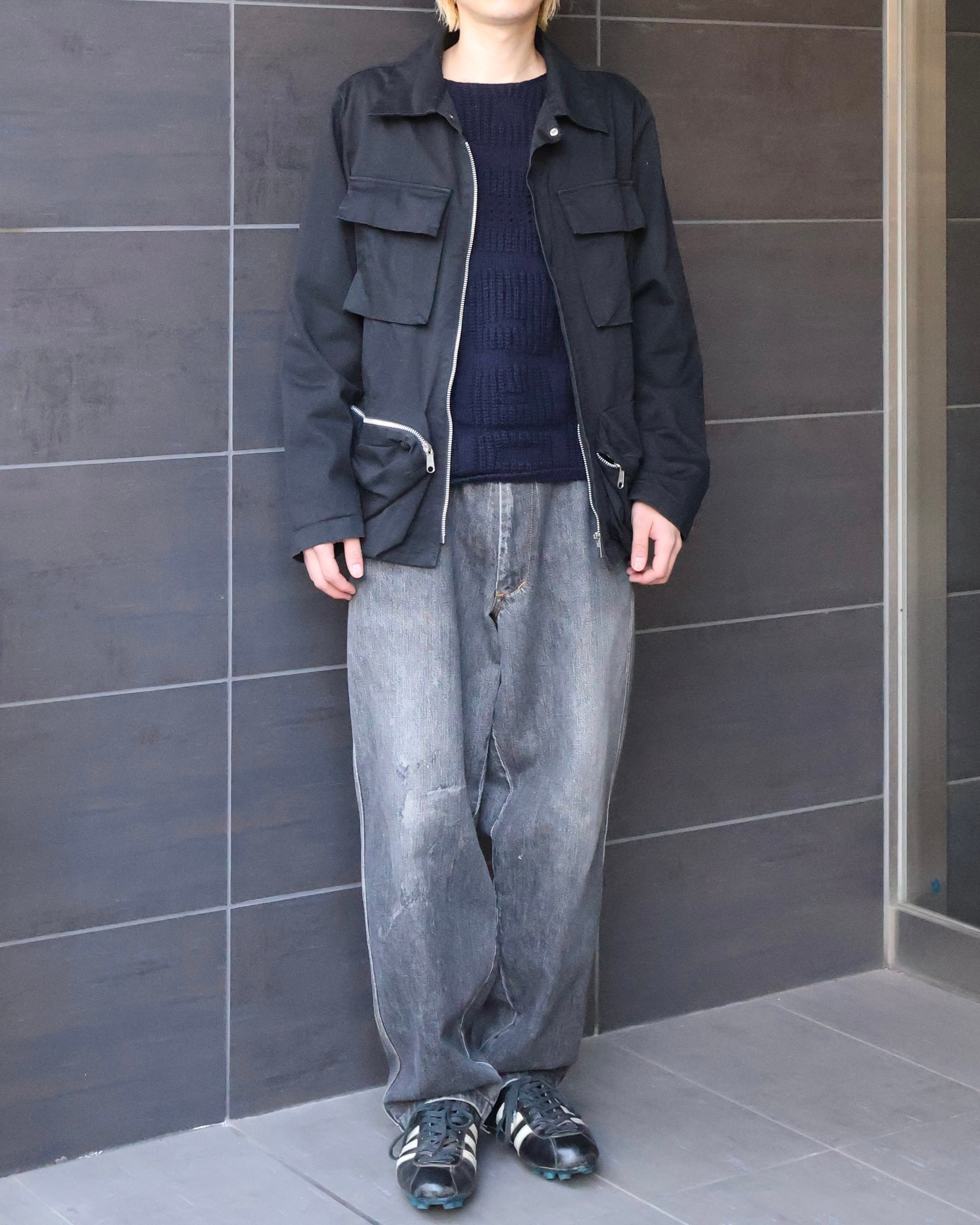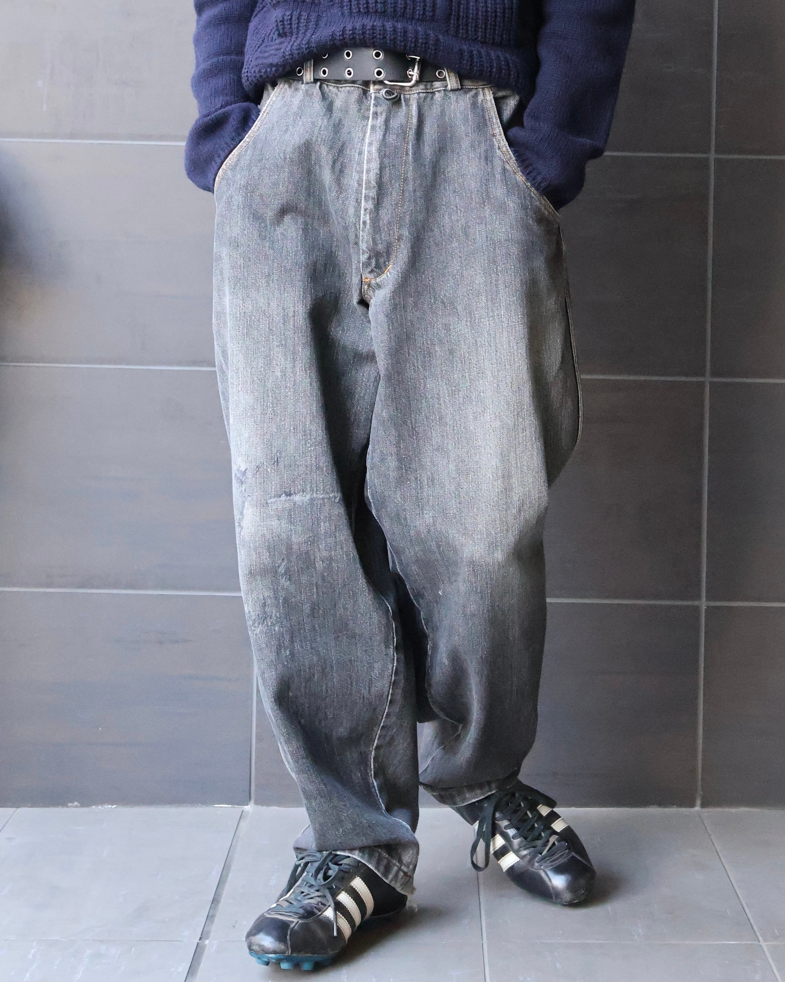 y'sのテーパードが美しいフェードデニムパンツ。糸に沿ってフェードがかかっており、普通のフェードより退廃的な印象を残してくれる。ステッチの色やレザーパッチのラグジュアリーさとフェードの退廃感の対比が美しい1着。