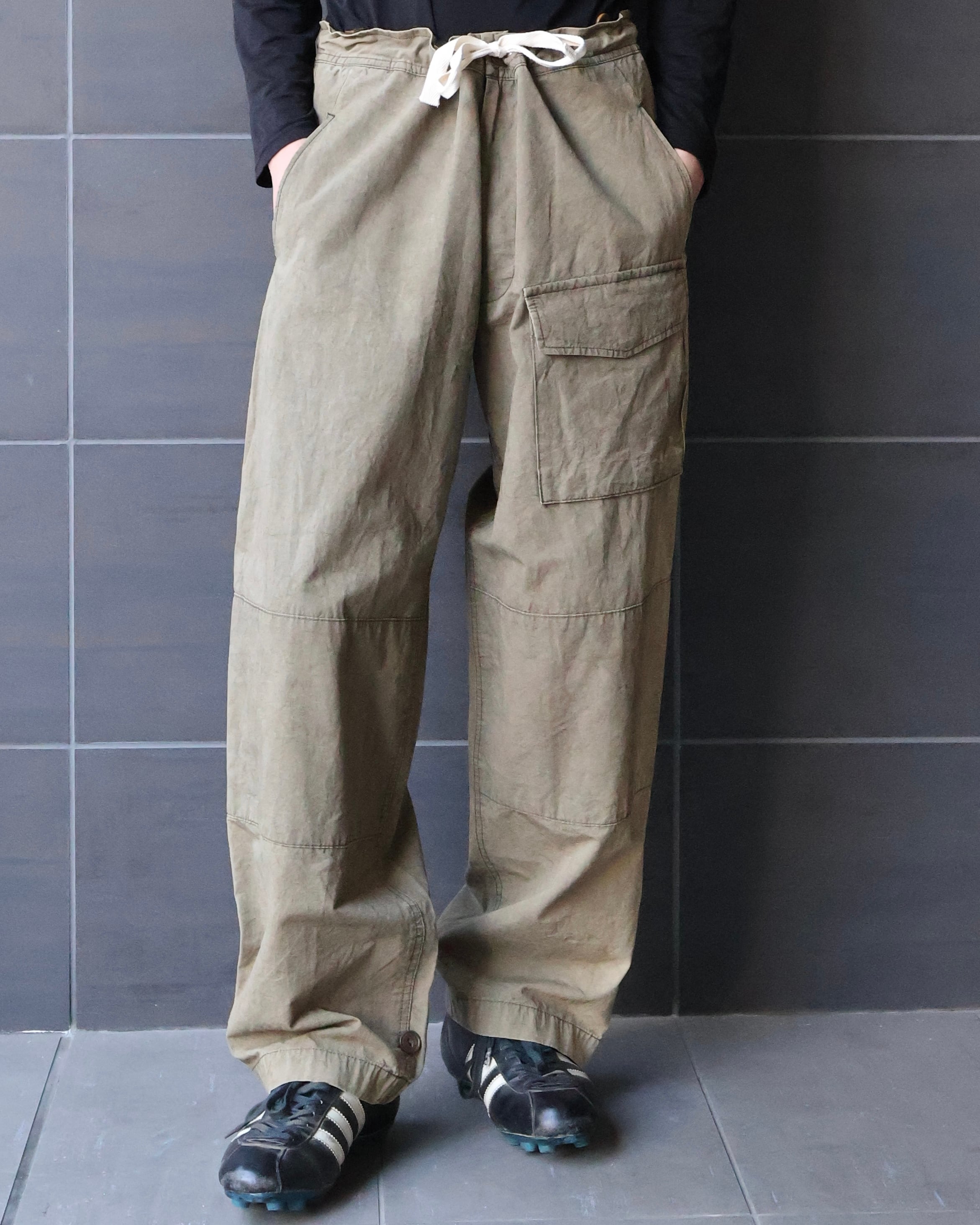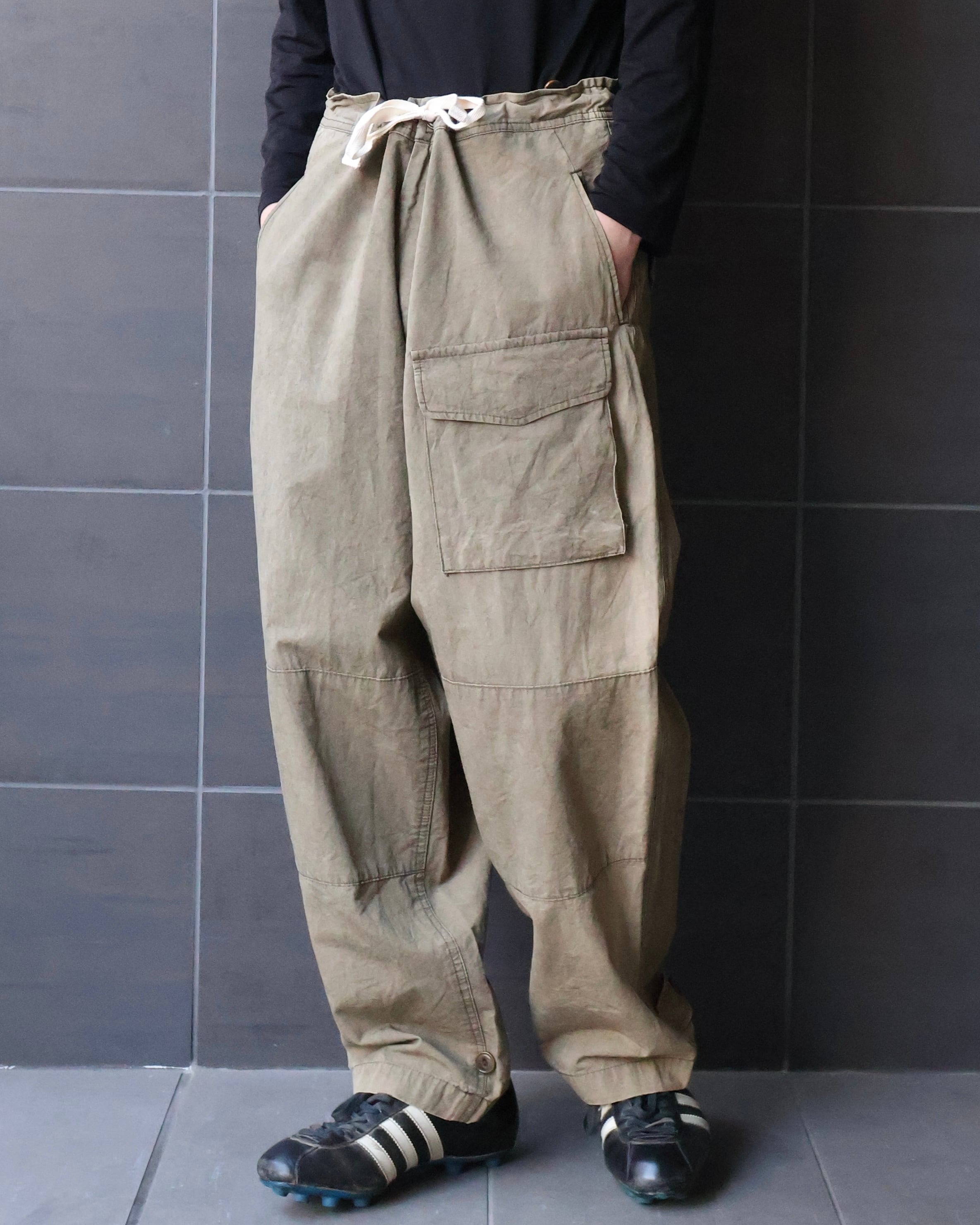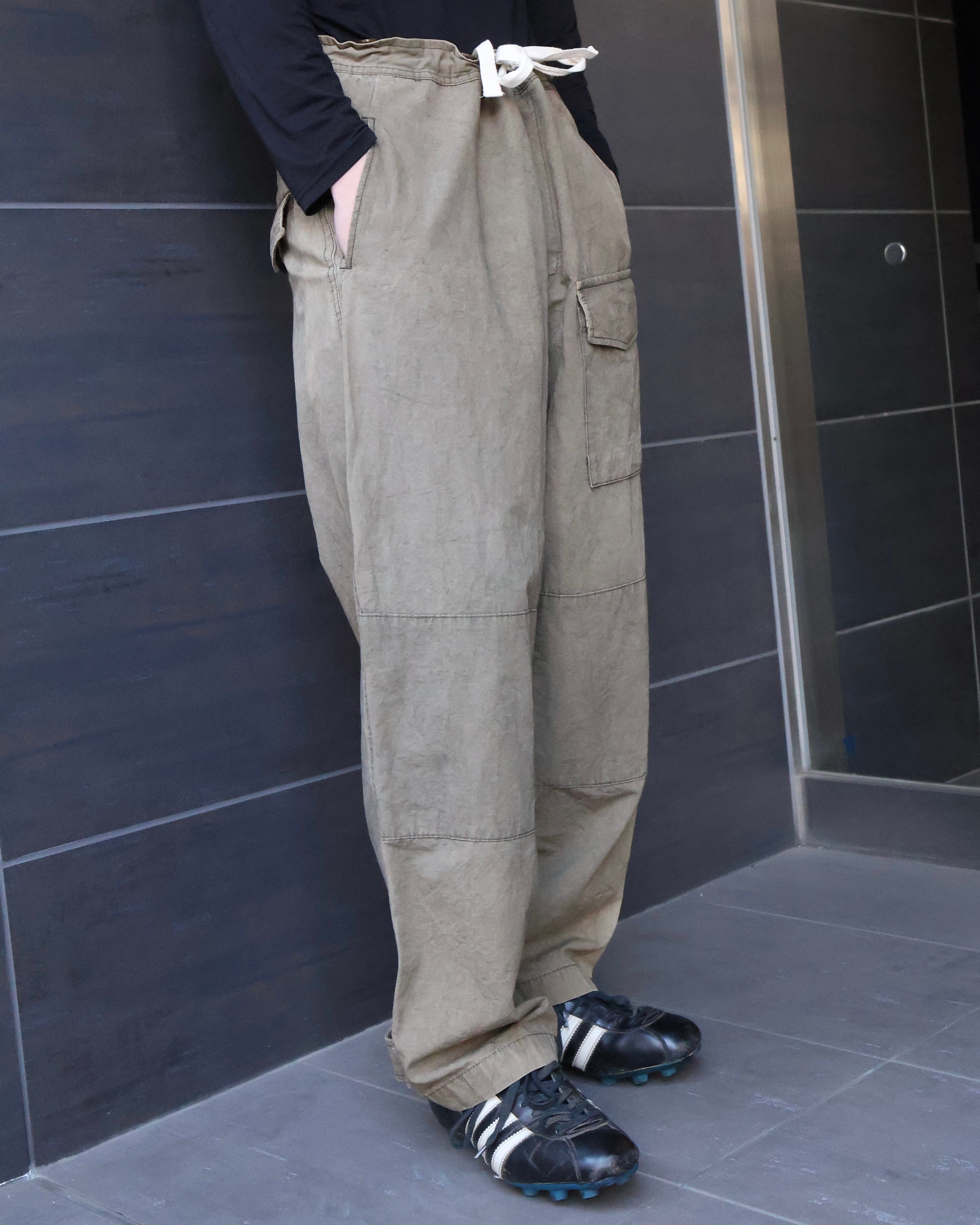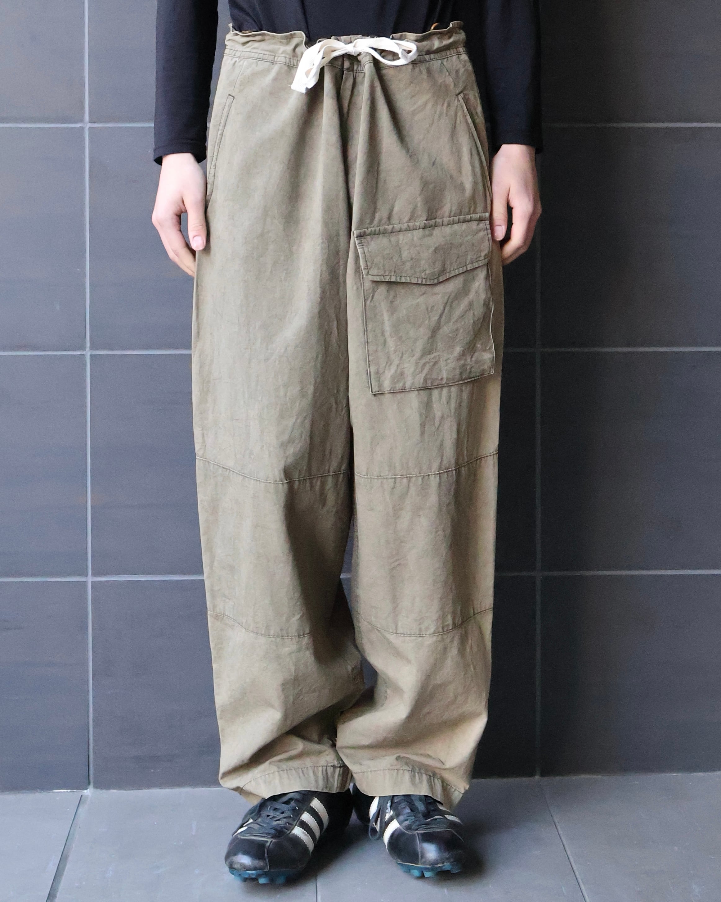 y'sのフェード感が美しいペグトップパンツ。ウエストにゆとりを持たせ裾に向かって緩やかにかかるテーパードシルエットが美しい。フェード感によるいなたい雰囲気や左足腿部分に採用された大きなポケットが印象的な1着。