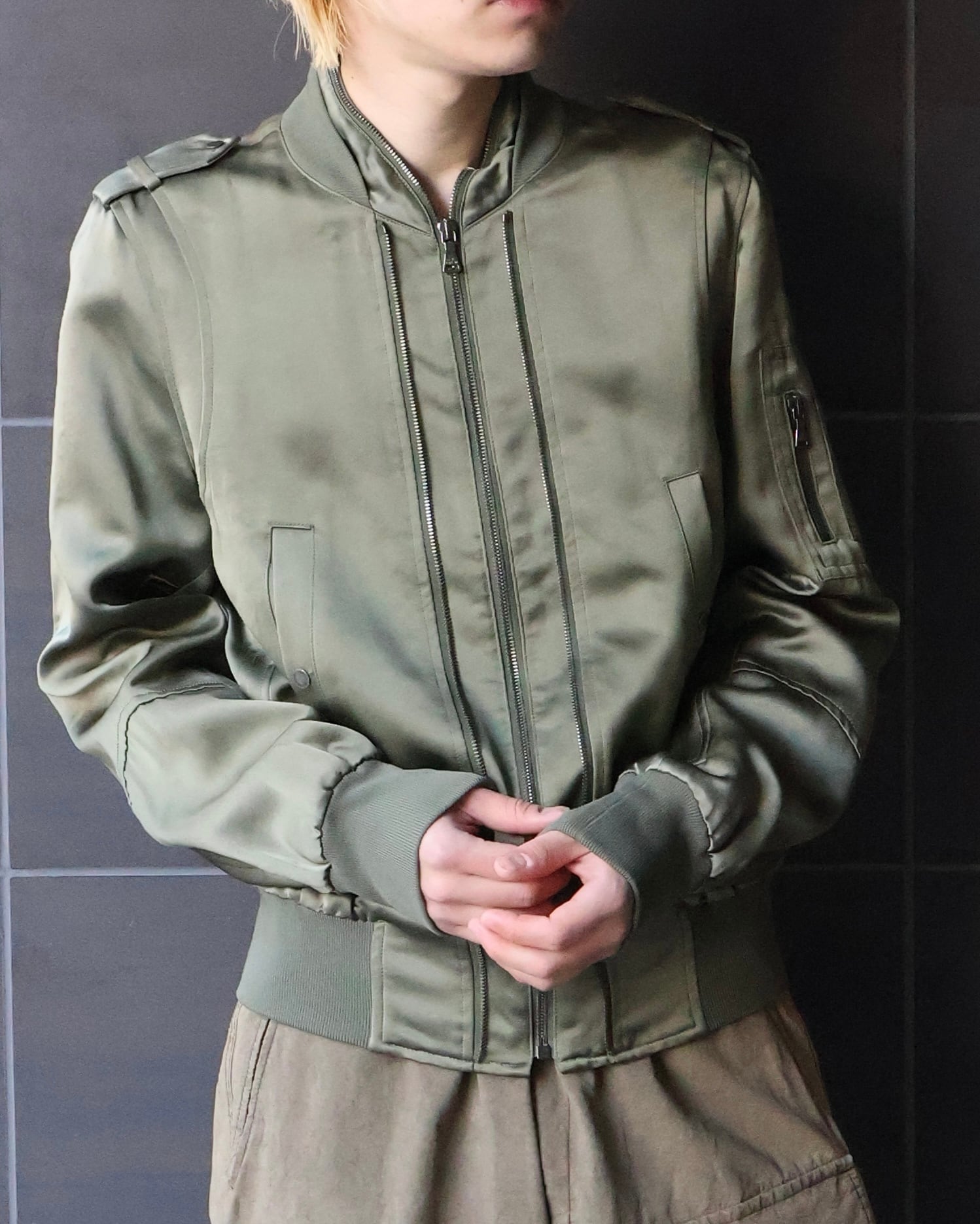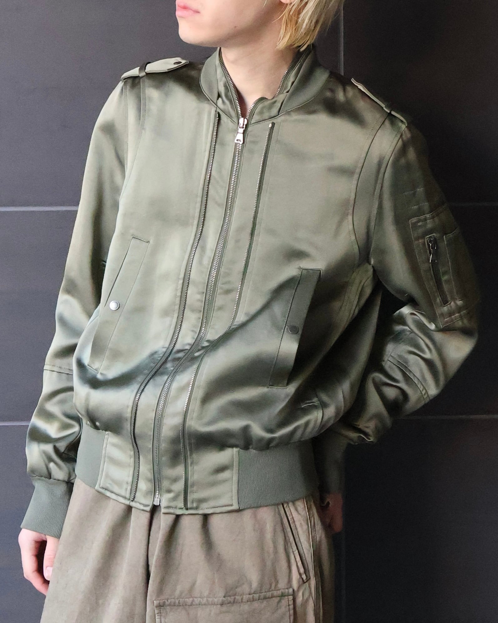 上質なナイロンによる光沢感が美しいL-2B型のブルゾン。L-2B特有のエポレットが付いていたり、フロントジップのディテールが効いていたり、ミリタリーとモードが融合されており独特な雰囲気を醸し出してくれる1着。