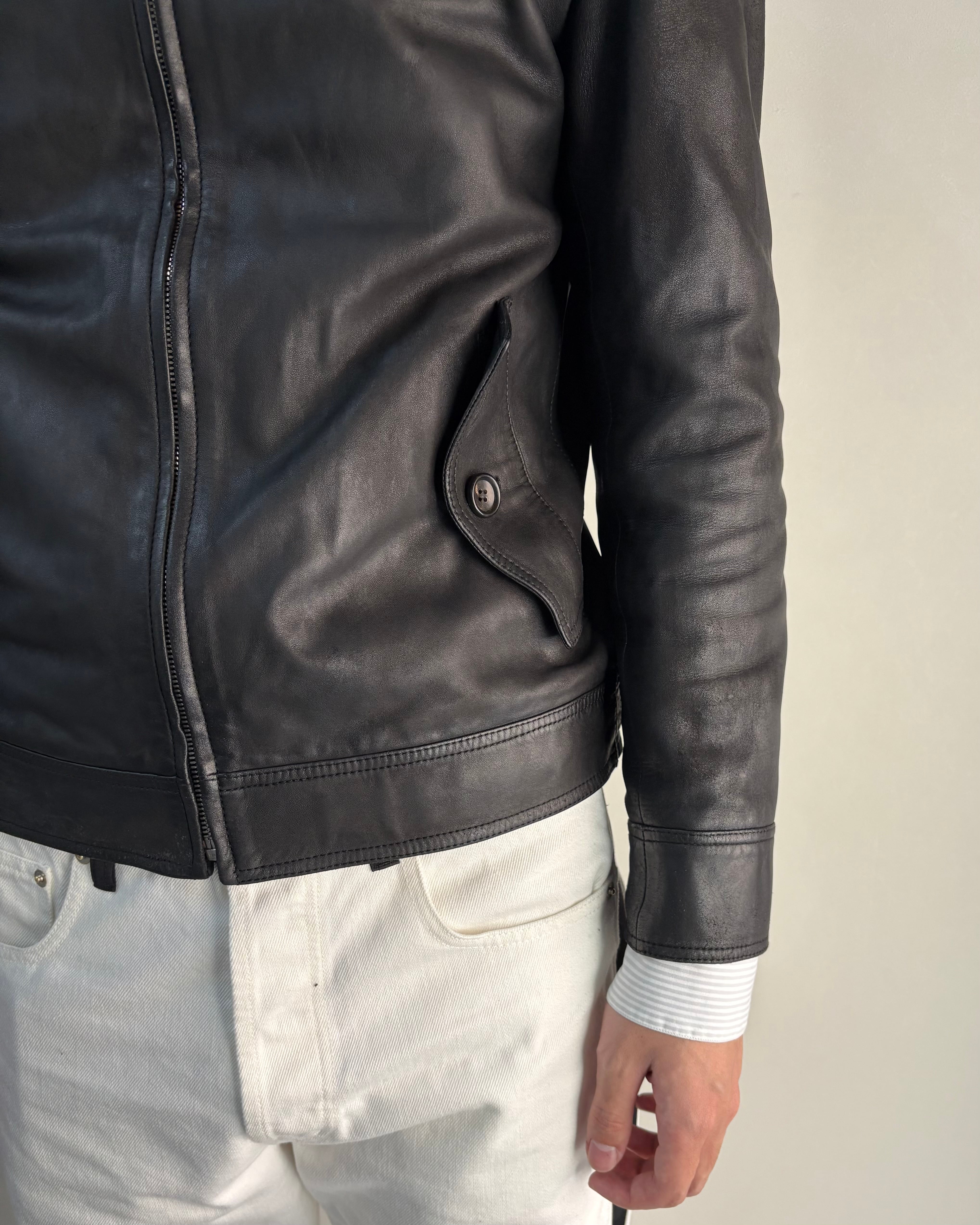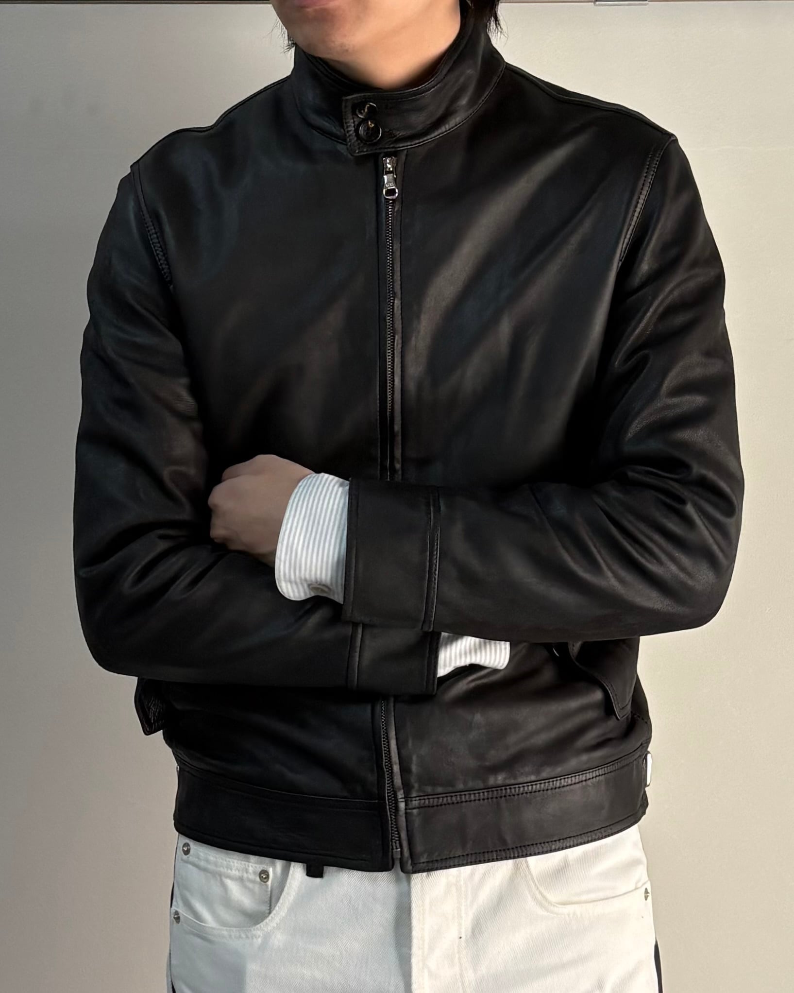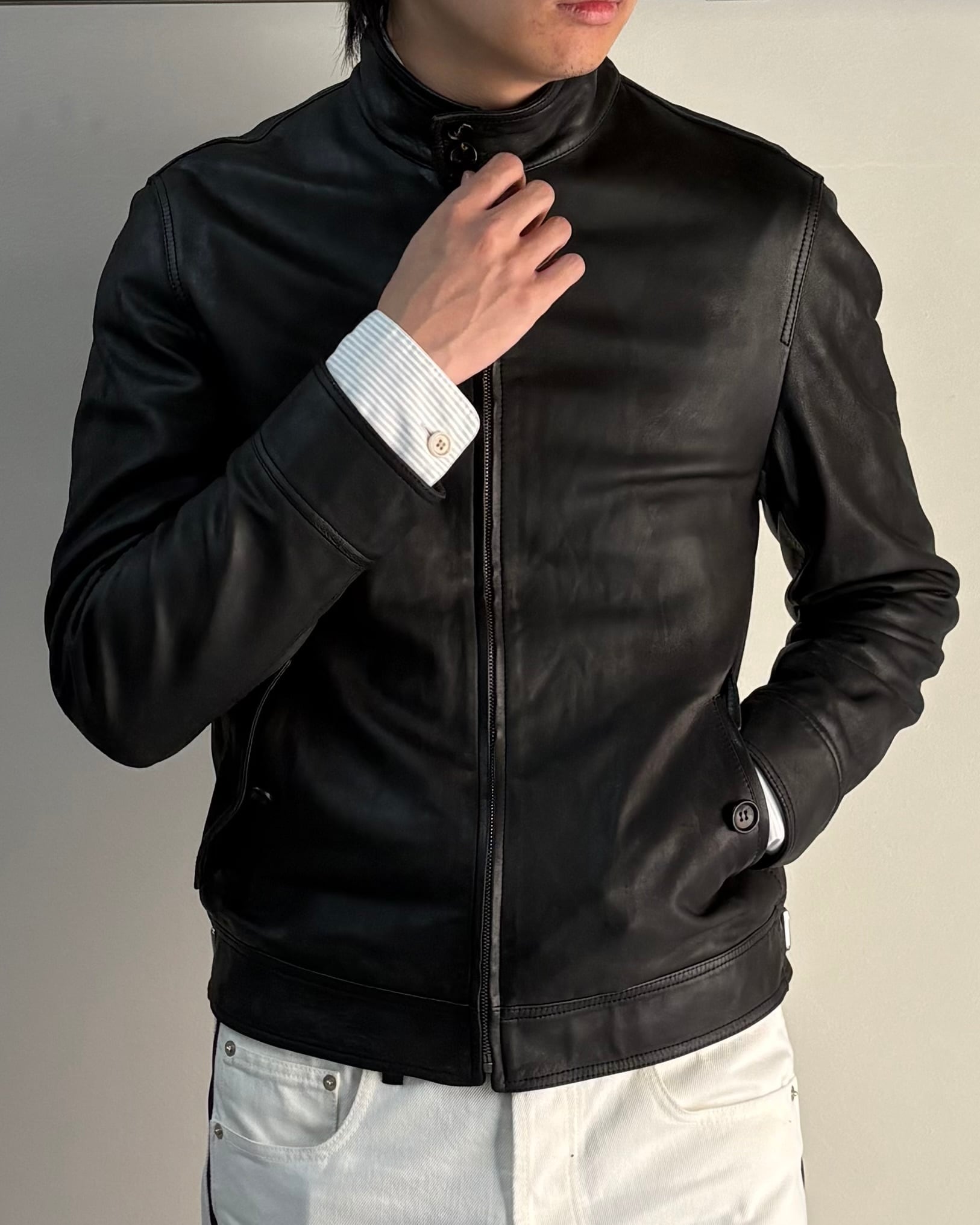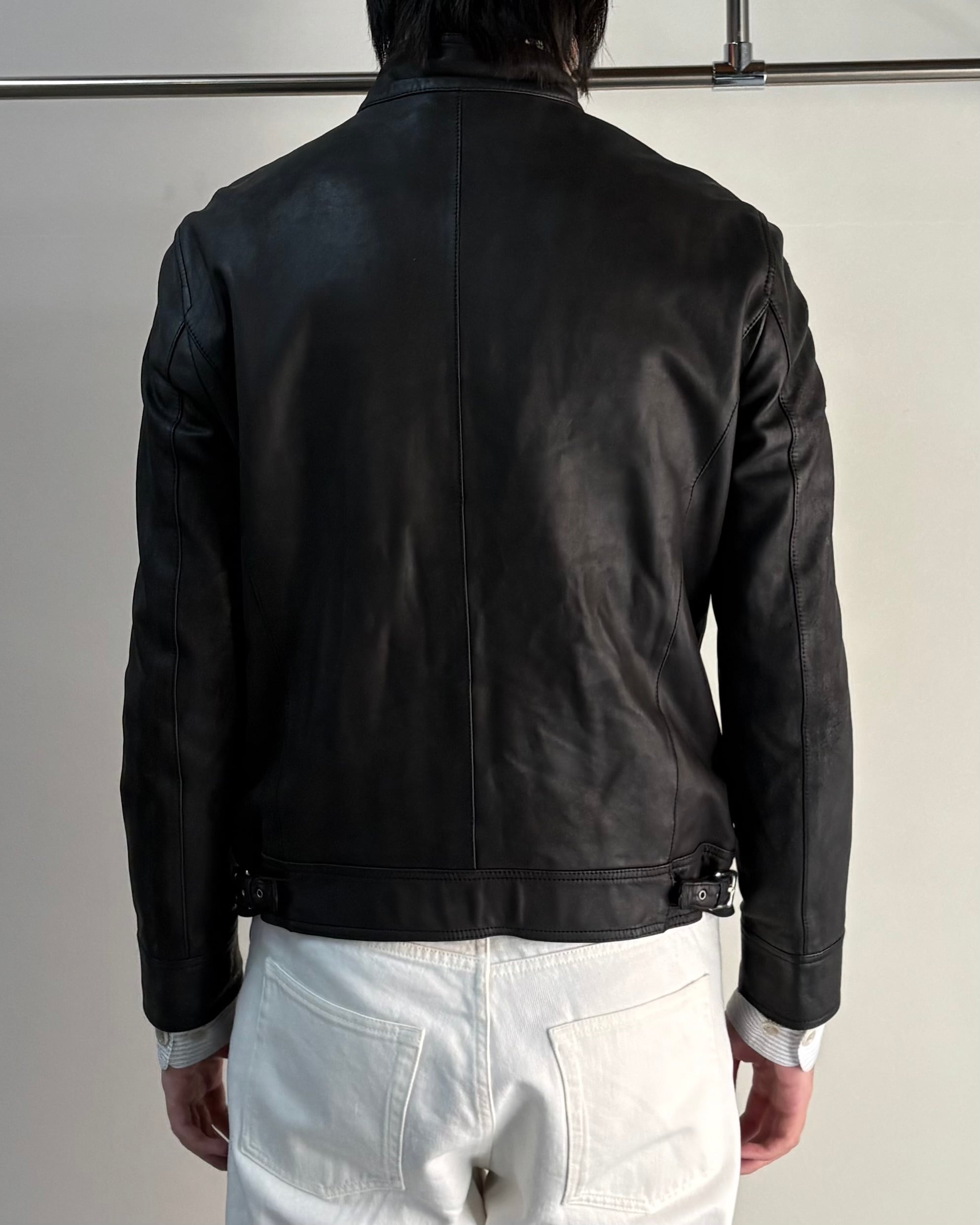 ミニマルで洗練されたデザインが特徴のレザージャケット。無駄を削ぎ落としたデザインながらもブランドらしい上質さが際立つ一着。程よくタイトかシルエットで、モードからミニマルスタイルまで幅広いコーディネートに対応可能。