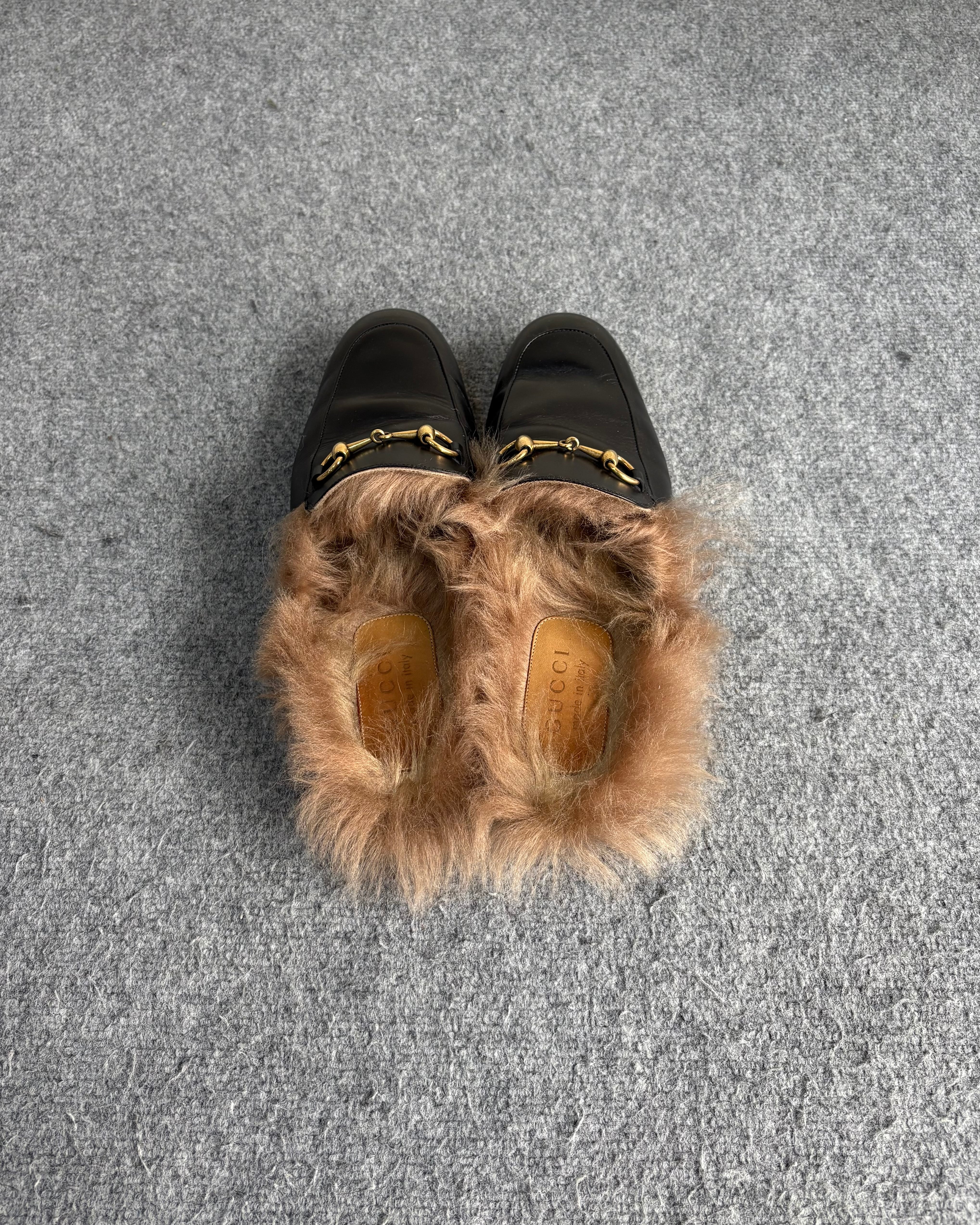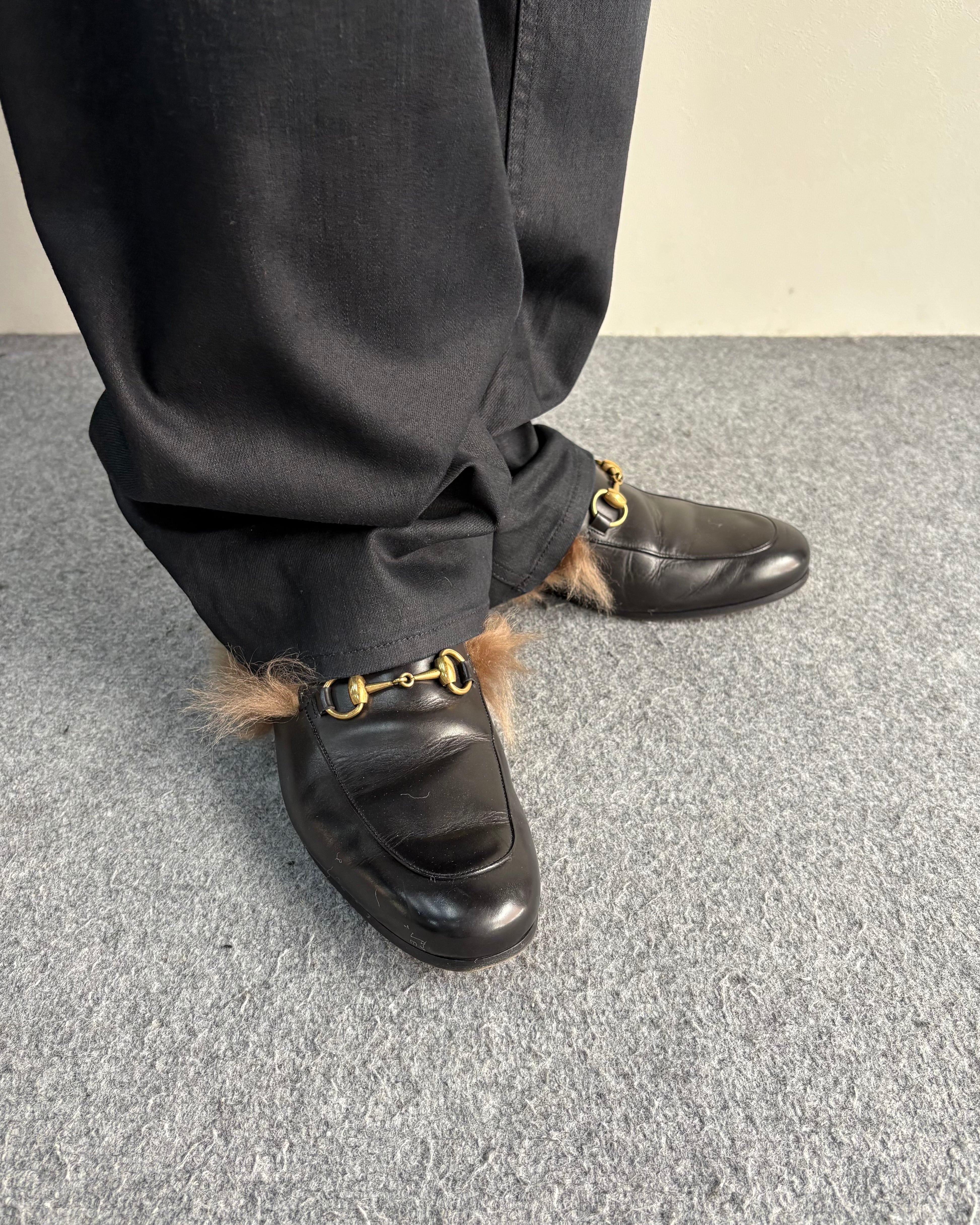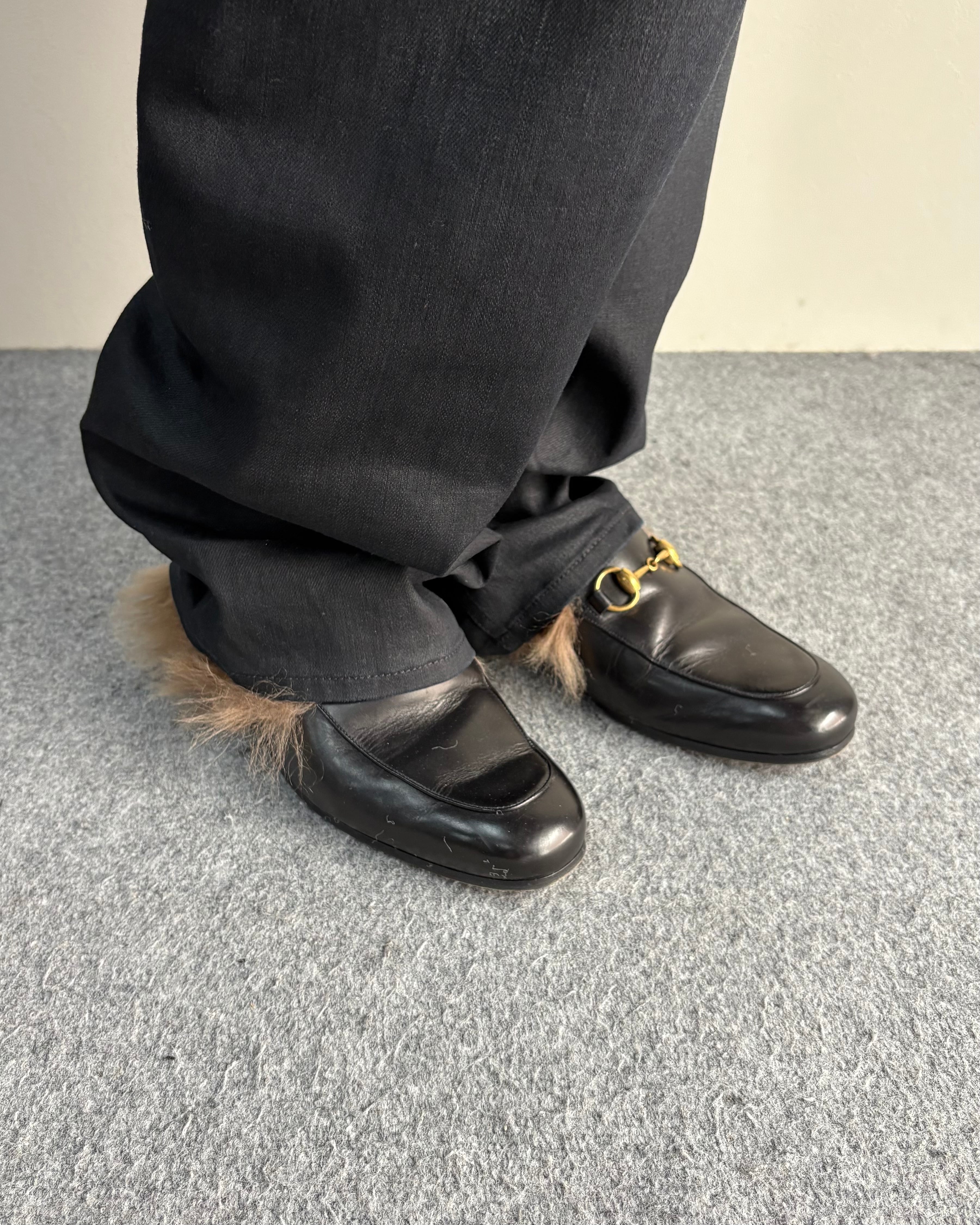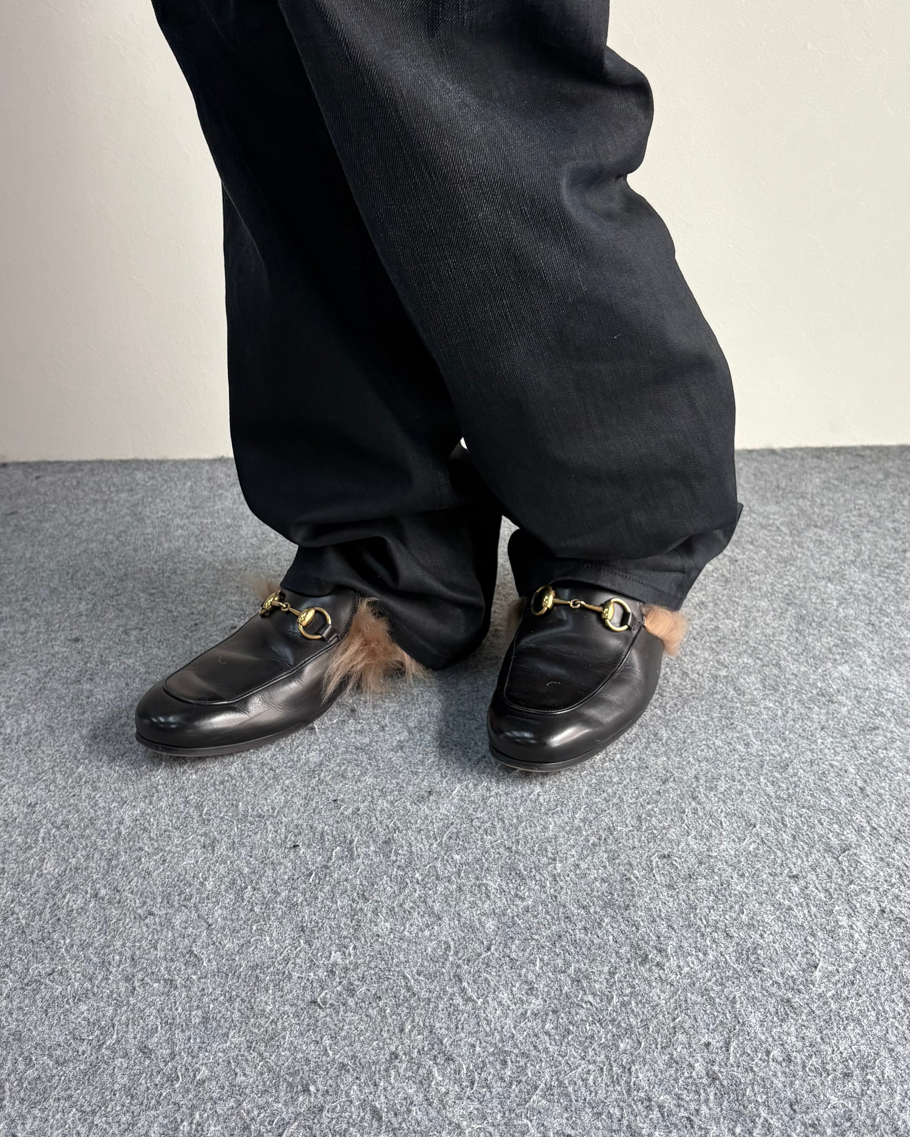 ブラックレザーの端正なローファー型に、ライニングのファーが加わることでクラシックとラグジュアリーが共存した独特のバランスが特徴のアイテム。バックレス仕様のためスリッパ感覚で着脱できる一方、ローファー由来のフォーマルな顔立ちによりデニムからスラックス、ショーツまで幅広く対応可能。