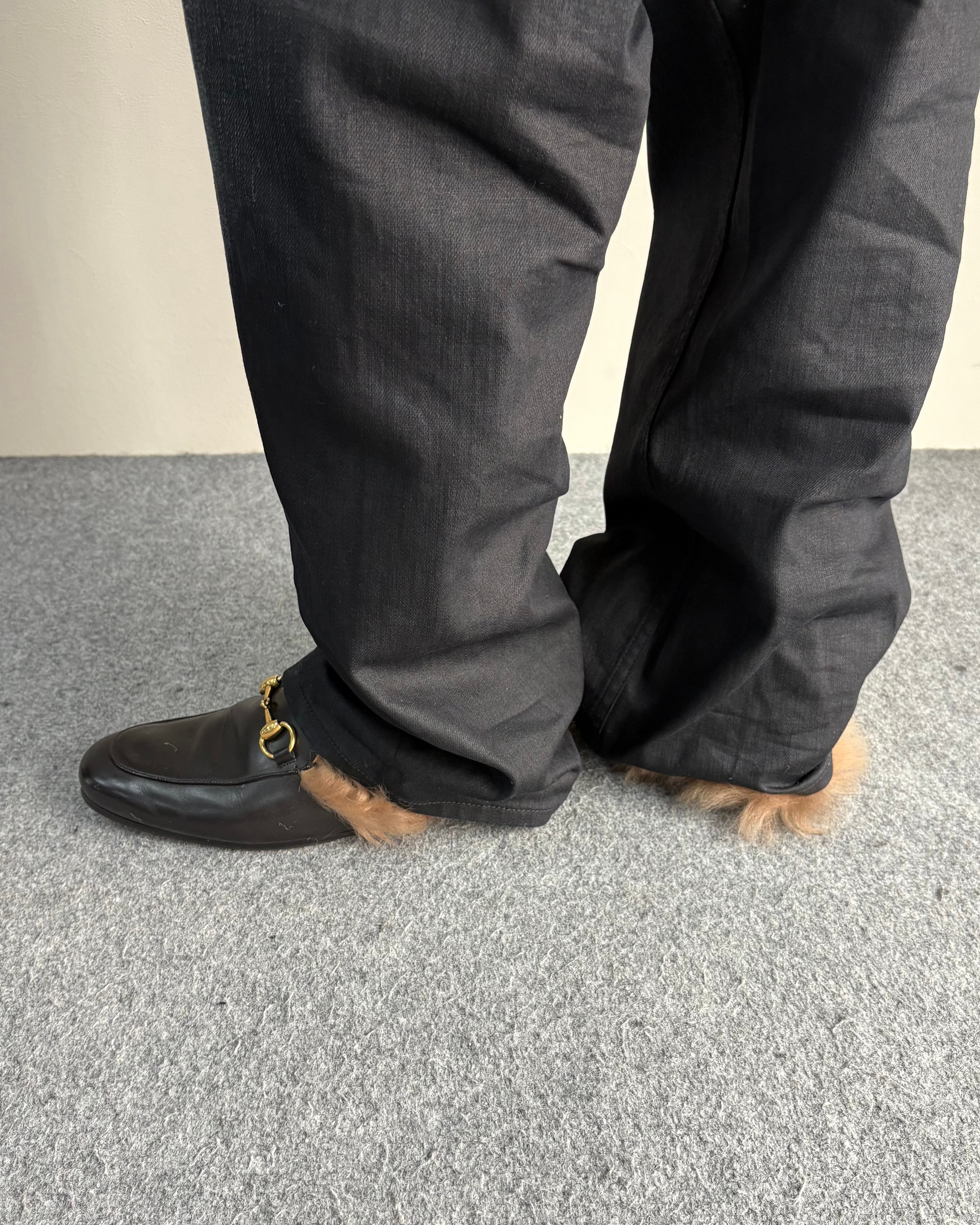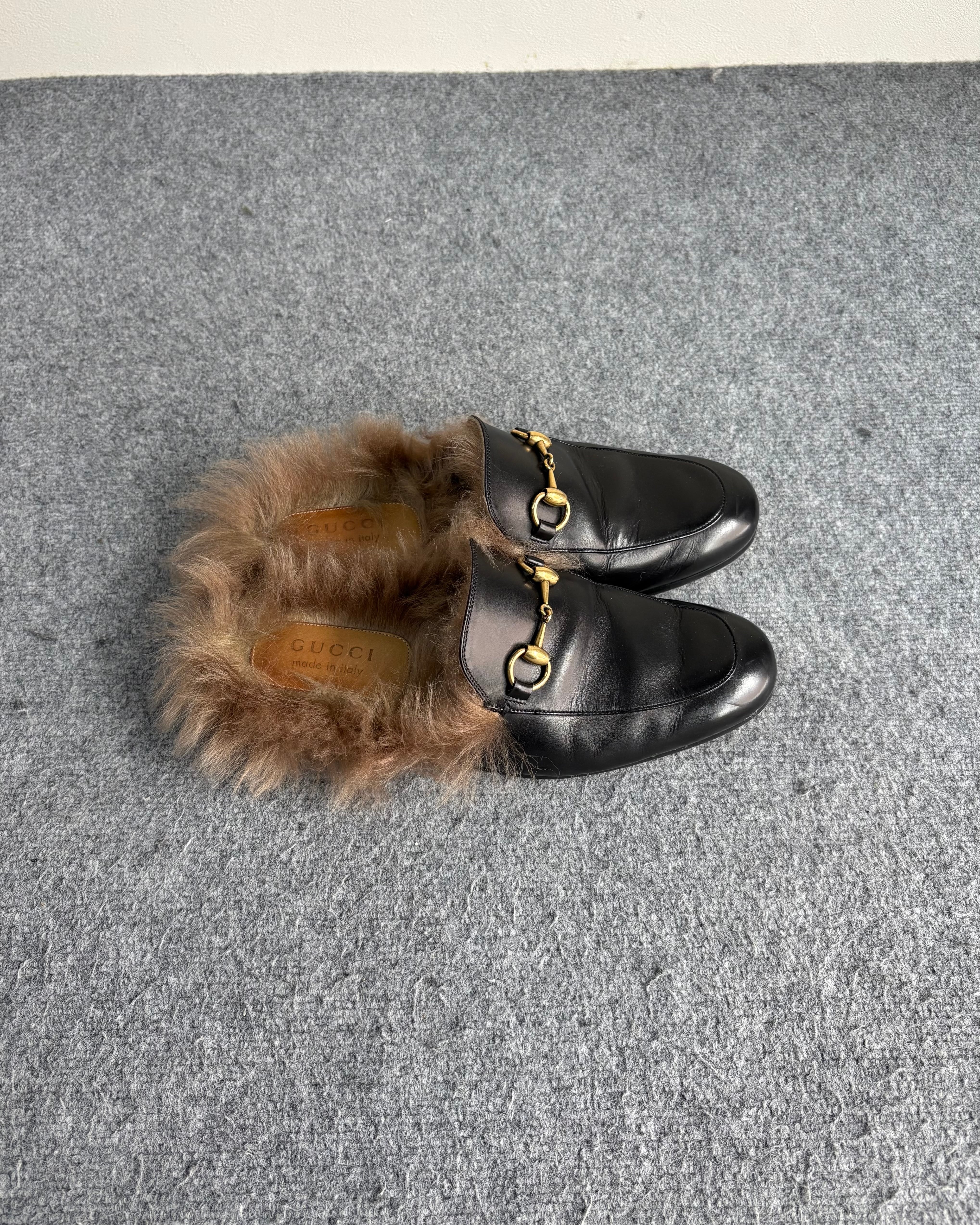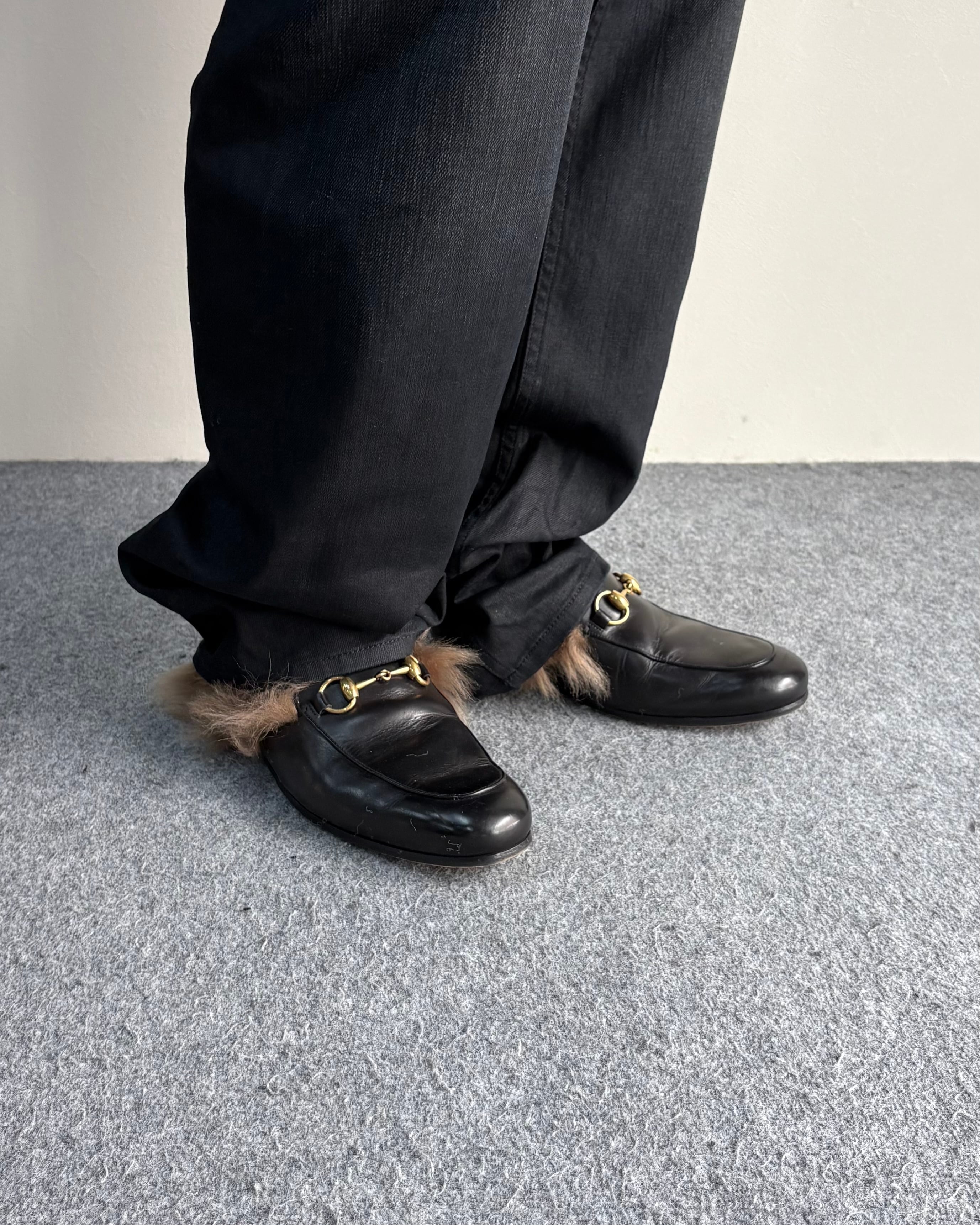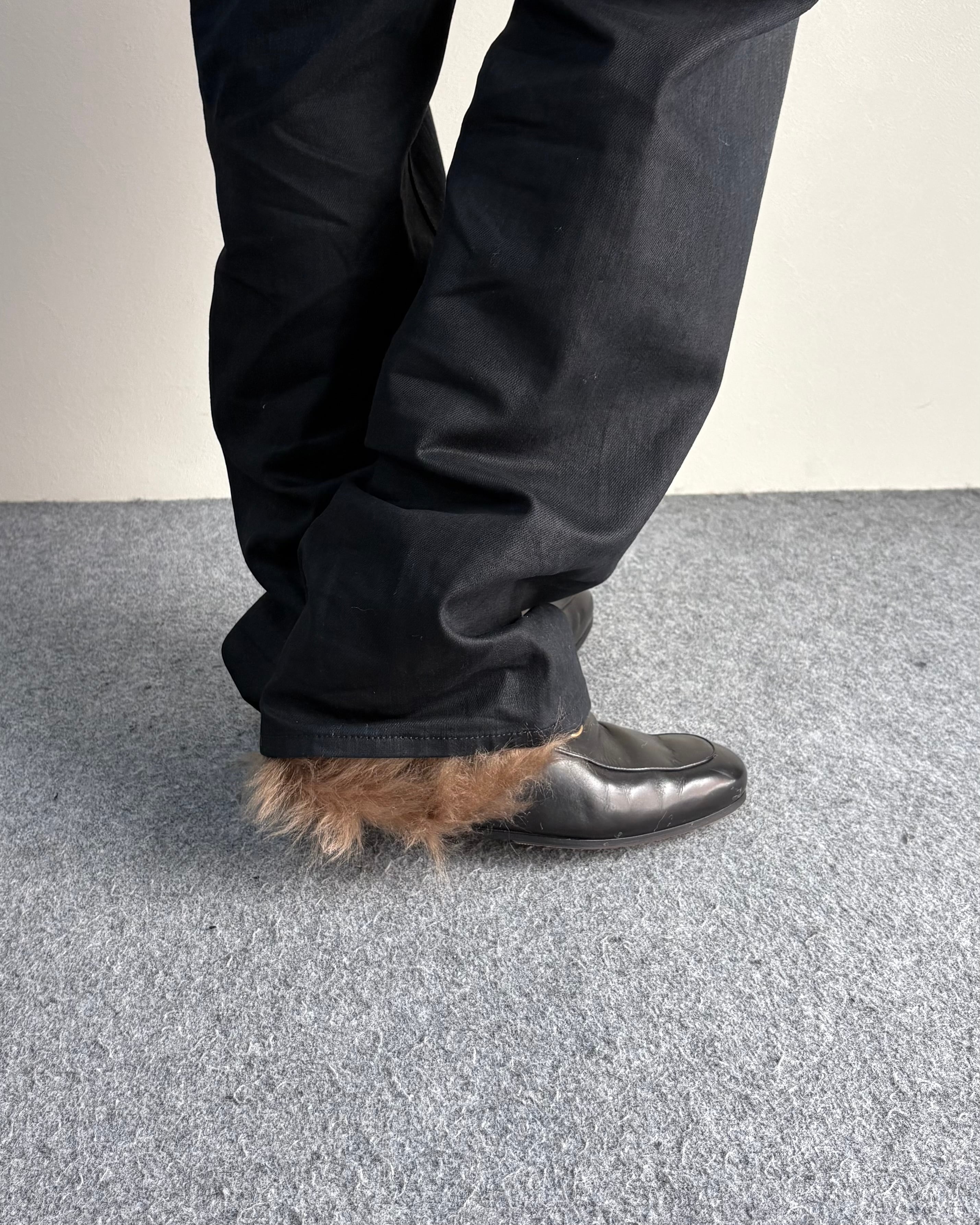 ブラックレザーの端正なローファー型に、ライニングのファーが加わることでクラシックとラグジュアリーが共存した独特のバランスが特徴のアイテム。バックレス仕様のためスリッパ感覚で着脱できる一方、ローファー由来のフォーマルな顔立ちによりデニムからスラックス、ショーツまで幅広く対応可能。