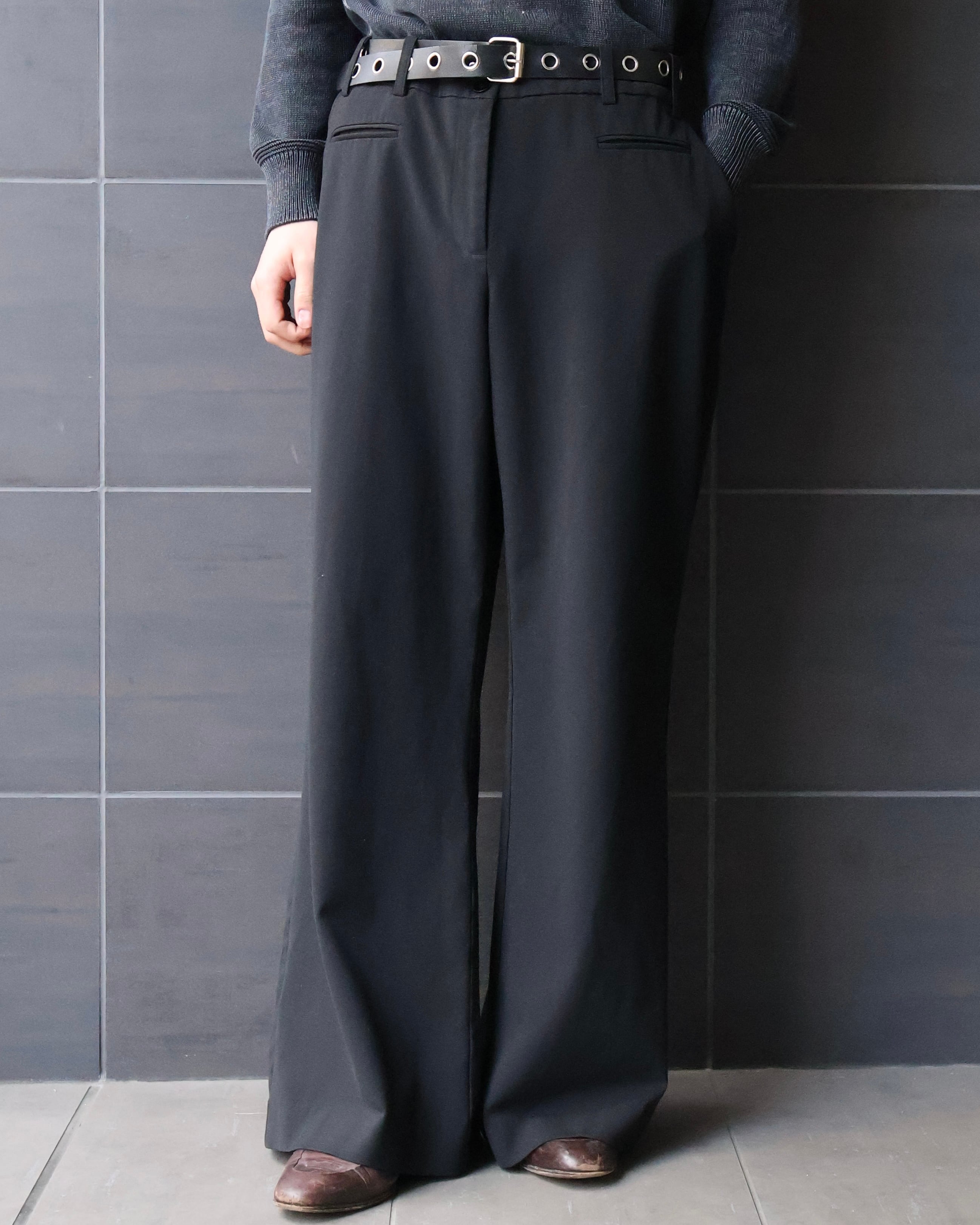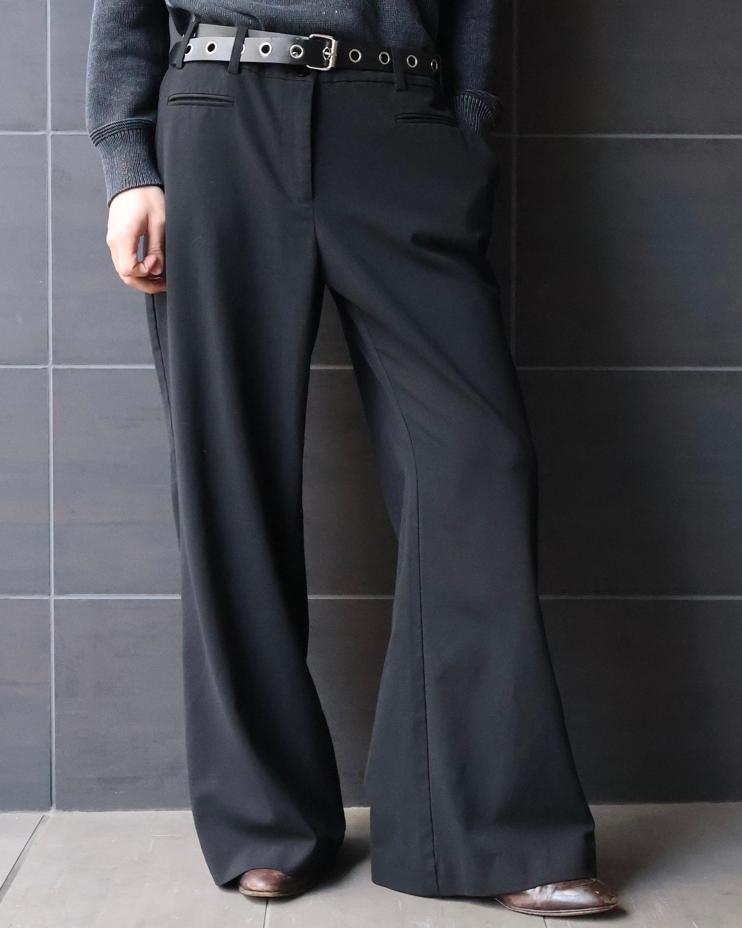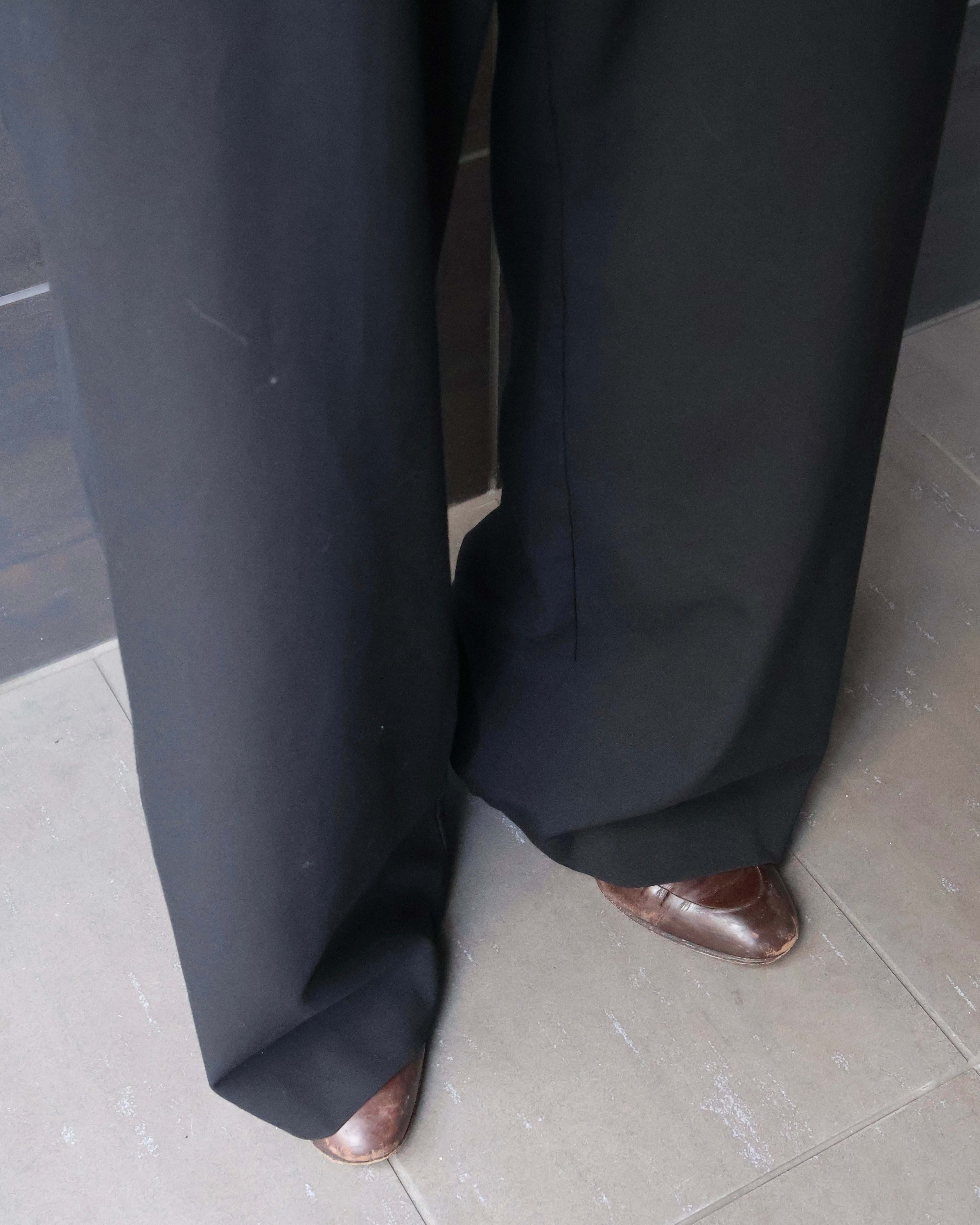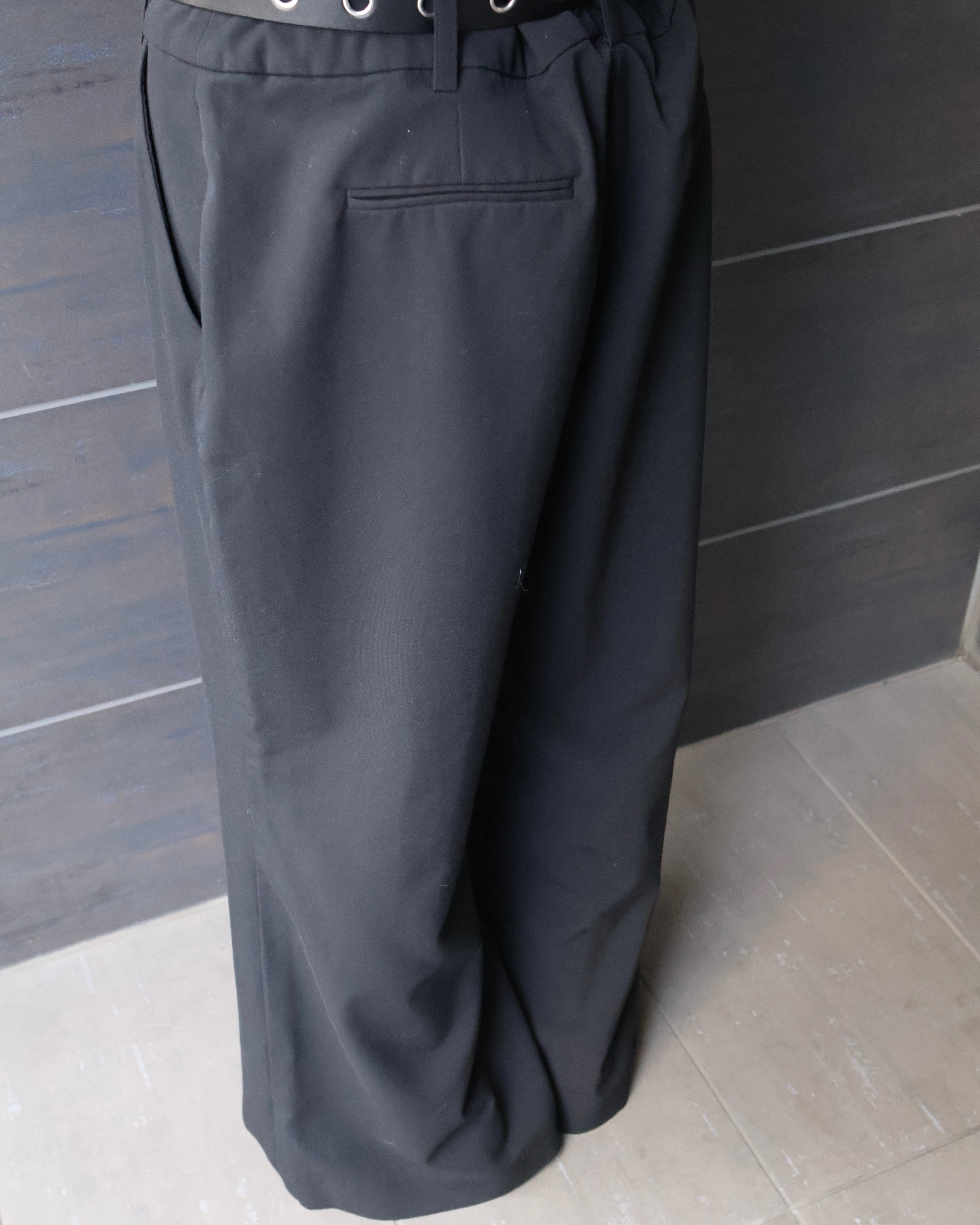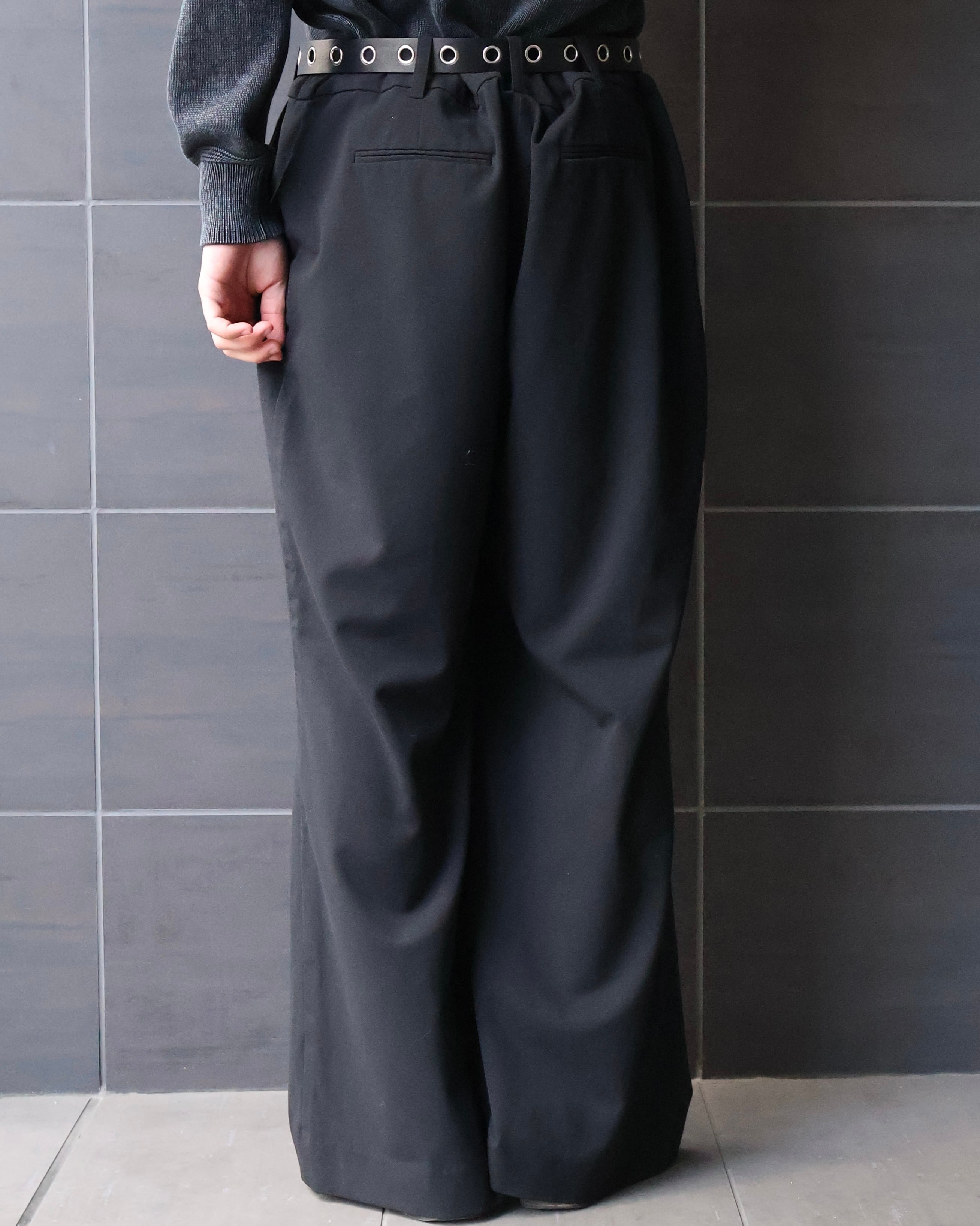 ベーシックなワイドスラックス。中でも太いサイズ感で裾に向かってストンと落ちるシルエットが美しい1本。