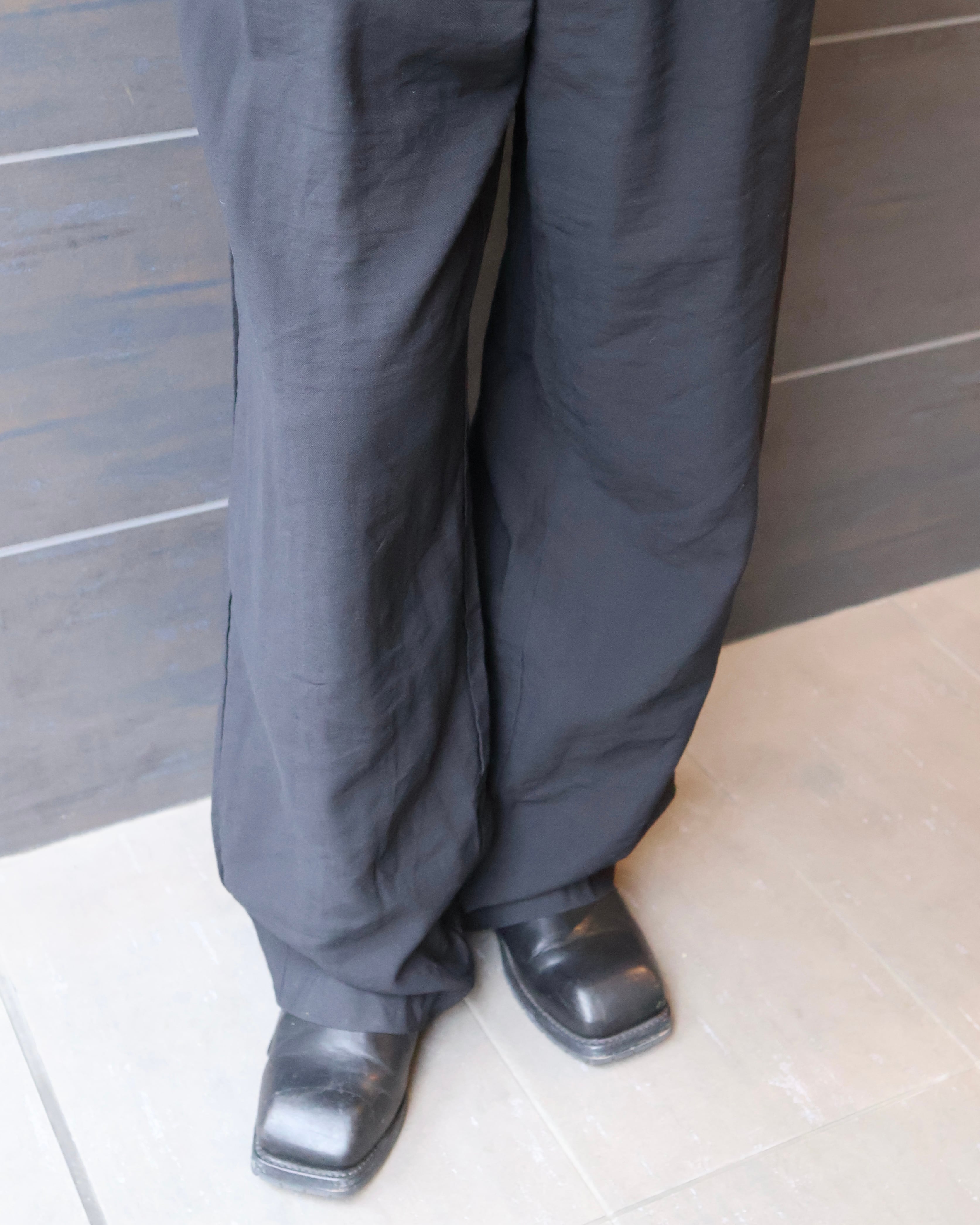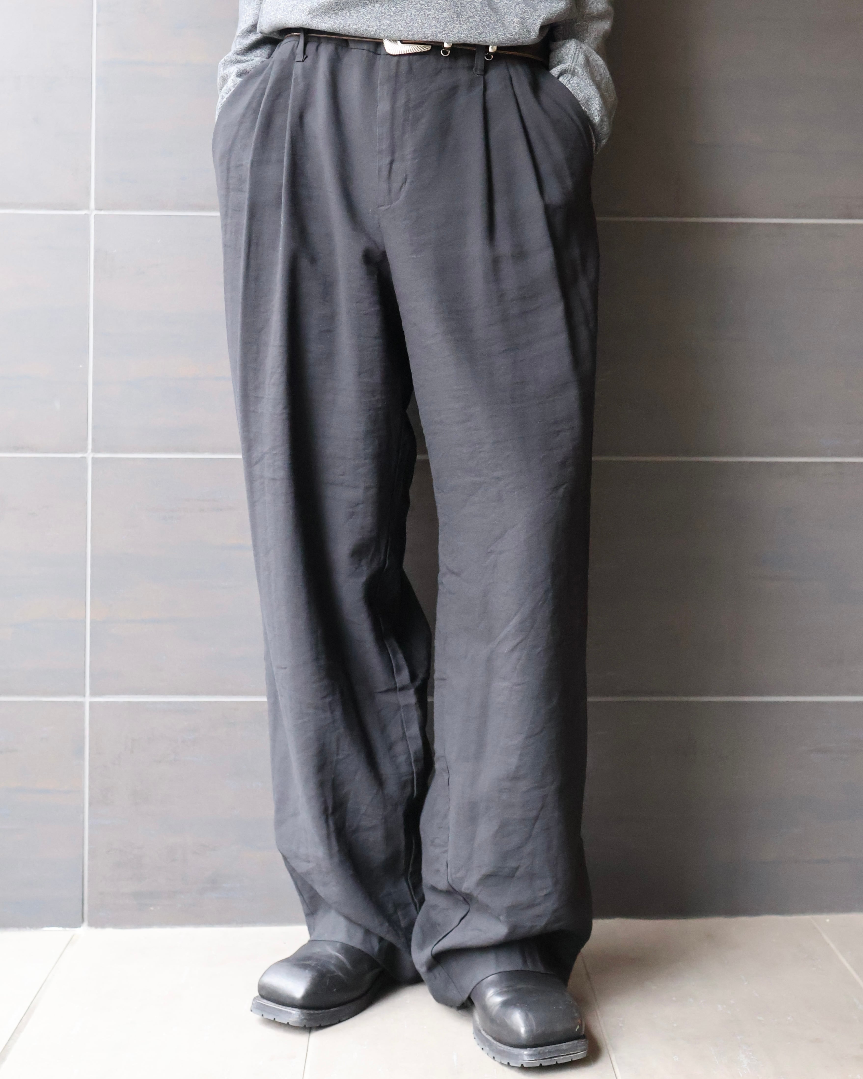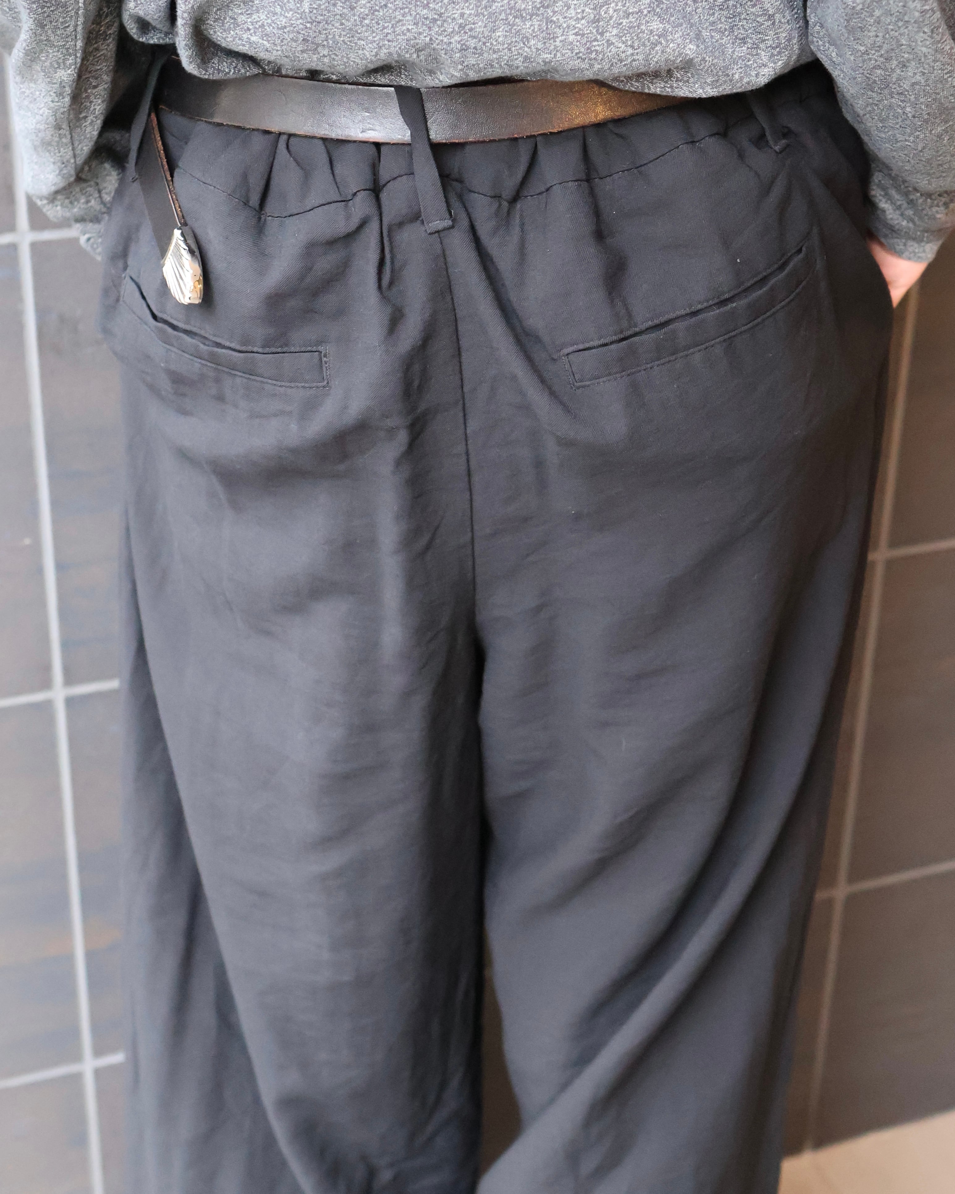 ベーシックな黒スラックス。タックが入っており、夏シンプルになってしまう腰周りに情報を付け足してスタイリングに深みを出してくれる1本。