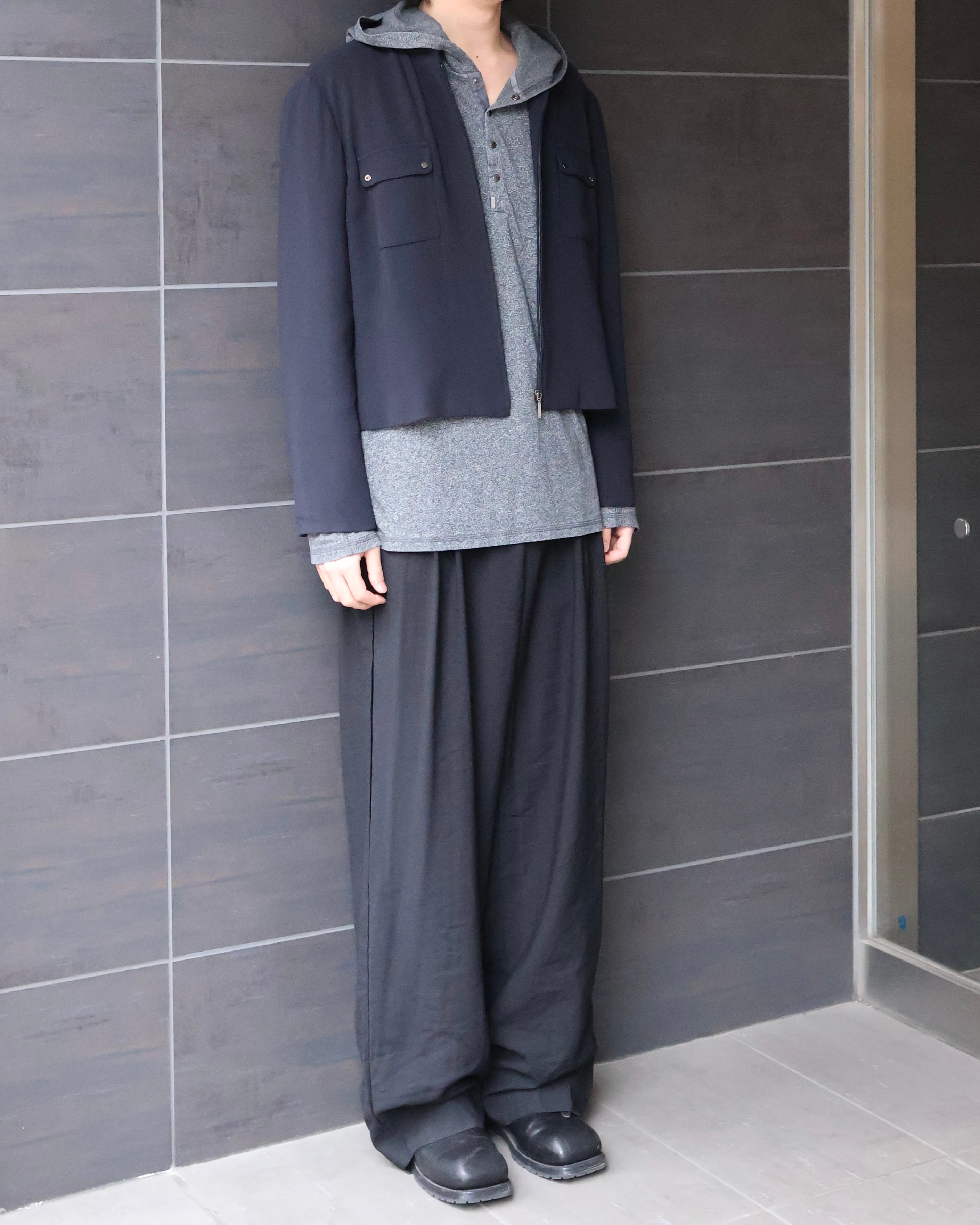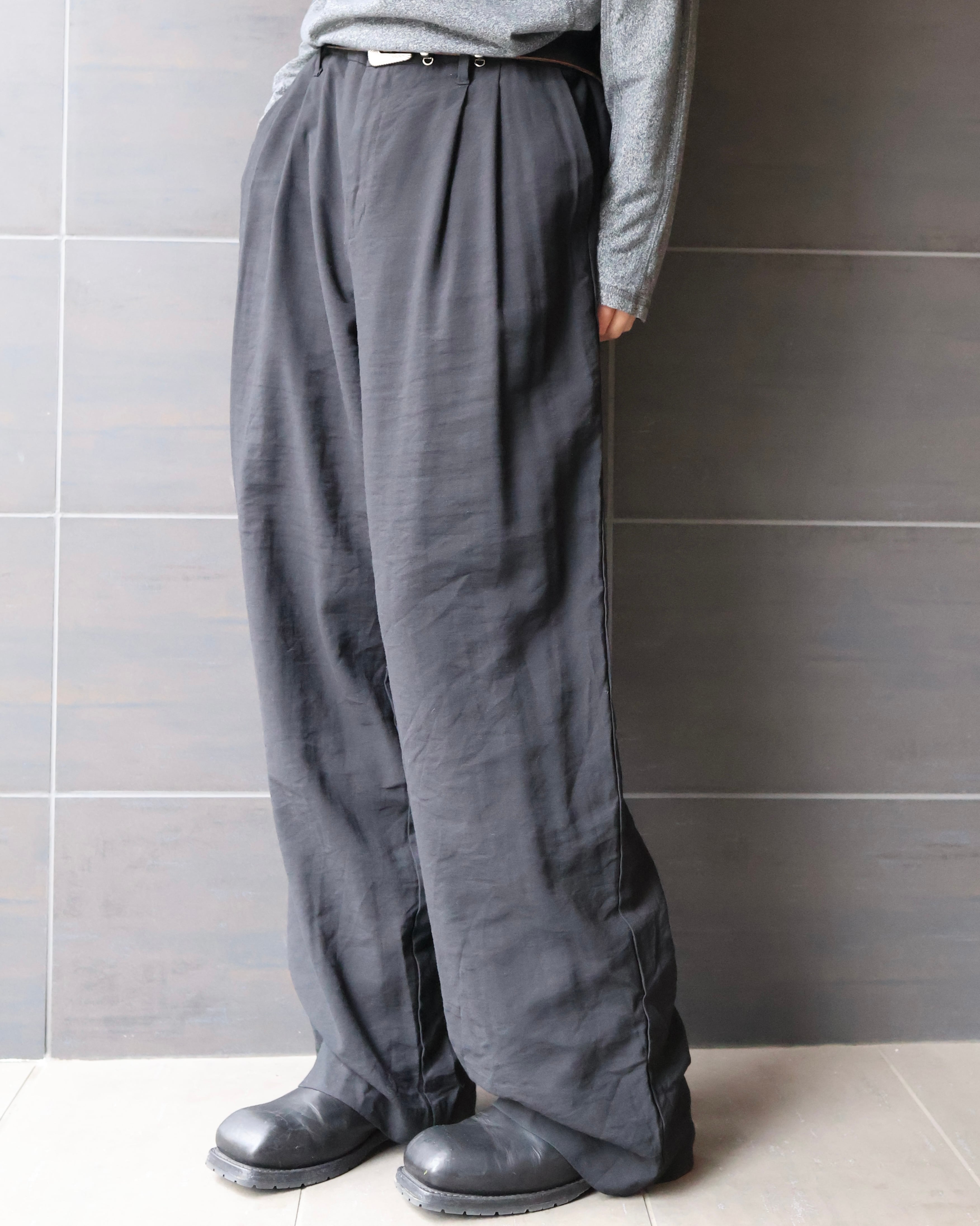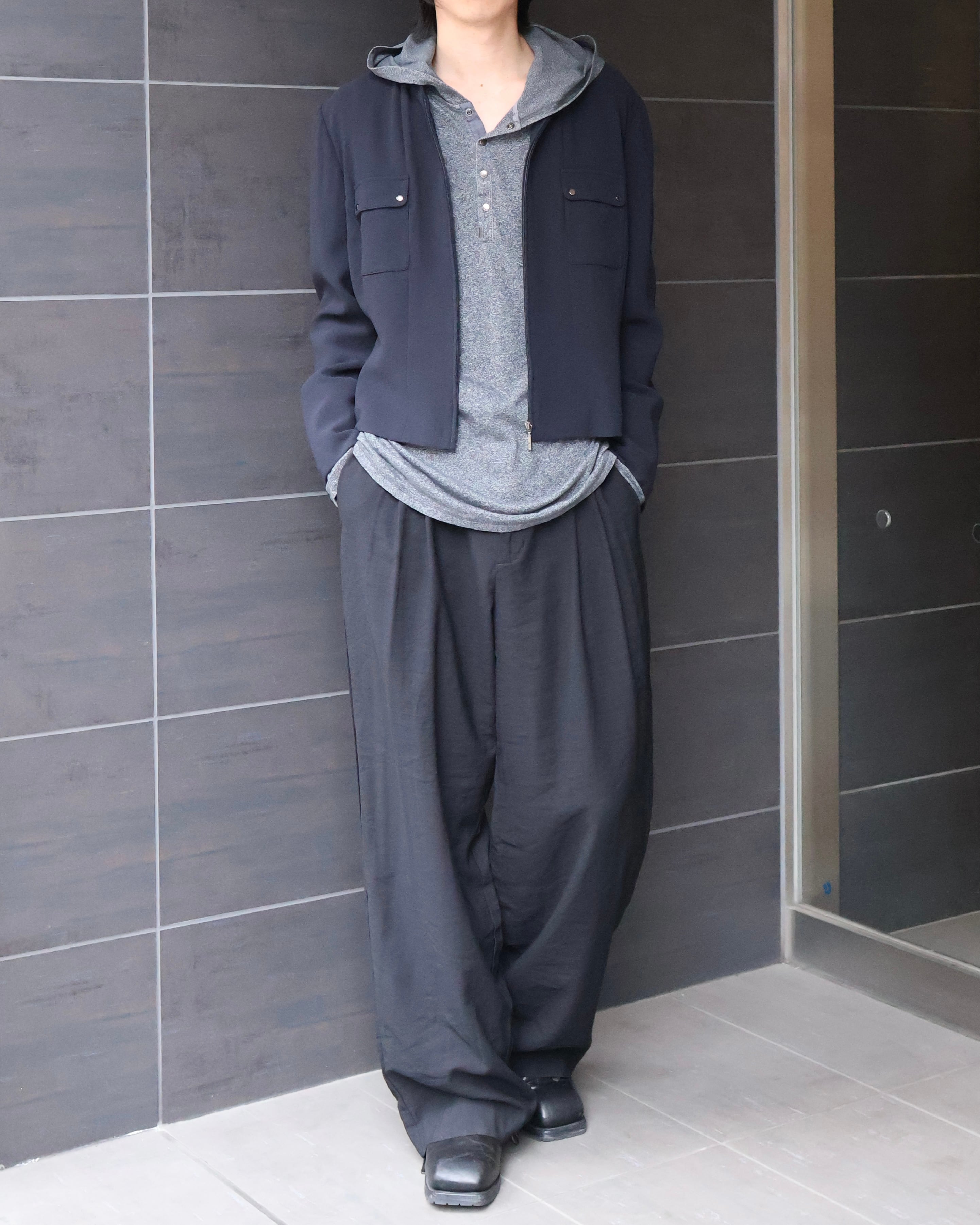 ベーシックな黒スラックス。タックが入っており、夏シンプルになってしまう腰周りに情報を付け足してスタイリングに深みを出してくれる1本。