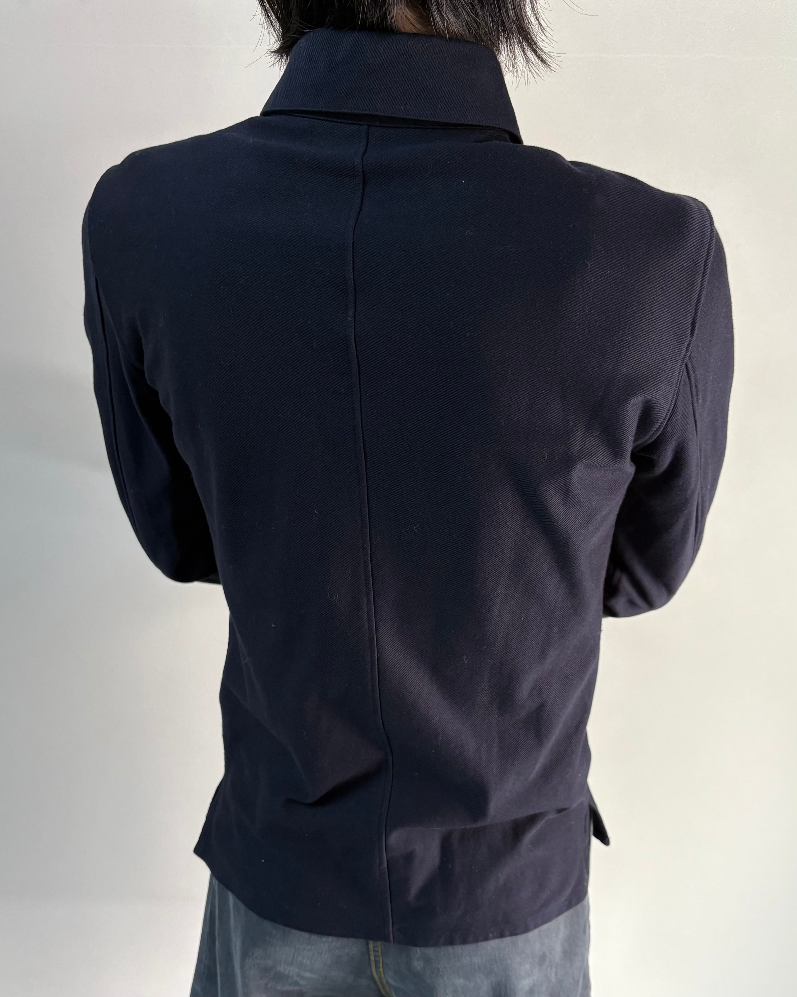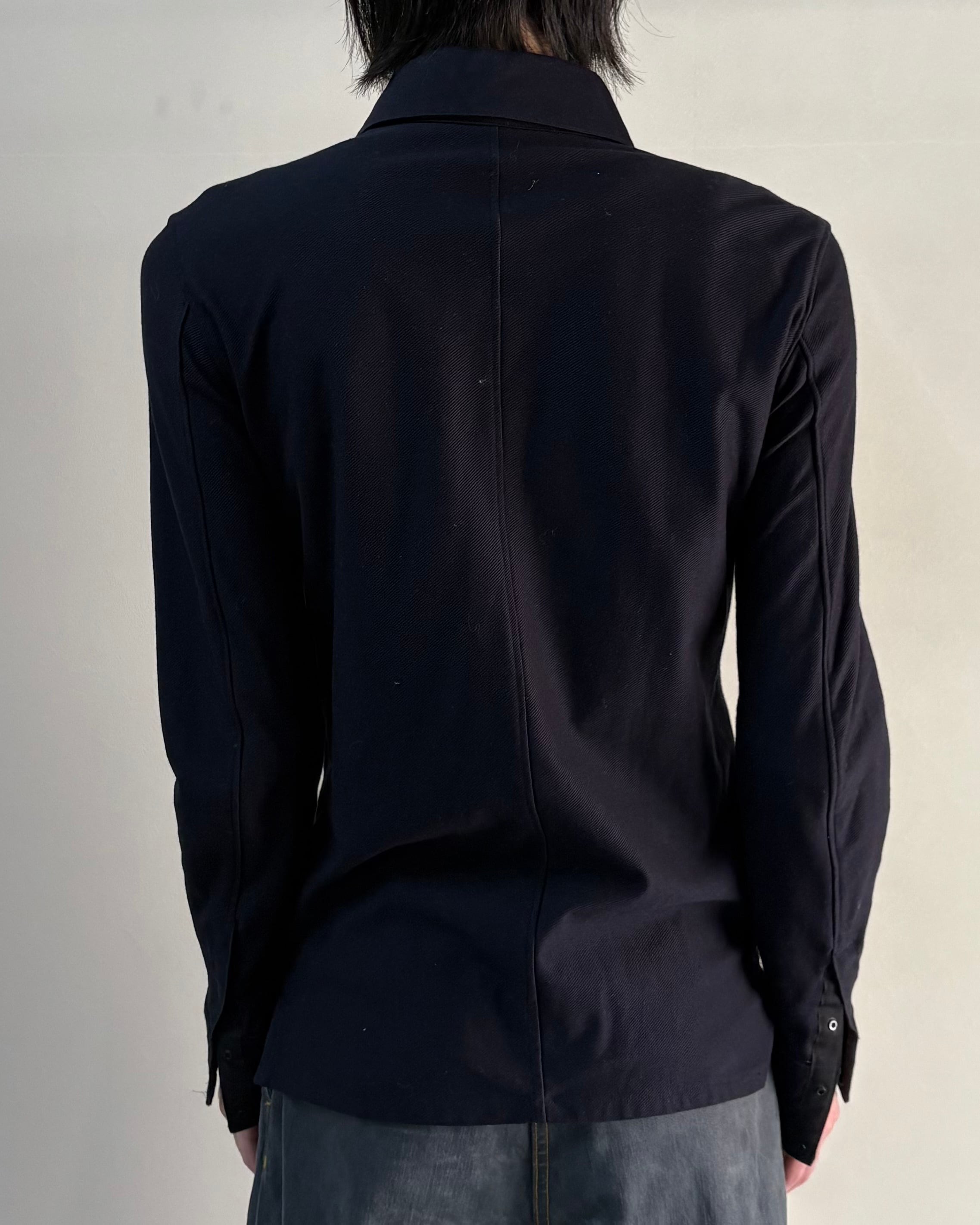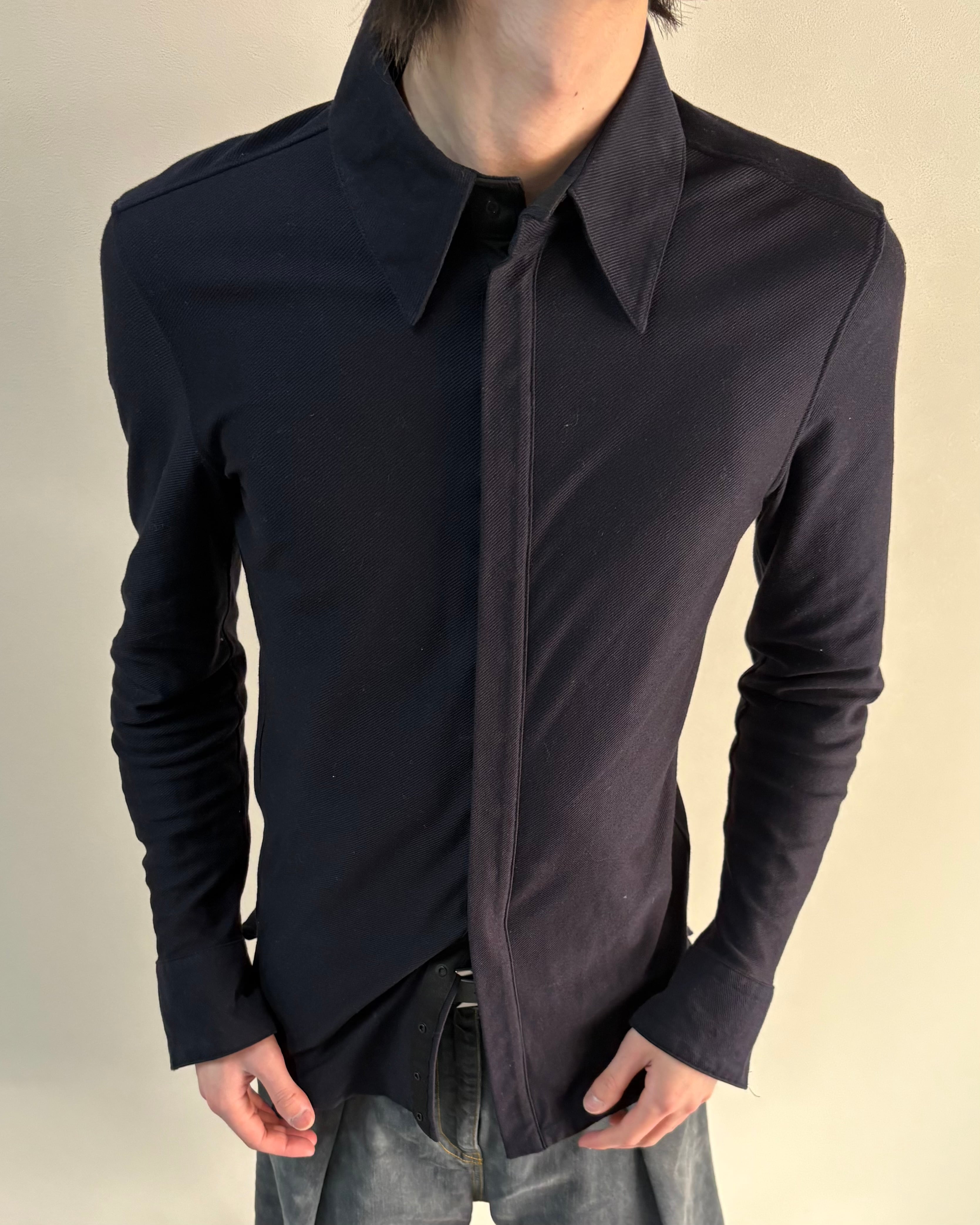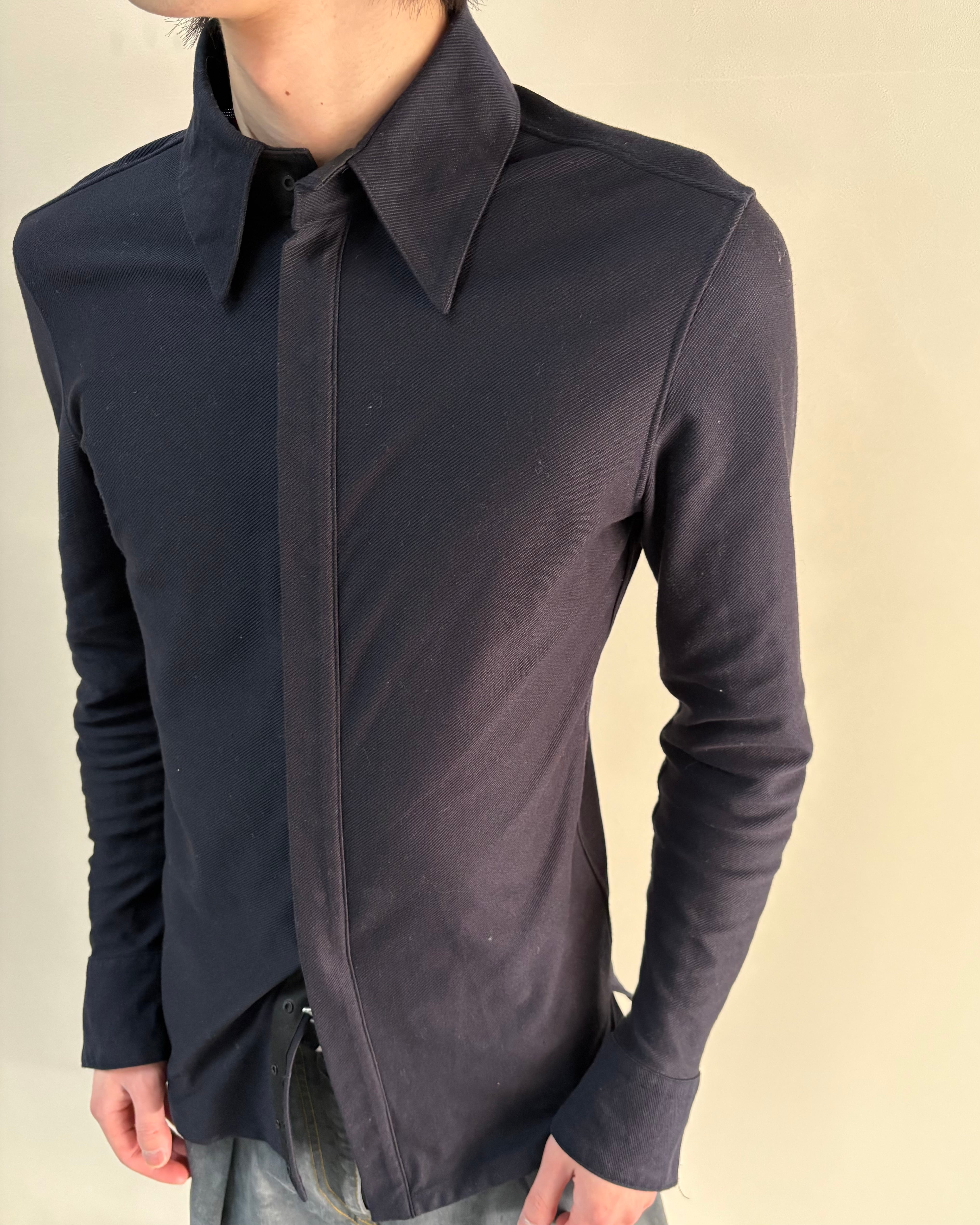 シャープなシルエットで身体のラインを美しく見せ、モード感のあるスタイリングを演出する一着。一見ベーシックなシャツでありながら、フロントは比翼のスナップボタン仕様で、ジャケットのインナーとしてはもちろん一枚でも存在感のあるアイテム。