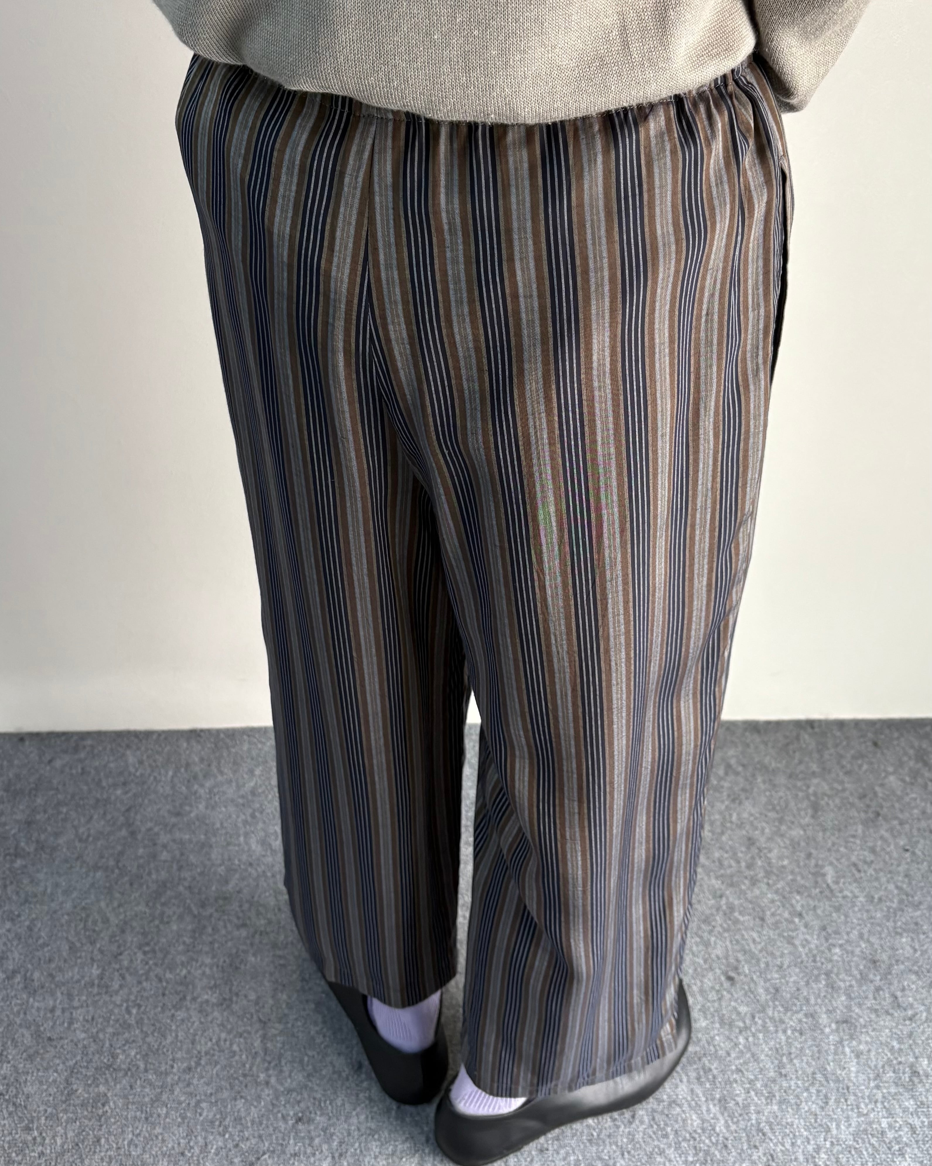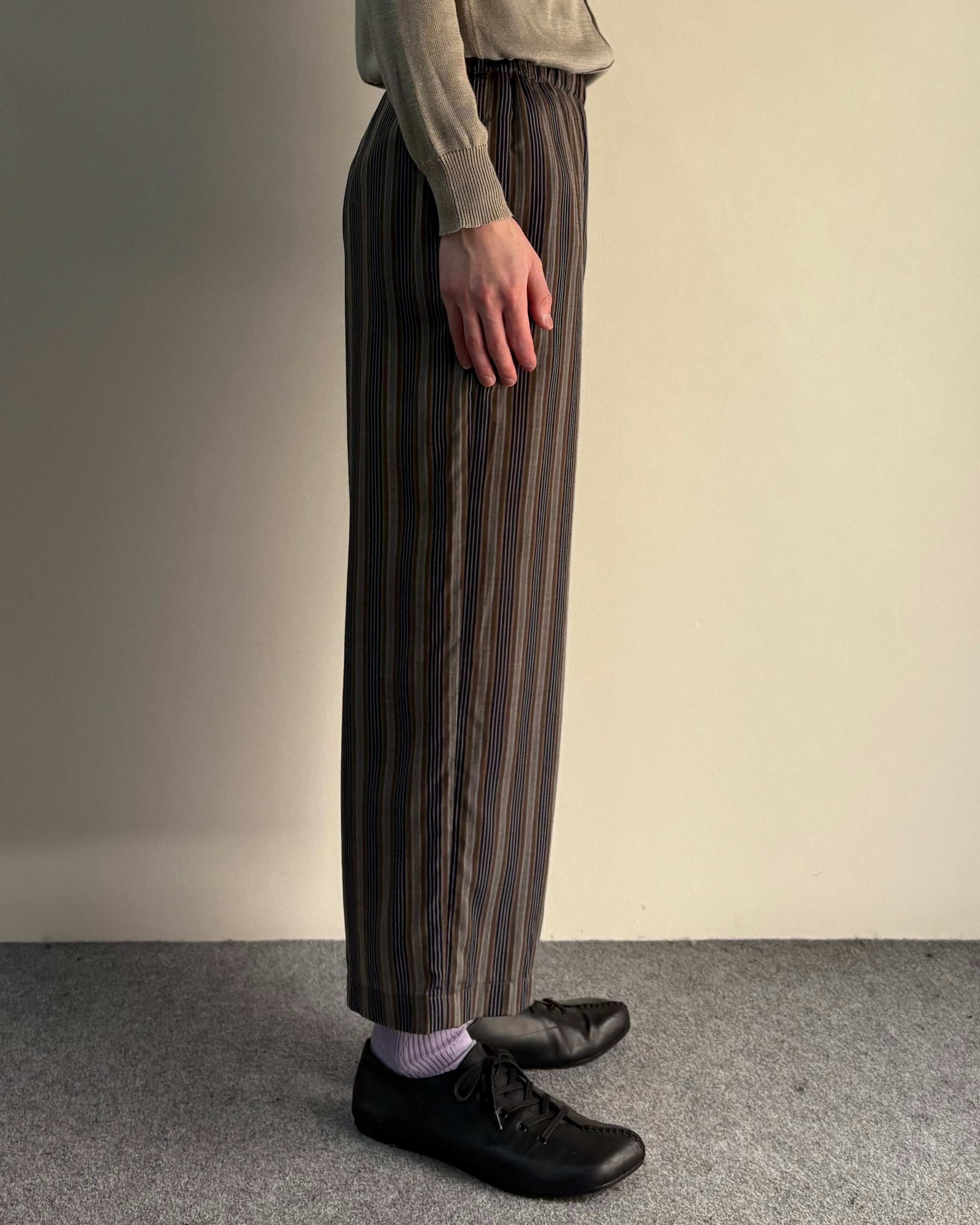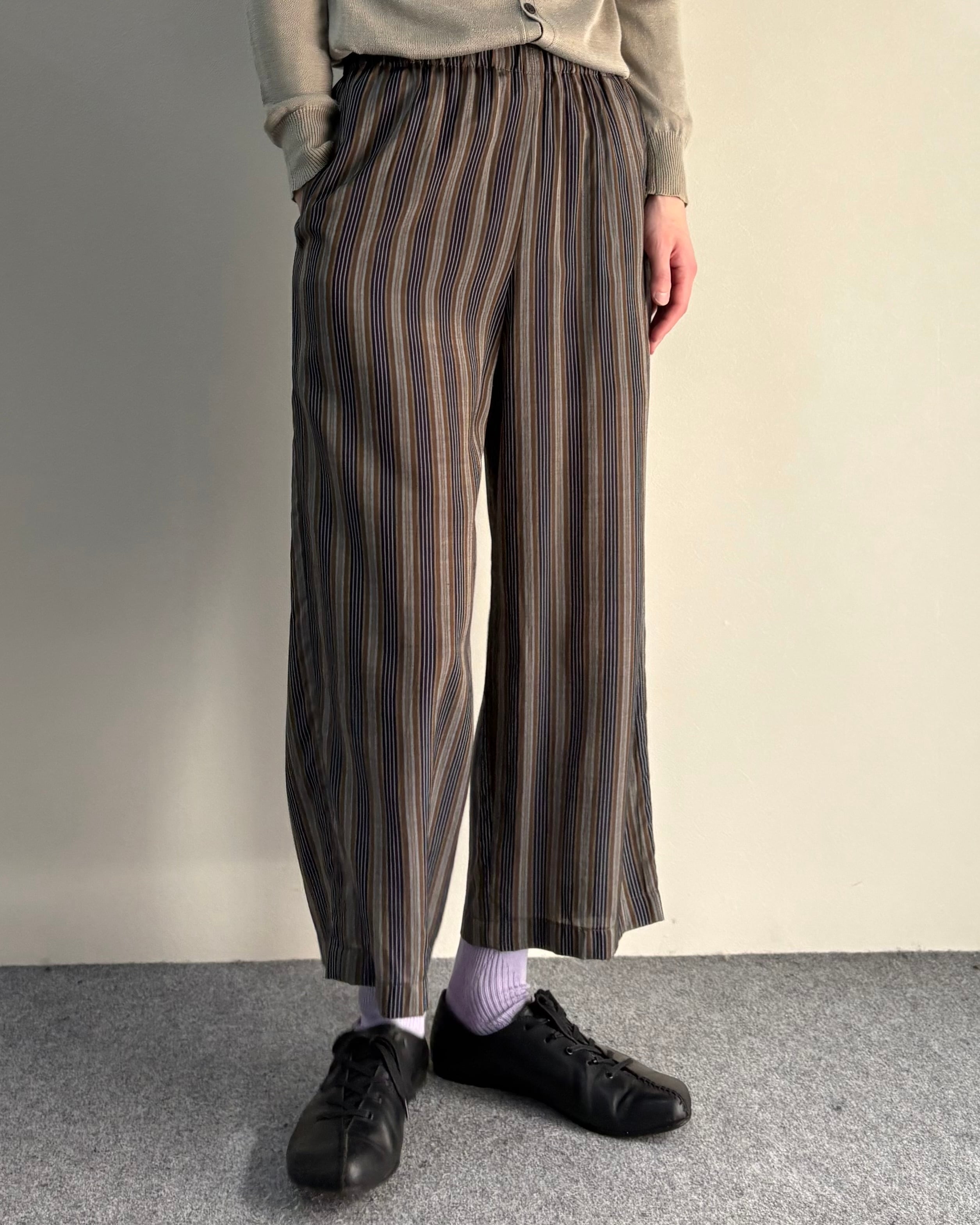落ち着いたマルチストライプの配色とリラックスしたワイドシルエットが特徴のアイテム。縦方向のラインが強調されることで、ボリュームがありながらもすっきりとした印象。クロップド丈でソックスや革靴との相性も良く、シンプルなトップスと合わせるだけでも様になる一本。