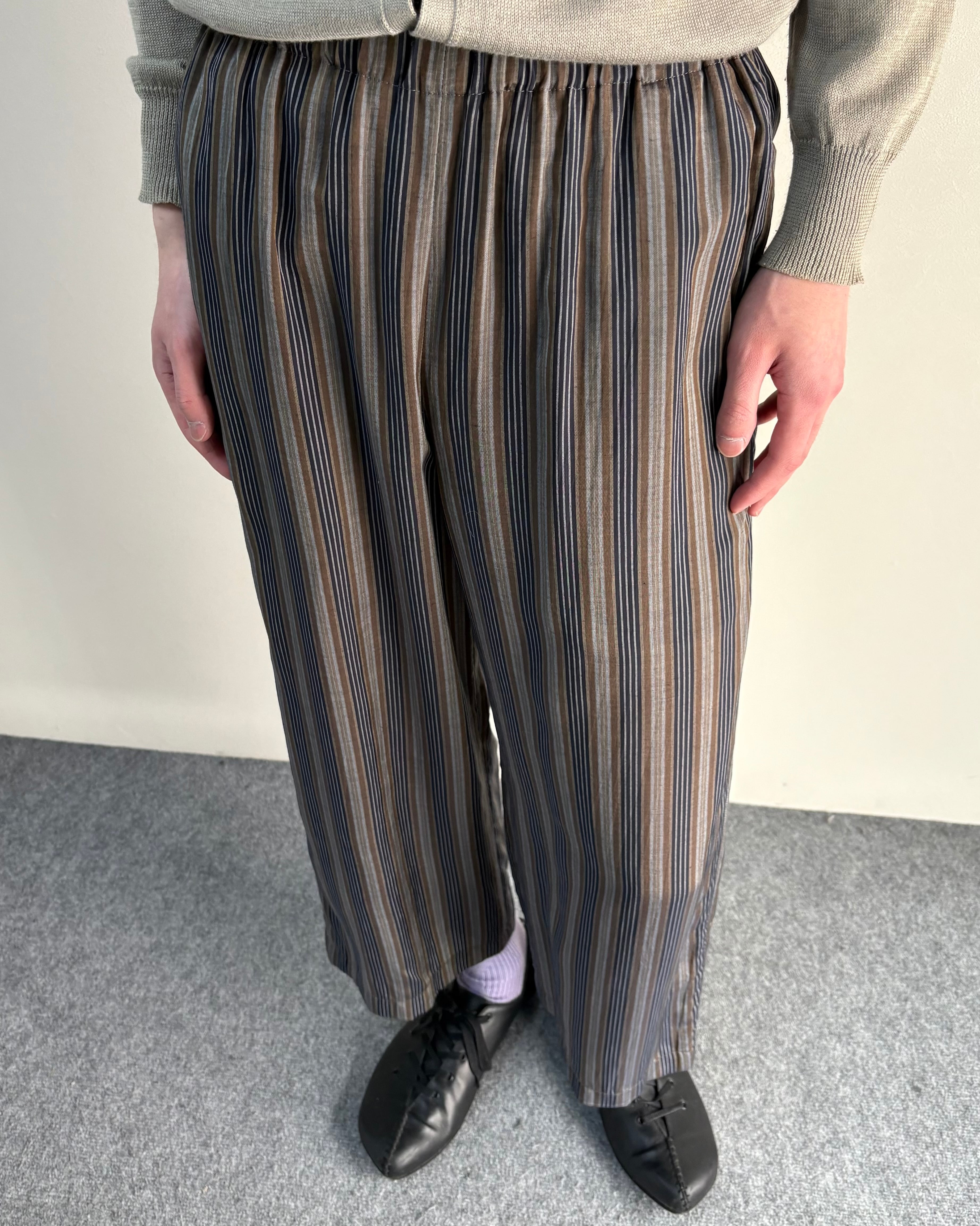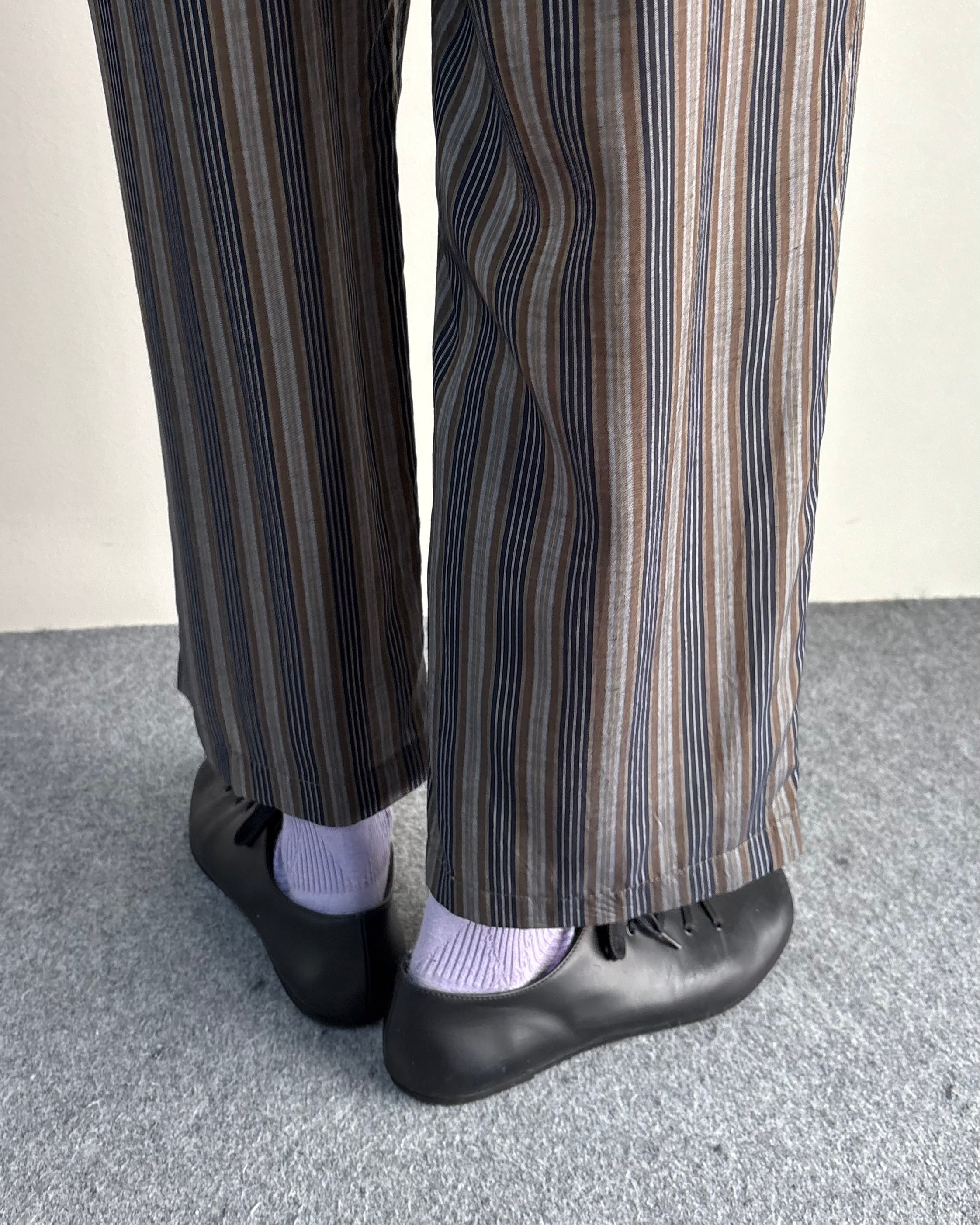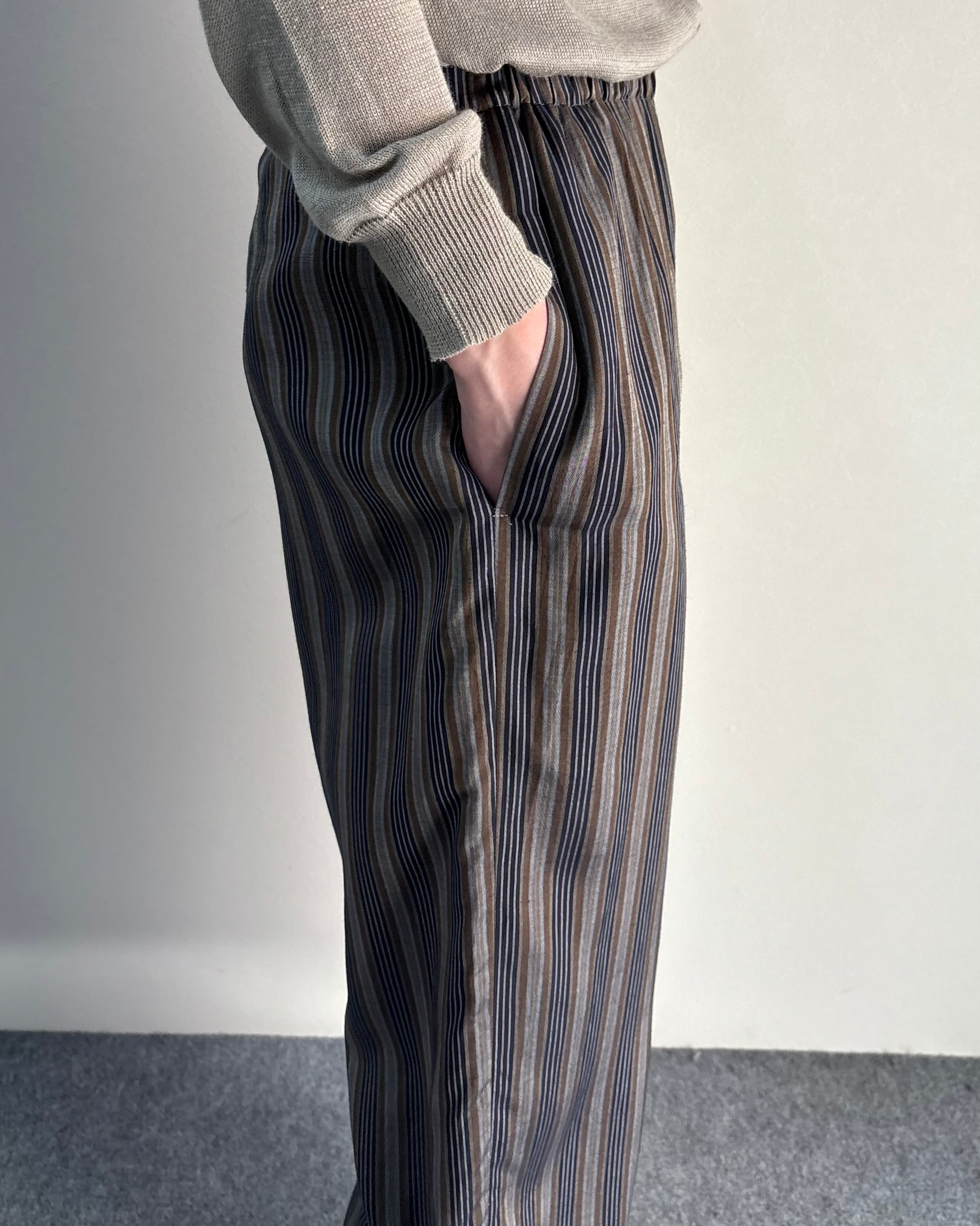 落ち着いたマルチストライプの配色とリラックスしたワイドシルエットが特徴のアイテム。縦方向のラインが強調されることで、ボリュームがありながらもすっきりとした印象。クロップド丈でソックスや革靴との相性も良く、シンプルなトップスと合わせるだけでも様になる一本。