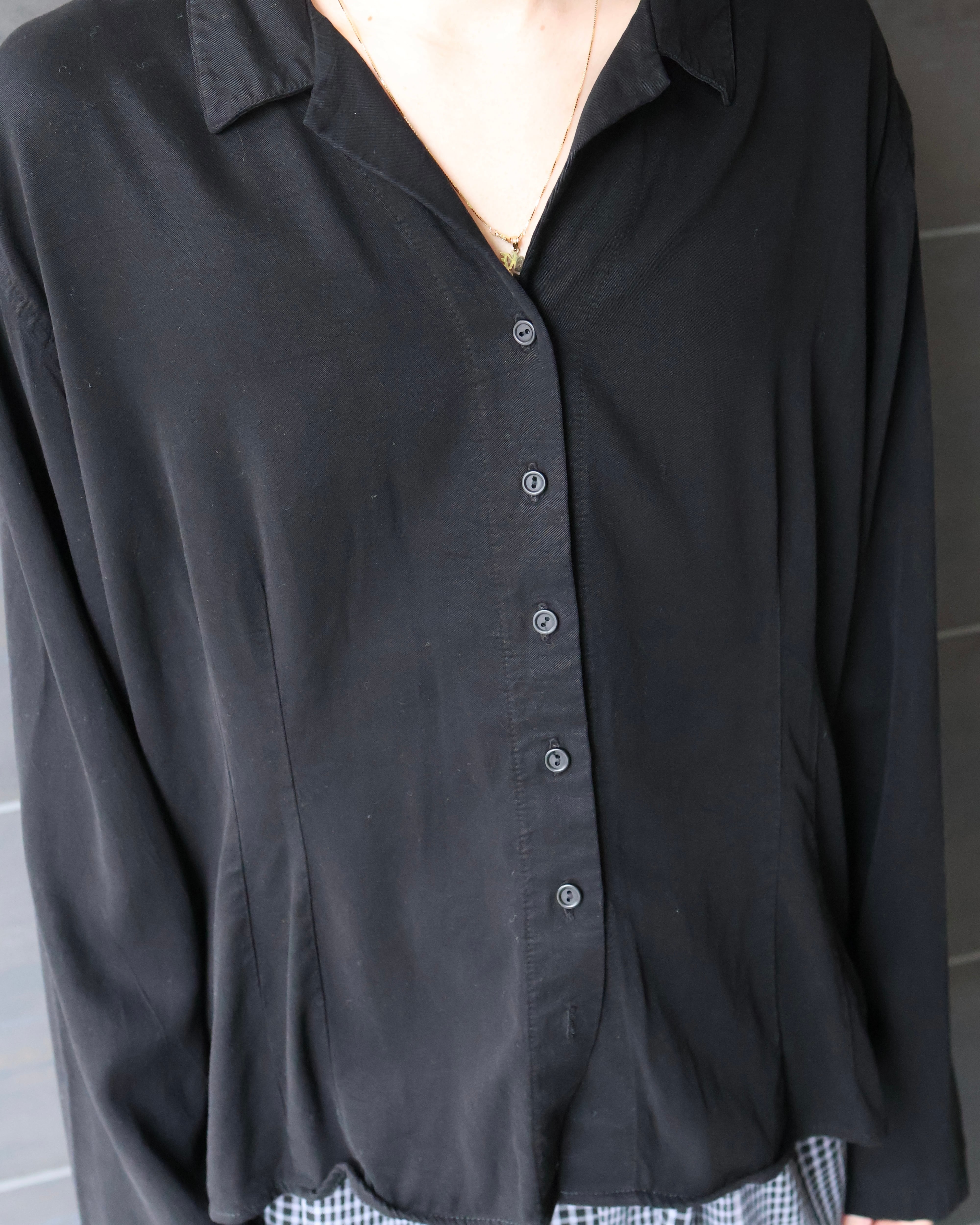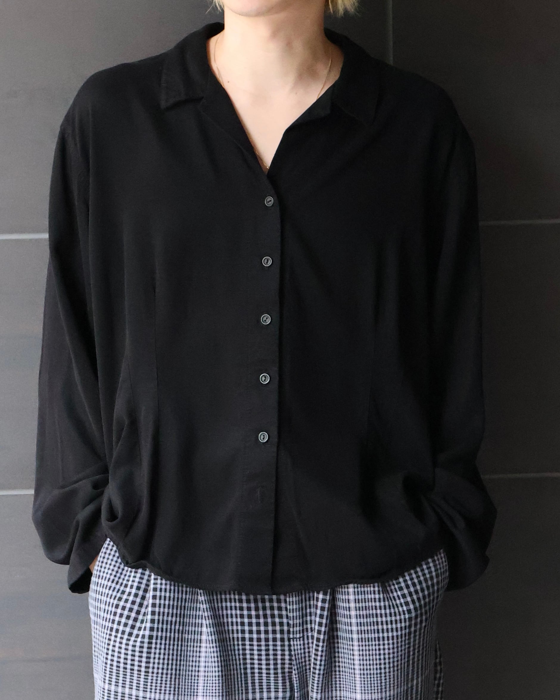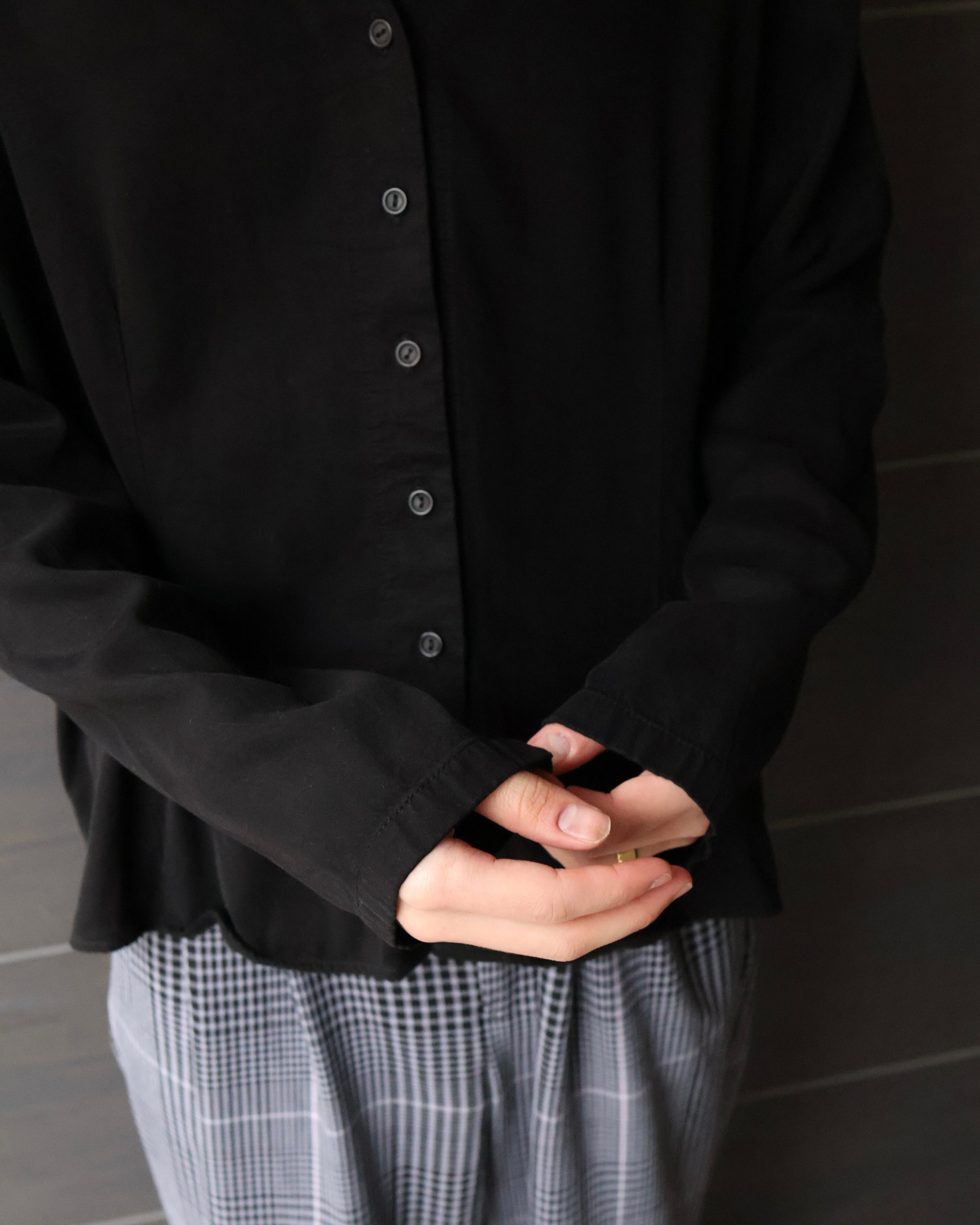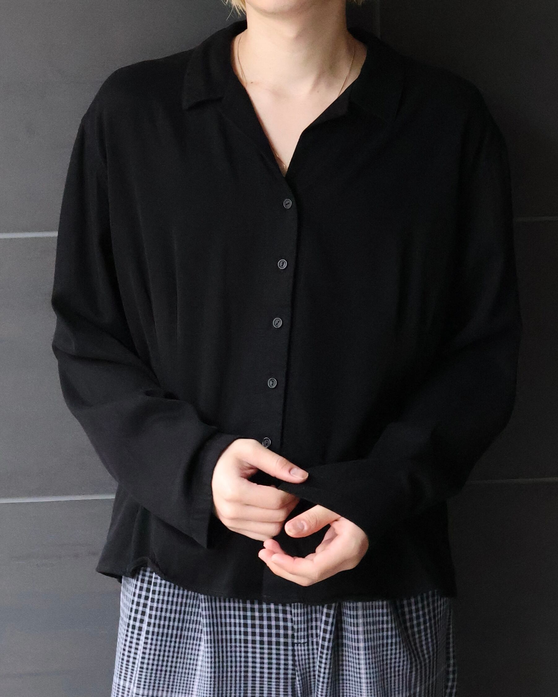 絶妙な光沢感のある、ボックスシルエットのシャツ。テンセル素材で揺れ感もよく、とことん上品に決まるアイテム。ボタンの配置と大きさもミニマルで、シンプルに着用できる一枚。