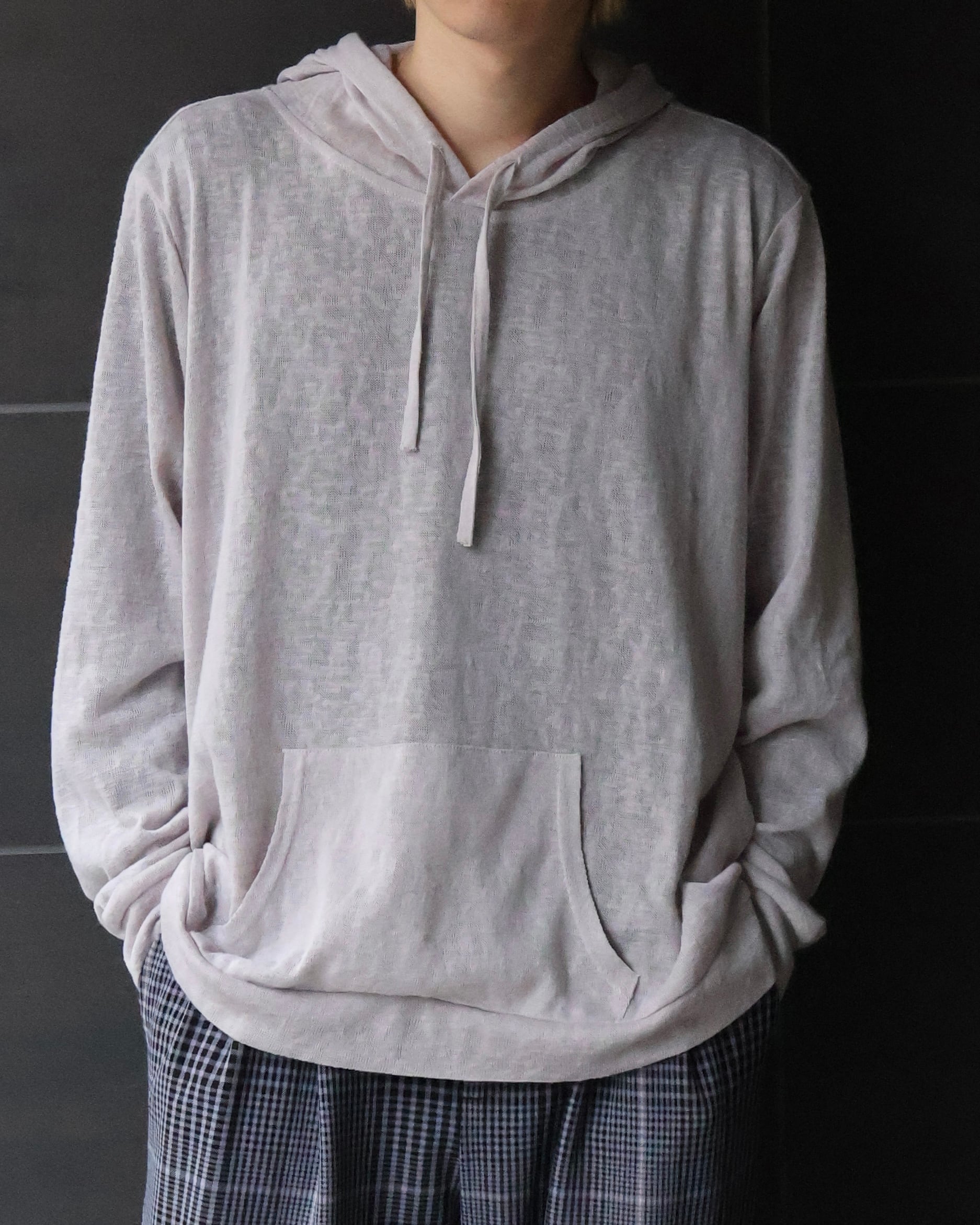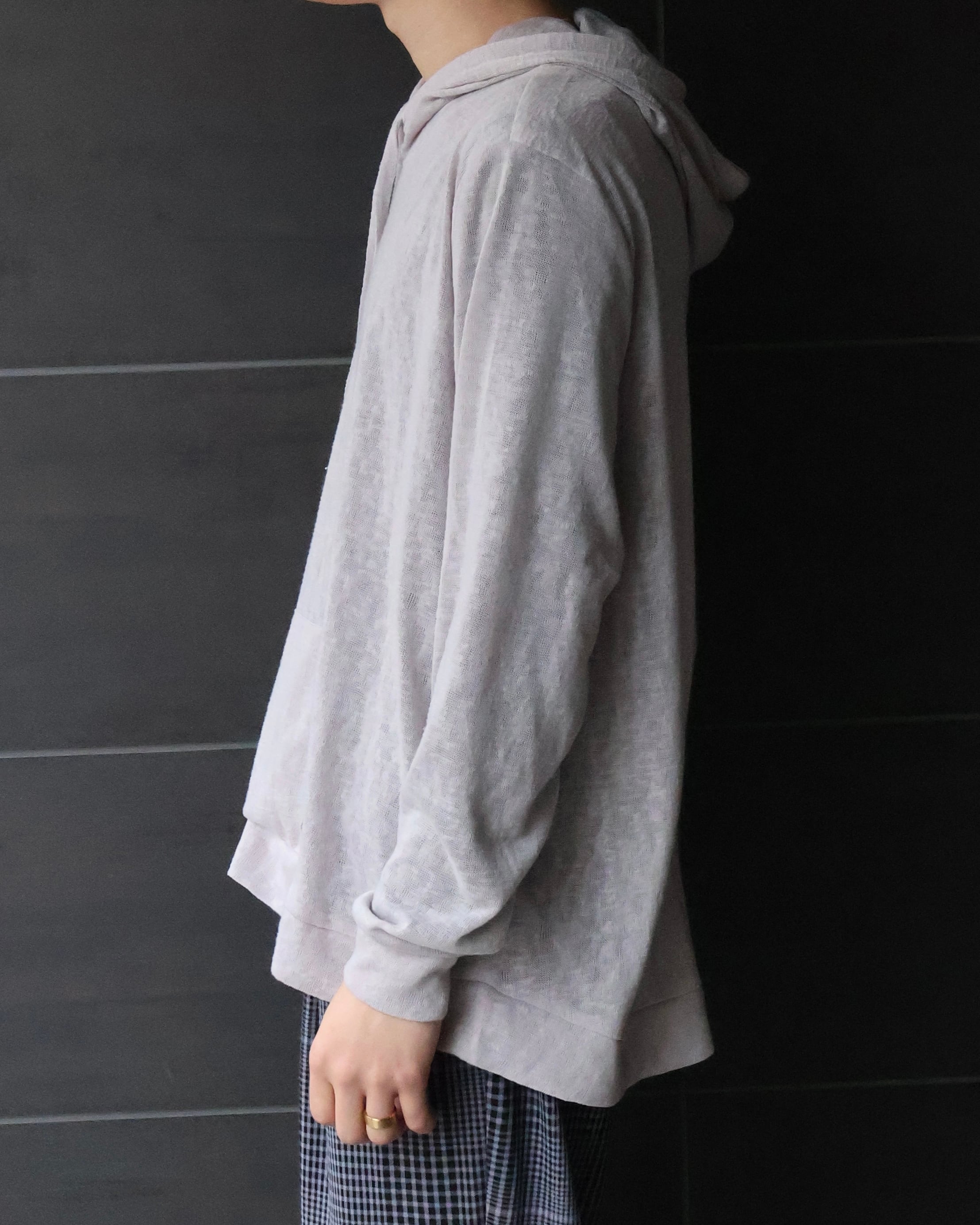 いい色味の、薄手フーディ。春先はこういった一枚でサラッと決まるようなフーディをお探しの方も多いはず。リネンのような風合いがgoodでパンツを選ばずに着用できる一枚。デニムでとことんカジュアルないかもよし、上からシャツを羽織ってクリーンにまとめるもよし、合わせ方に際限がない、タイムレスなアイテム。