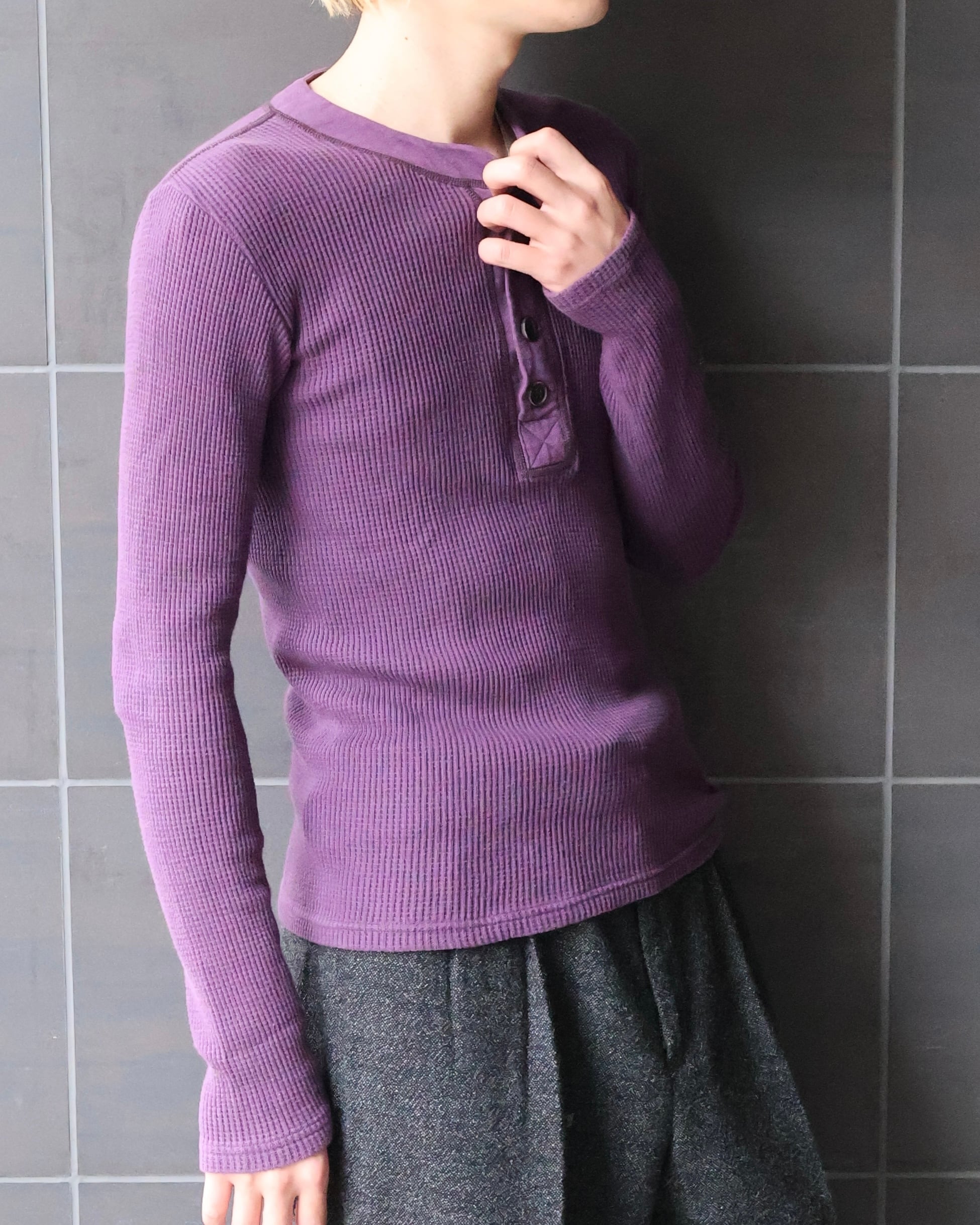 極めてシンプルな鮮やかなパープルのサーマル。サーマルで面白い色味のものは夏のさっぱりとしたコーディネートにインパクトを与えるのに最適。秋冬のインナーとしてもタイトで色だけをコーディネートに加えてくれる、シャツやジャケットの中に入れたくなる一枚。