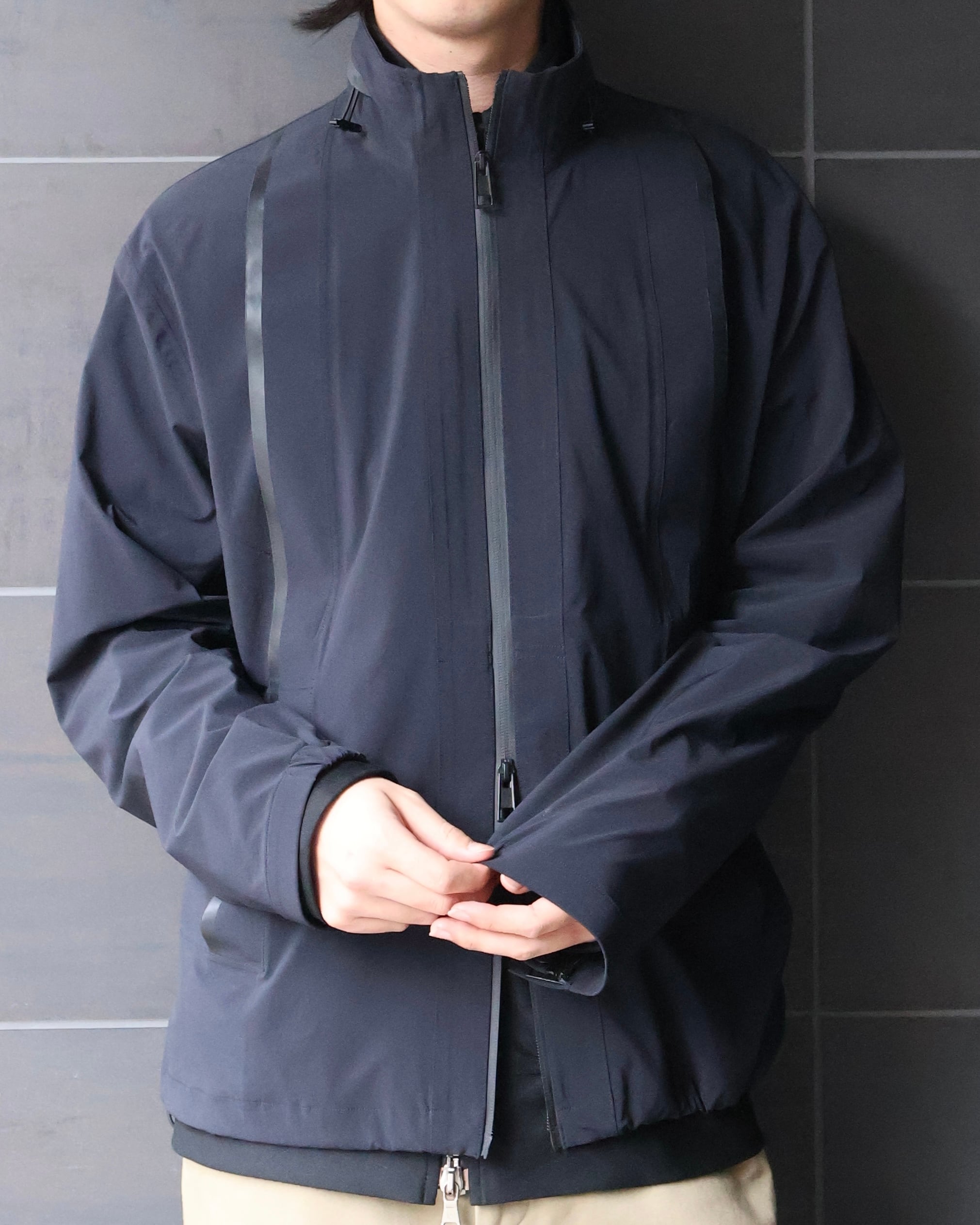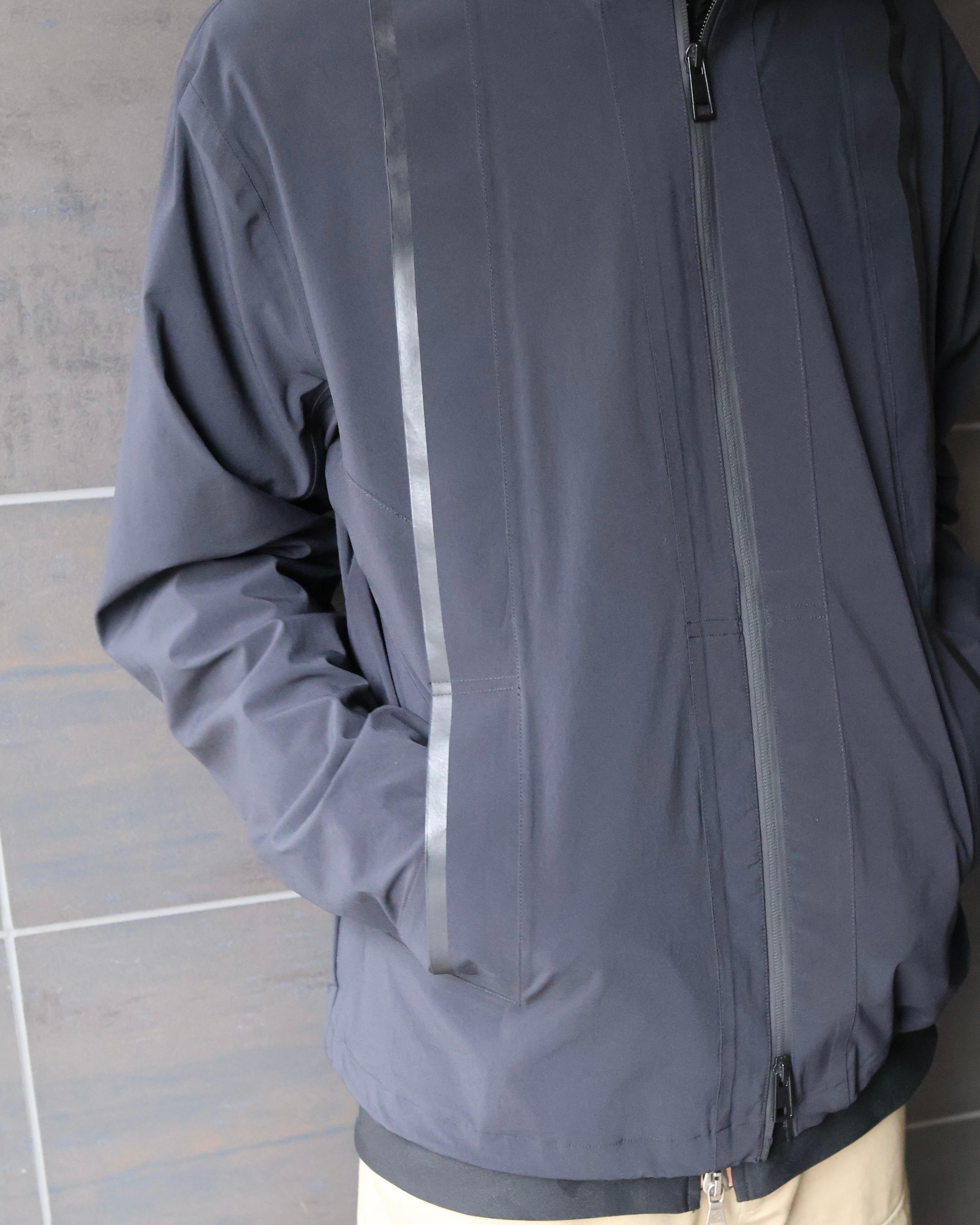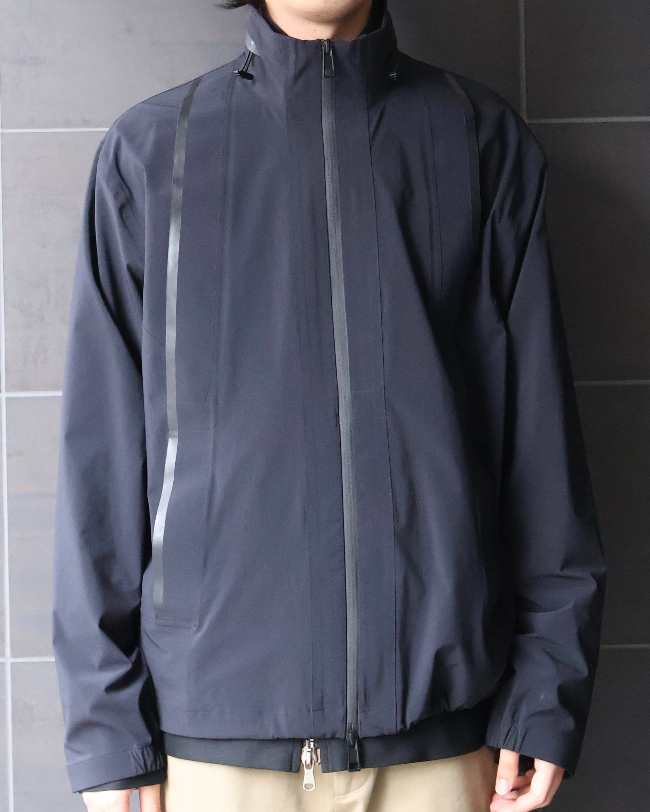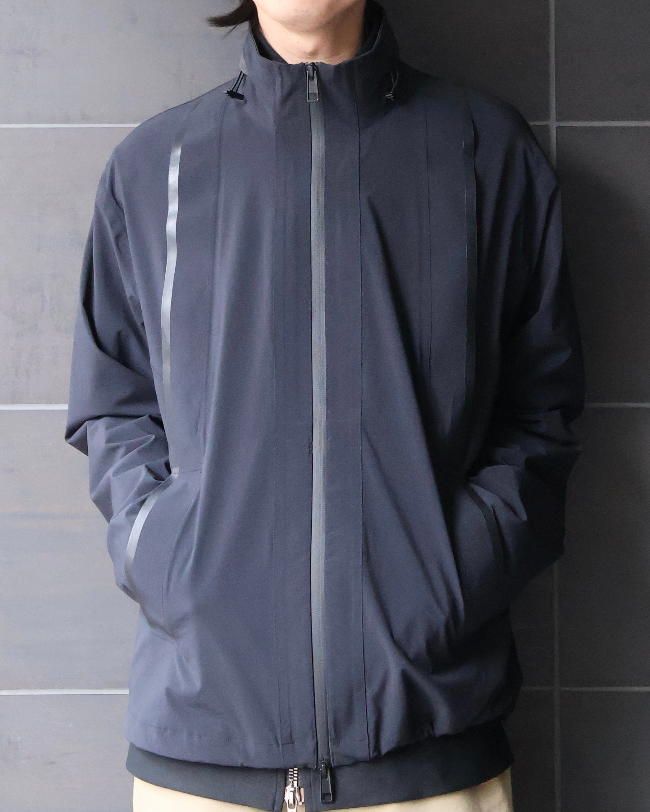 テープデザインが特徴的な、無機質な雰囲気のジャケット。作りは簡素で、かなりスポーティな雰囲気ではあるが、細部の作り込みがなされているからこそ上品な合わせにも対応できるアイテム。スラックスや、あえてのヴィンテージパンツなど、振り幅を楽しめるような無垢な一枚。
