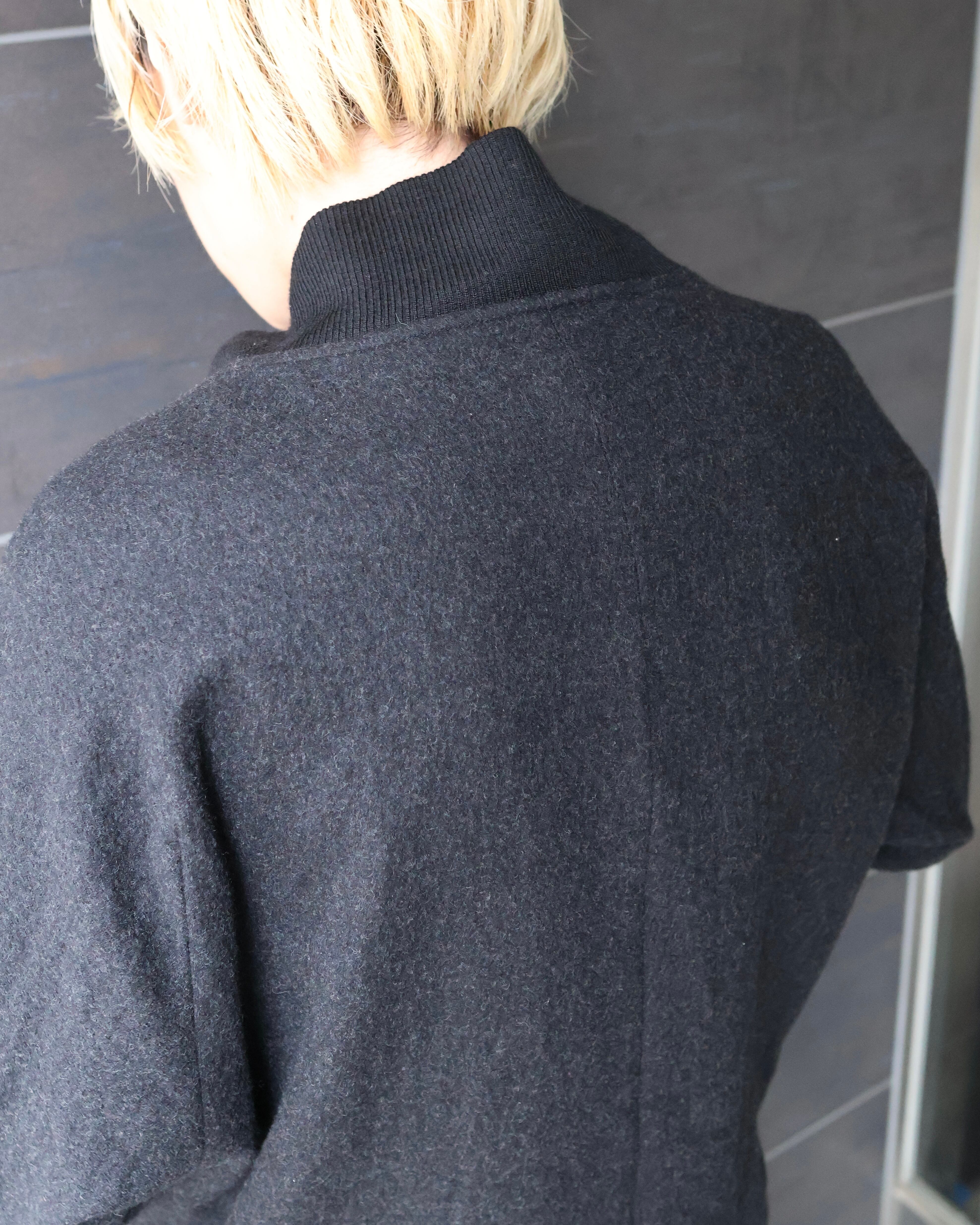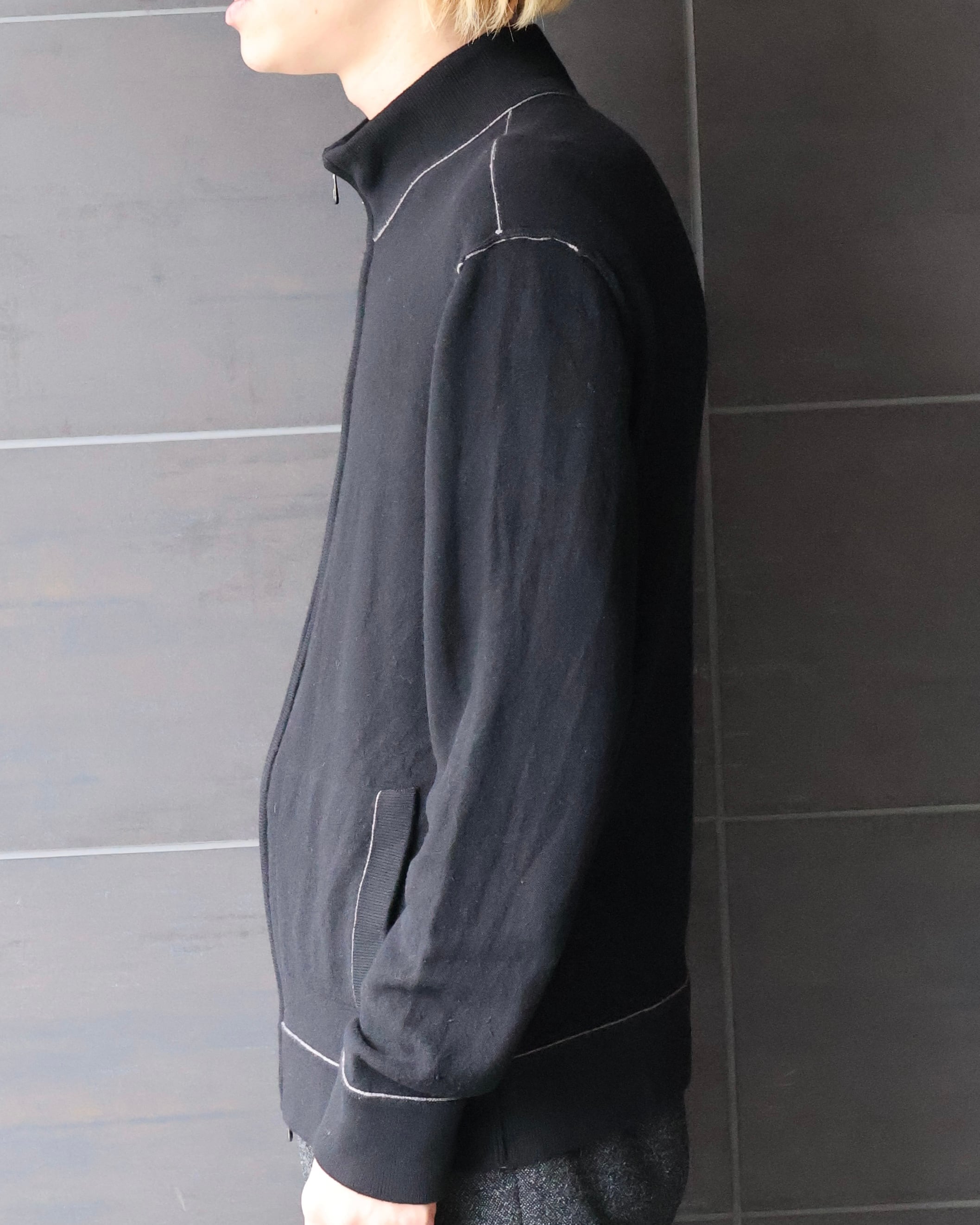 シンプルなボディに白いパイピングデザインがアクセントとなっており、ただの黒ではない計算された黒へと昇華されている一枚で、シンプルだが、長年使えるようなシンプルかつ上質なトップスをお求めの方におすすめ。
