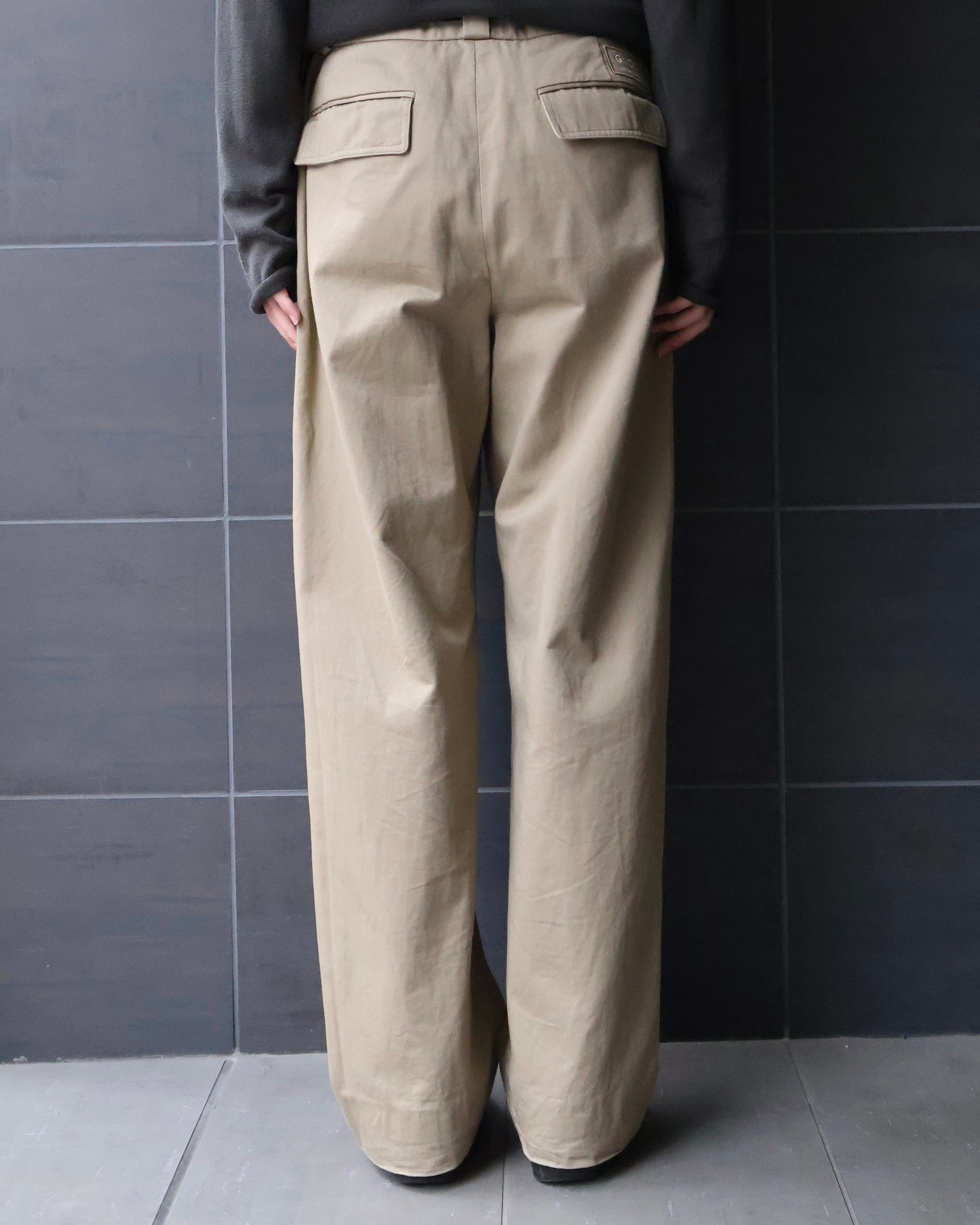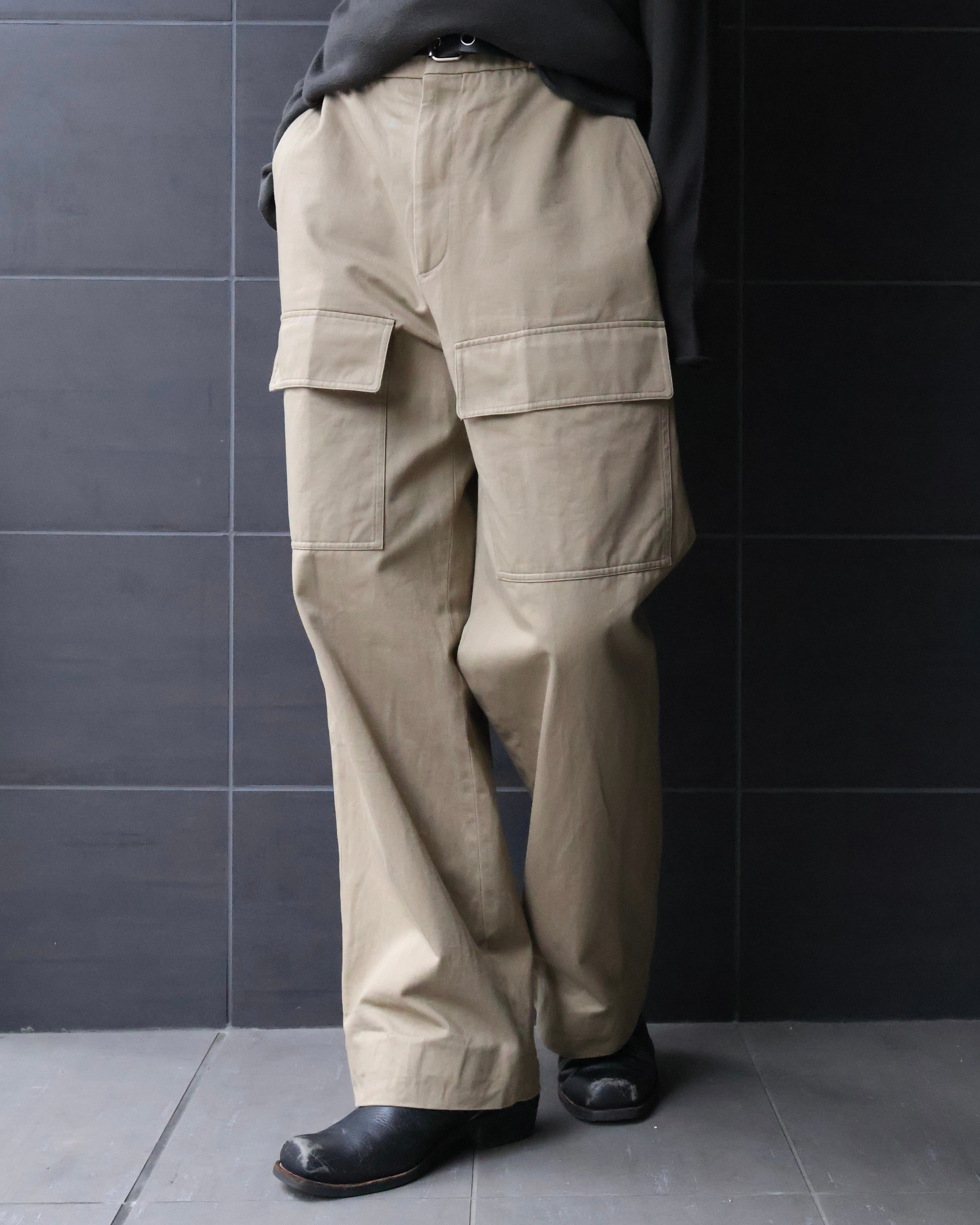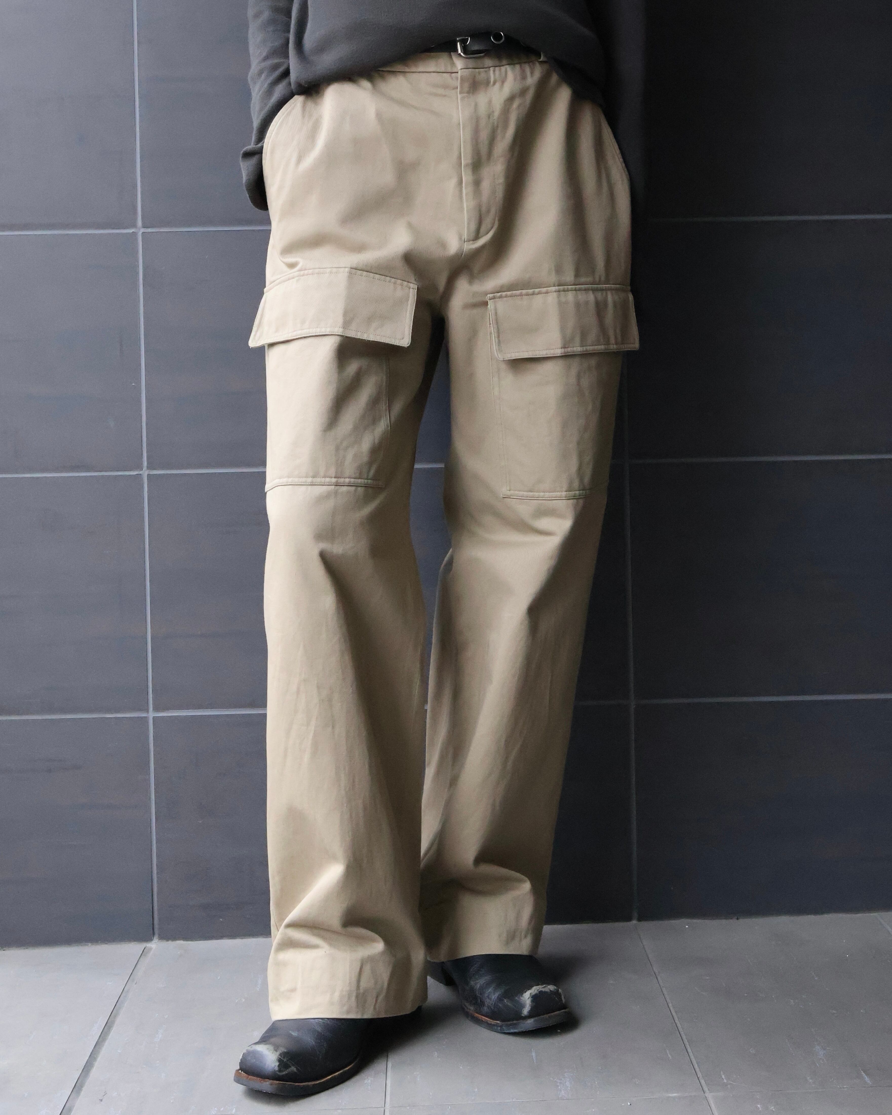 綺麗なシルエットのカーゴディテールパンツ。本来混じり合わない、ラグジュアリーとアメカジがうまくミックスされた逆位置のテイストだからこその化学反応が生まれている一本。シルエットの良さが、ハイエンドなパンツたらしめており、チープに見えない作り込みがされていて、カジュアルな合わせをしたとしても、野暮ったくなりすぎないバランスが美しい、コーディネートしないのあるアイテム。