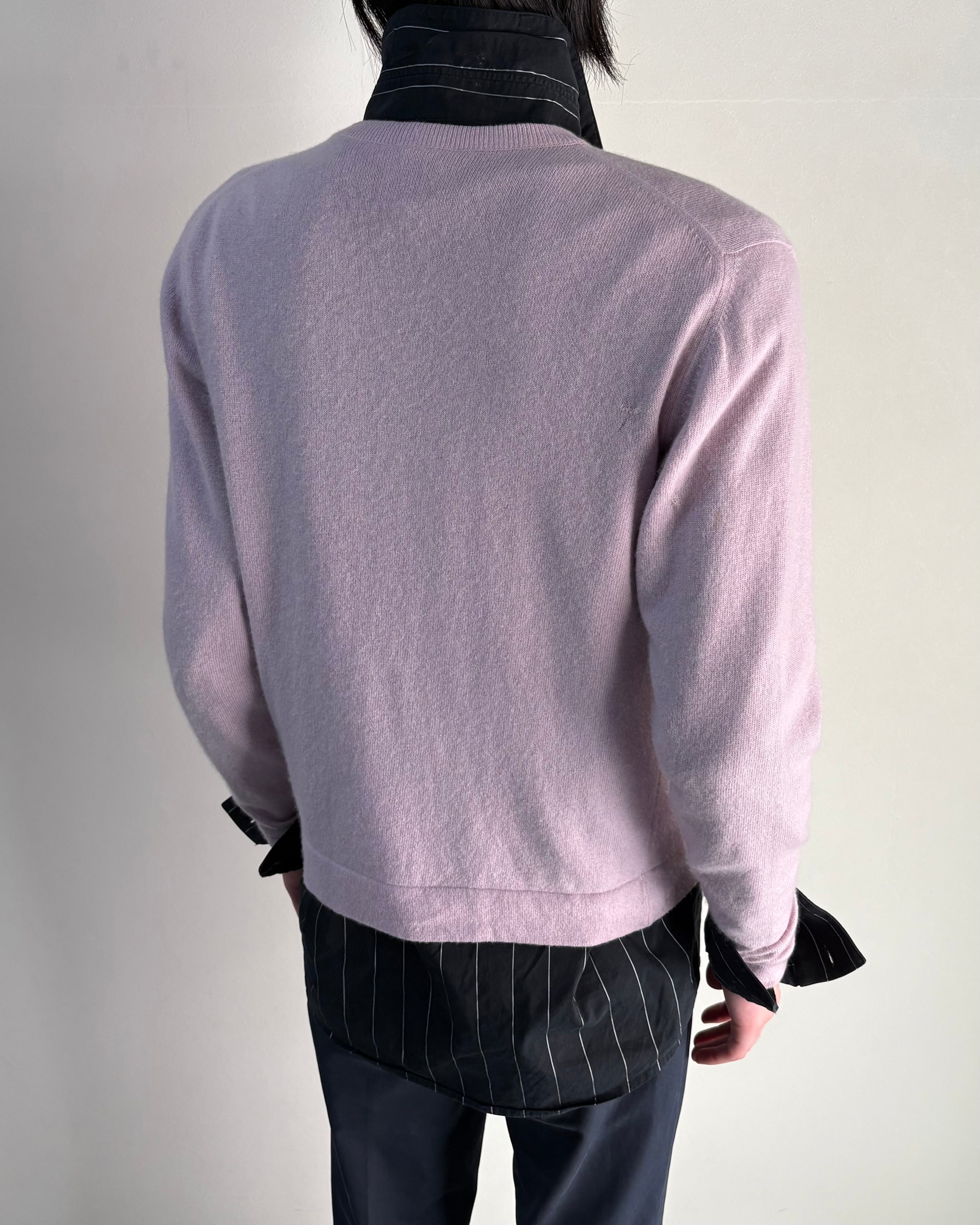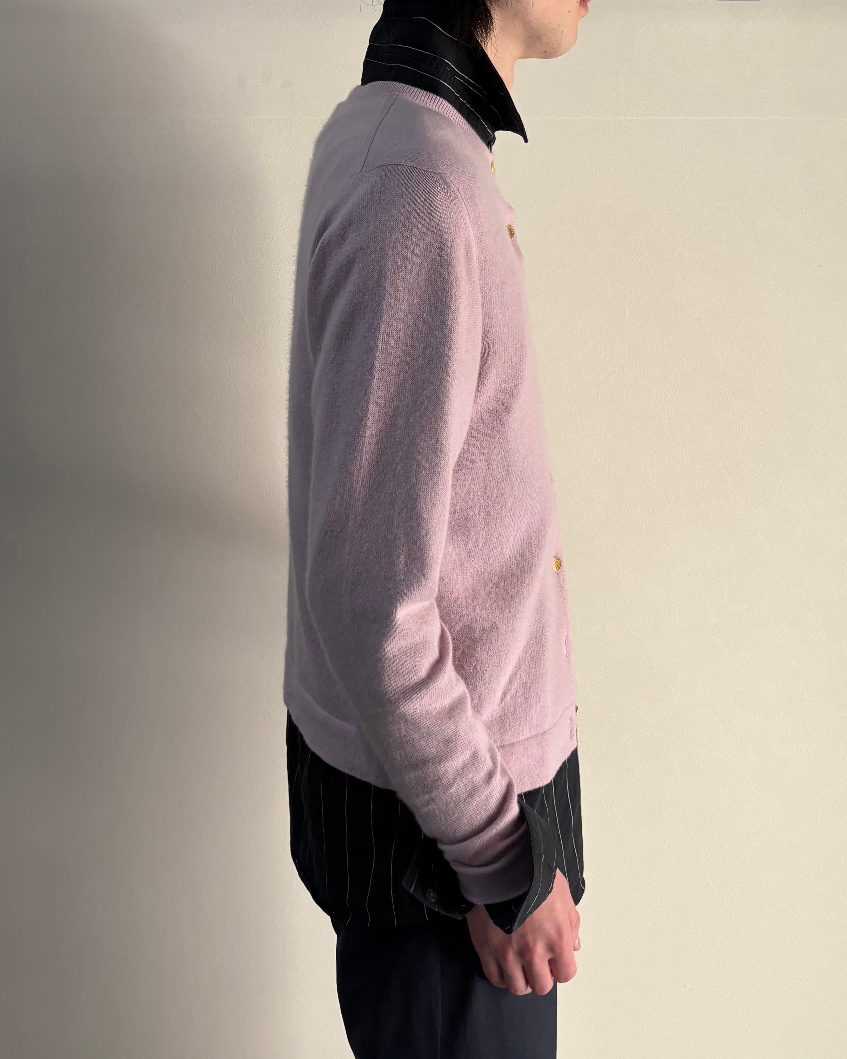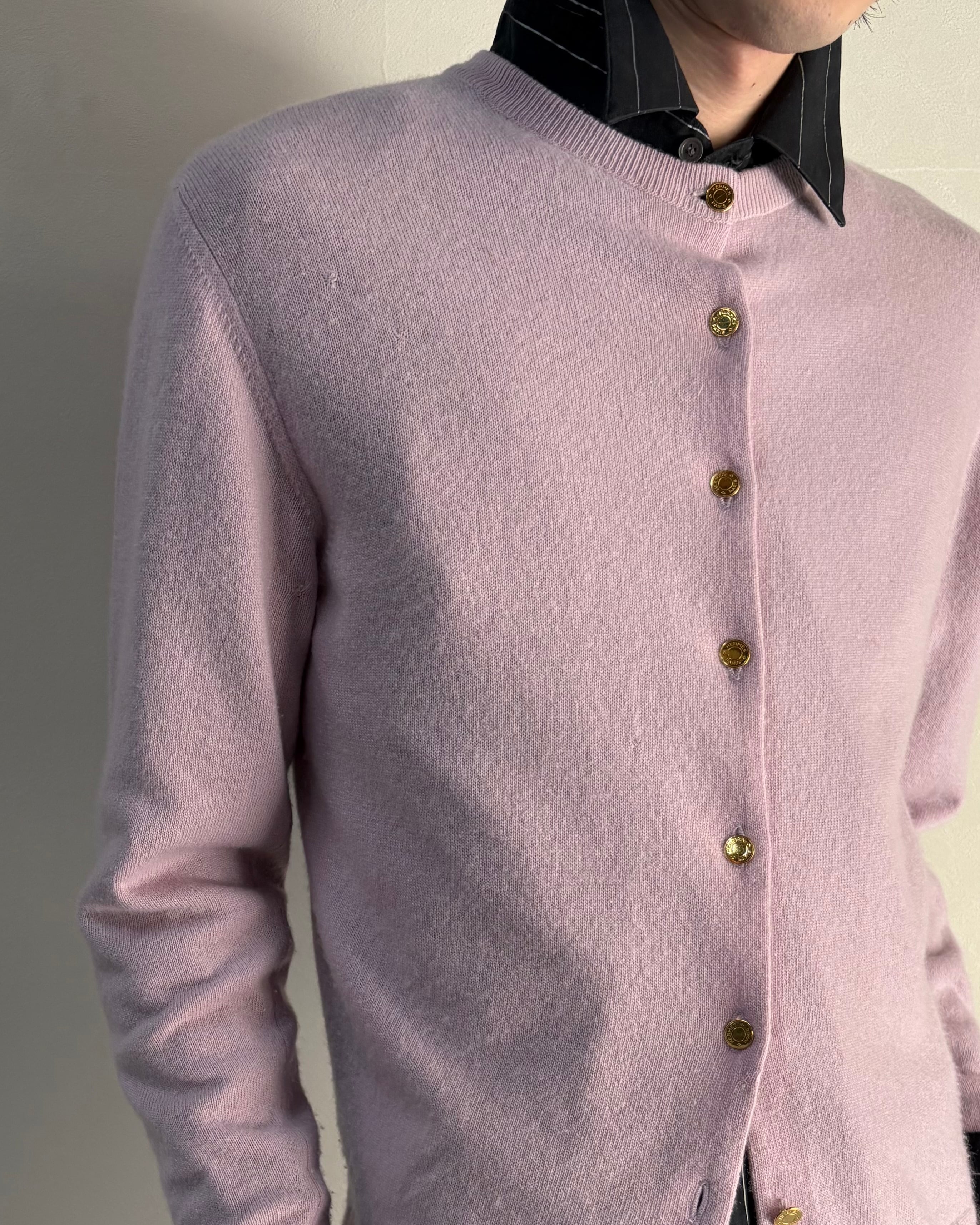 HERMESのピュアカシミアカーディガン。パステルカラーが採用されていながら金ボタンでラグジュアリーさは残しつつ、いい具合にポップ、リゾート感の残る仕立てになっている。インナーにシャツをレイヤードしたり、前開けでサラッと1枚で羽織る感じのスタイリングが映える1着。