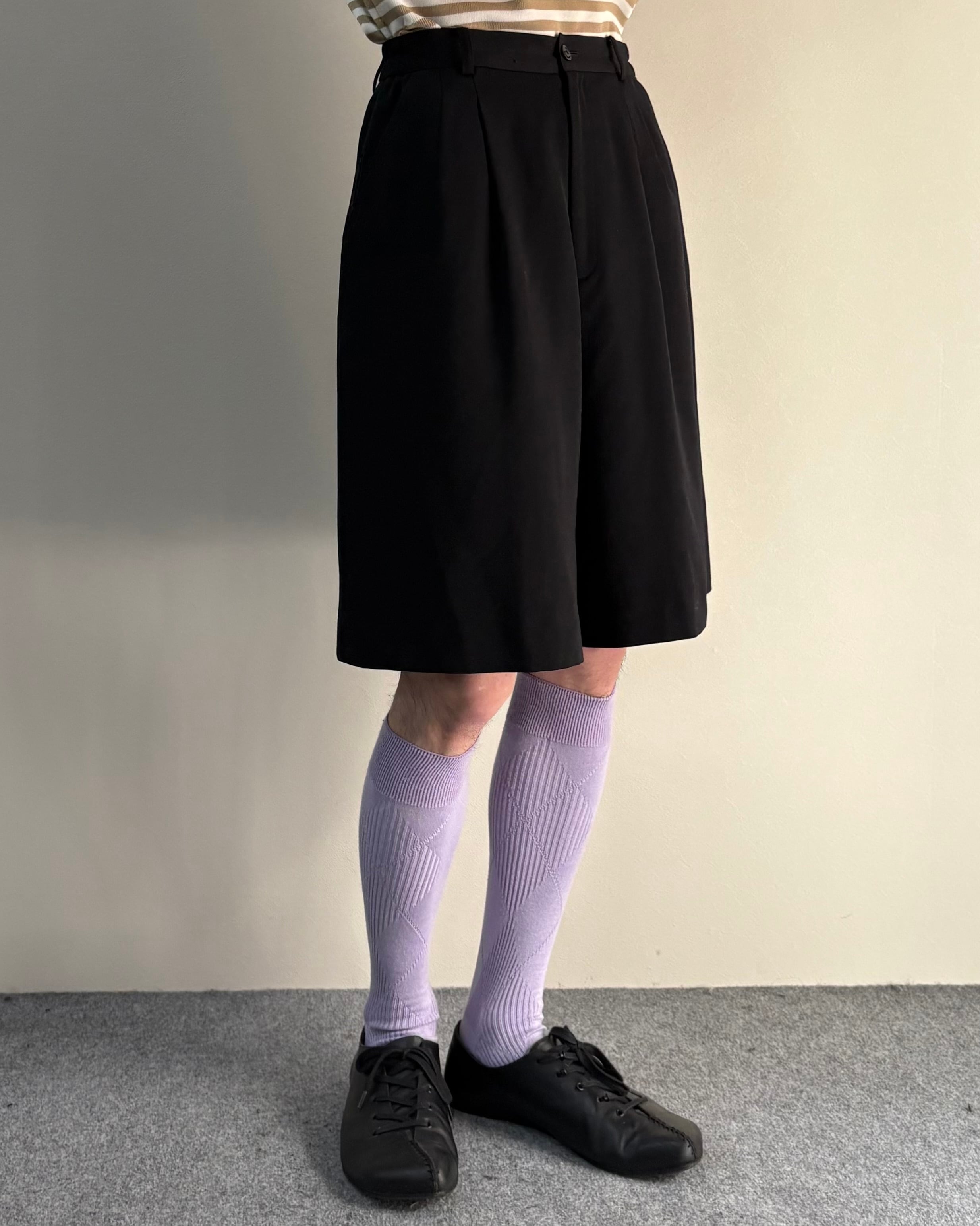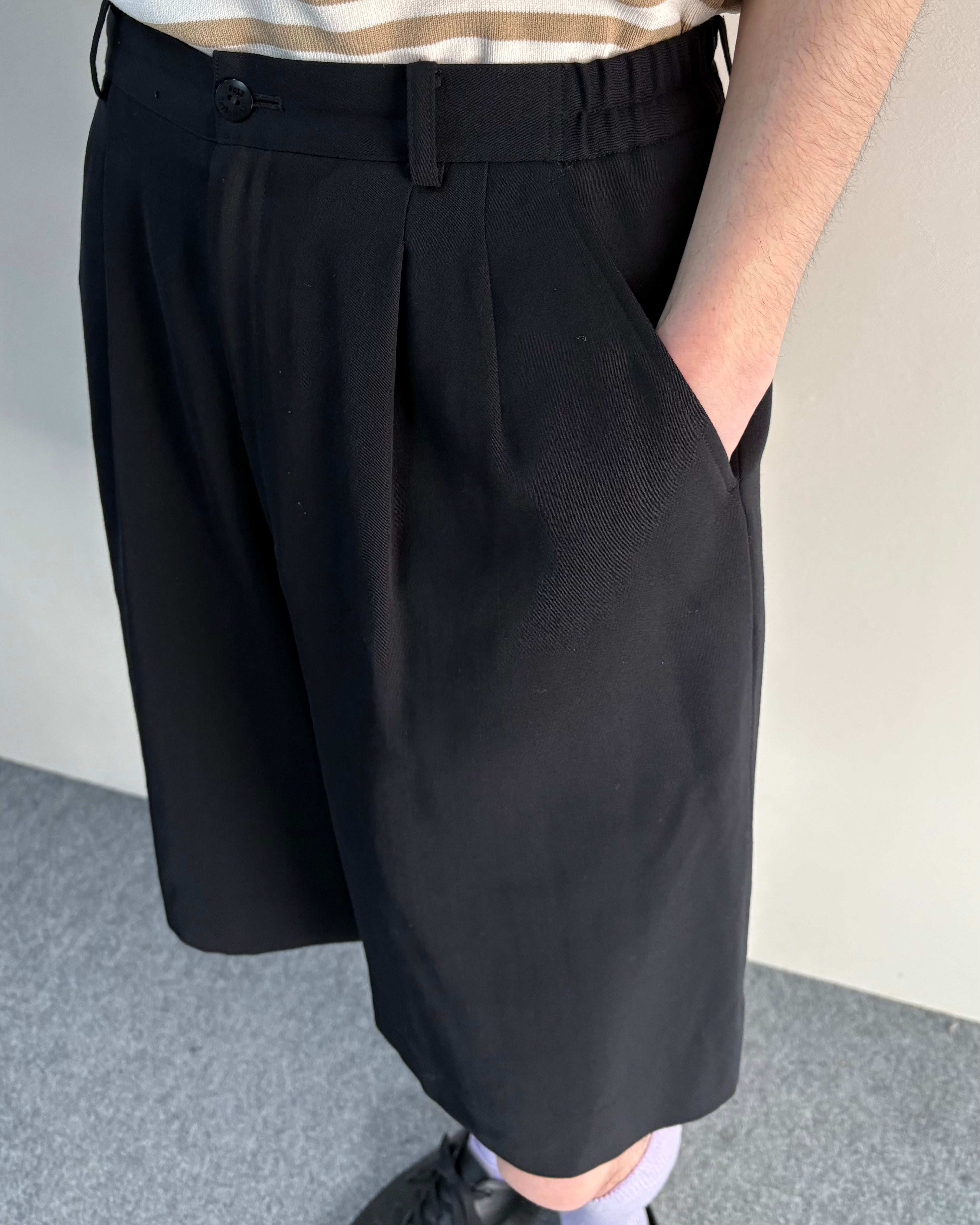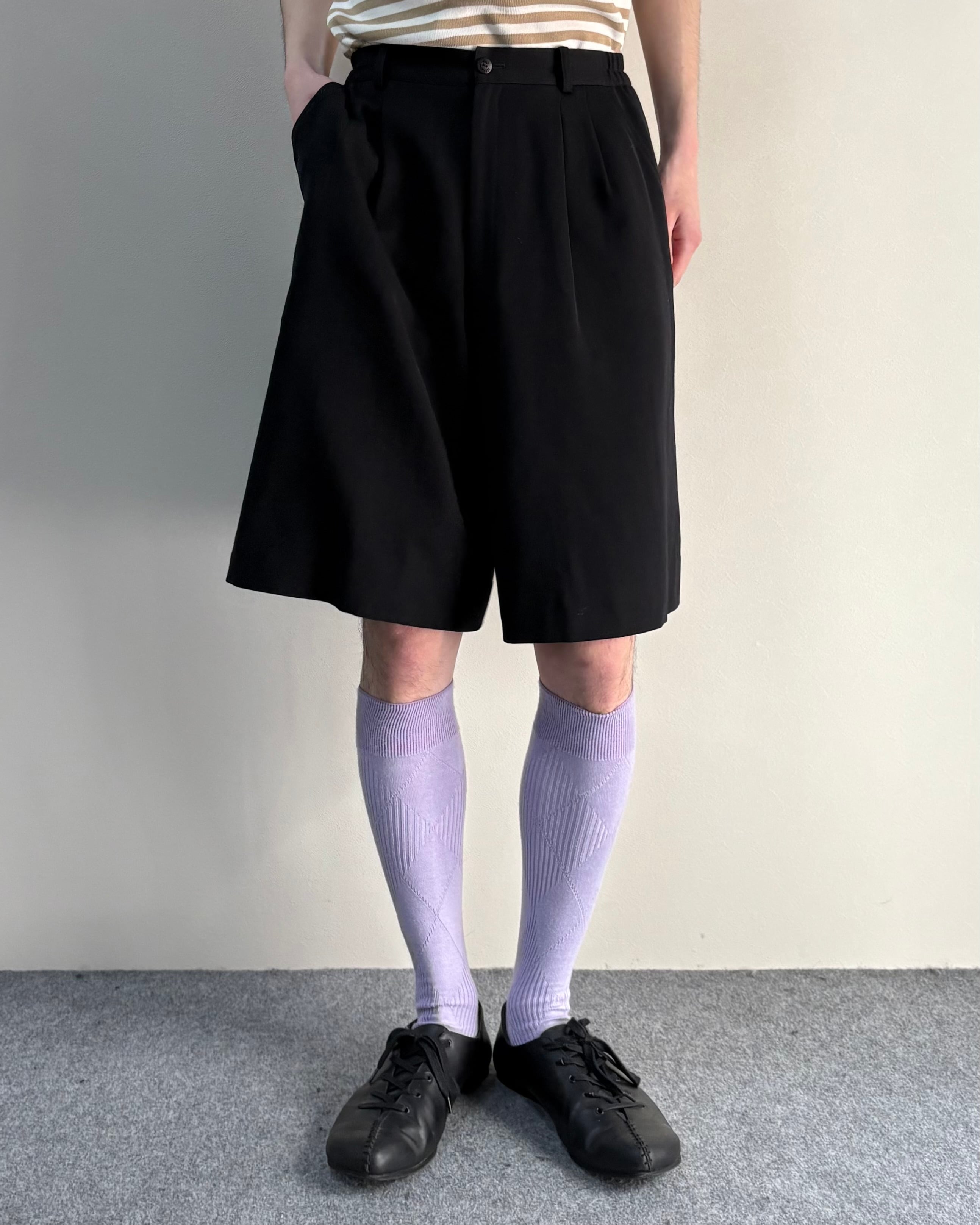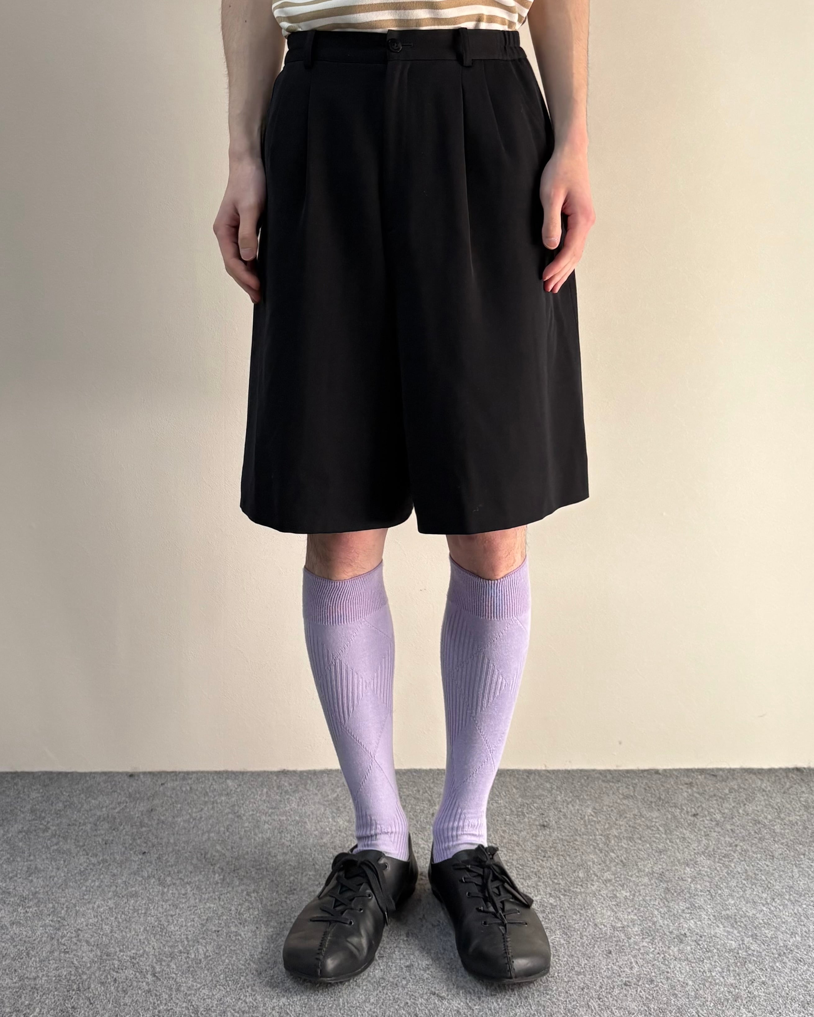 フロントに施された2タック仕様により程よくゆとりのある立体的なシルエットが特徴的な一着。膝丈に近いクラシックなバランスで、ブランドらしい上品さのあるショーツ。無駄を削ぎ落としたデザインで、シャツやジャケットとの相性も良く、モードスタイルからクラシックスタイルまで幅広く対応可能。