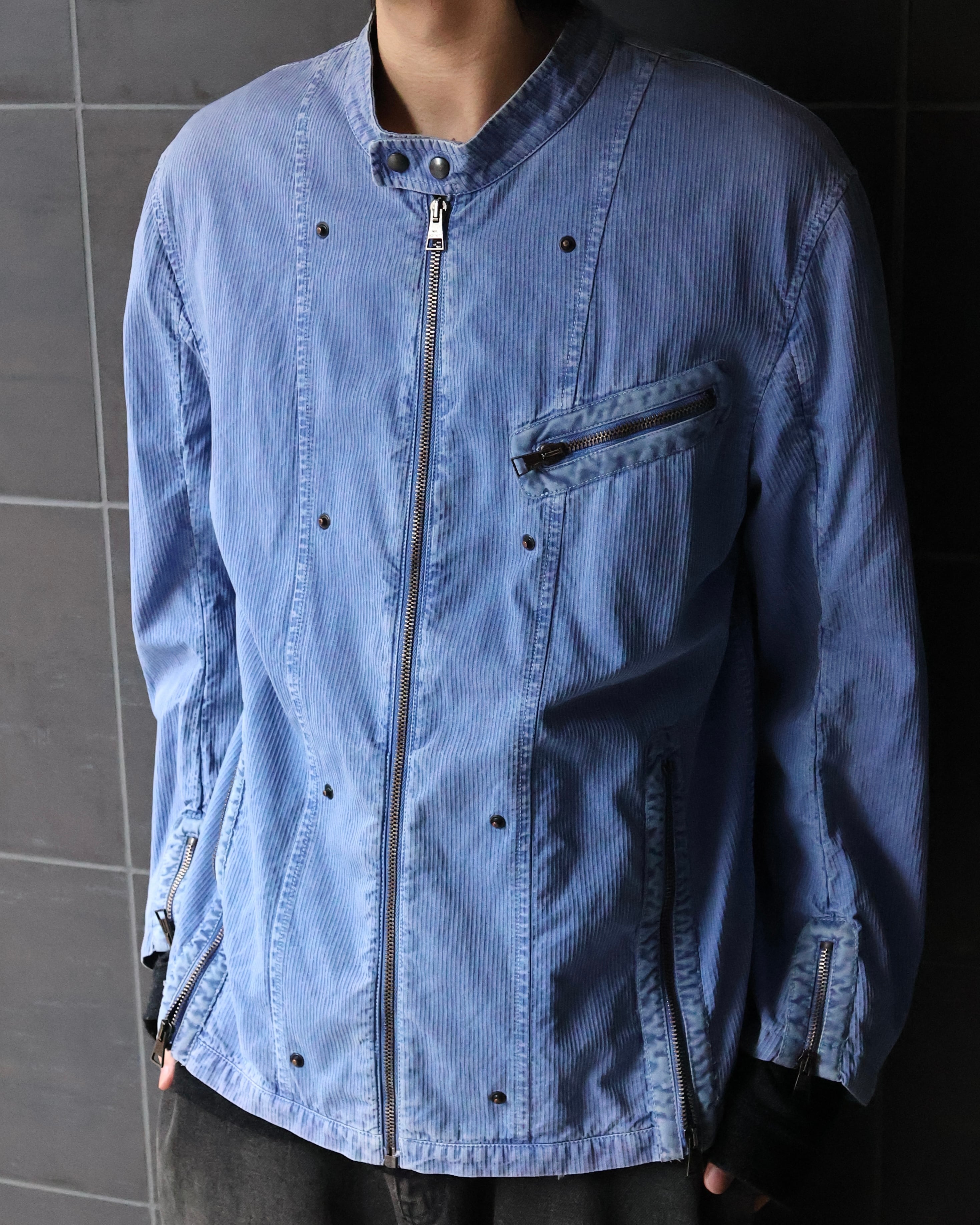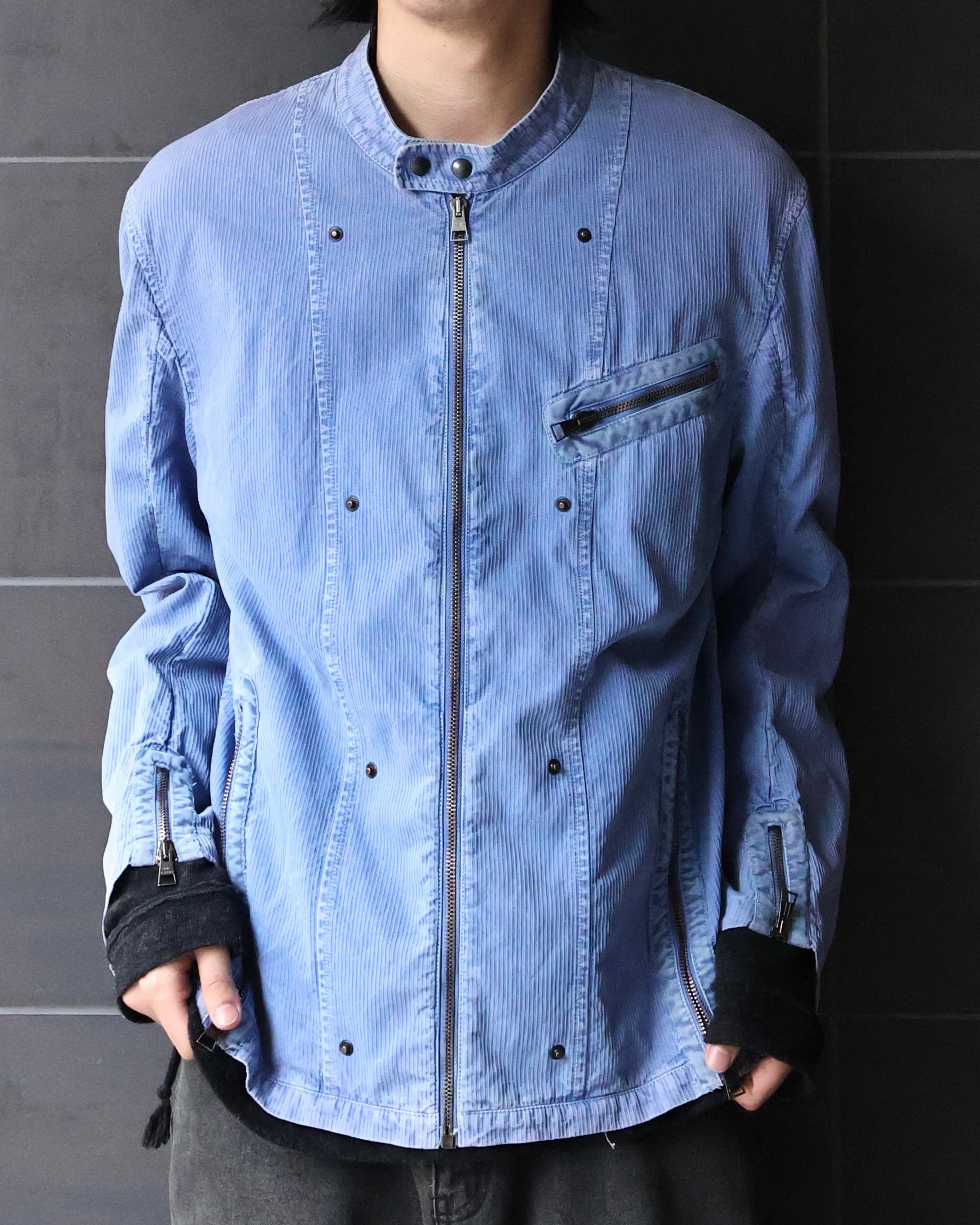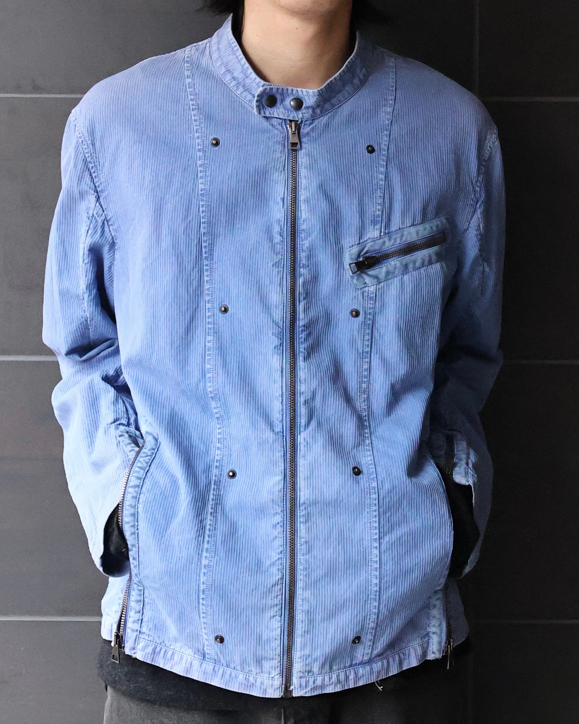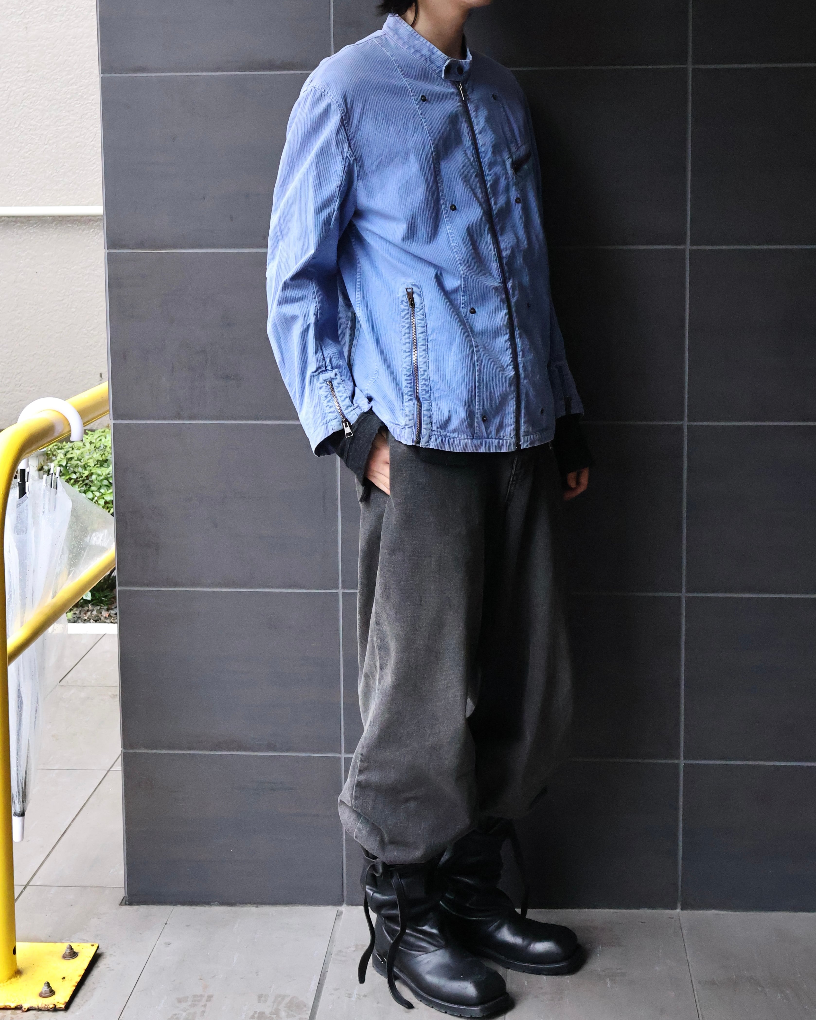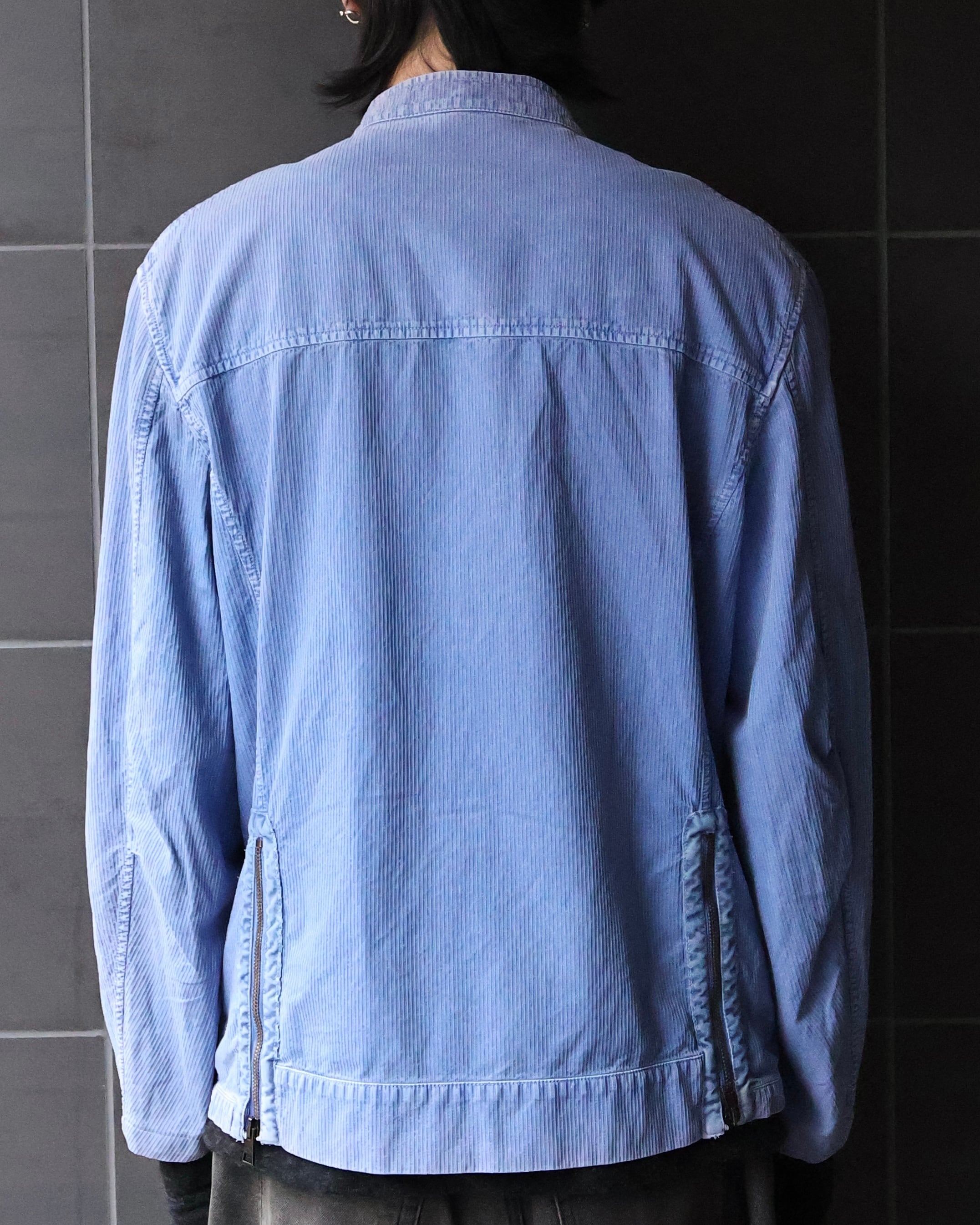 ライトブルーの発色が印象的なジップアップジャケット。ワークウェア由来のディテールをベースにしながら、ややコンパクトに整えられたネック周りと、直線的に走るジップ配置が、全体に都会的な緊張感を与える。胸元とサイドに配されたジップポケットは機能性だけでなく、視覚的なアクセントとしても機能。洗いのかかった生地は適度なムラを生み、クリーンな色味に奥行きを加えている。単調になりがちなブルーを、着れる表情にし、リアルクローズとしても活用できるような、ワークテイストに落とし込んだ汎用性の高い一枚。