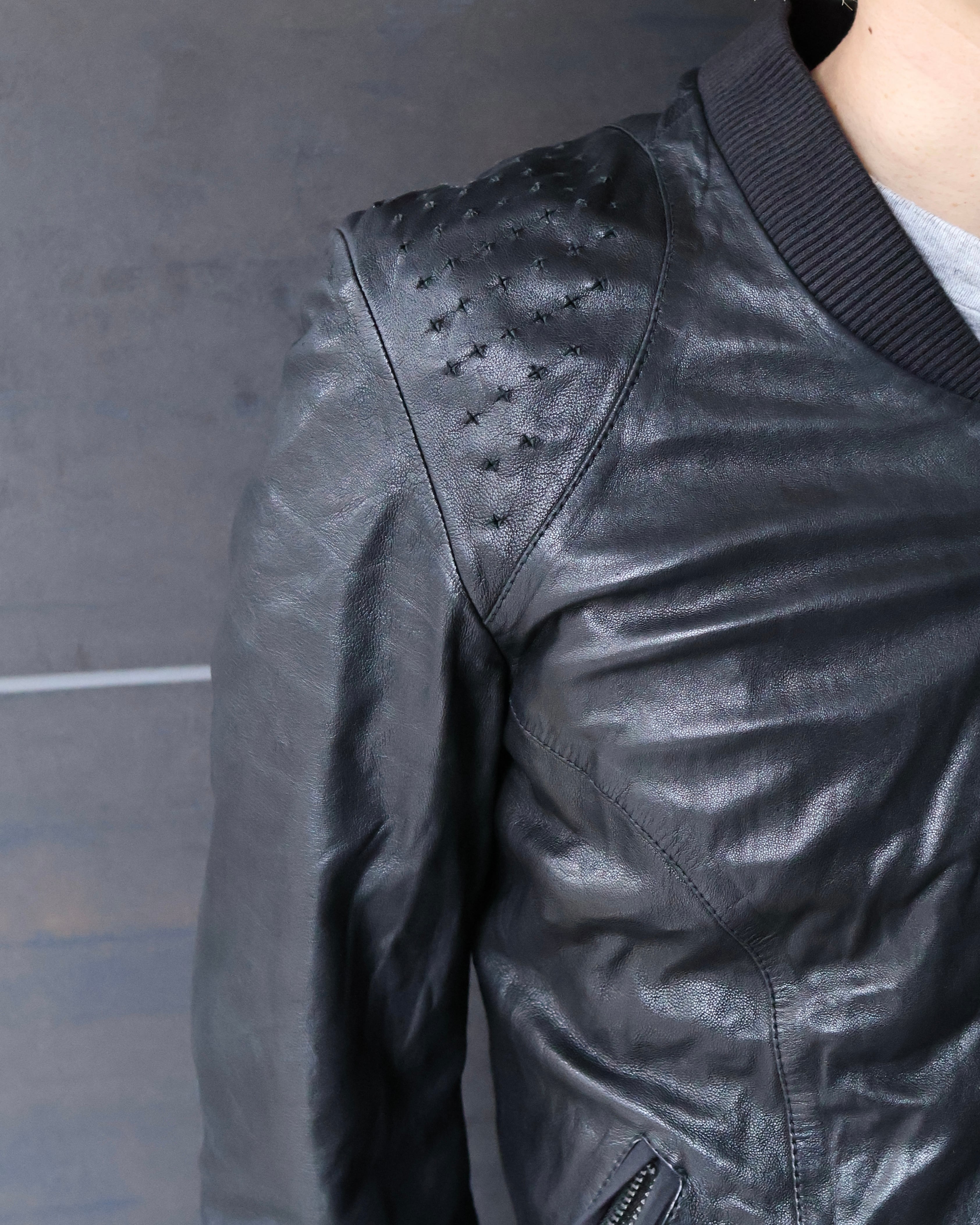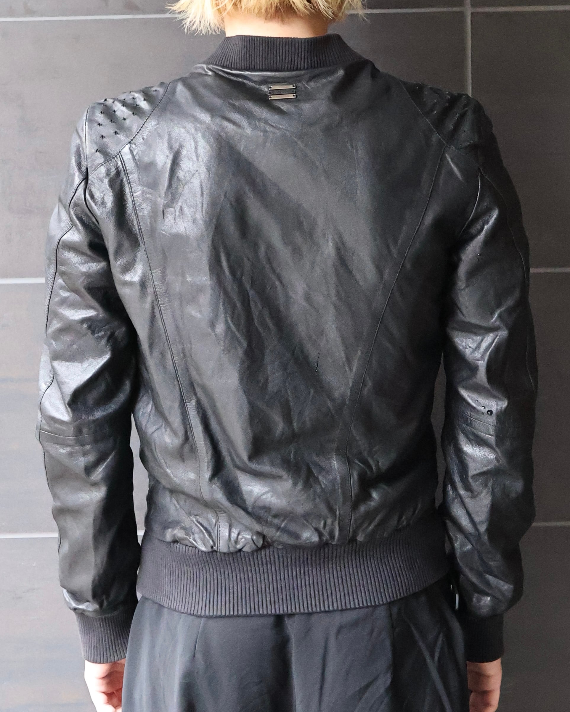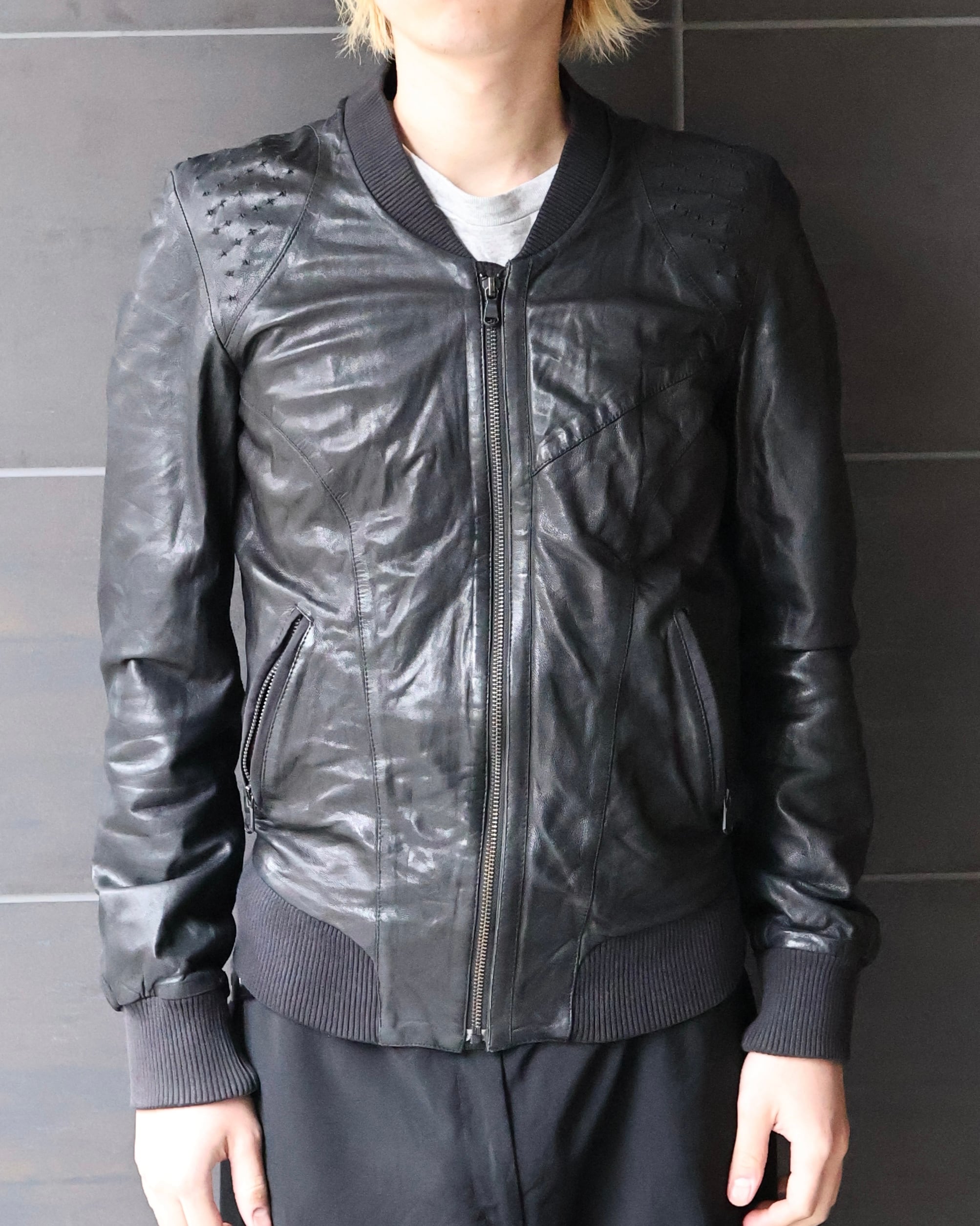 身体に沿うシャープなシルエットが際立つレザージャケット。肩周りに施された細かなディテールが、単調になりがちなブラックに立体感を与え、ミニマルでありながらも強い存在感を演出。リブ仕様のネックと袖口により、ストリートとモードの中間に位置するバランスへと昇華されている。ハードに着用しても、スウェットパンツなどで着崩してもスタイルとして成立ような、説得力を持つアイテム。