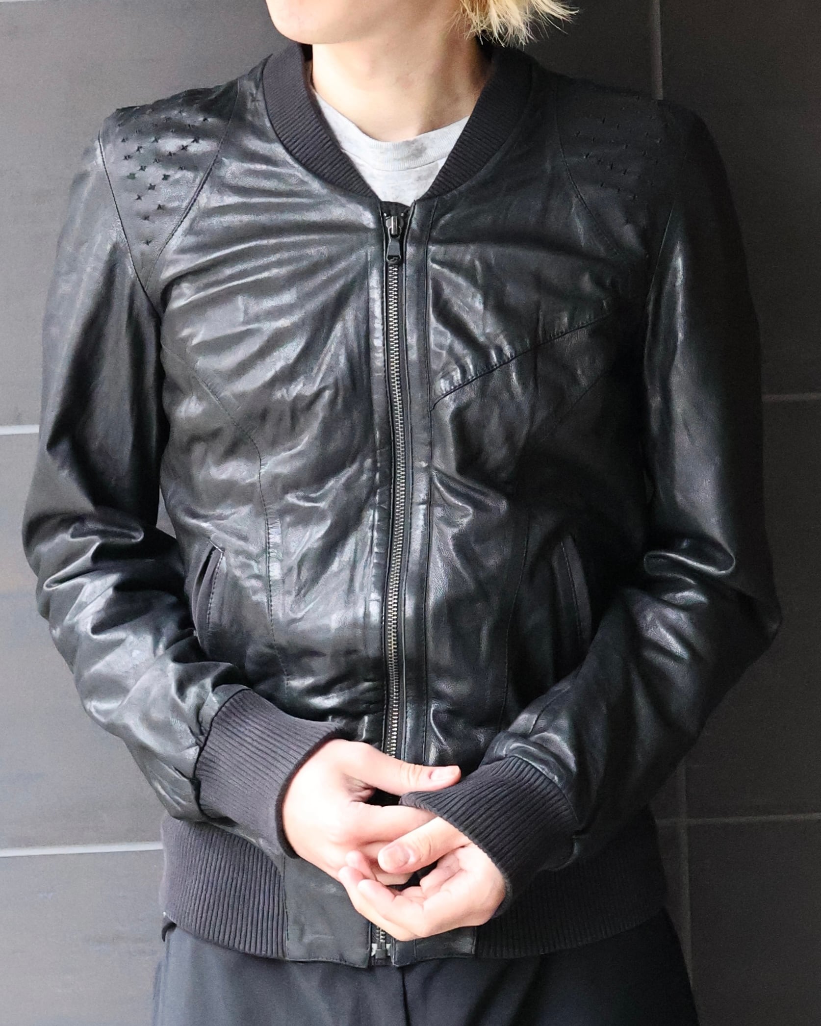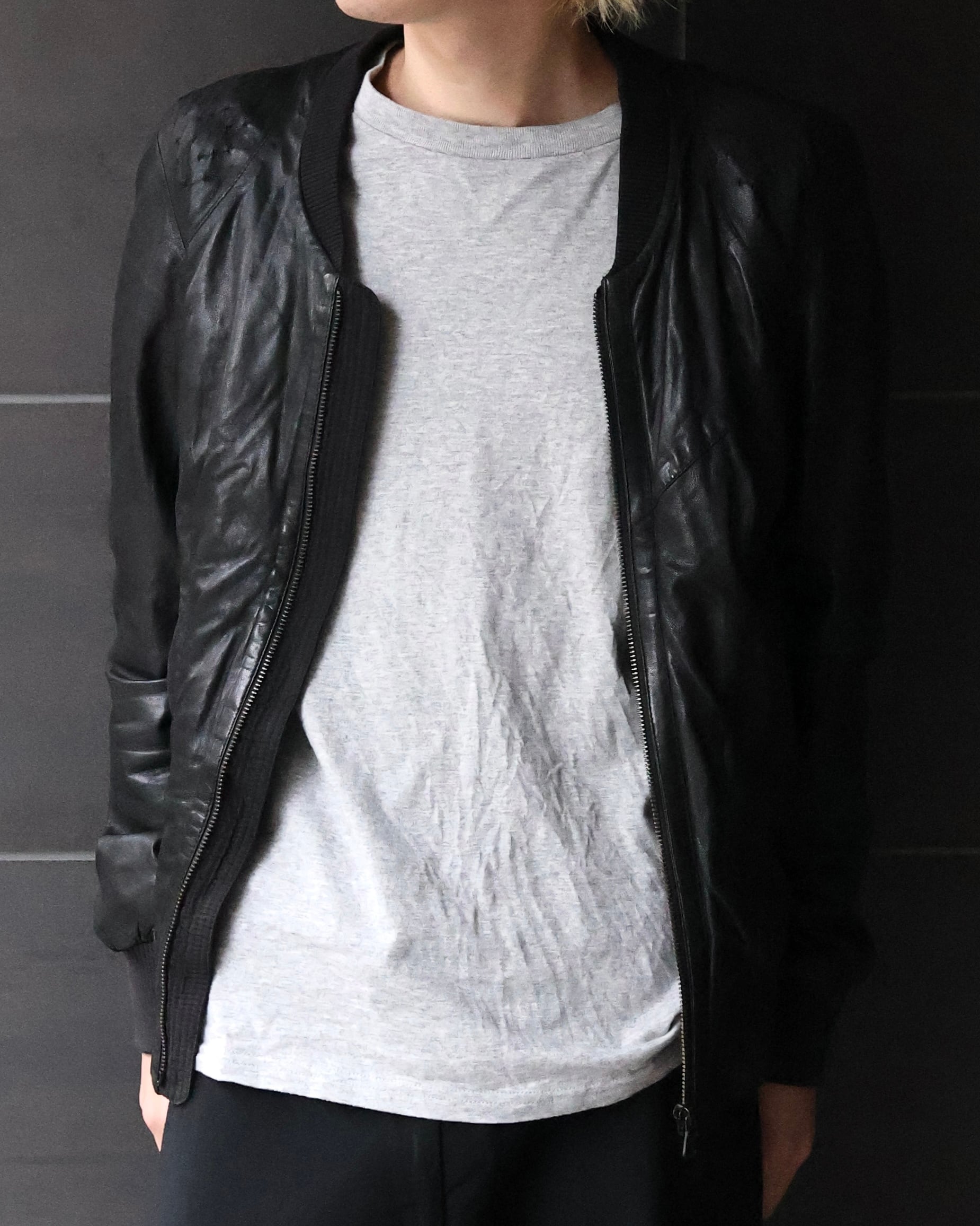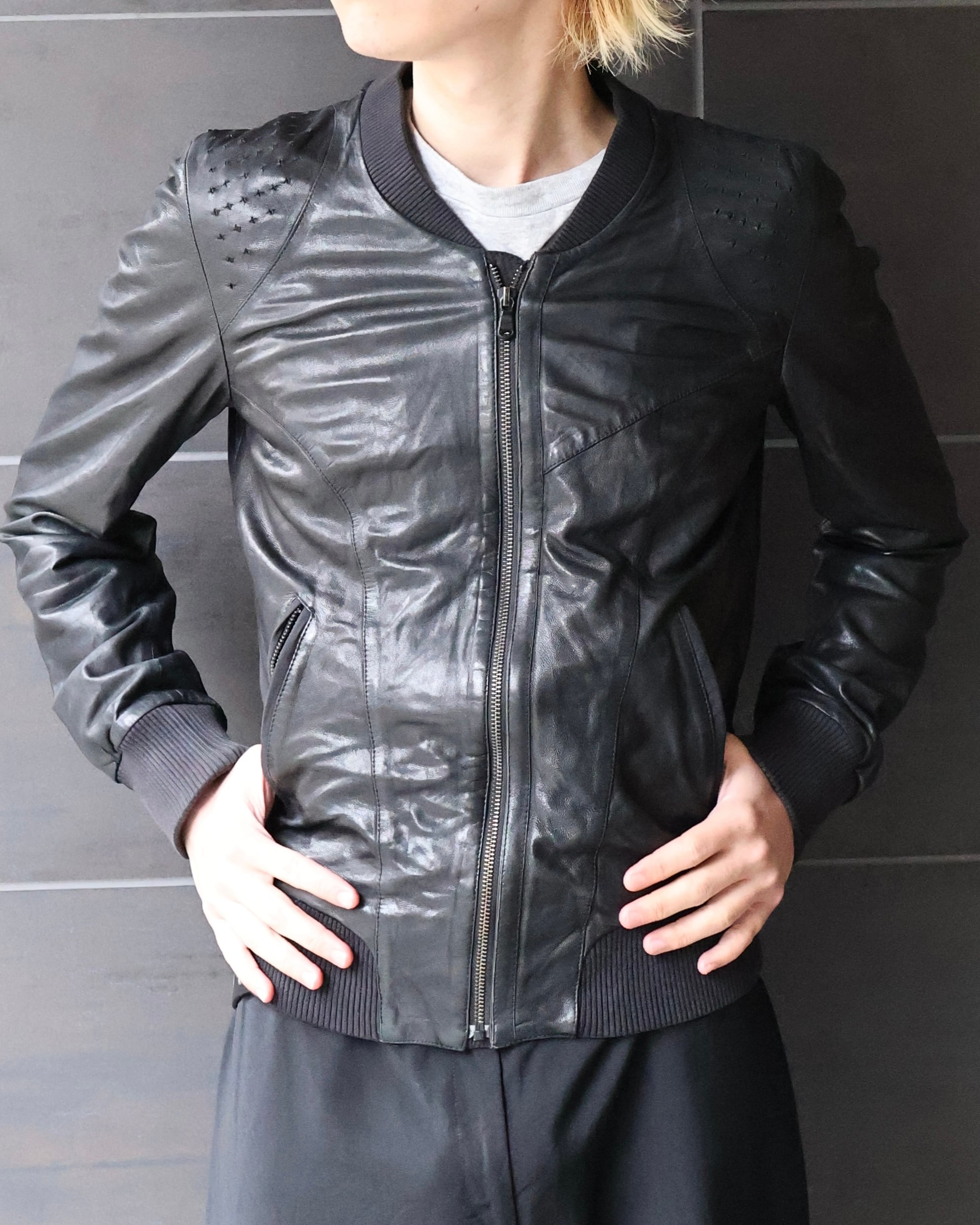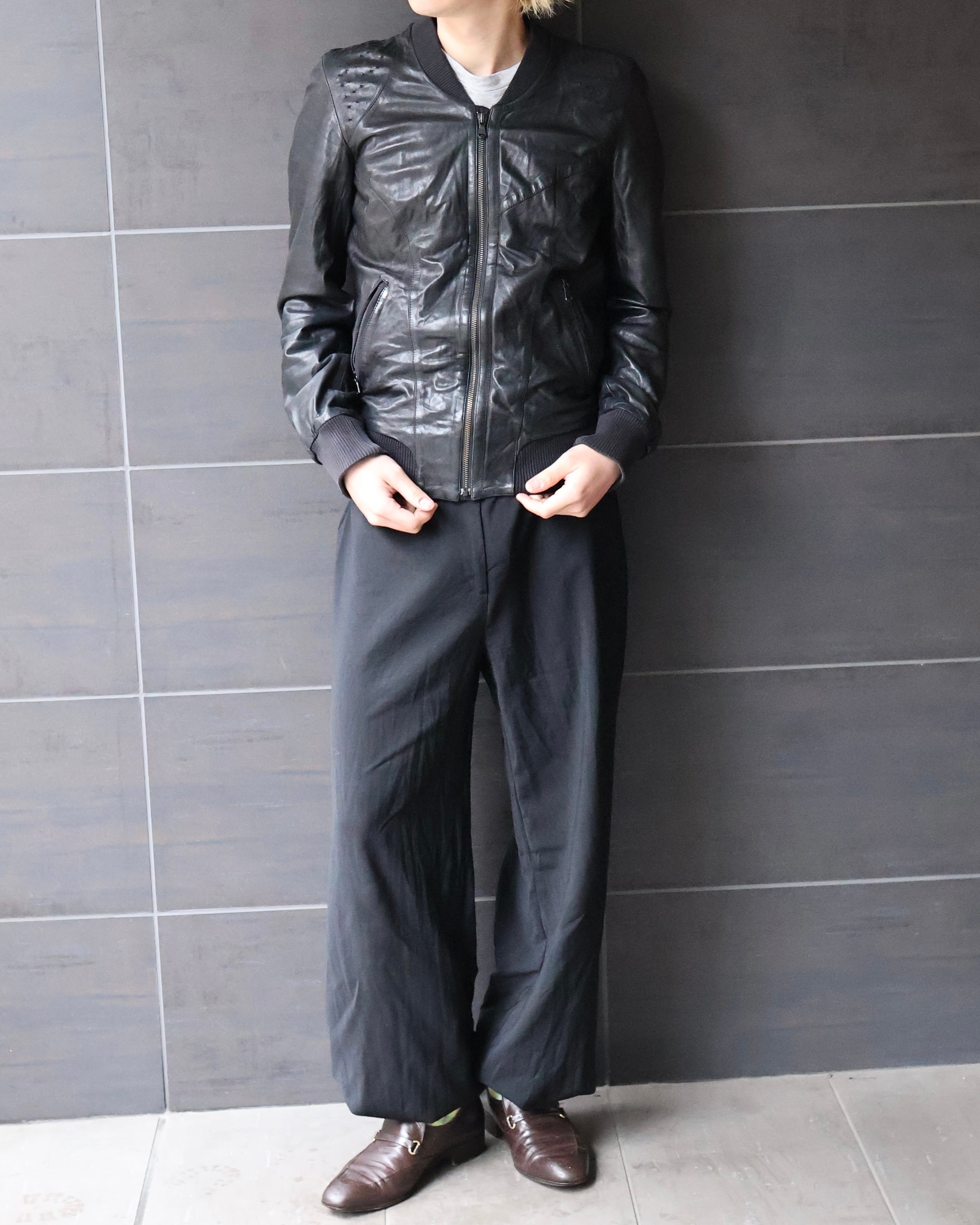 身体に沿うシャープなシルエットが際立つレザージャケット。肩周りに施された細かなディテールが、単調になりがちなブラックに立体感を与え、ミニマルでありながらも強い存在感を演出。リブ仕様のネックと袖口により、ストリートとモードの中間に位置するバランスへと昇華されている。ハードに着用しても、スウェットパンツなどで着崩してもスタイルとして成立ような、説得力を持つアイテム。