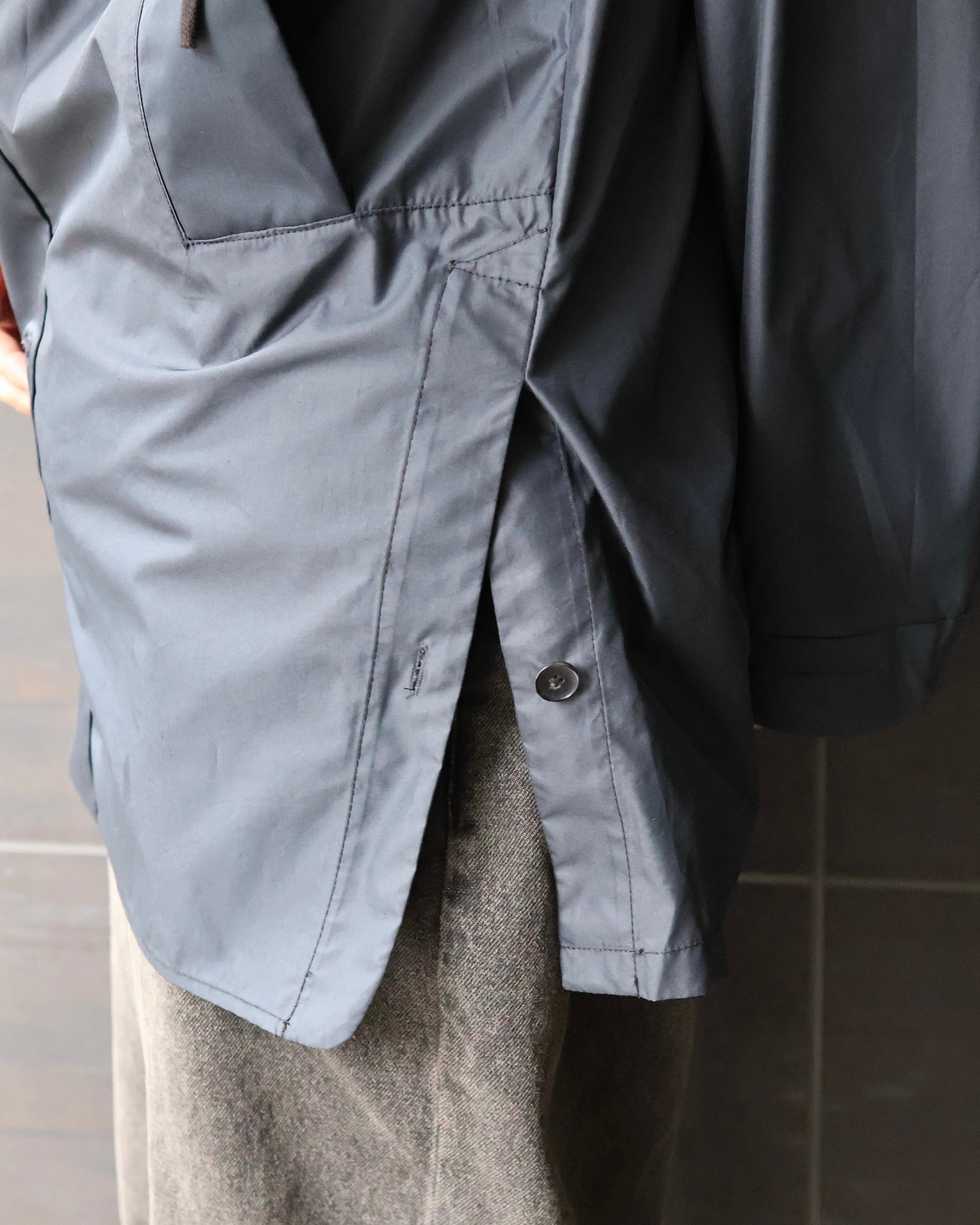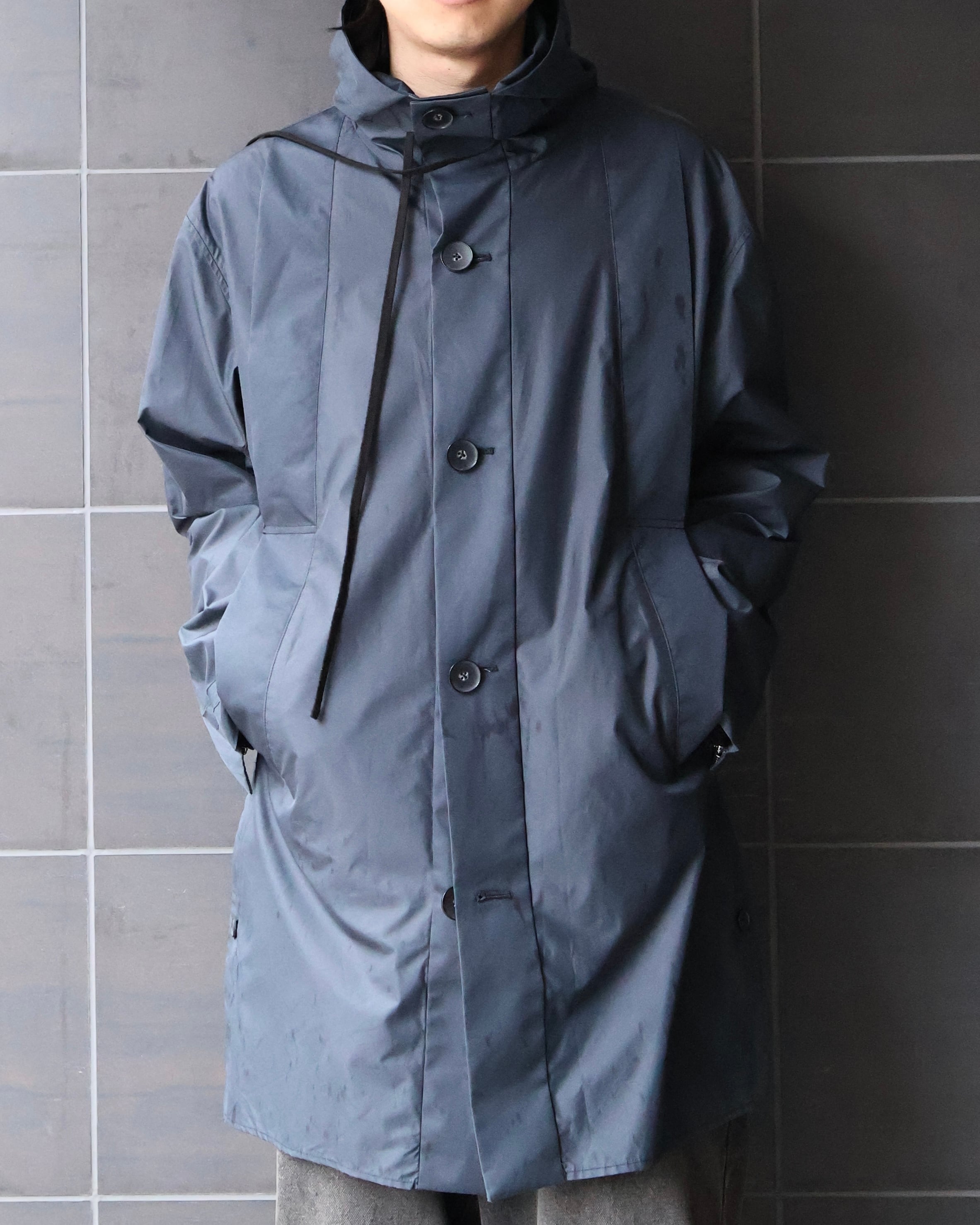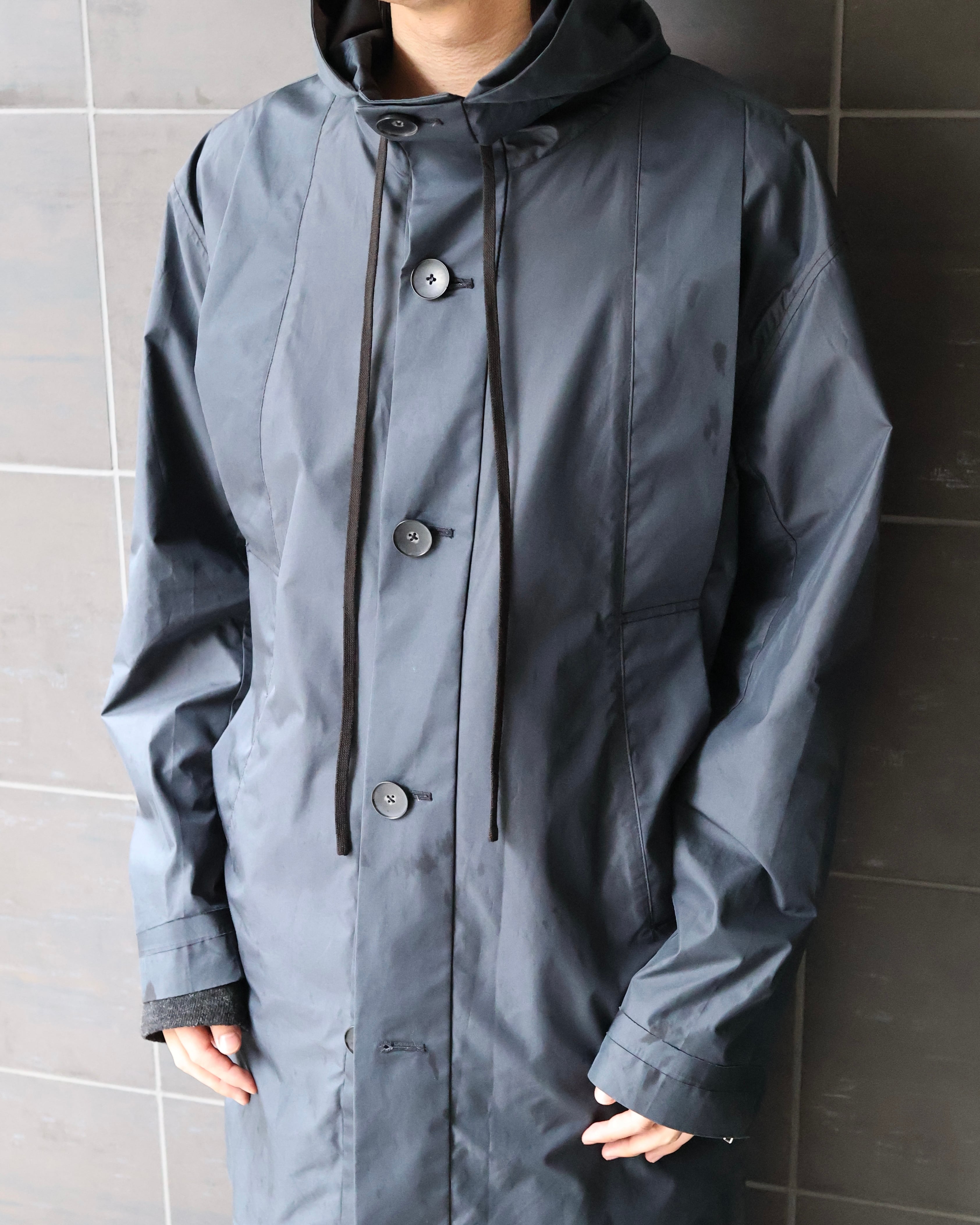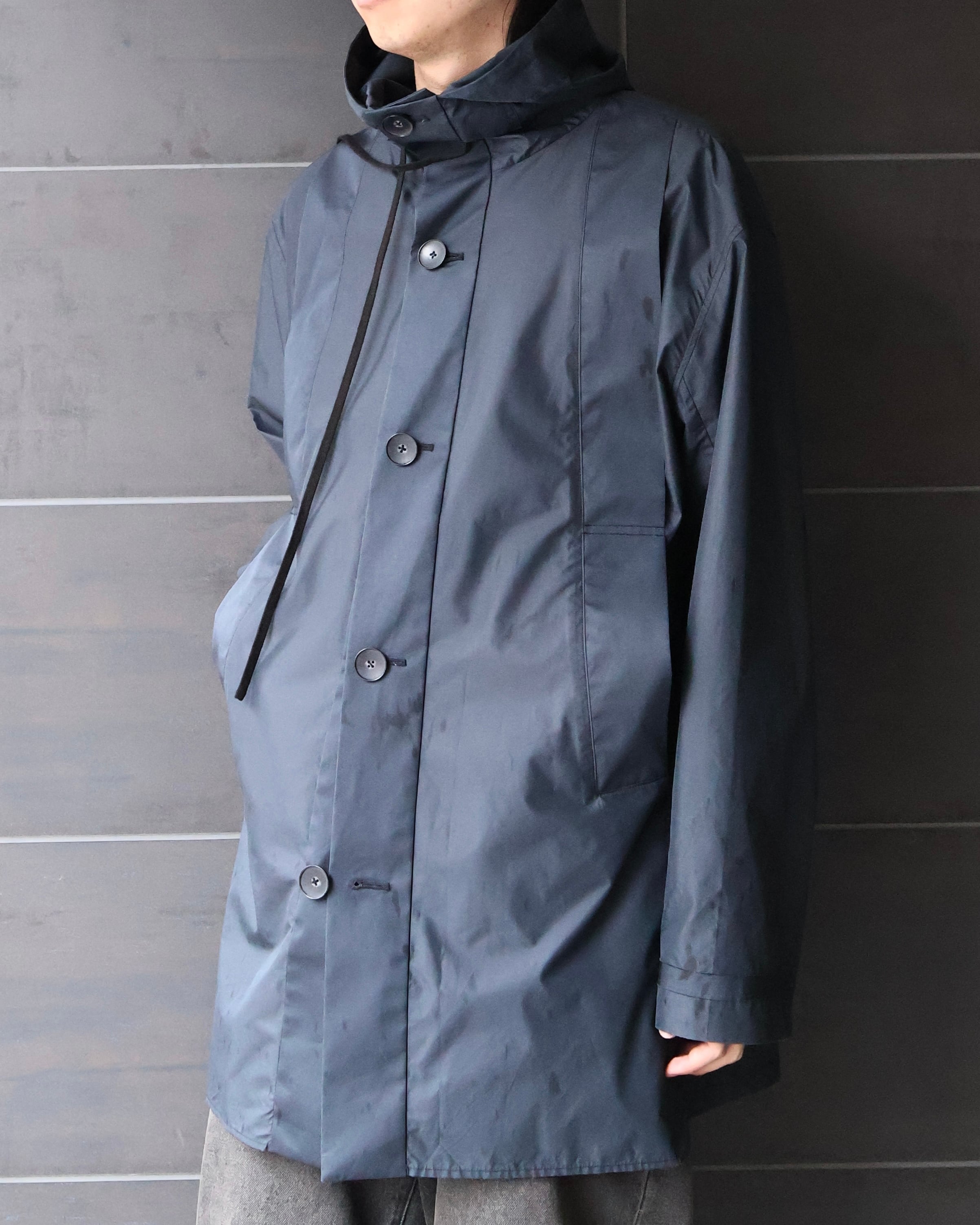 コーティングコットンのような光沢のあるコットンで作られた、ブランドらしい遊び心のある1着。ビジュアルのモード感とは裏腹に、サイドのスリットや、色味などファッションに落とし込みやすいカジュアルダウンされたディテールが、様々なコーディネートに昇華しやすいような意図を感じる一枚。ハリ感のある素材感と、フードやヨークなど機能的な側面を持つディテールは、スポーティに合わせてもモードに合わせても対応できるような、万能さも併せ持つアイテム。