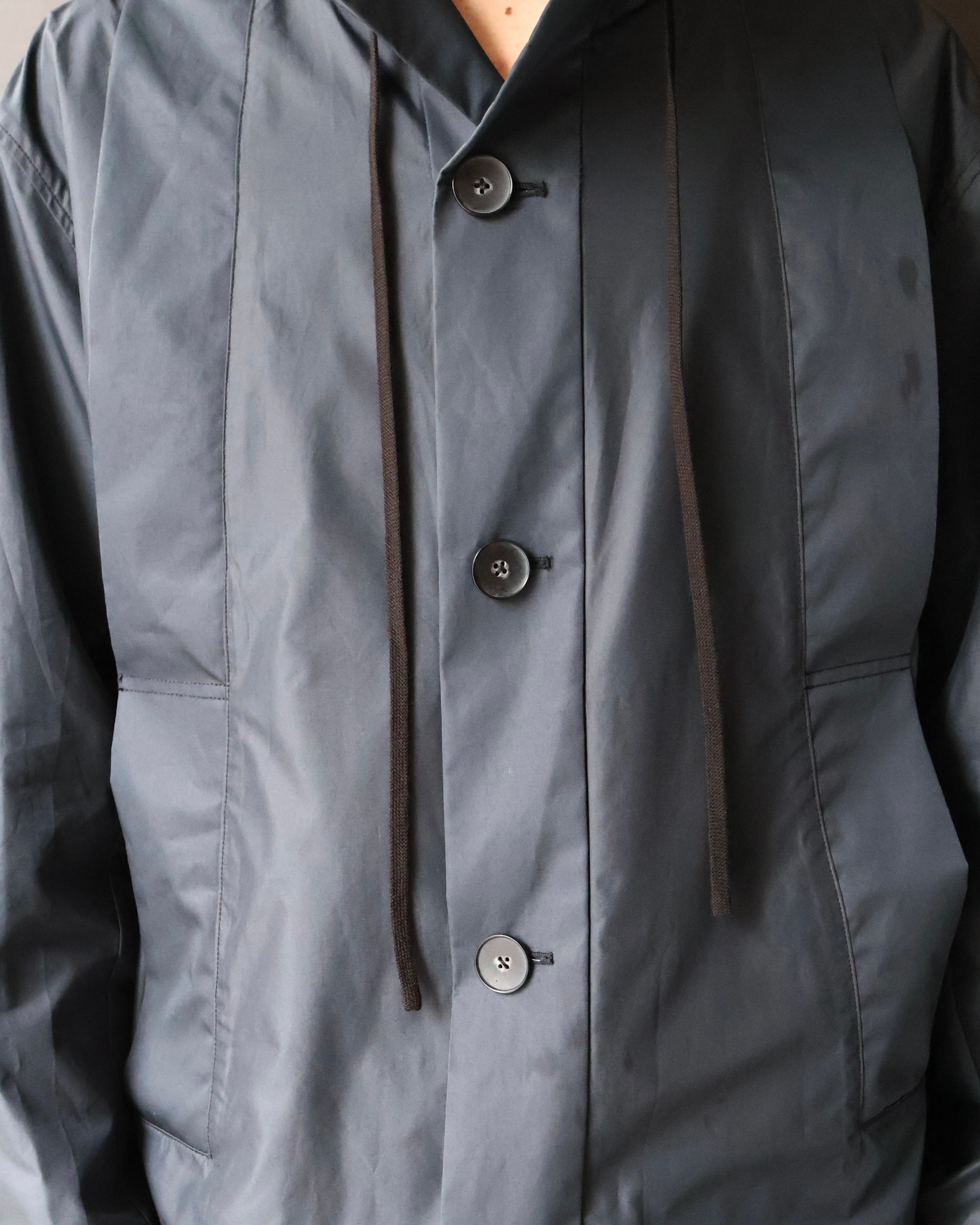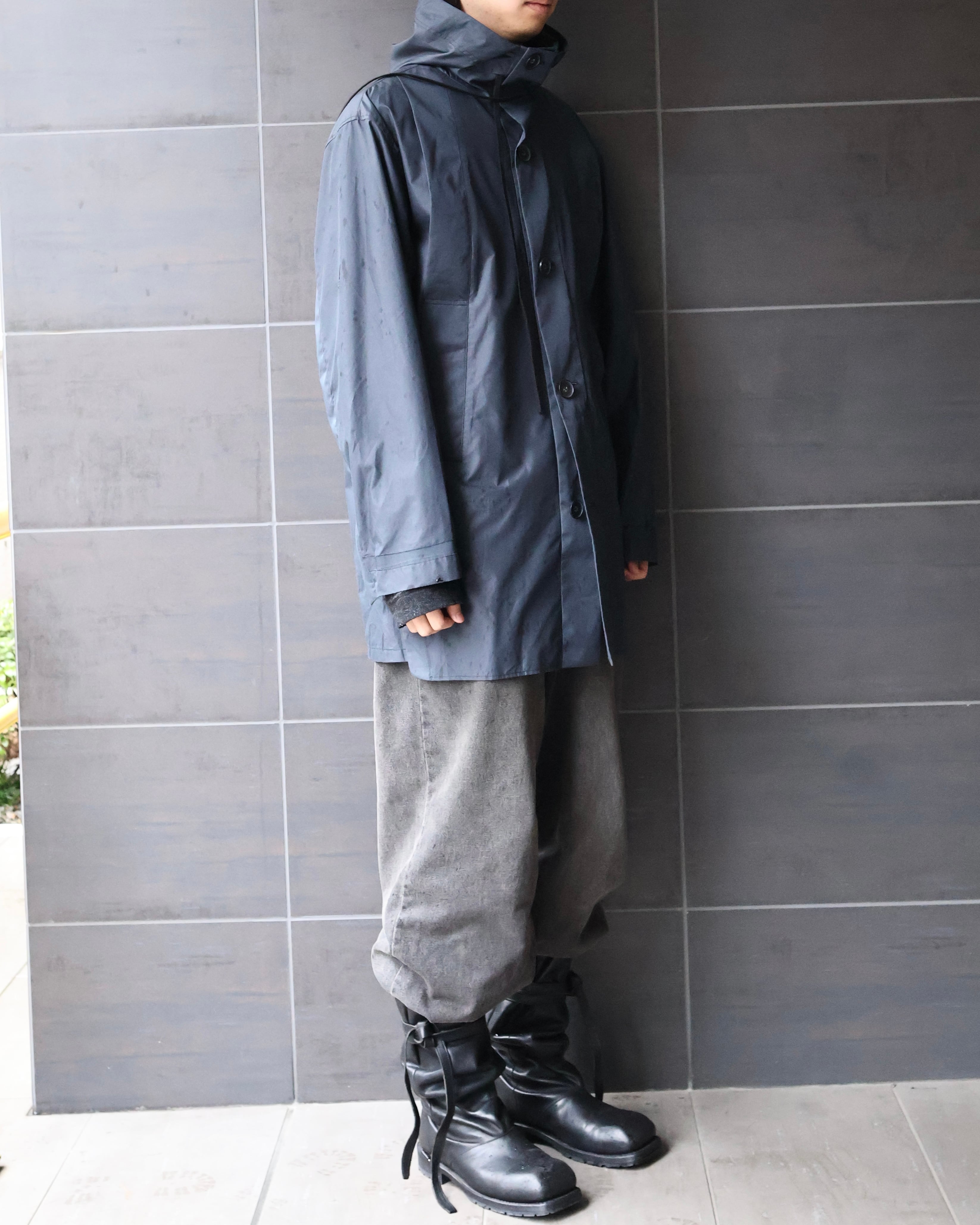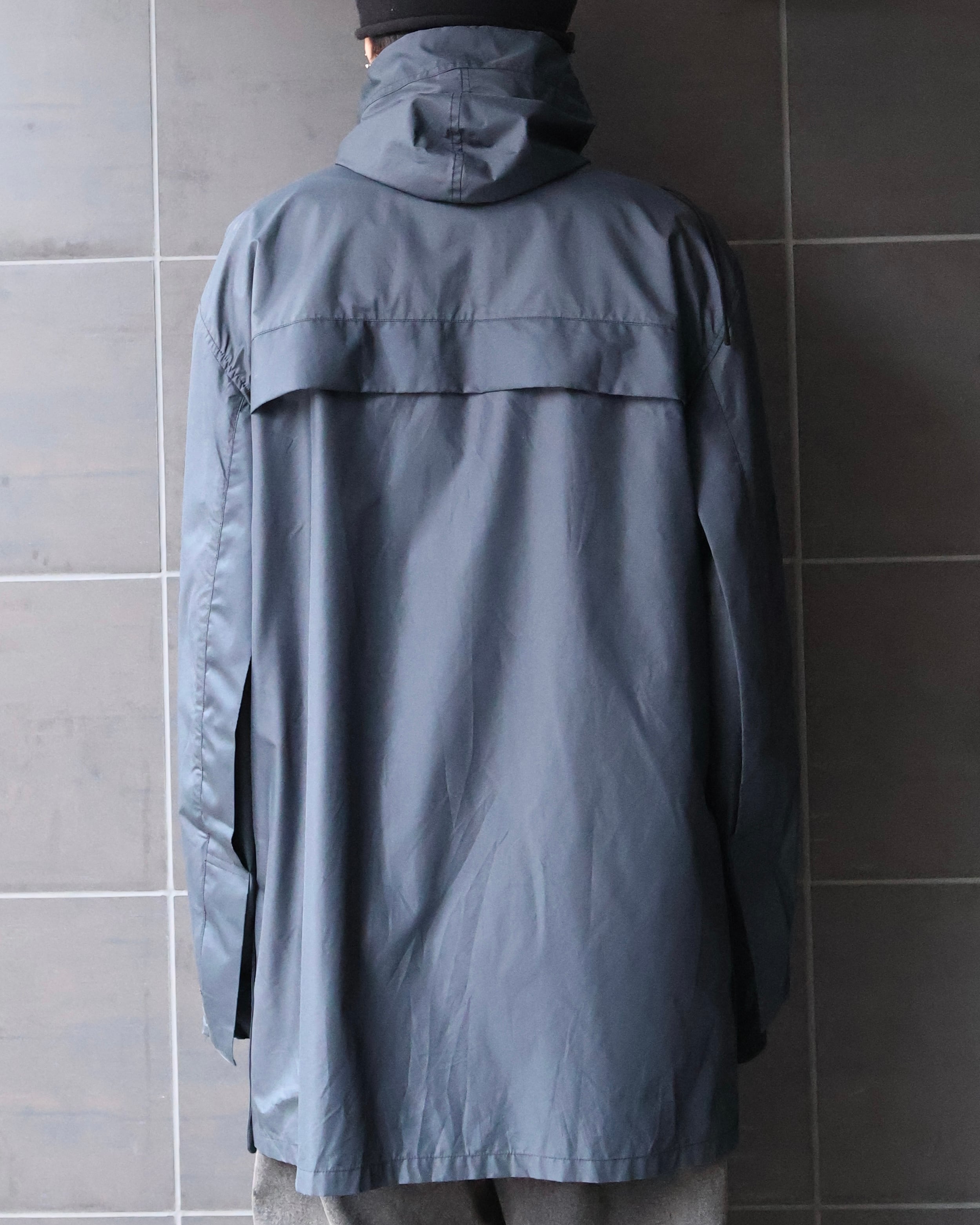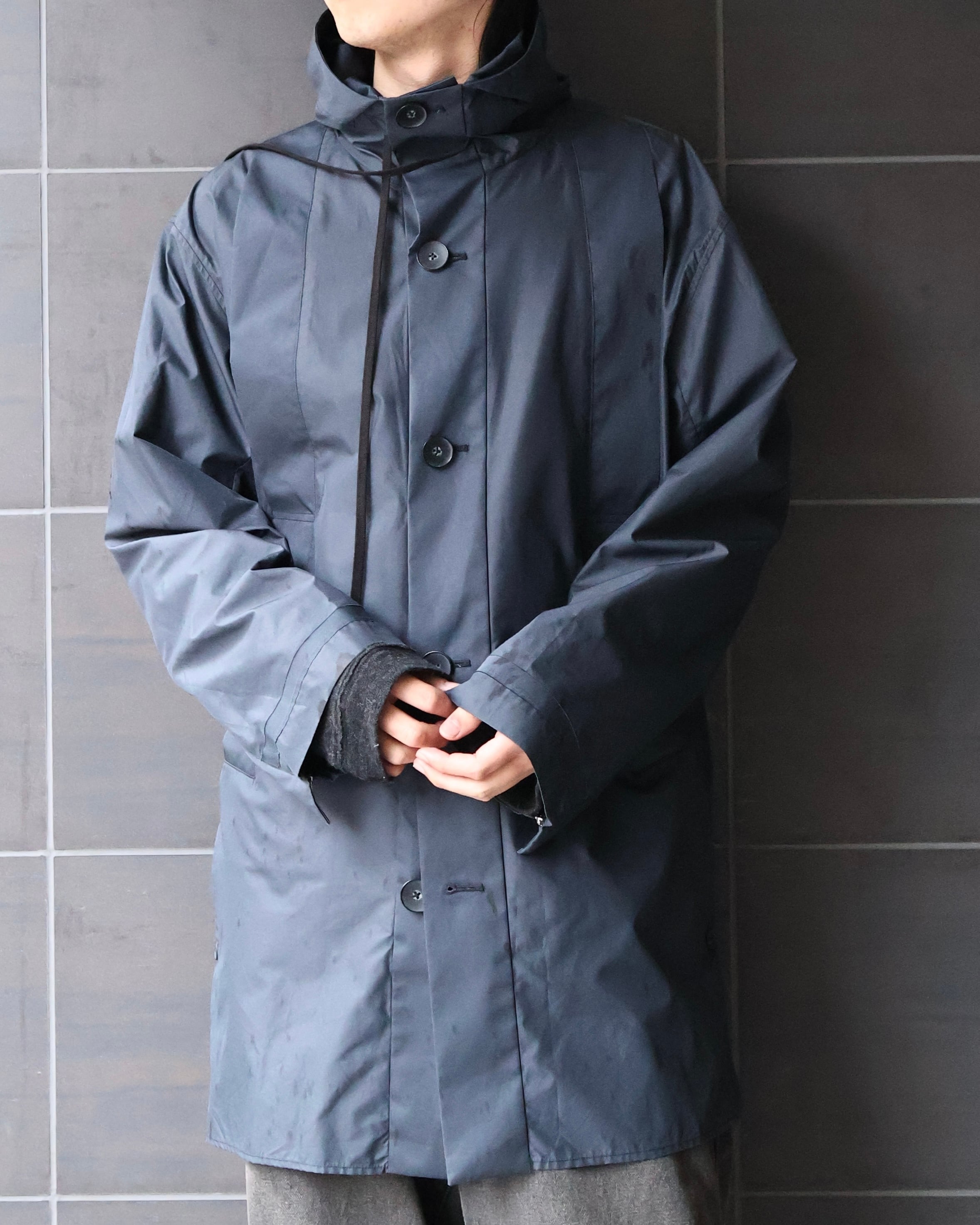 コーティングコットンのような光沢のあるコットンで作られた、ブランドらしい遊び心のある1着。ビジュアルのモード感とは裏腹に、サイドのスリットや、色味などファッションに落とし込みやすいカジュアルダウンされたディテールが、様々なコーディネートに昇華しやすいような意図を感じる一枚。ハリ感のある素材感と、フードやヨークなど機能的な側面を持つディテールは、スポーティに合わせてもモードに合わせても対応できるような、万能さも併せ持つアイテム。