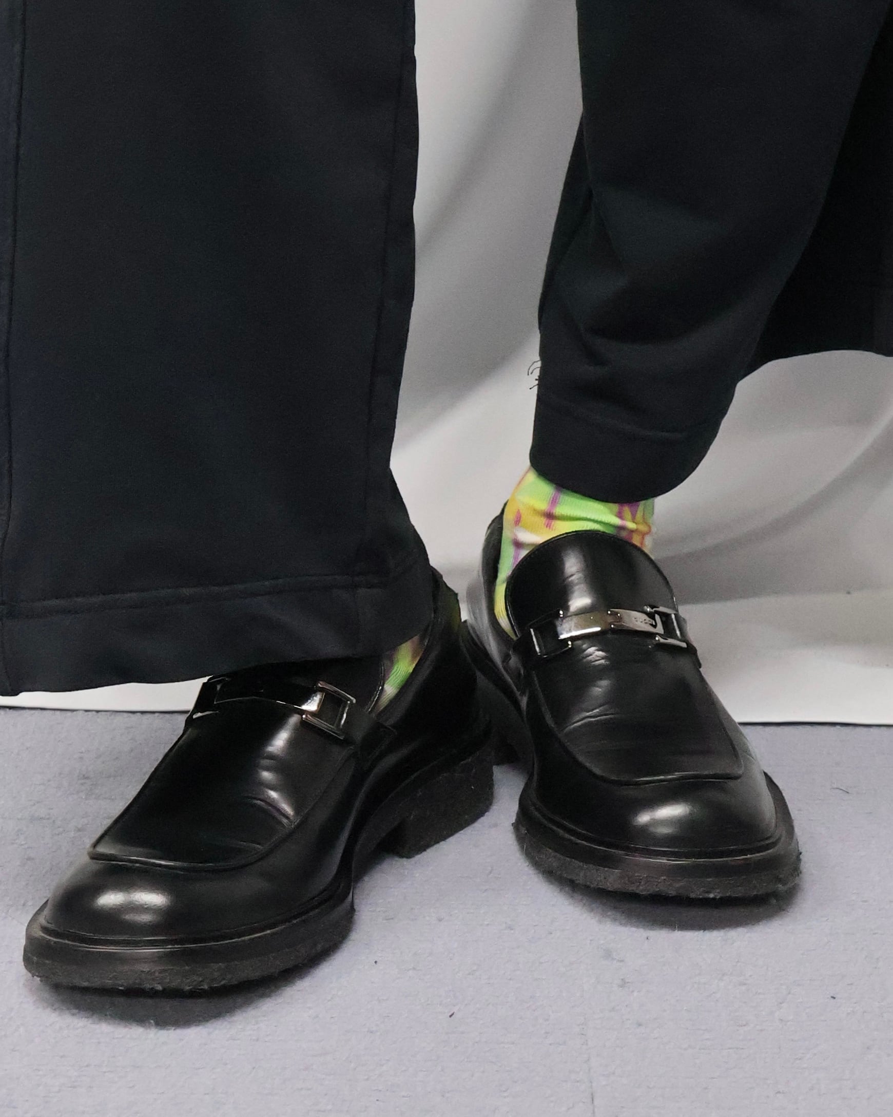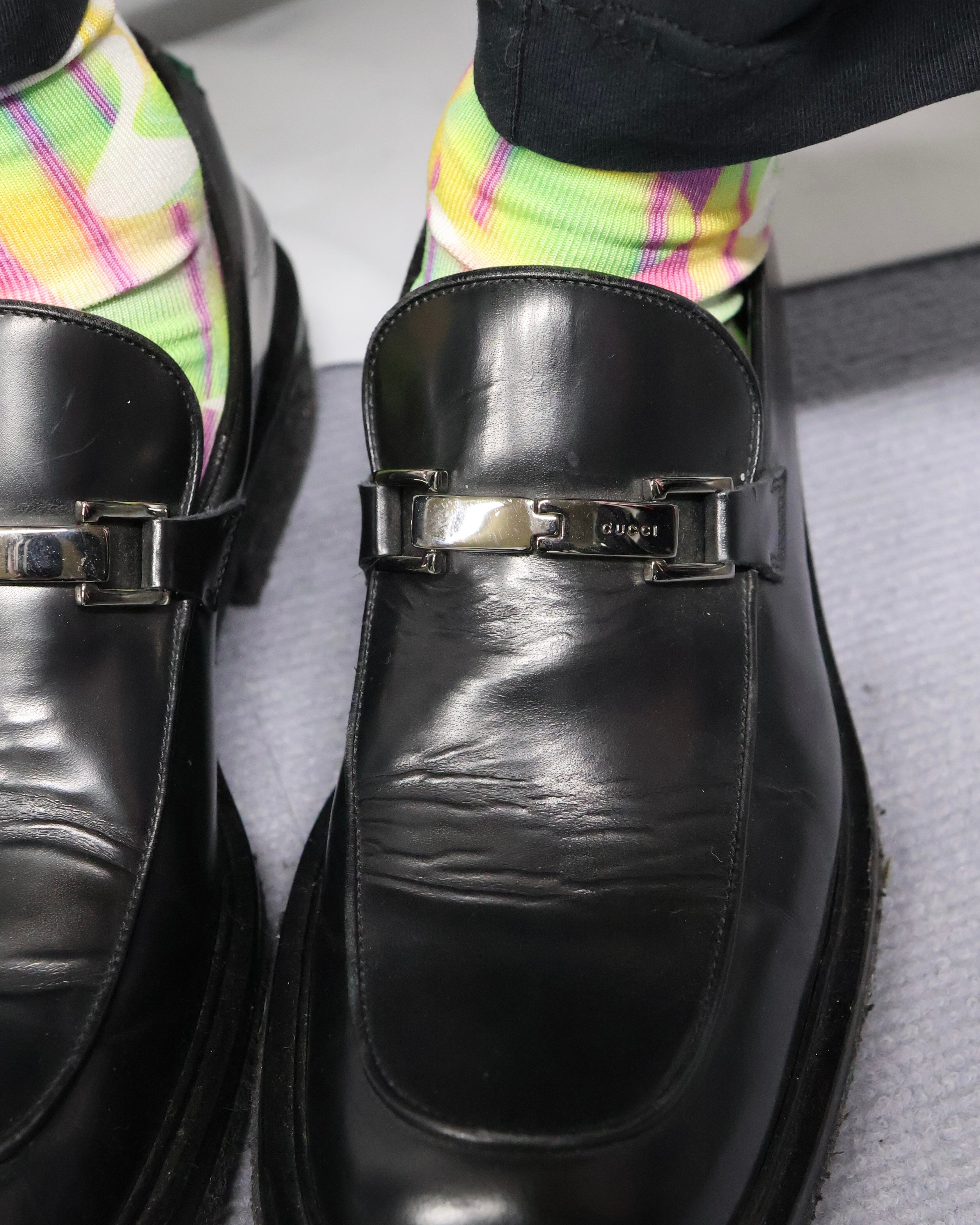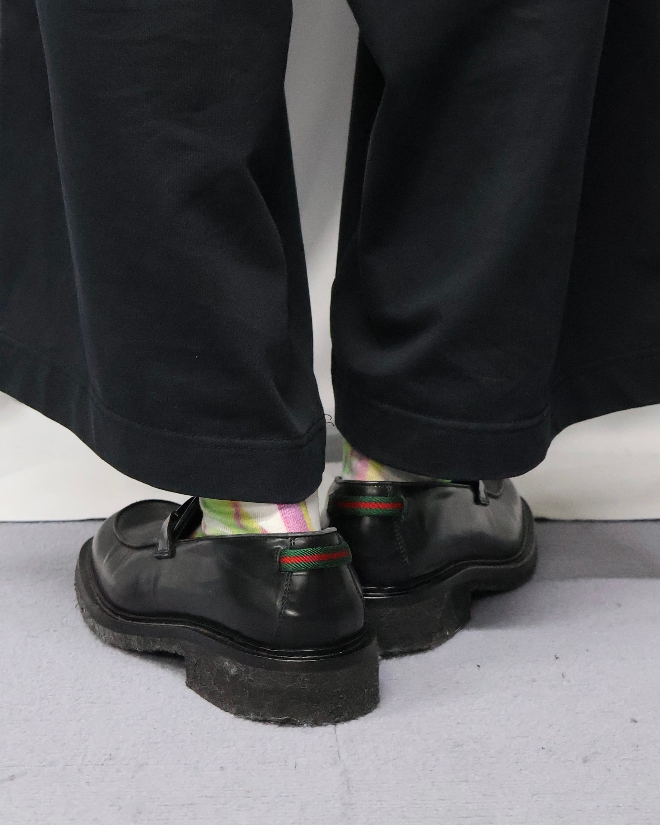 ソールに厚みがあり、重厚感と存在感があるGUCCIのレザーシューズ。鈍い光沢感とボリューム感が、クラシックにもカジュアルなコーディネートの下半身にも合うようなバランスで、薄いローファーやレースアップとの使い分けもできスタイルアップも狙える、万能なシューズ。