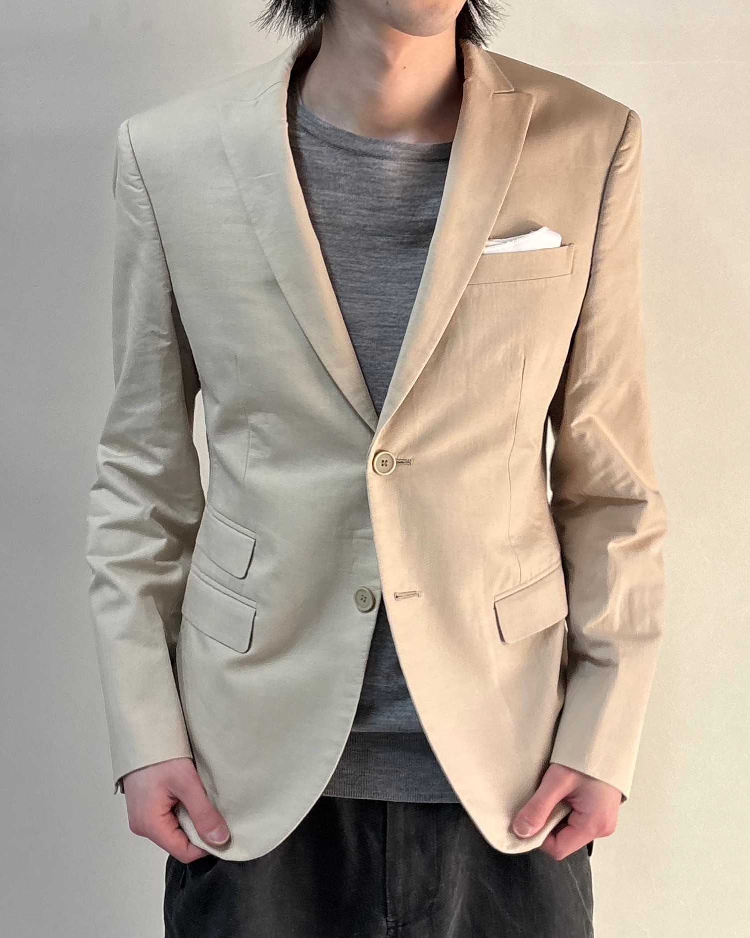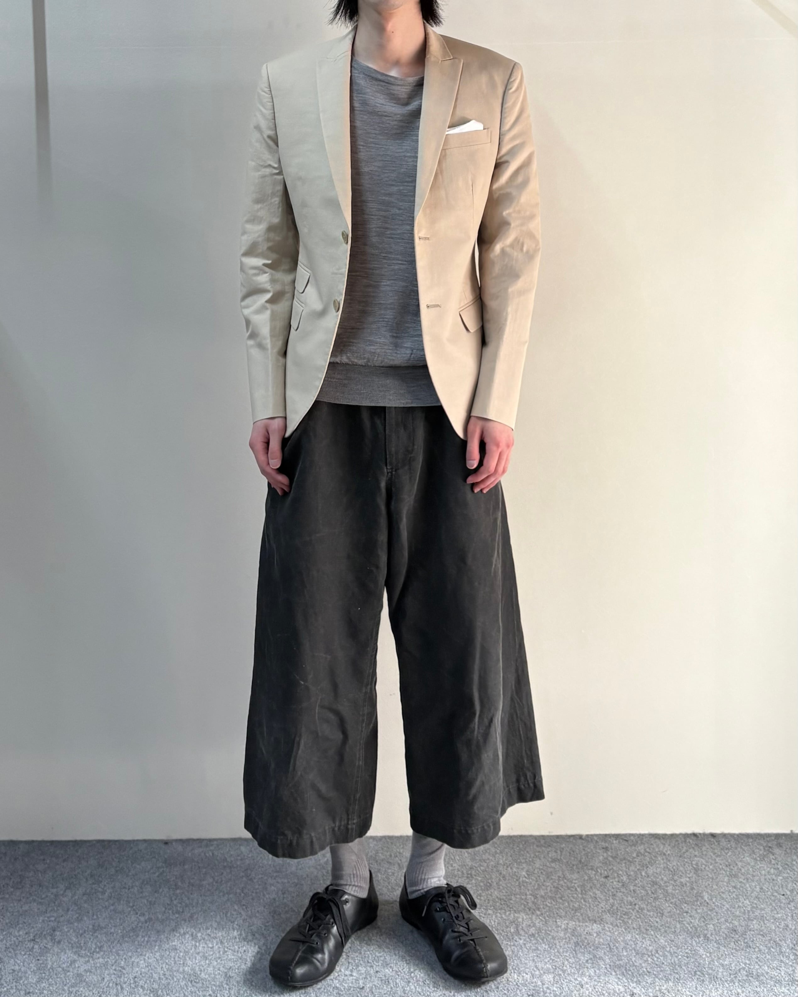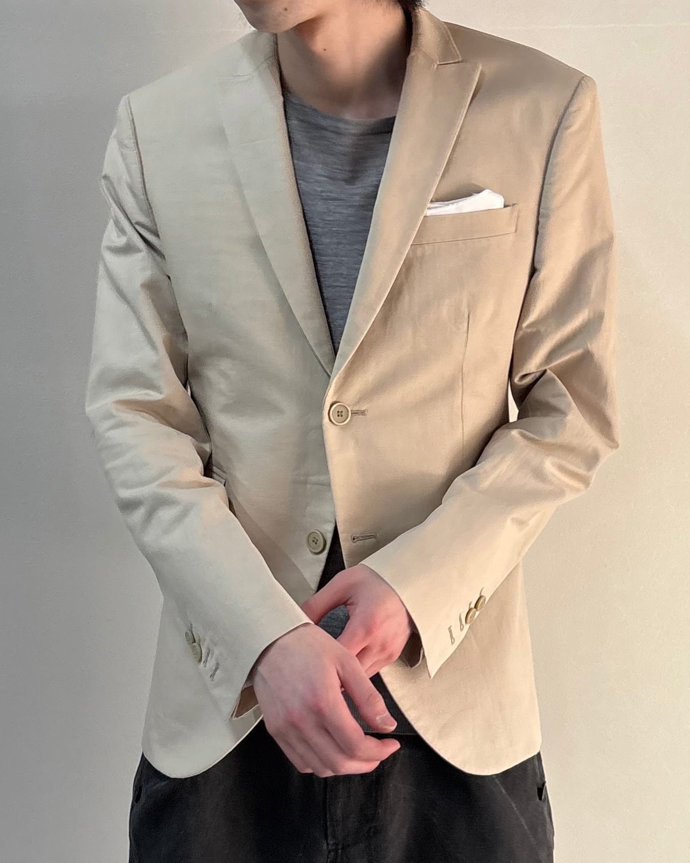 肌触りの良い感触の素材から、テーラードといった硬い印象を色の塩梅によりどこか柔らかさを引き出せる1着