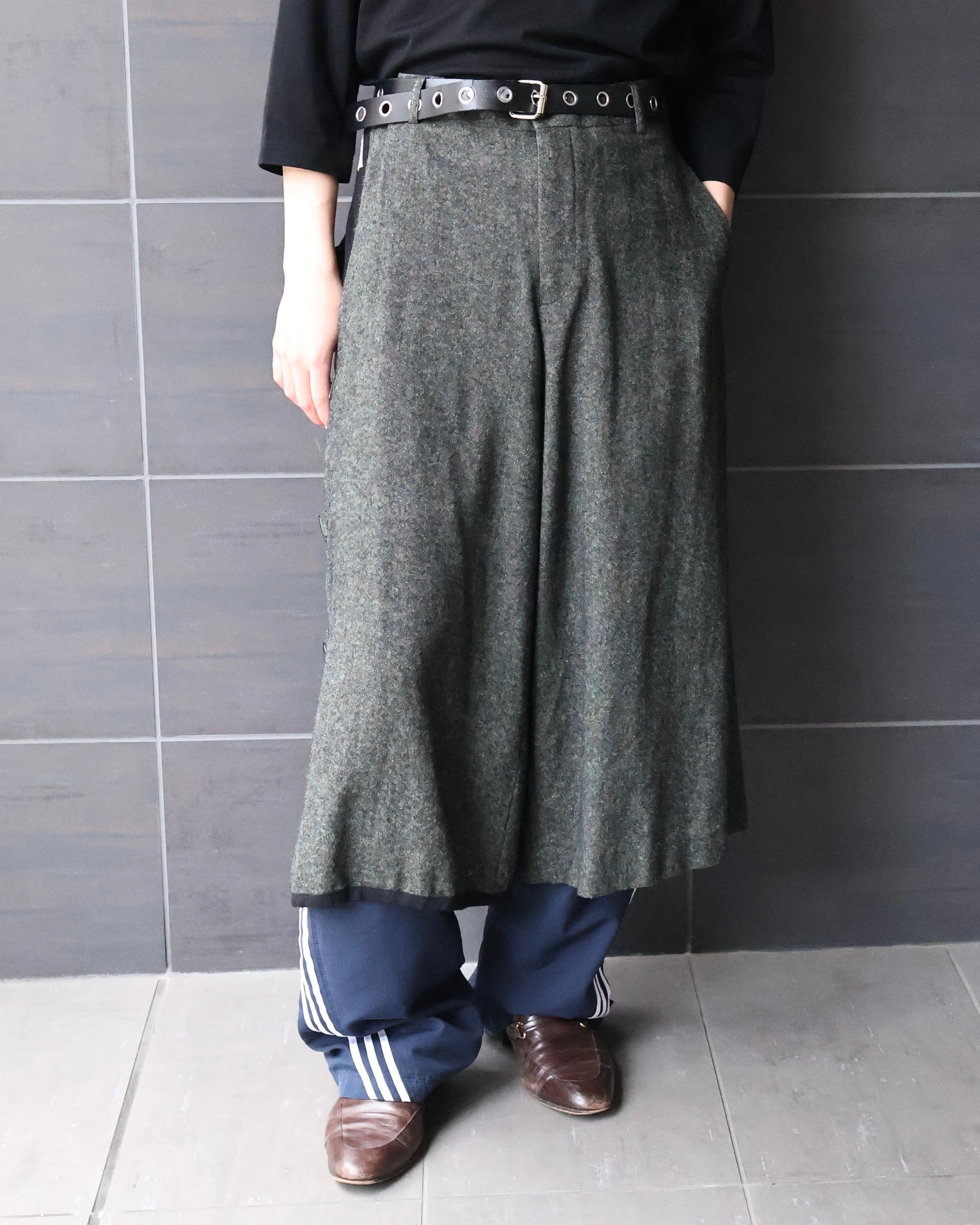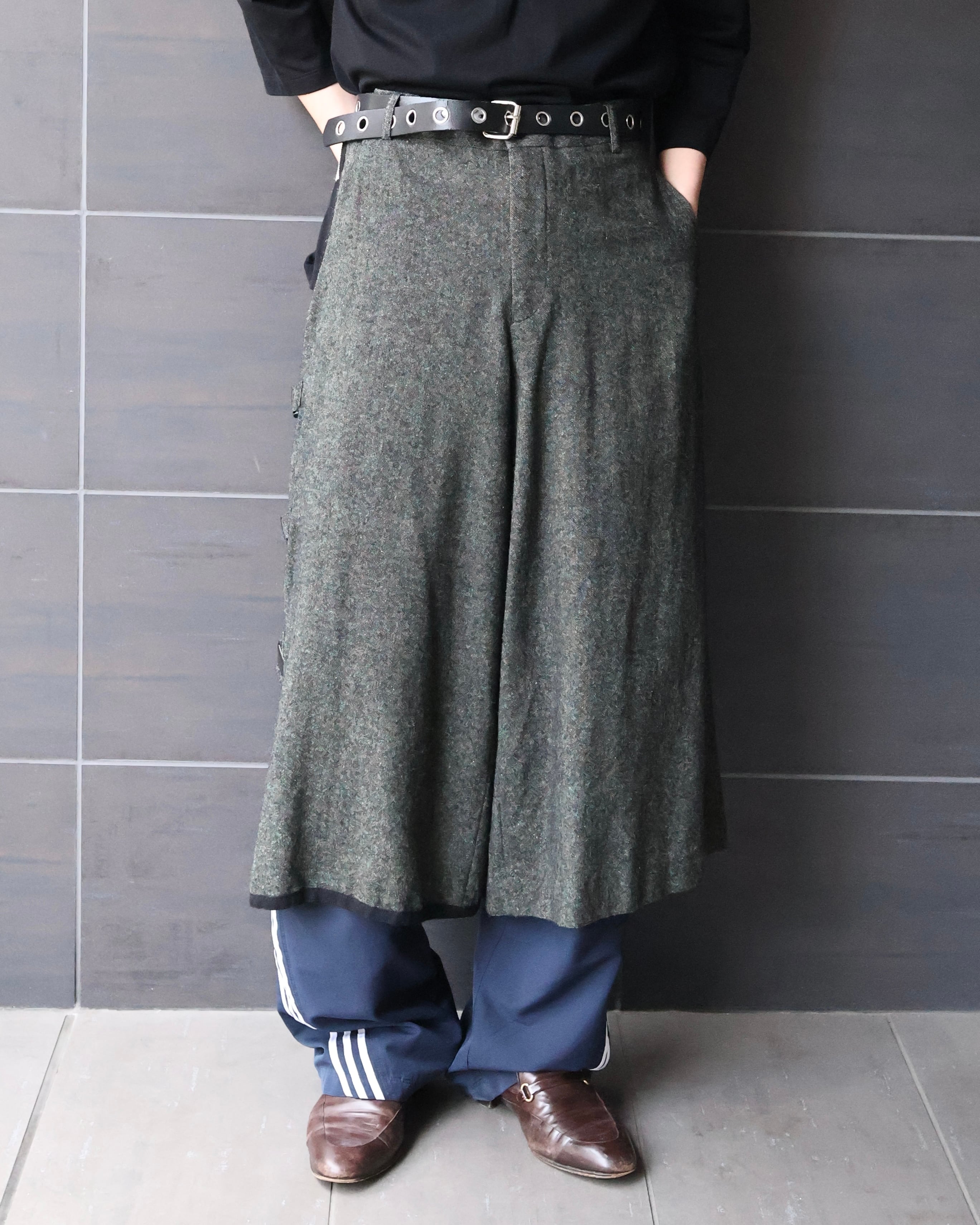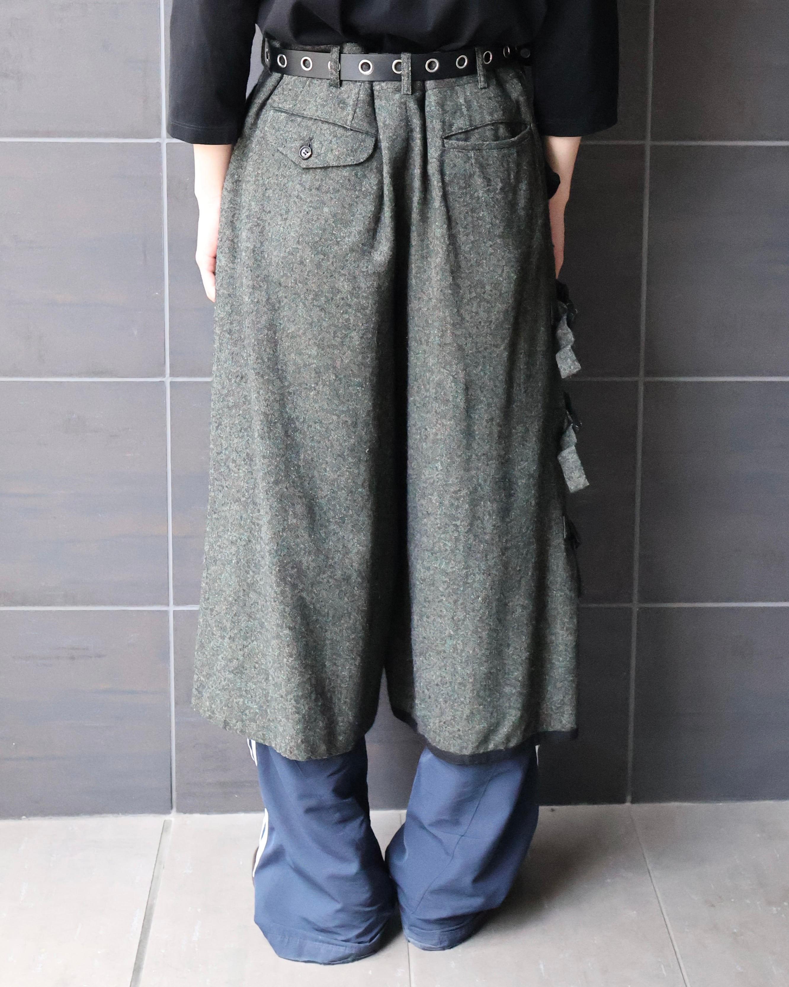 ベースは重厚感のあるウールライクなファブリック。まず目を引くのが、サイドに配されたバックルディテール。機能性を感じさせつつ、デザインとしてしっかり主張することで、ただの巻きスカートやレイヤードパーツに留まらない存在感を確立しており、上質なモードを演出できるようなアイテム。このファブリックでのデザインだからこその、チープな仕上がりではないビジュアルの担保になっている、ブランドならではのパンツ。